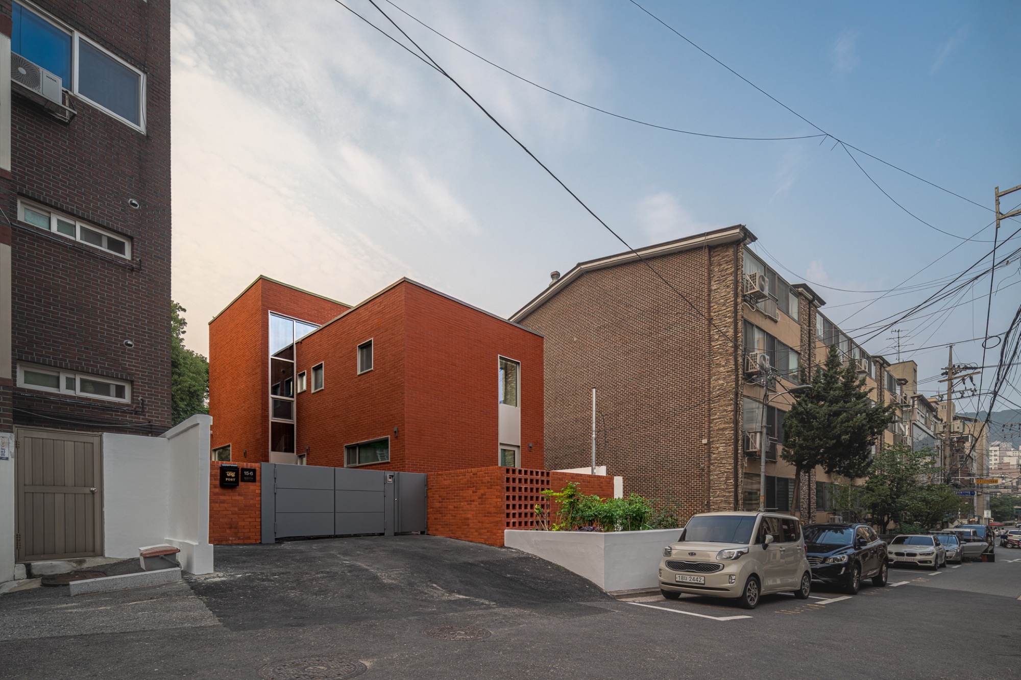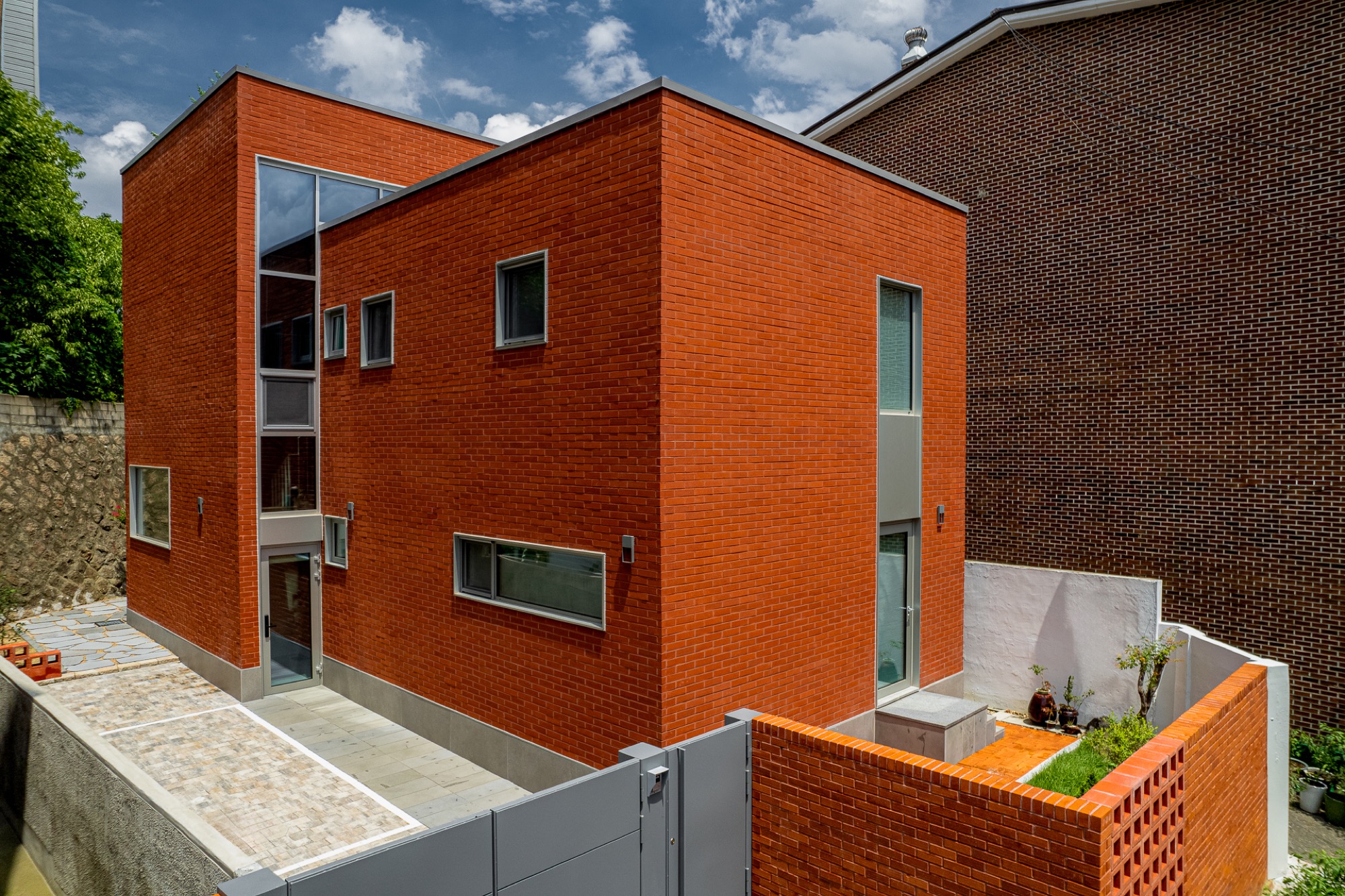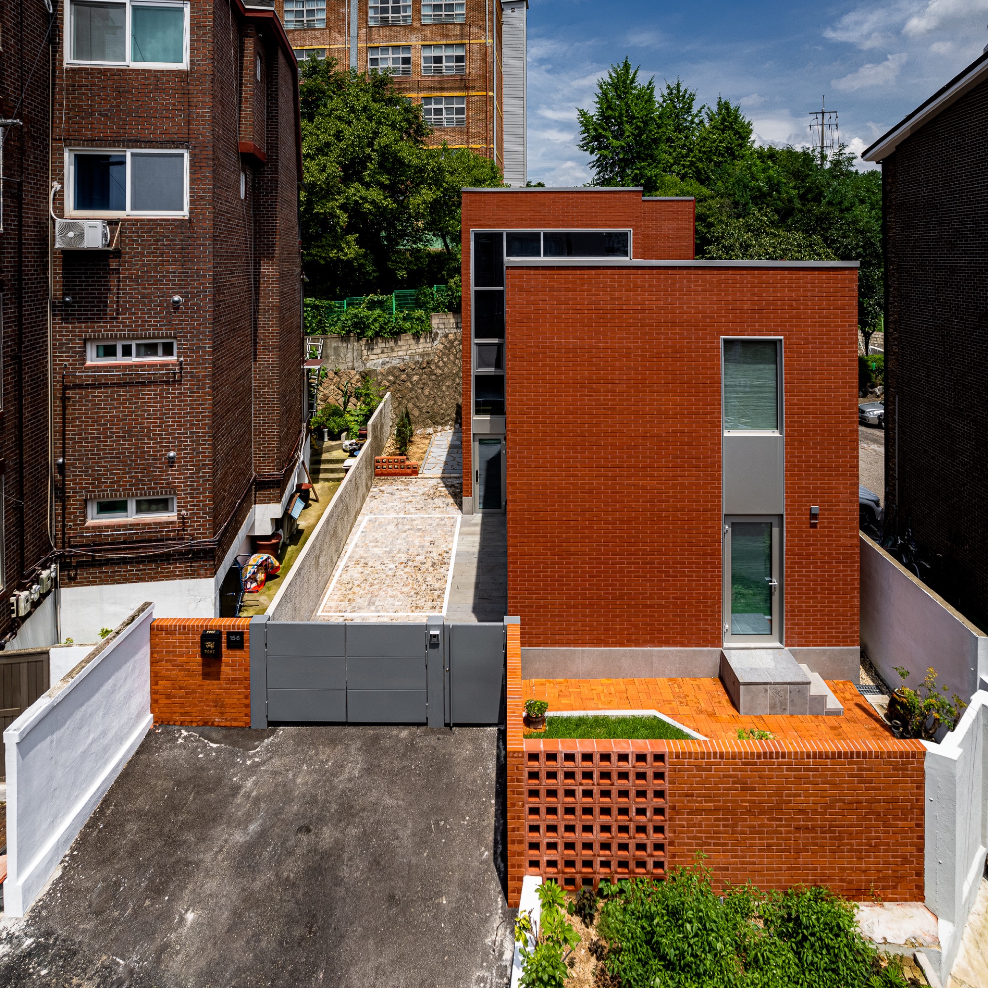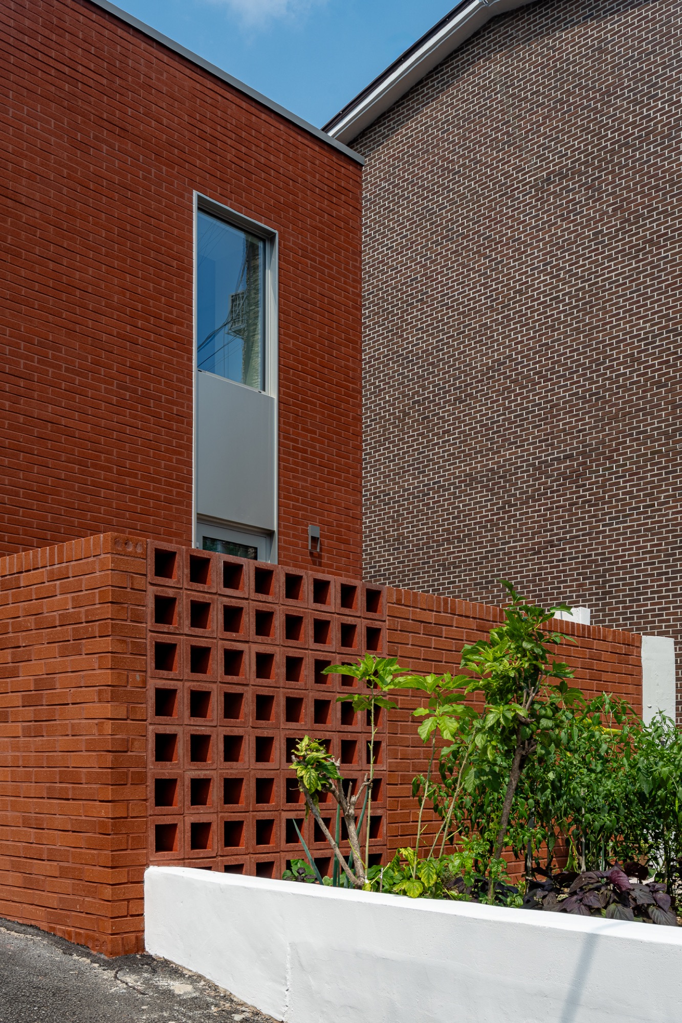 두 동처럼 분리된 매스의 중심에 외부 중정 같은 내부 계단을 계획했다. 커튼월을 통해 남향과 동향으로 열려있는 내부 계단은 단지 층과 층을 연결해 주는 곳이 아니다. 계단의 보이드는 채광통로가 되어 북측의 공용공간에서도 외부 환경을 온전히 느낄 수 있게 한다. 내부까지 시각적, 물리적으로 연결된 외부 재료(벽돌)는 물성 그 자체로 사용자에게 계단을 오르내릴 때나, 거실과 취미실에 앉아 내부 창을 통해 보았을 때 외부공간에 있는 듯한 경험의 차이를 만들고 벽돌 벽면에 투영되어 시시각각 변하는 해와 달의 그림자 또한 실내에서도 외부 중정을 거니는 듯한 독특한 감각을 사용자에게 제공하게 된다.