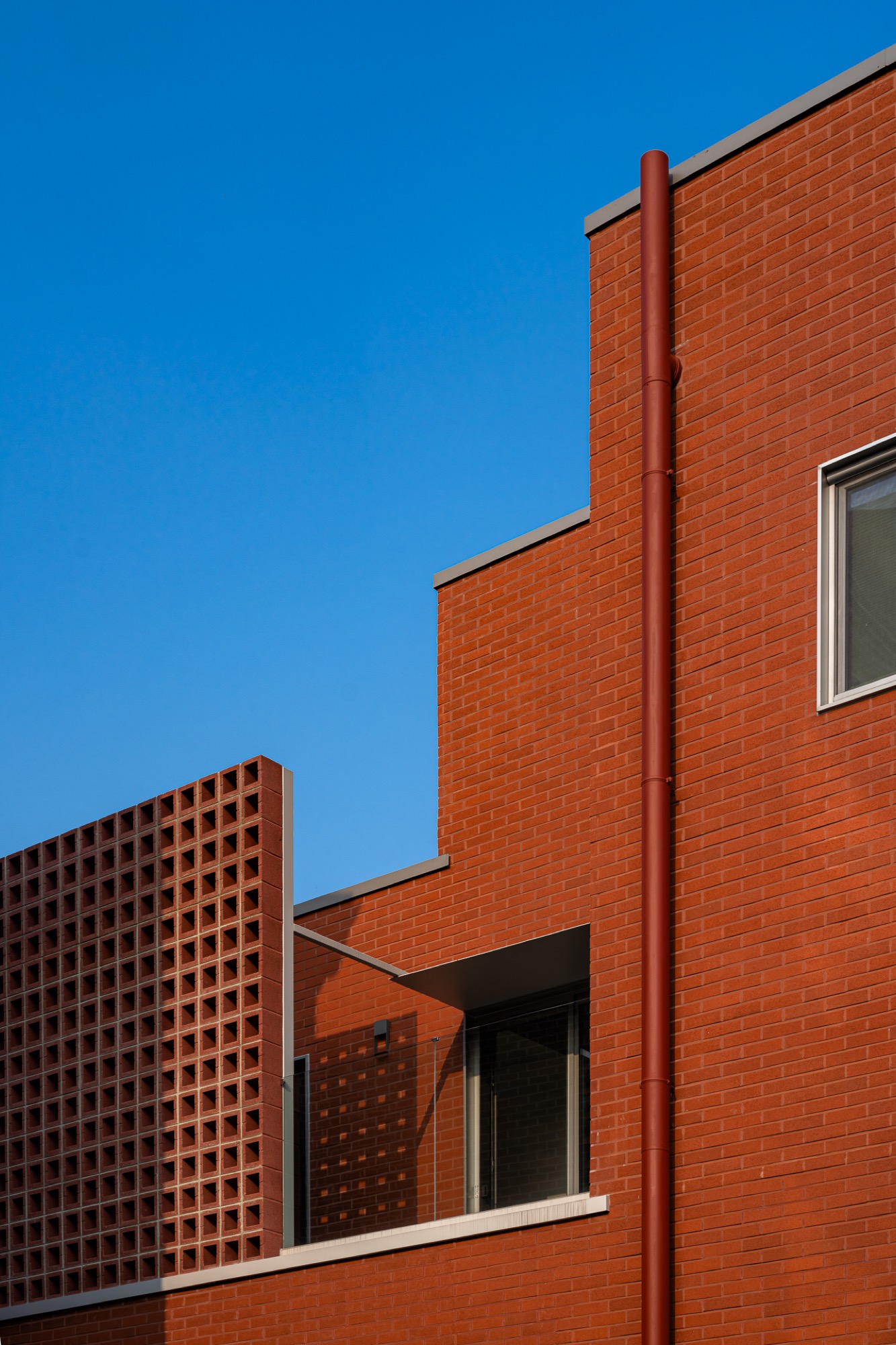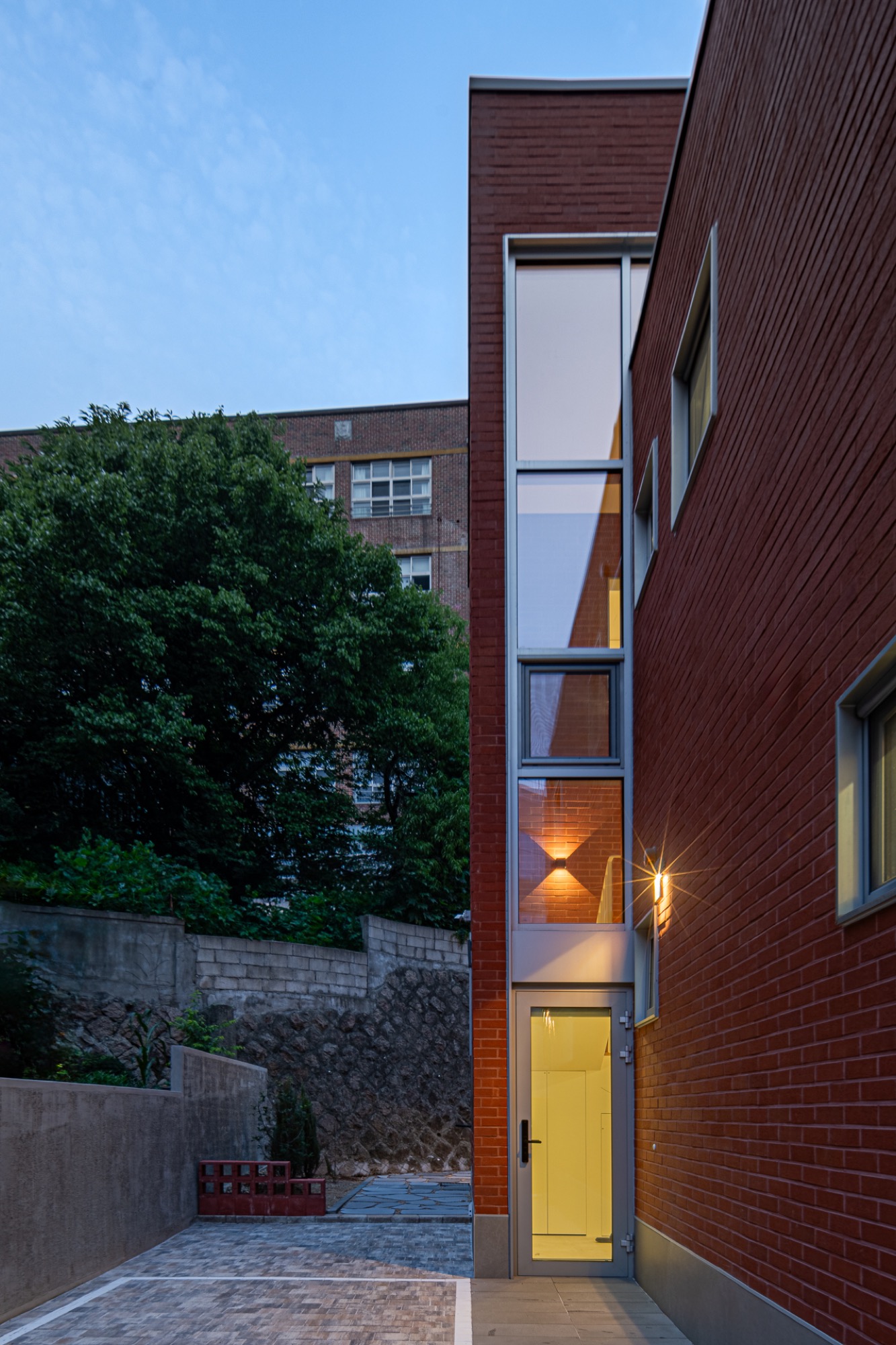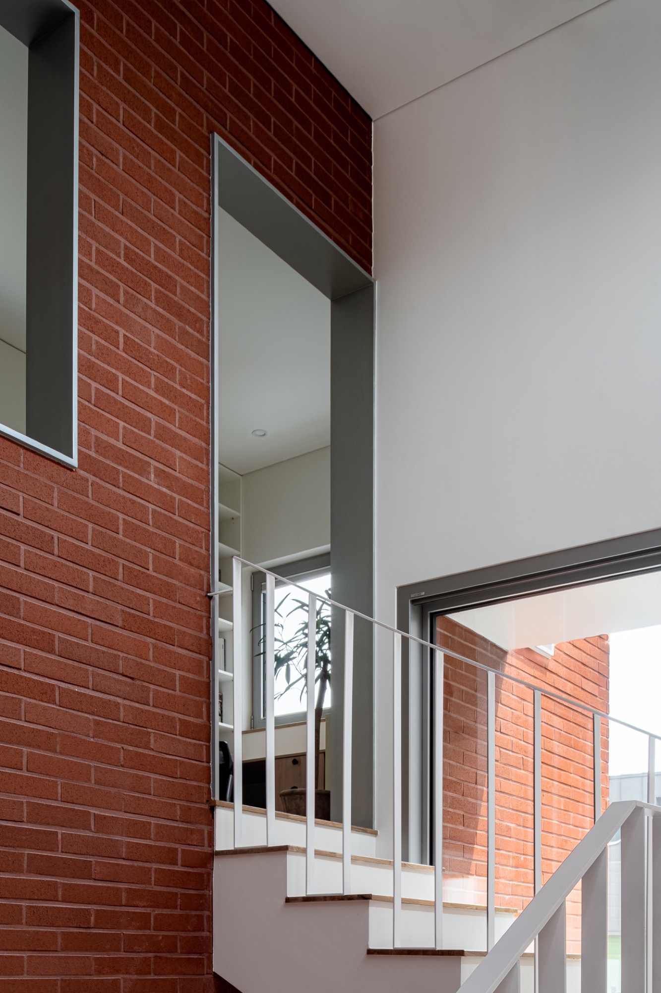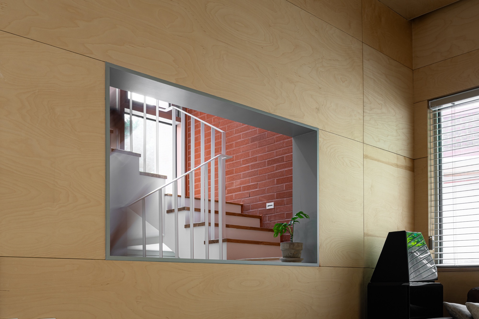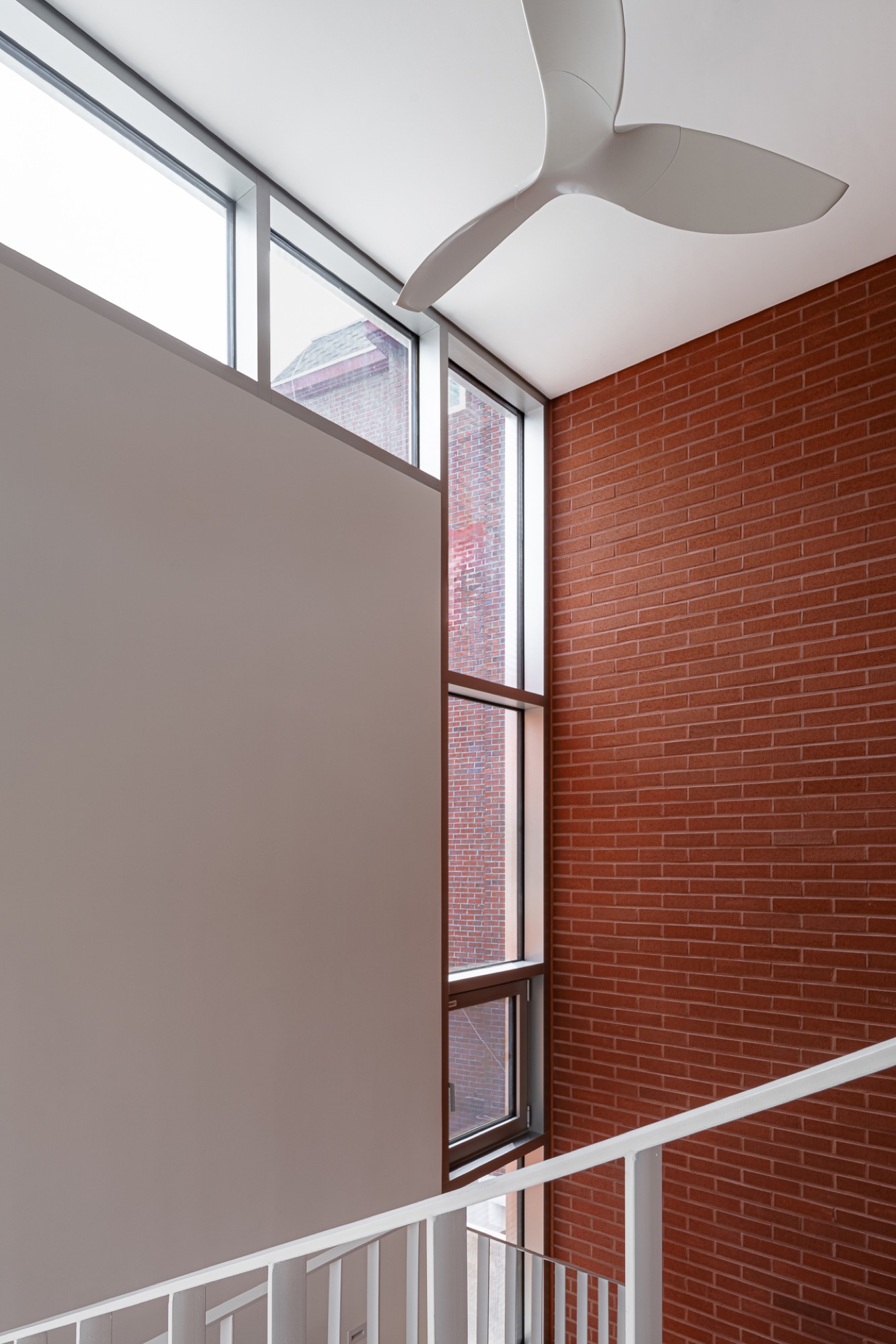 두 동처럼 분리된 매스의 중심에 외부 중정 같은 내부 계단을 계획했다. 커튼월을 통해 남향과 동향으로 열려있는 내부 계단은 단지 층과 층을 연결해 주는 곳이 아니다. 계단의 보이드는 채광통로가 되어 북측의 공용공간에서도 외부 환경을 온전히 느낄 수 있게 한다. 내부까지 시각적, 물리적으로 연결된 외부 재료(벽돌)는 물성 그 자체로 사용자에게 계단을 오르내릴 때나, 거실과 취미실에 앉아 내부 창을 통해 보았을 때 외부공간에 있는 듯한 경험의 차이를 만들고 벽돌 벽면에 투영되어 시시각각 변하는 해와 달의 그림자 또한 실내에서도 외부 중정을 거니는 듯한 독특한 감각을 사용자에게 제공하게 된다.