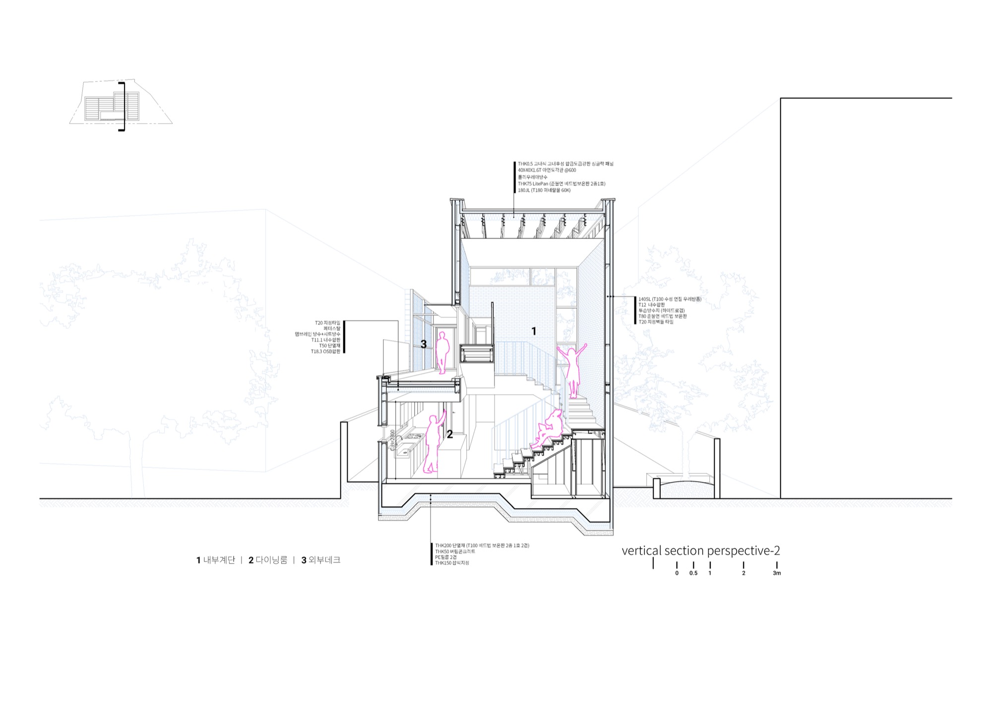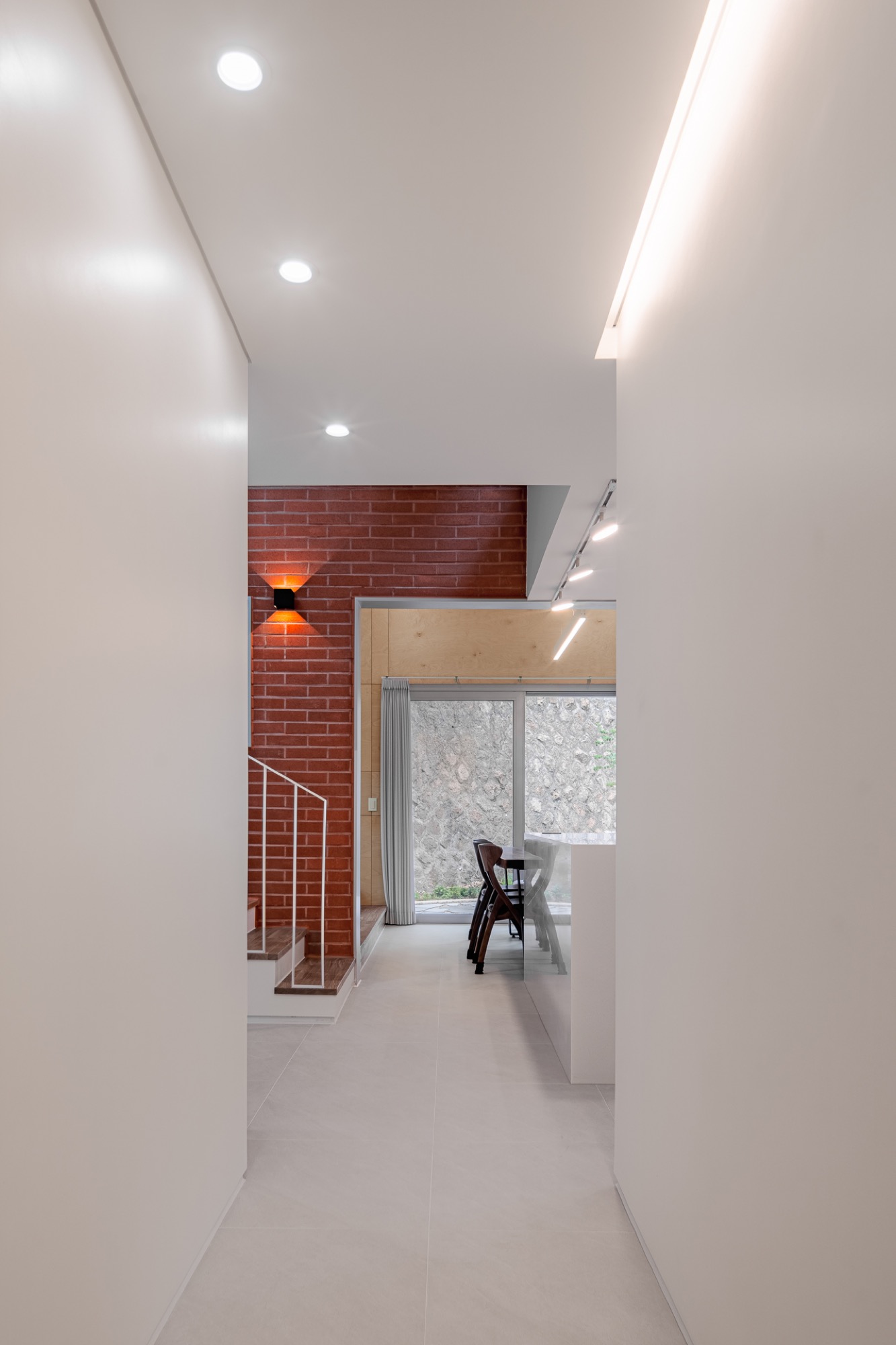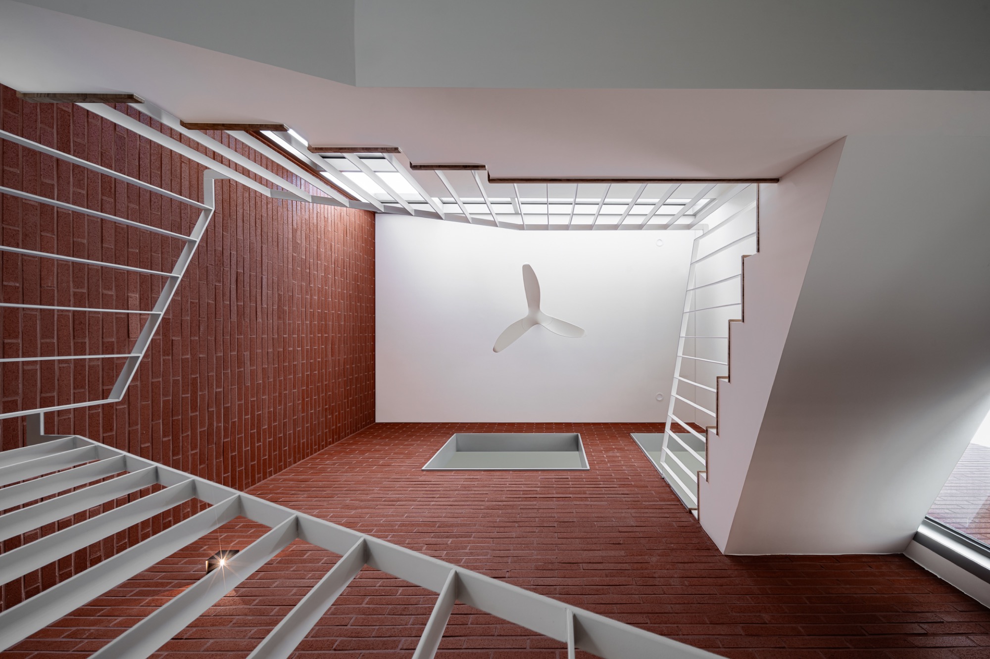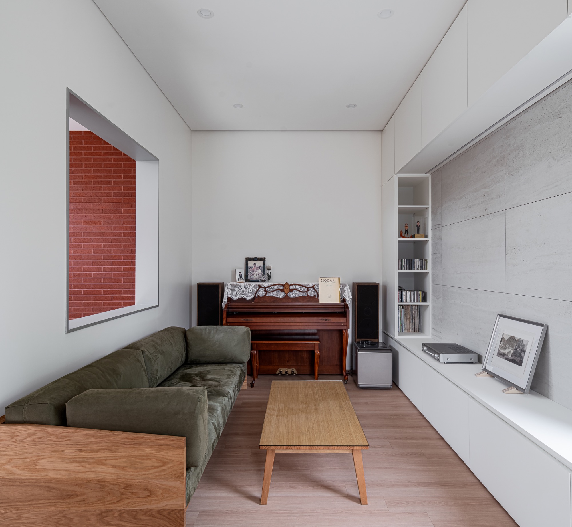 두 동처럼 분리된 매스의 중심에 외부 중정 같은 내부 계단을 계획했다. 커튼월을 통해 남향과 동향으로 열려있는 내부 계단은 단지 층과 층을 연결해 주는 곳이 아니다. 계단의 보이드는 채광통로가 되어 북측의 공용공간에서도 외부 환경을 온전히 느낄 수 있게 한다. 내부까지 시각적, 물리적으로 연결된 외부 재료(벽돌)는 물성 그 자체로 사용자에게 계단을 오르내릴 때나, 거실과 취미실에 앉아 내부 창을 통해 보았을 때 외부공간에 있는 듯한 경험의 차이를 만들고 벽돌 벽면에 투영되어 시시각각 변하는 해와 달의 그림자 또한 실내에서도 외부 중정을 거니는 듯한 독특한 감각을 사용자에게 제공하게 된다.