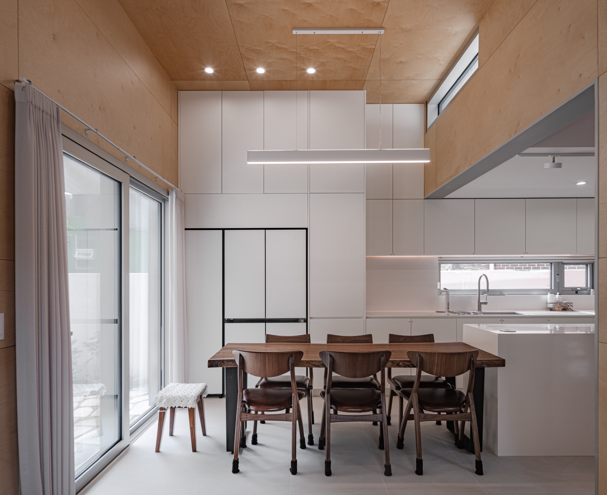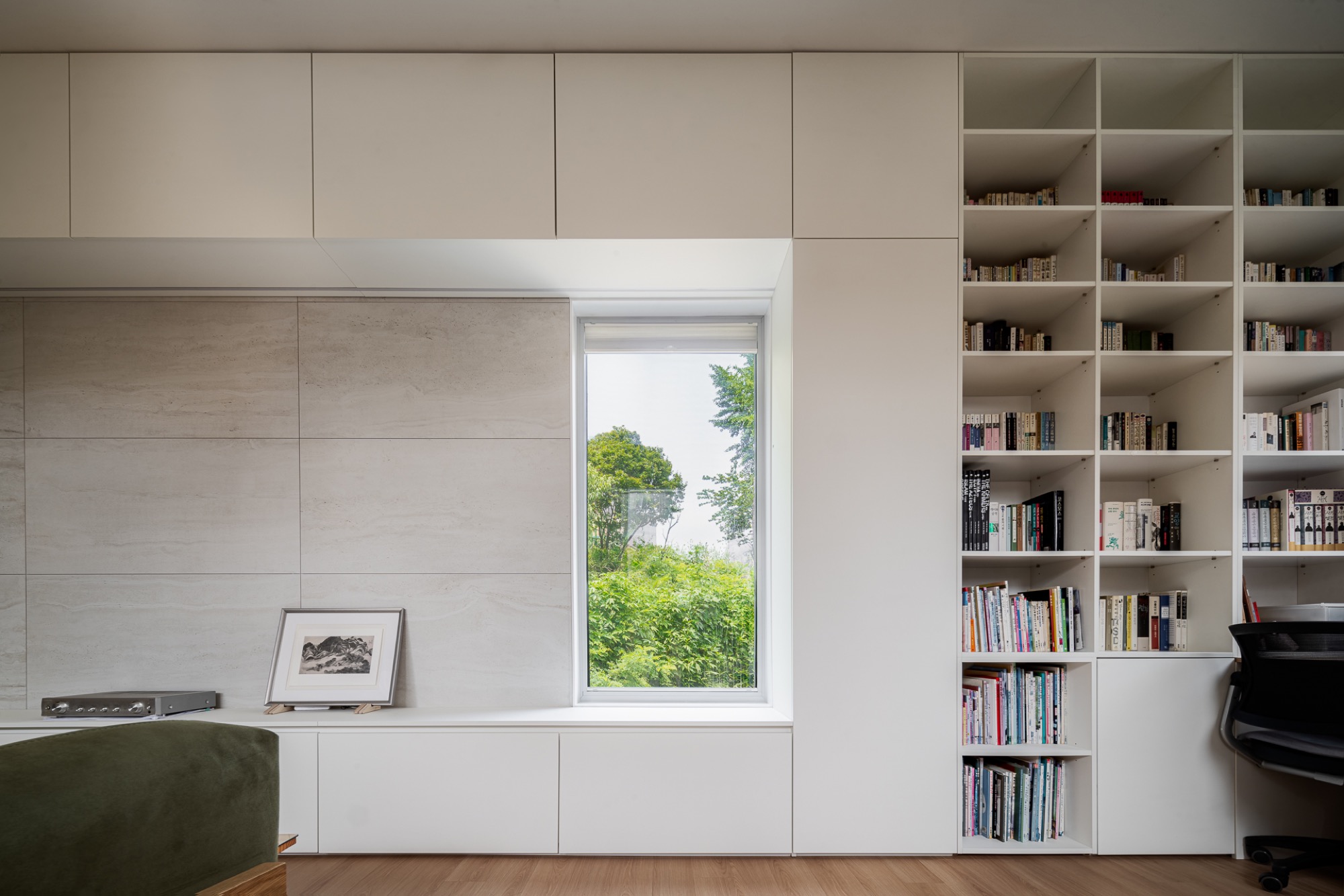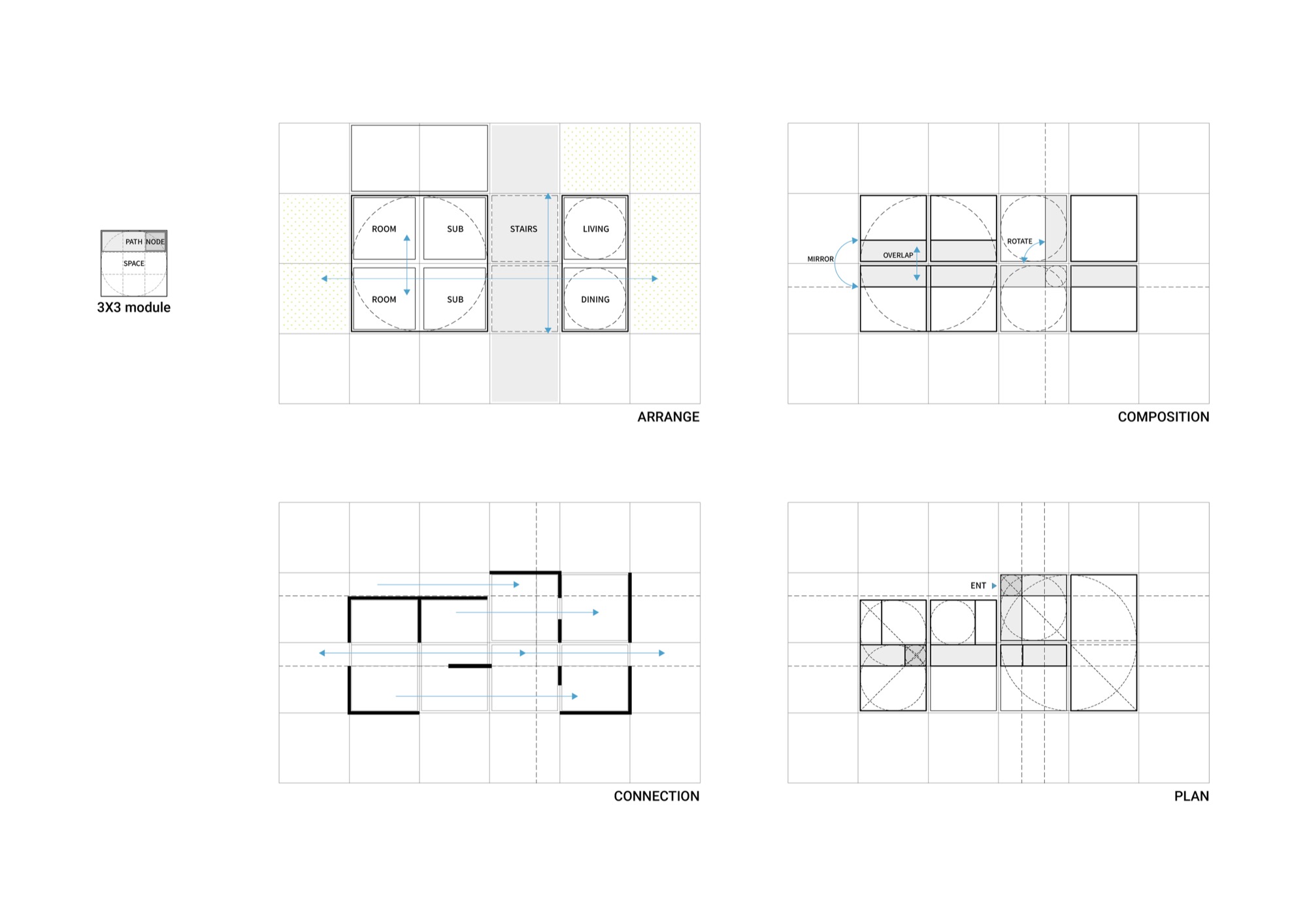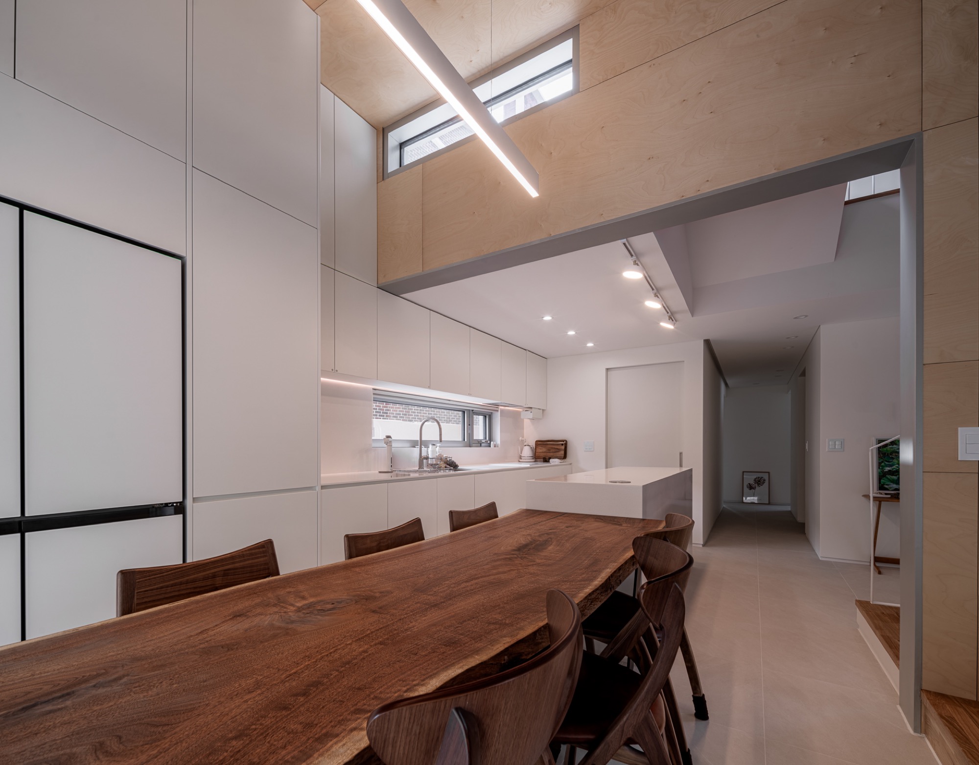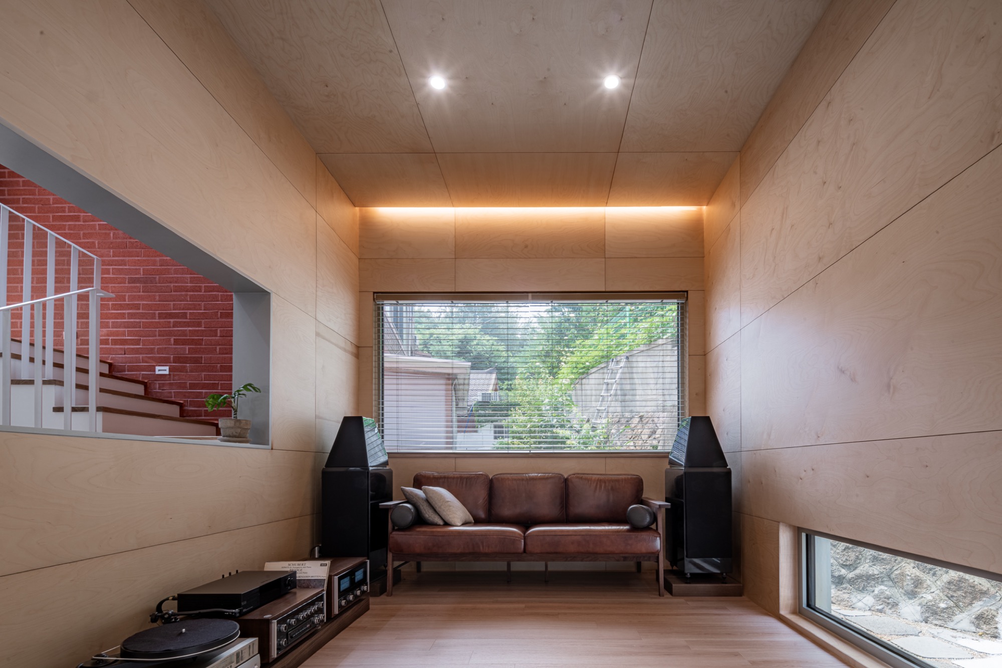 분리된 두 매스는 기능을 나누어 가진다. 3mX3m 모듈의 기본 매스로 구성된 두 영역을 잇는 중심 공간에 외부로 열려있는 내부 계단이 위치하며 이를 기준으로 북측에 면한 매스에는 거실, 다이닝룸, 취미실 등 가족들이 쉬고 모이는 공간이 배치되어 뒷마당 및 내부 계단과 관계를 맺는다. 취미실은 2층으로 분리되어 있으면서도 시각적으로는 연결되어 있기 때문에 가족 구성원들의 ‘따로 또 같이’ 휴식이 가능하다.