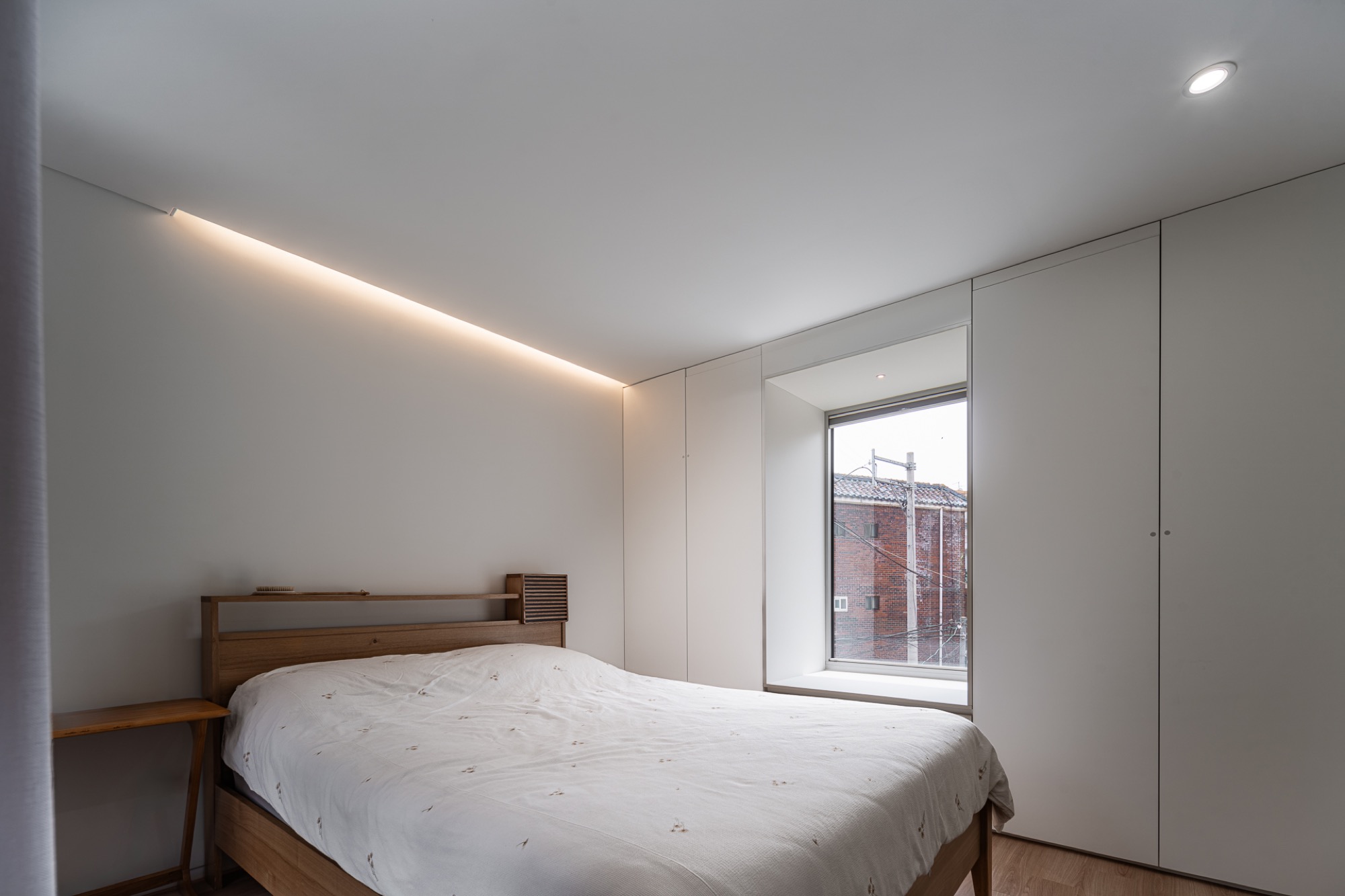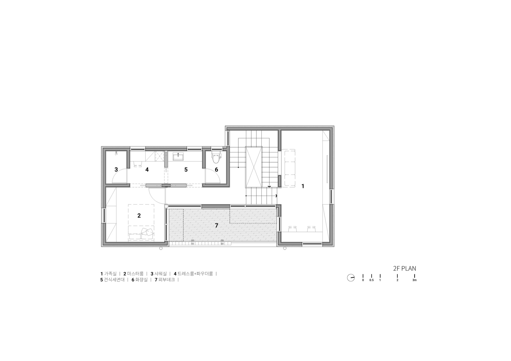 남측의 작은 마당과 면한 매스는 사적 공간의 집합으로 최소면적과 합리적인 동선으로 구성했다. 1, 2층으로 자녀 공간과 부부 공간인 마스터룸을 분리하고 침실, 건식 세면대, 욕실, 화장실, 드레스룸, 파우더룸을 건축주에게 맞는 필요 면적과 최소한의 동선으로 제안하고 나머지는 수납공간에 집중했다.