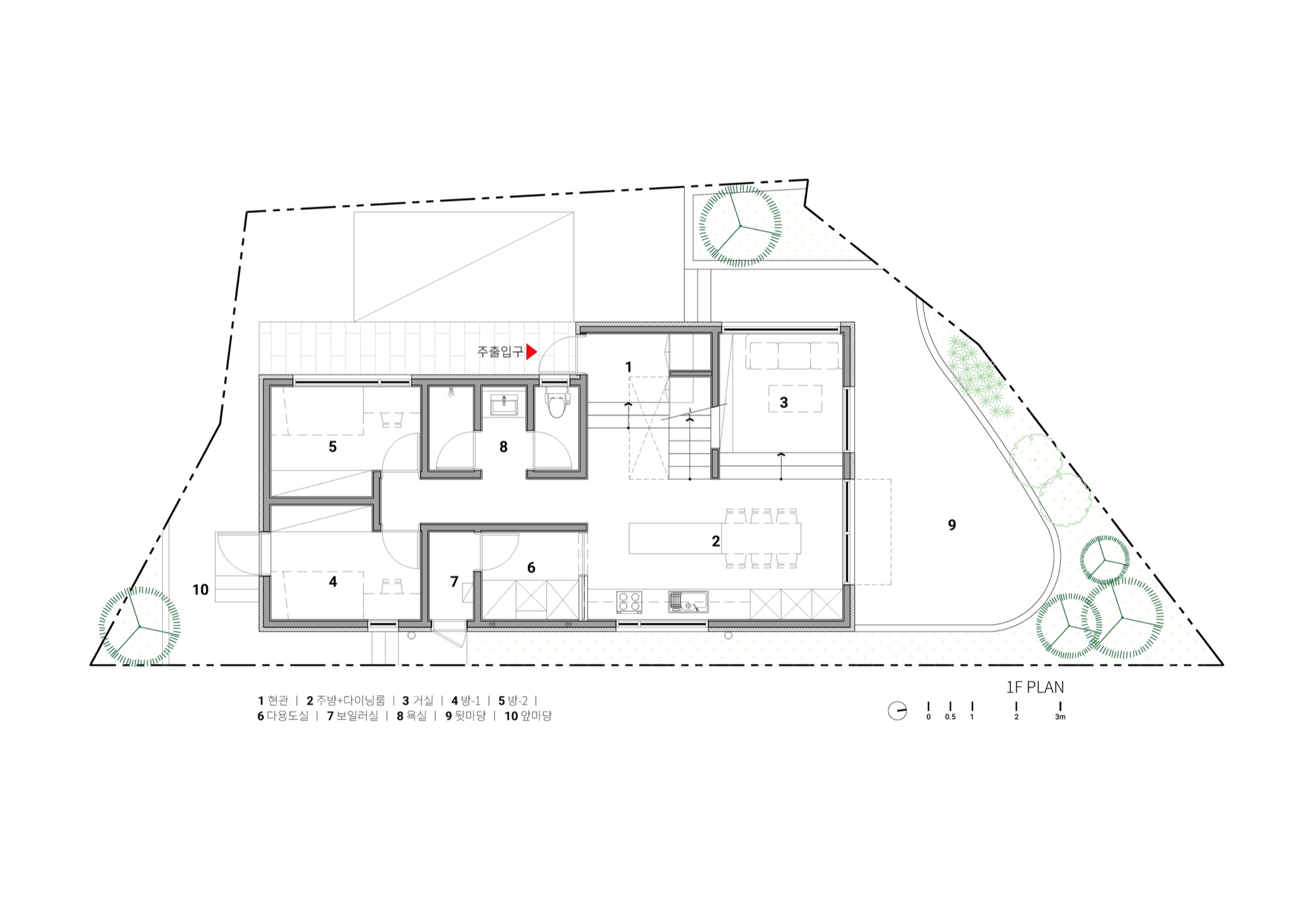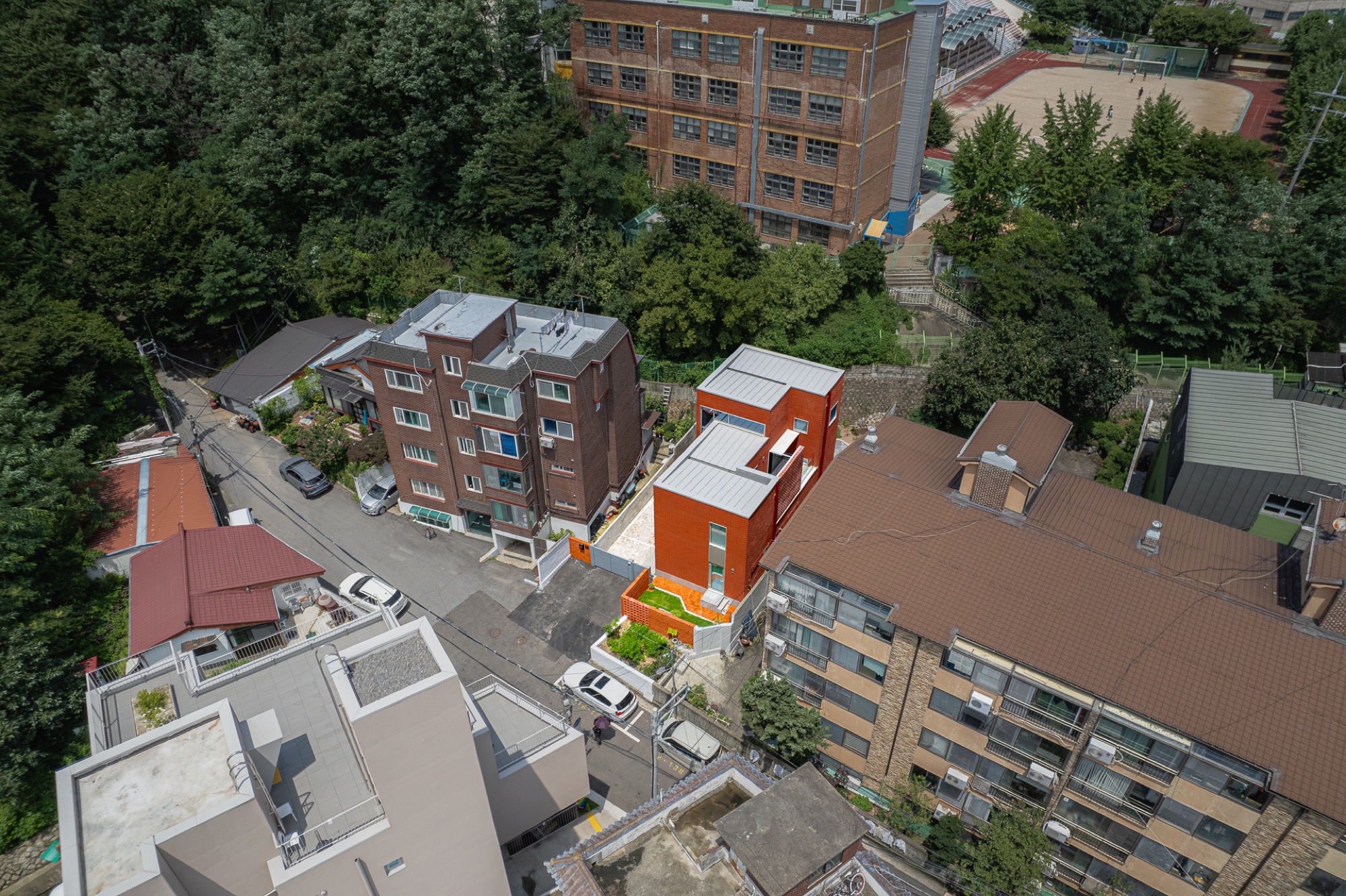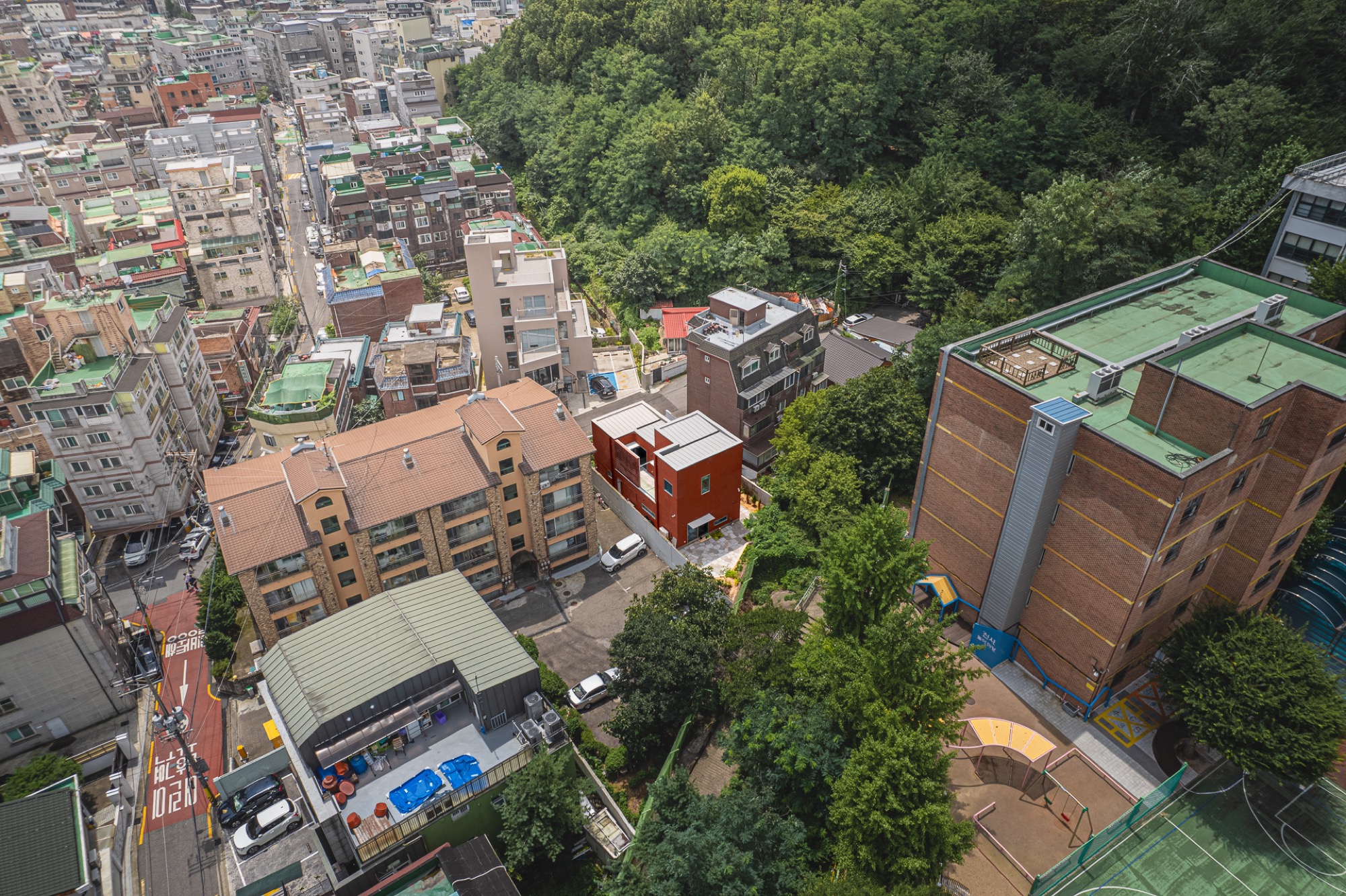 땅은 도심에서 보기 드문 이른바 뒷산, 근린공원의 초입에 있어 도시와 자연의 경계에 놓여 있다. 대지의 용적률은 250%로 주변에는 다가구 또는 다세대 주택, 전면에는 5층 규모의 근린생활시설이 들어올 정도로 지금 건물의 3배의 규모로 신축이 가능한 곳이었다. 하지만 처음부터 건축주는 정해진 예산안에서 4인 가족의 생활만을 위한 집을 원했고 단독주택에서 오랫동안 살았던 경험으로 규모 대비 집을 관리할 때 들어가는 수고와 단독주택이라는 주거의 형태에서 가족 구성원에게 필요한 공간도 정확히 인지하고 계셨다. 결국, 40%의 건폐율과 80%의 용적률로 필요한 만큼의 집을 짓게 되었다.