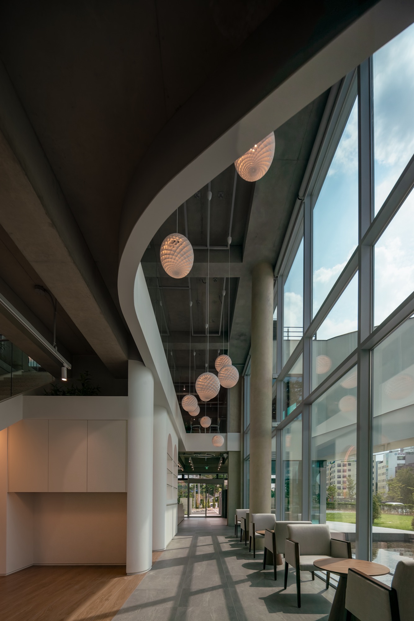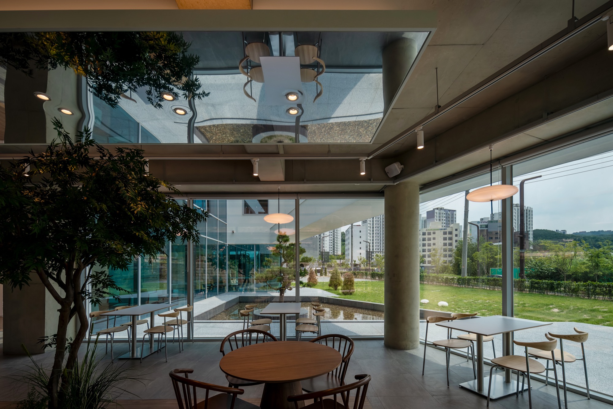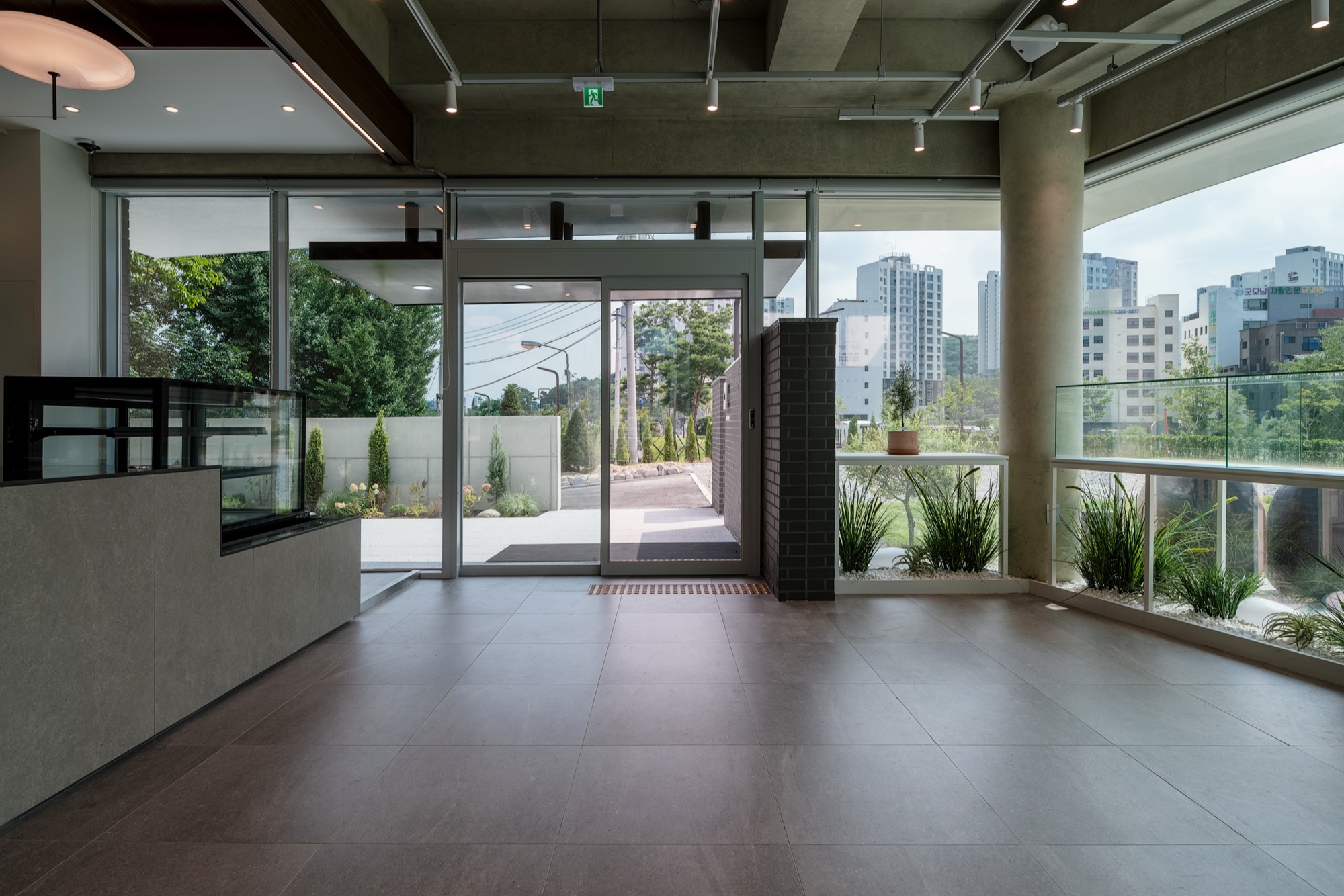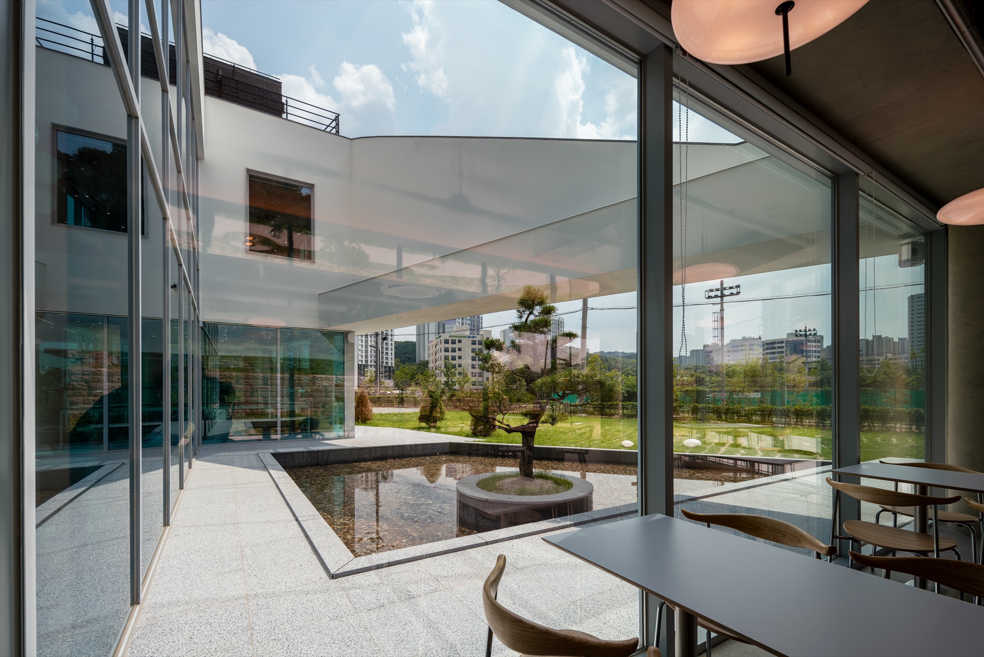 유리는 외부공간과 중정의 수공간 모습을 반사하고 투영하며, 내부와 외부의 경계를 흐리게 만들어 안과 밖의 공간이 서로 관계를 맺고, 콘크리트 구조체는 마감을 최소화하여 공간의 본질을 드러내고, 이와 대비되는 자연소재의 우드와 플랜테리어를 조합하여 따뜻하고 친근한 실내환경을 구성하였다. 이러한 요소들은 방문객들에게 마치 자연 속에 있는 듯한 경험을 제공하며, 도시 생활의 스트레스에서 벗어나게 한다. 이는 단순히 물리적인 공간의 배치뿐만 아니라, 감성적으로도 방문객들에게 긍정적인 영향을 미칠 수 있는 요소로 작용한다.