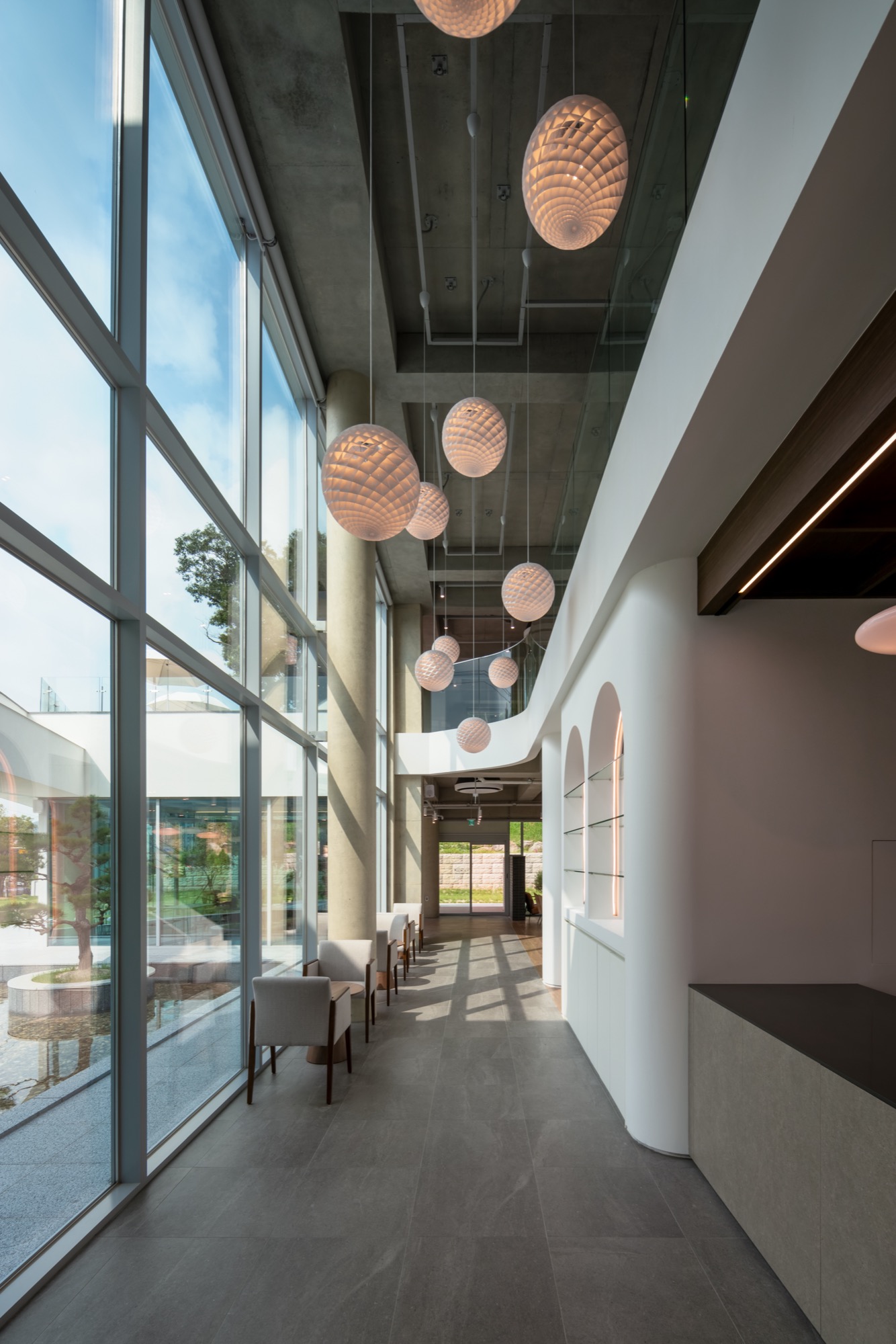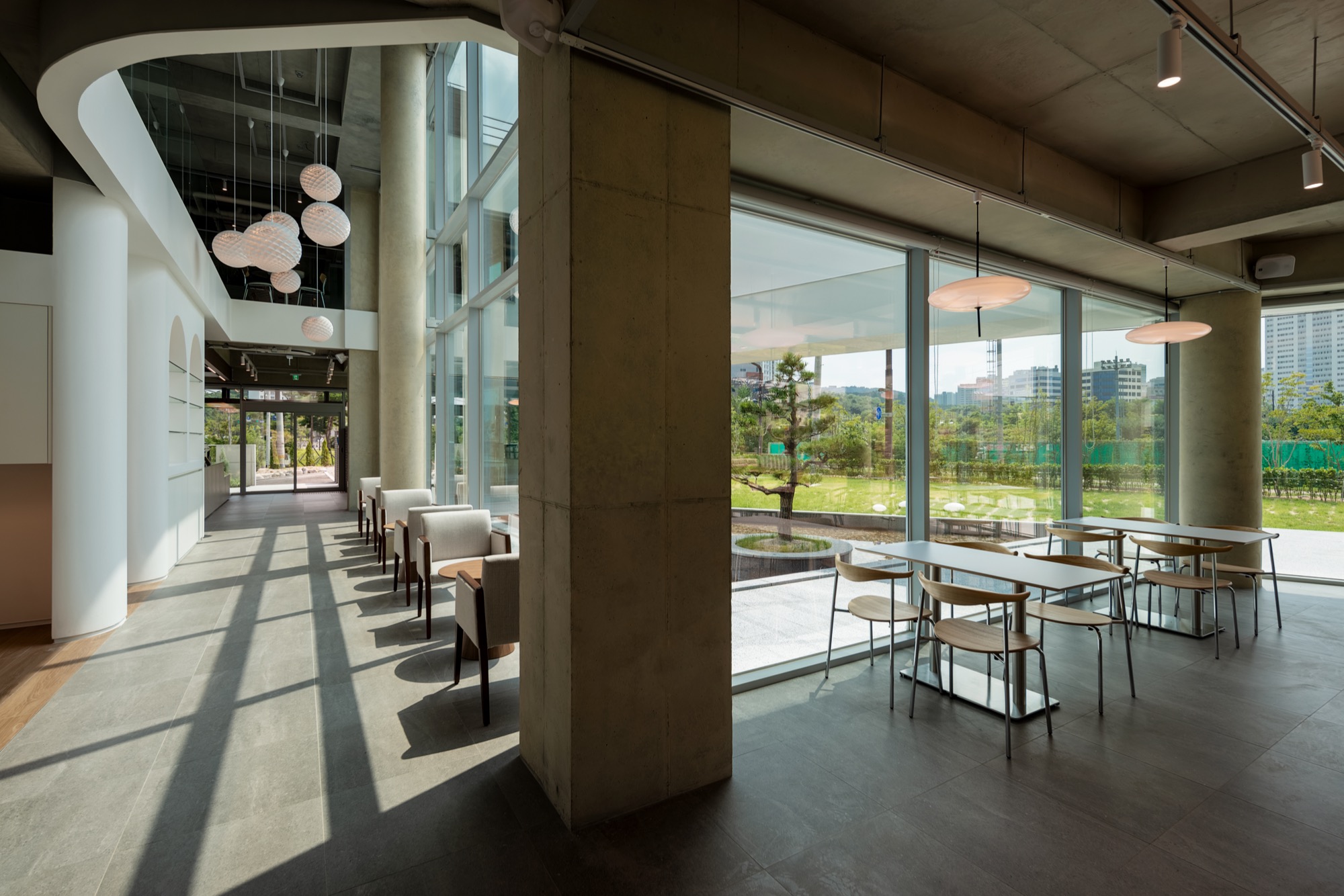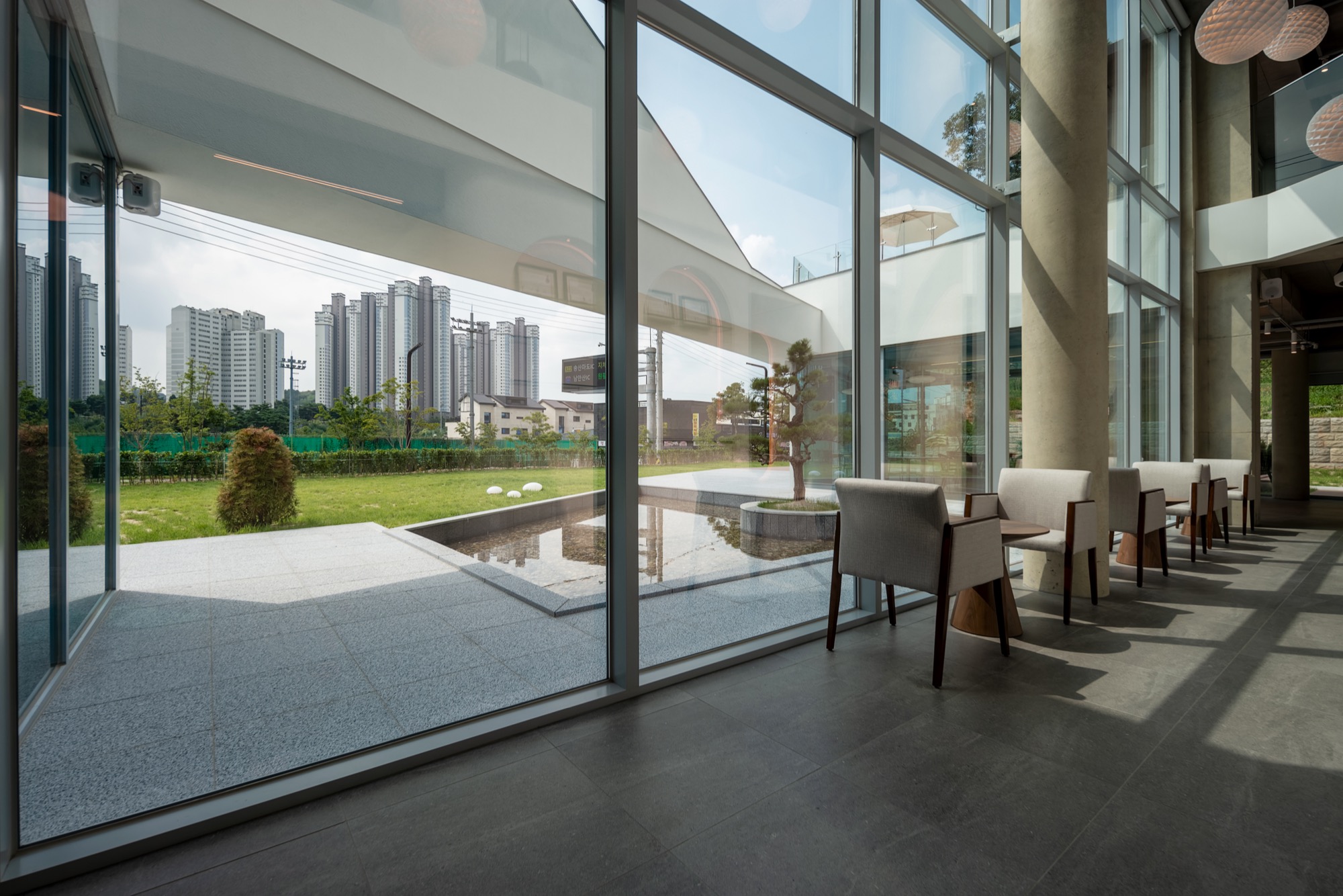 유리는 외부공간과 중정의 수공간 모습을 반사하고 투영하며, 내부와 외부의 경계를 흐리게 만들어 안과 밖의 공간이 서로 관계를 맺고, 콘크리트 구조체는 마감을 최소화하여 공간의 본질을 드러내고, 이와 대비되는 자연소재의 우드와 플랜테리어를 조합하여 따뜻하고 친근한 실내환경을 구성하였다. 이러한 요소들은 방문객들에게 마치 자연 속에 있는 듯한 경험을 제공하며, 도시 생활의 스트레스에서 벗어나게 한다. 이는 단순히 물리적인 공간의 배치뿐만 아니라, 감성적으로도 방문객들에게 긍정적인 영향을 미칠 수 있는 요소로 작용한다.