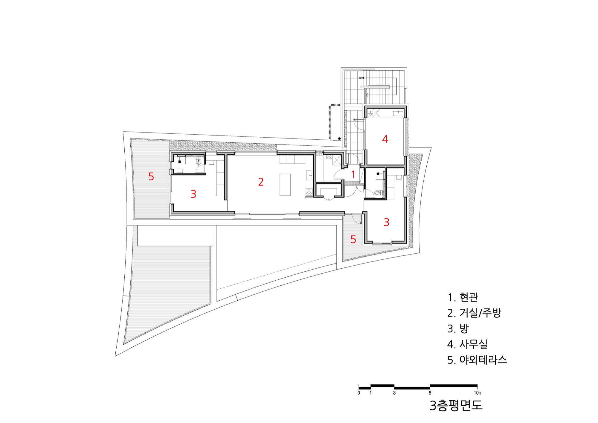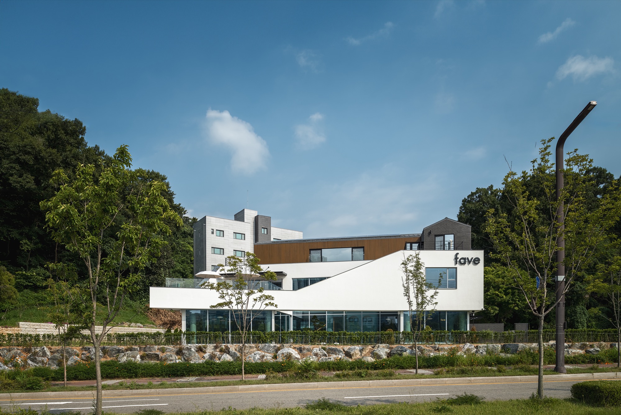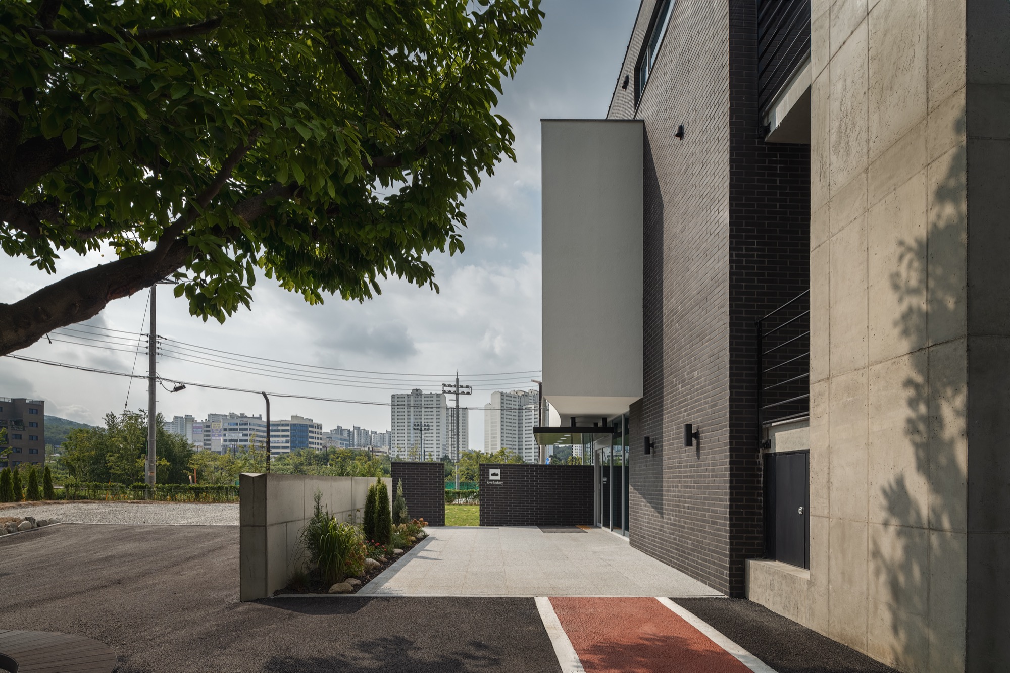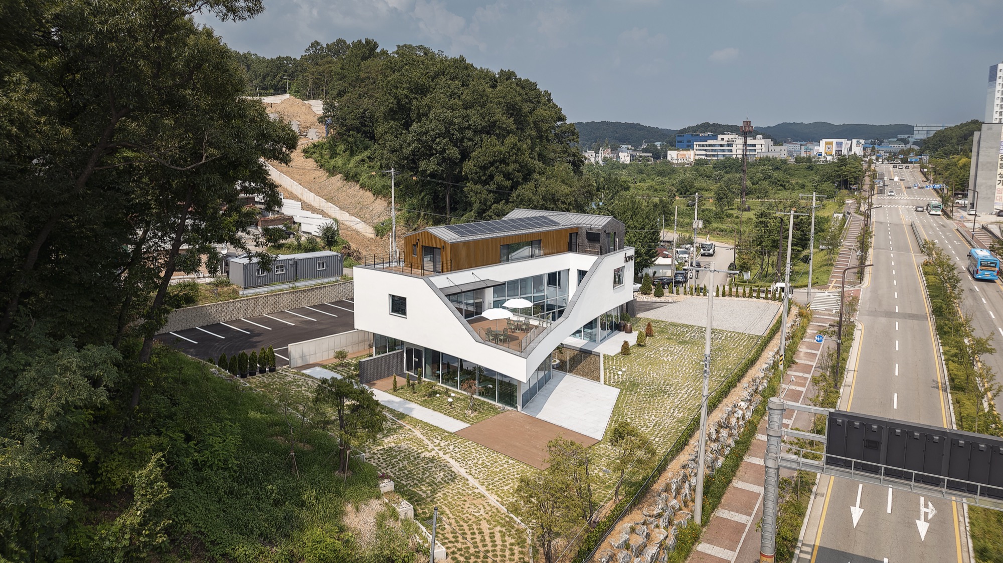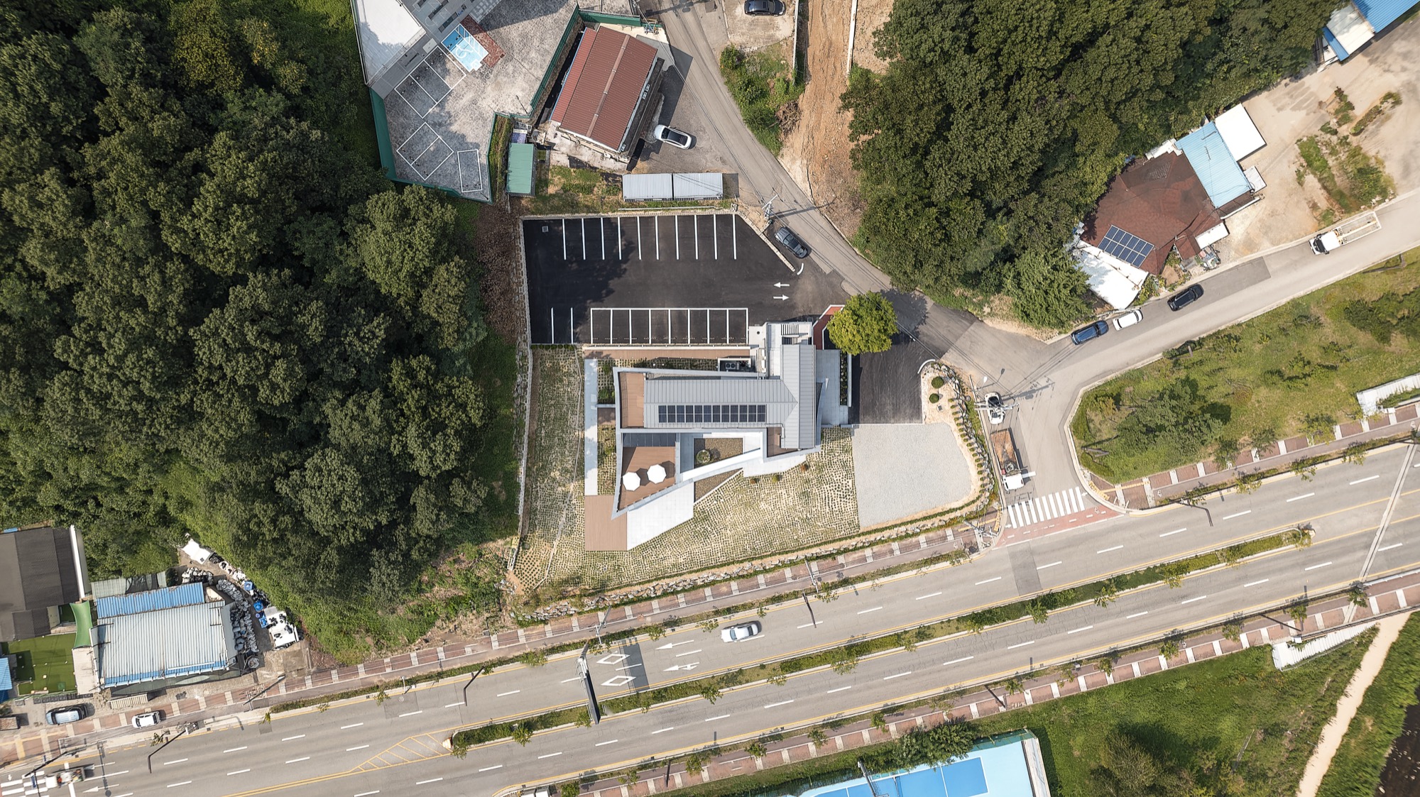 뒤로 울창한 숲이 있고, 반대로 길 건너엔 신도시가 위치한 대지. 도심 속에 자리 잡고 있으나 자연녹지지역으로 전원적 주변 환경을 가진 대지는 비정형의 모습을 가지고 있었다. 그리고 바로 옆에 문화재가 있어 높이 제한이 있는 땅이다. 이러한 제약은 건축물의 디자인에 큰 영향을 미치며, 건축주는 이를 잘 활용하고 대지의 특성을 살리기를 원하고 있었다.
