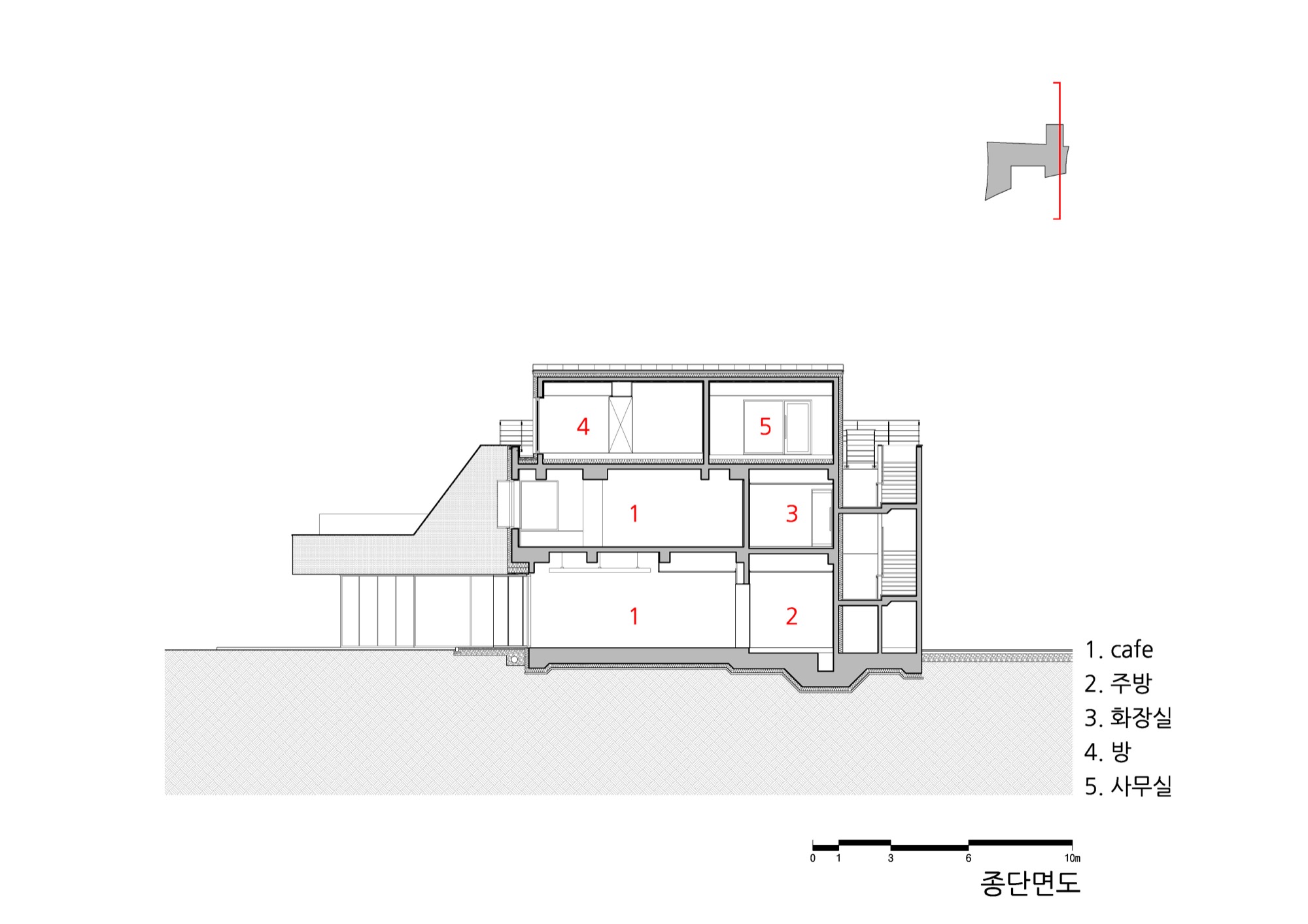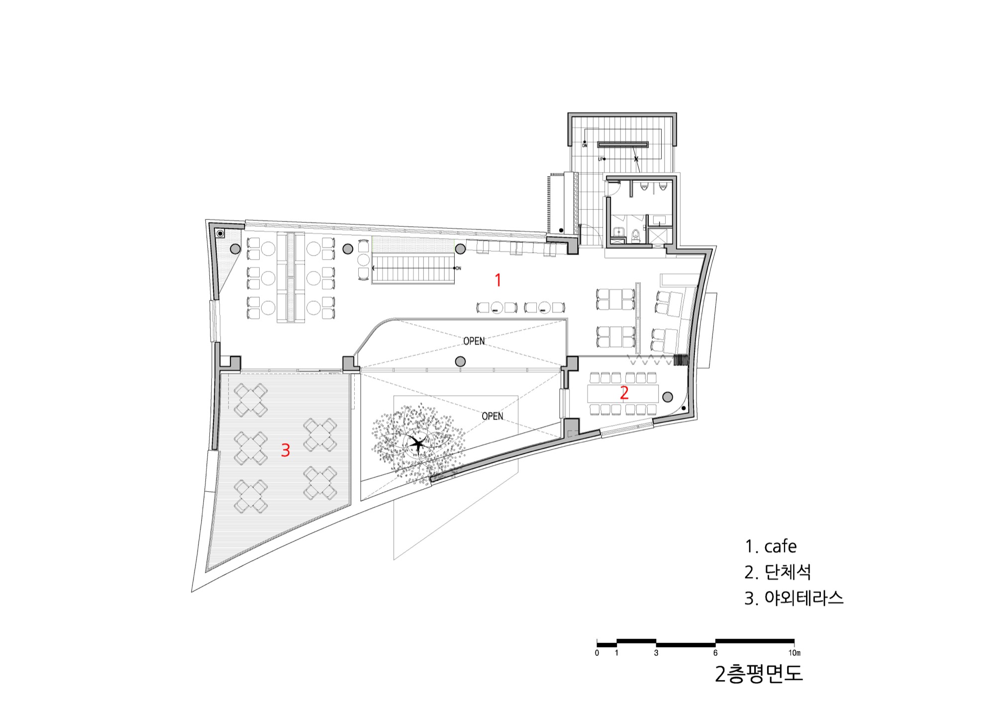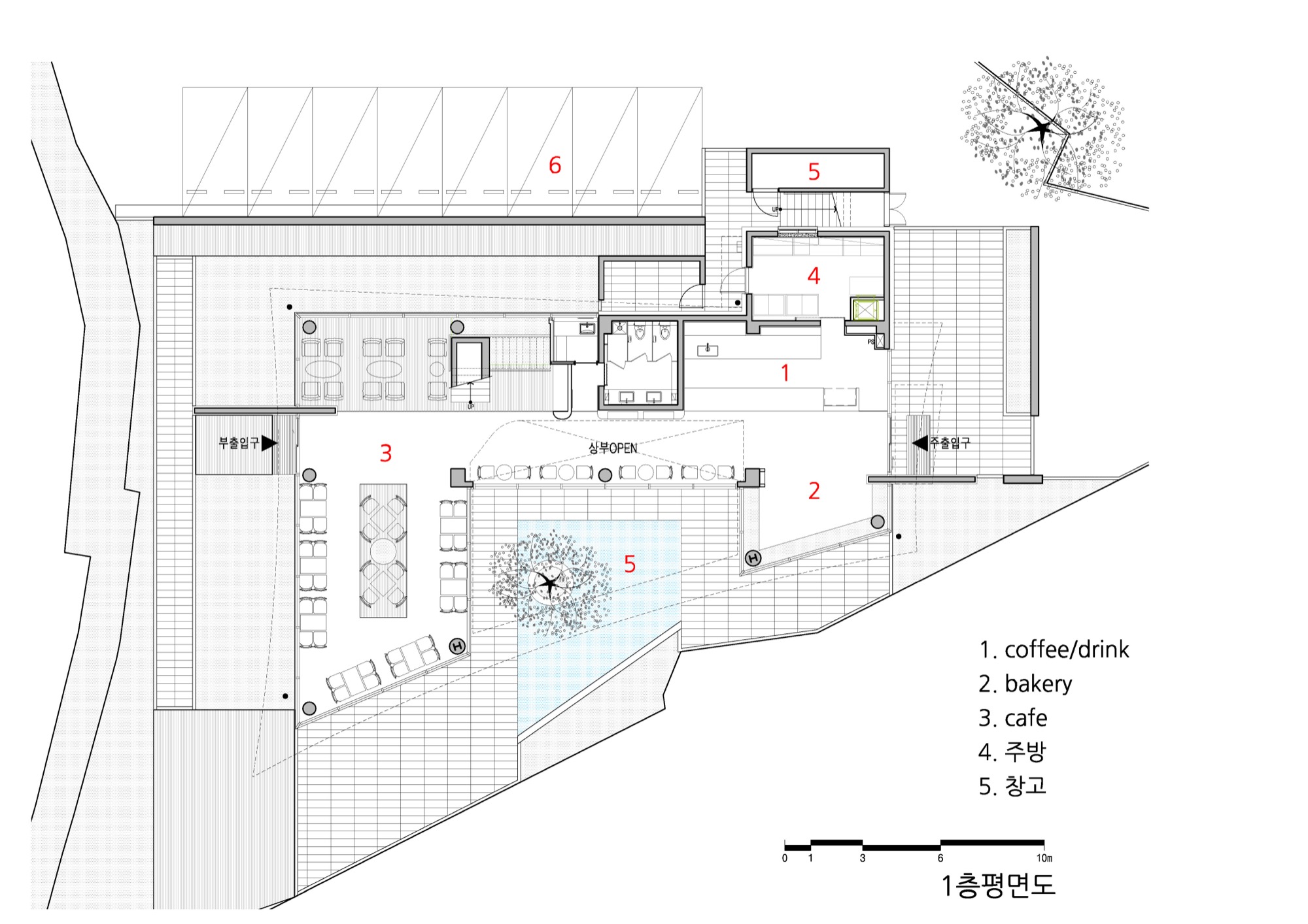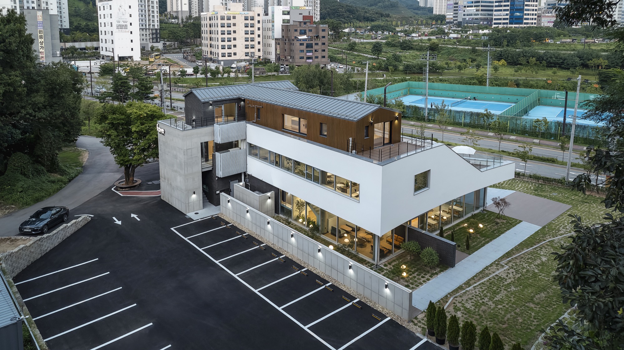 건축주가 어렸을 때 심었던 목련으로 자연스럽게 방향성이 생겨 주차영역과 건축영역이 구분됐고, 그로 인해 카페 주 출입구에 도달하는 진입동선이 만들어졌다. 다양한 공간적 의미를 두고자 비우고 채우는 공간들을 만들었다. 비움과 채움의 적절한 내외부 공간배치는 주변의 형상과 아름다움을 더 잘 끌어들이고, 담장과 벽의 높낮이 변화로 시선을 차단하고 공간을 한정하며 오롯이 자연과 인간이 함께하길 바랐다. 방문객들에게는 휴식과 즐거움을 제공하는 환경을 조성하며, 내외부 공간의 배치가 주변의 아름다움을 끌어들이는 역할을 하고, 사람들에게 자연의 소리와 향기를 느낄 기회를 제공하여, 더욱더 편안하고 안락한 분위기를 조성하고자 했다.
