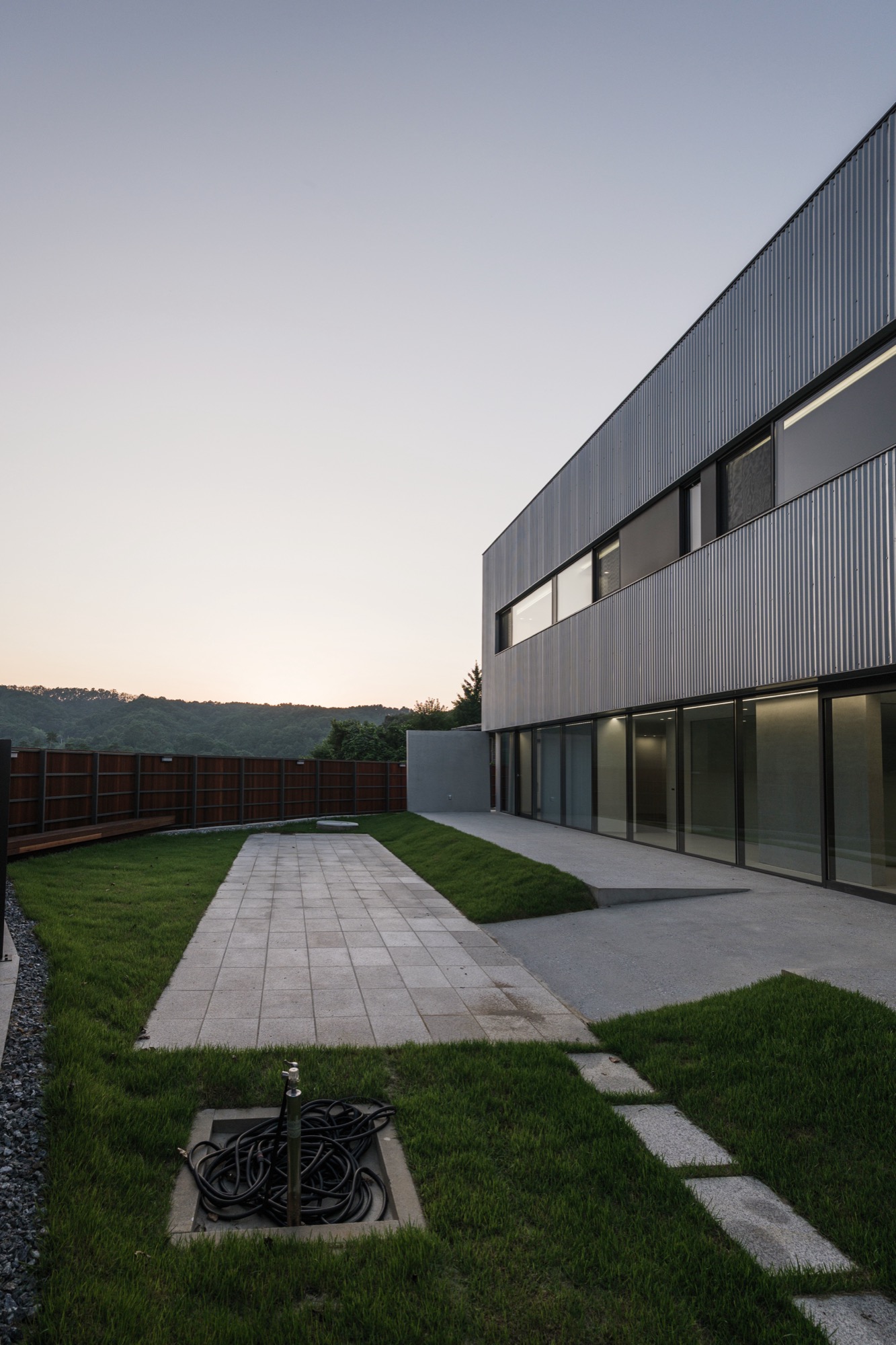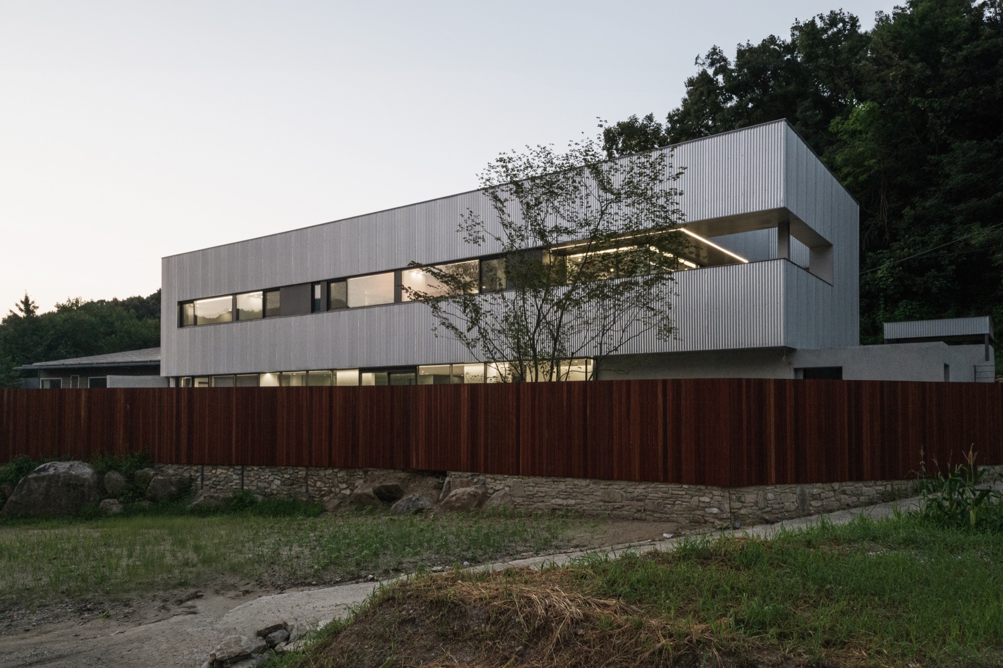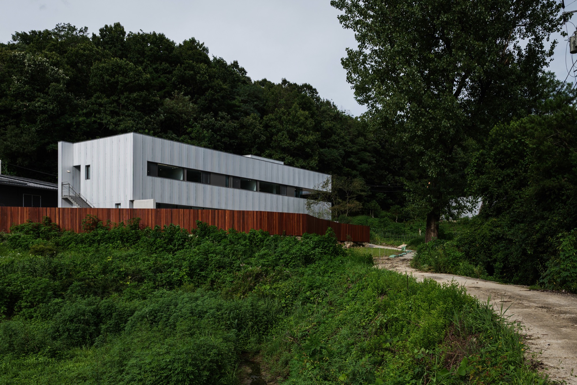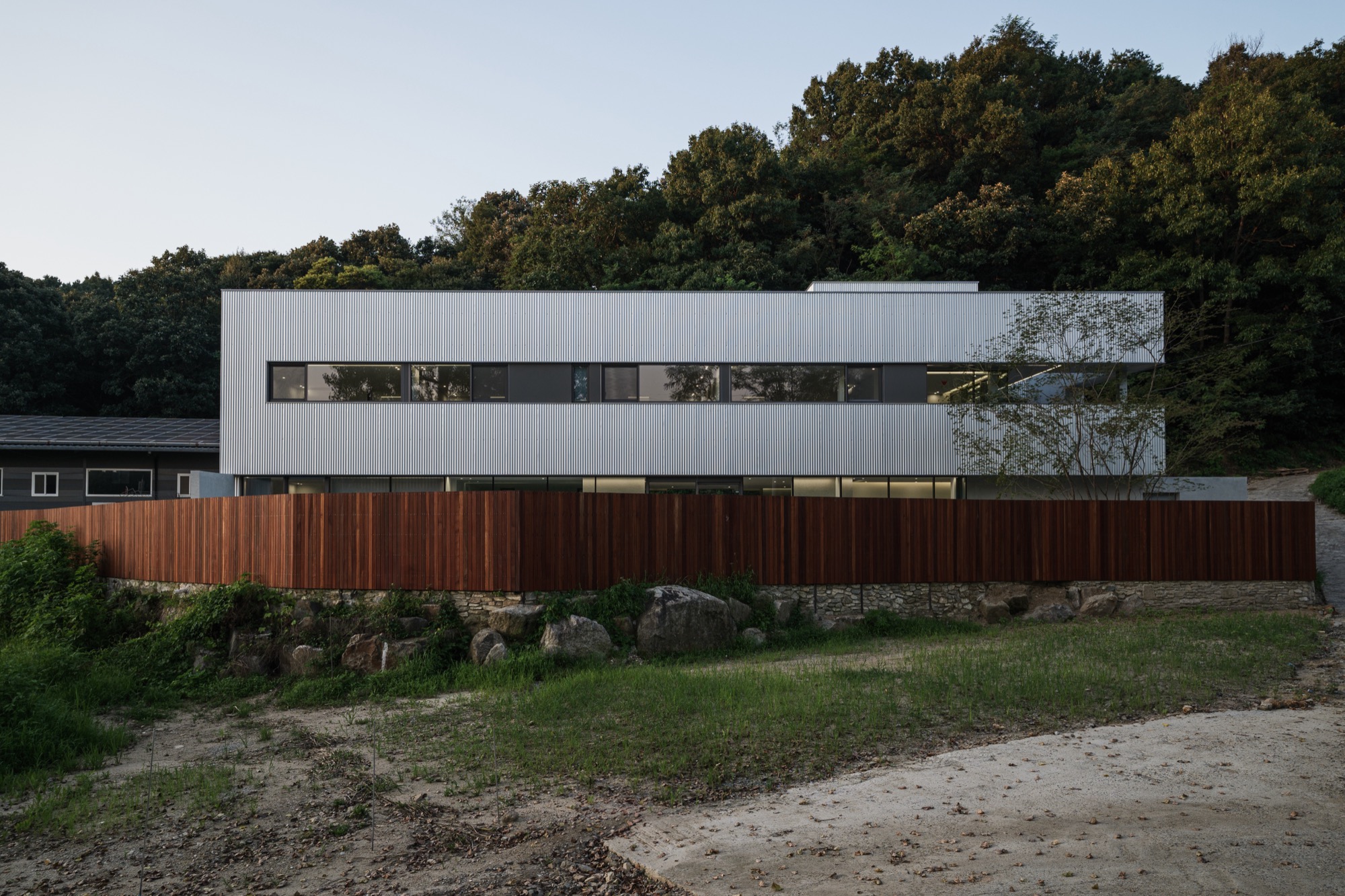 양평군 지평면 시내에서 마을 길을 따라 걷다 보면 숲과 맞닿은 그리 멀지 않은 곳에 단정한 반려견들을 위한 은빛 건물이 나타난다. 기존 건물을 새롭게 단장한 공간이지만, 항상 그곳에 있었던 것처럼 자리 잡고 있다. 낮은 석축과 그 위로 사람 키만한 나무 담장이 주변의 짙은 산록과 어우러지며 건물 주변의 경계를 흐리고, 가로로 단정한 건물은 주변에 위화감 없이 스며든다.