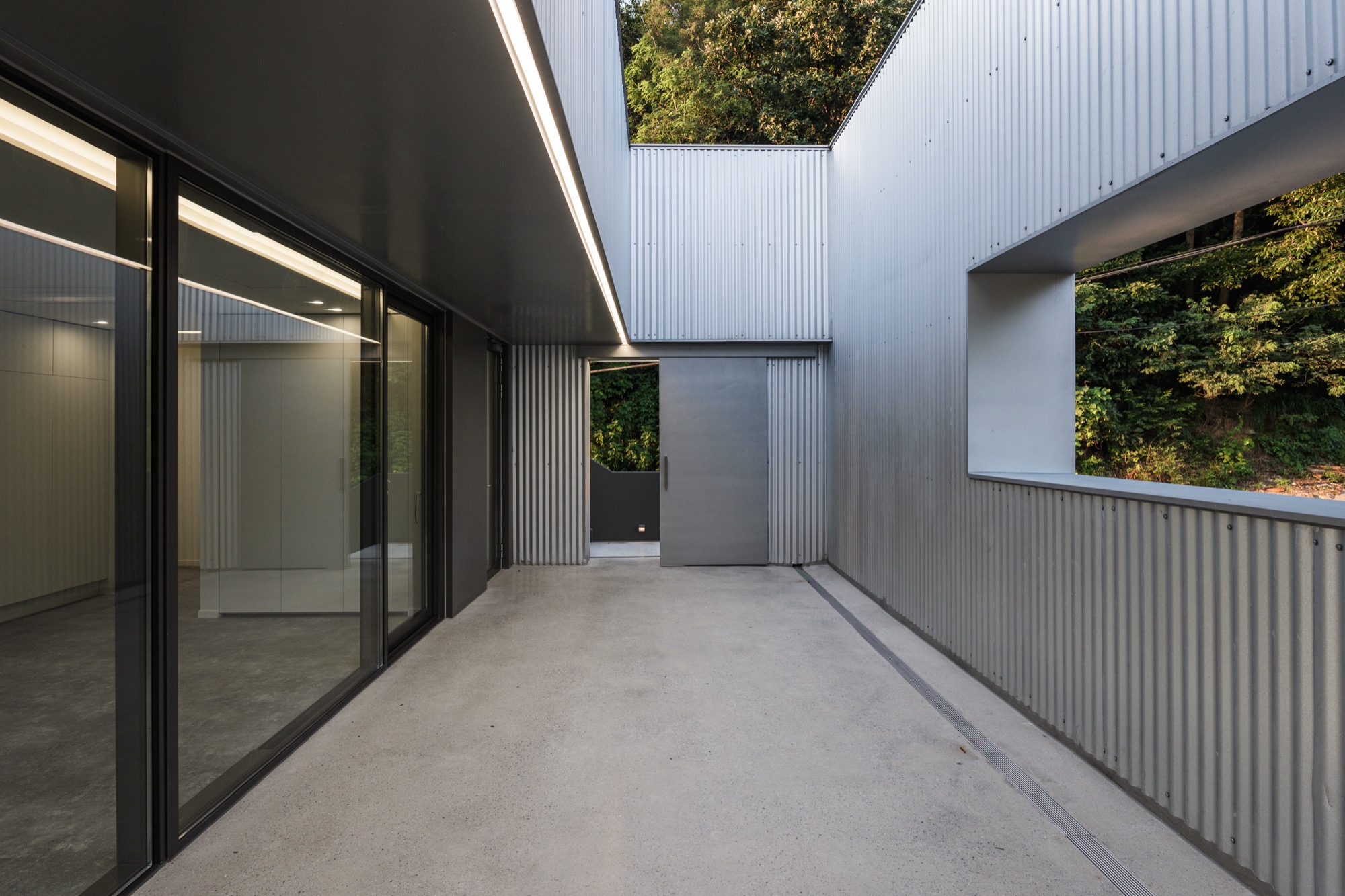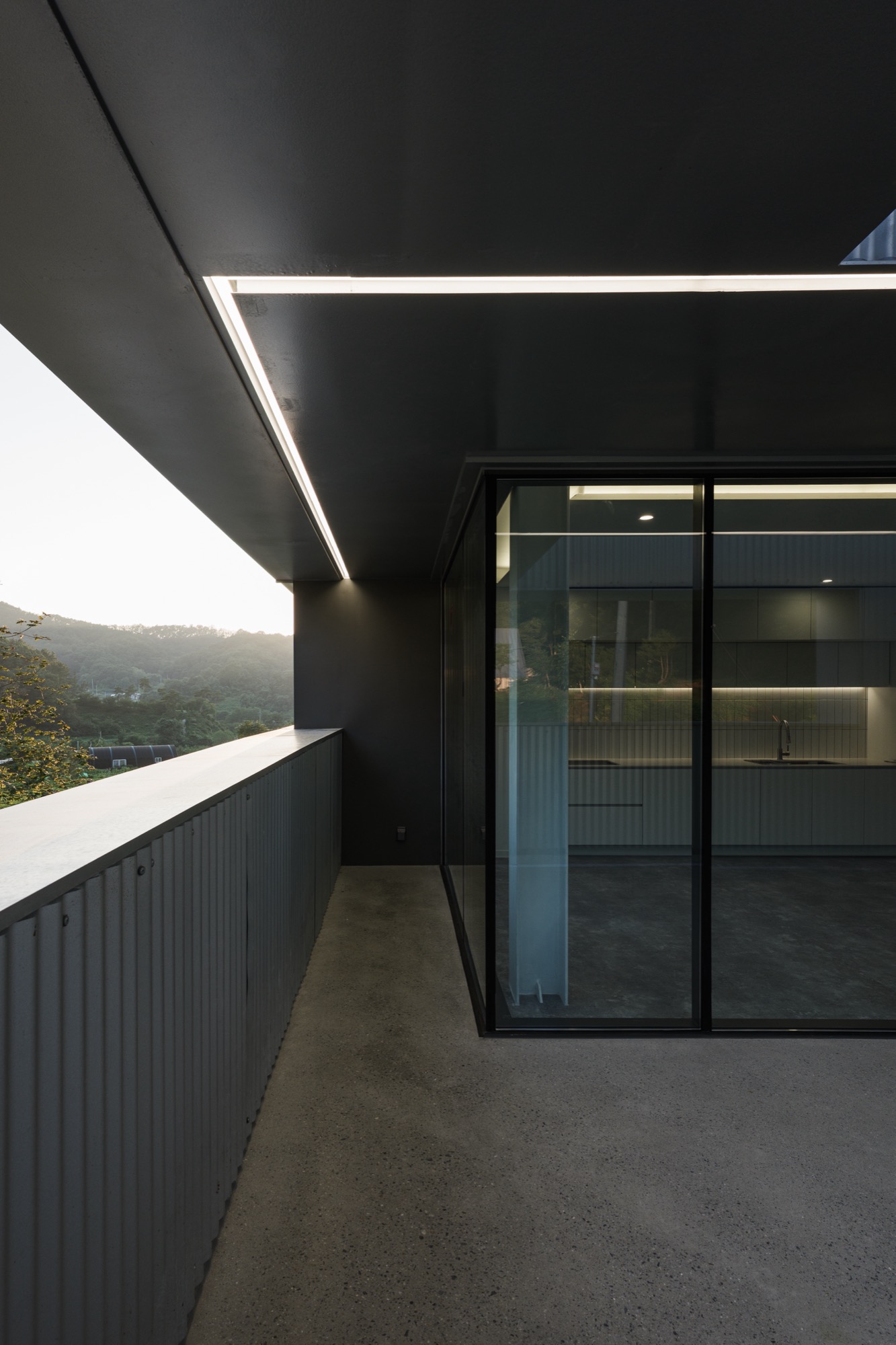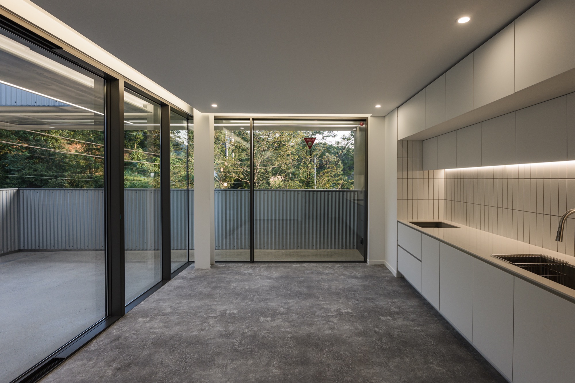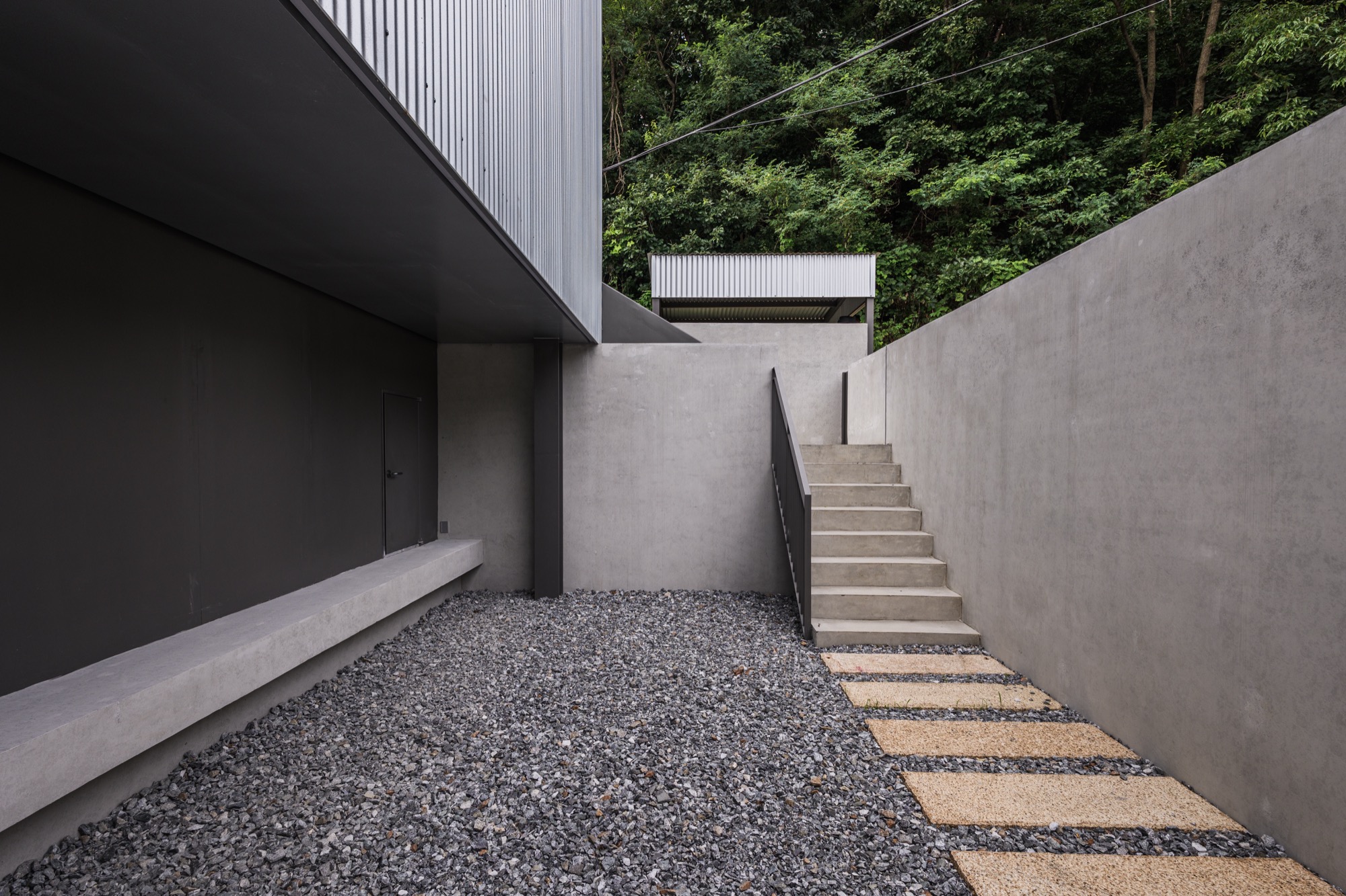 콘크리트 담장으로 둘러싸인 중정을 지나 외부계단을 통해 2층으로 올라가면 주변 자연이 파노라마로 한눈에 들어오는 외부 테라스가 나온다. 테라스를 거쳐 실내로 들어가면 실내공간은 식사준비를 위한 주방과 성견을 위한 네 개의 공간으로 구분된다. 골강판으로 둘러싸인 2층은 반려견을 돌봐주는 사람의 눈높이로 가로로 긴 창을 통해 채광과 조망을 확보했고, 반려견 눈높이에는 창을 두지 않아 편안하게 휴식할 수 있는 공간이 되도록 했다.