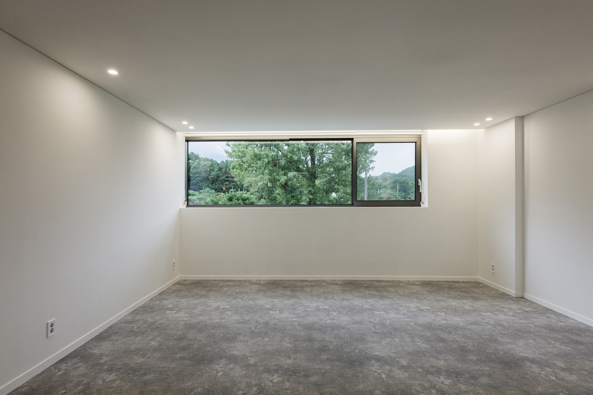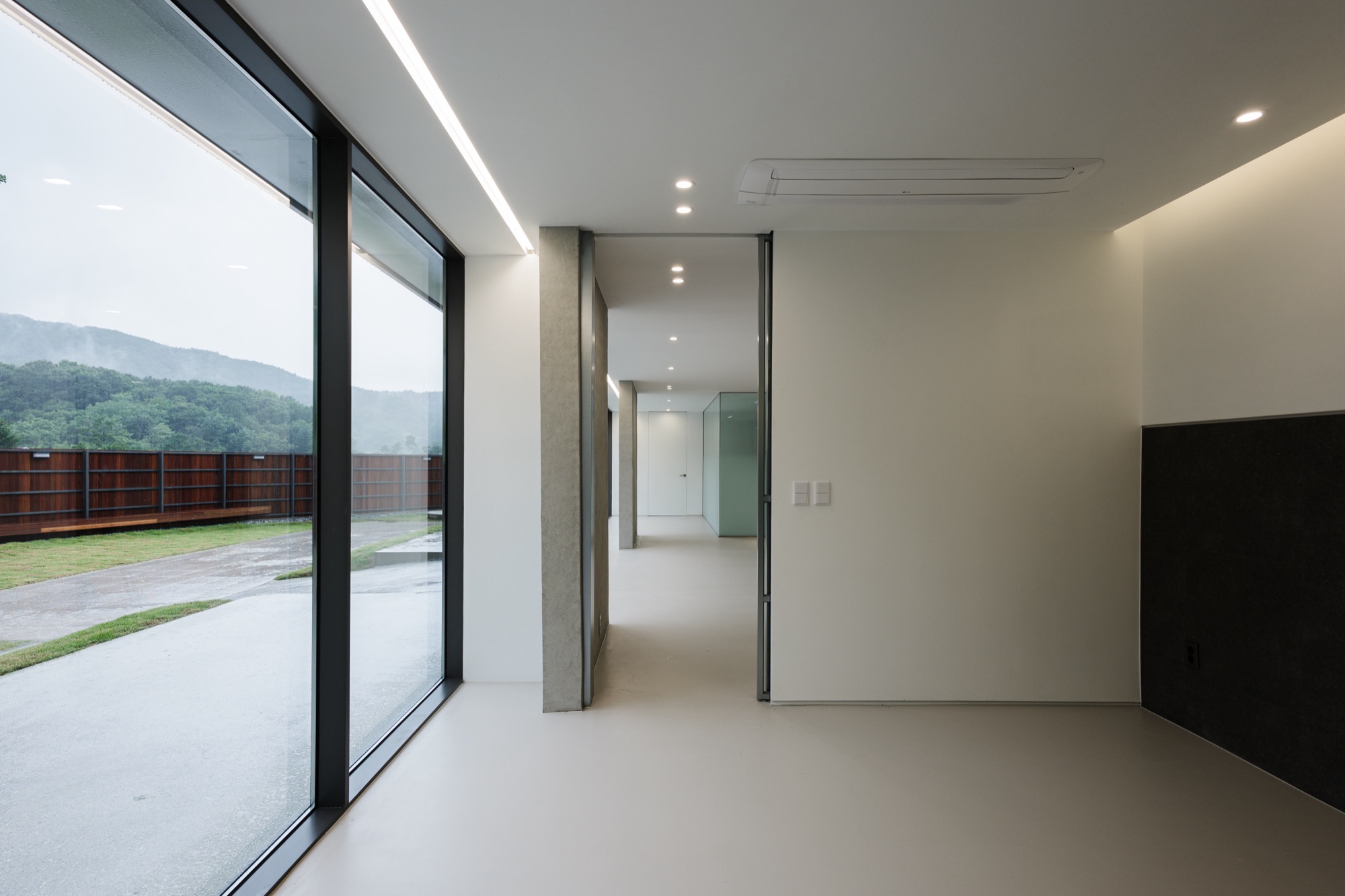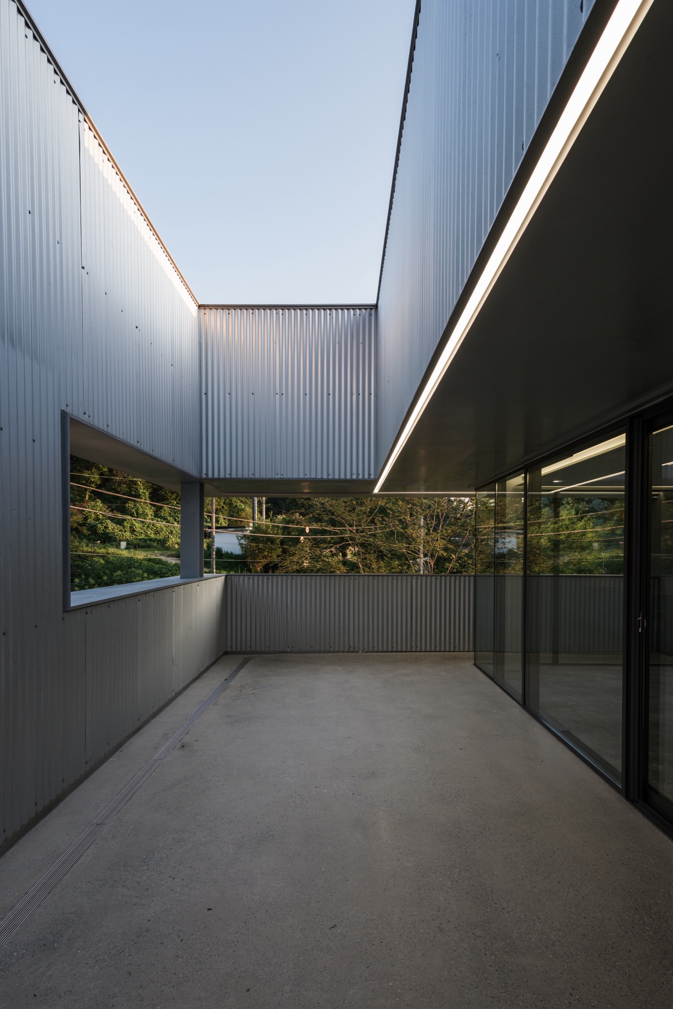 콘크리트 담장으로 둘러싸인 중정을 지나 외부계단을 통해 2층으로 올라가면 주변 자연이 파노라마로 한눈에 들어오는 외부 테라스가 나온다. 테라스를 거쳐 실내로 들어가면 실내공간은 식사준비를 위한 주방과 성견을 위한 네 개의 공간으로 구분된다. 골강판으로 둘러싸인 2층은 반려견을 돌봐주는 사람의 눈높이로 가로로 긴 창을 통해 채광과 조망을 확보했고, 반려견 눈높이에는 창을 두지 않아 편안하게 휴식할 수 있는 공간이 되도록 했다.
