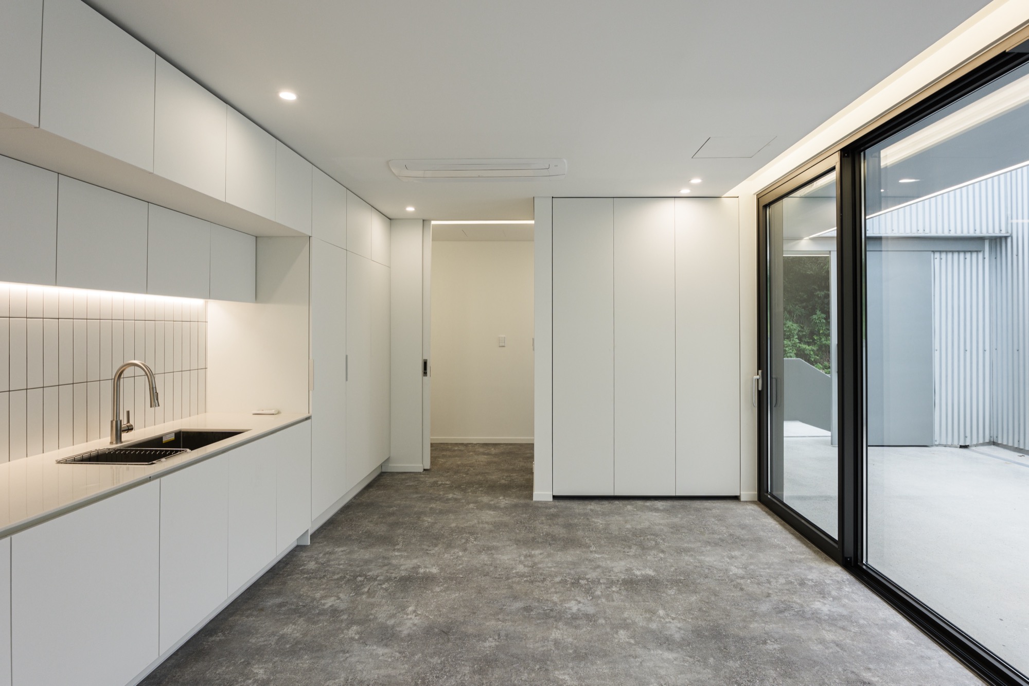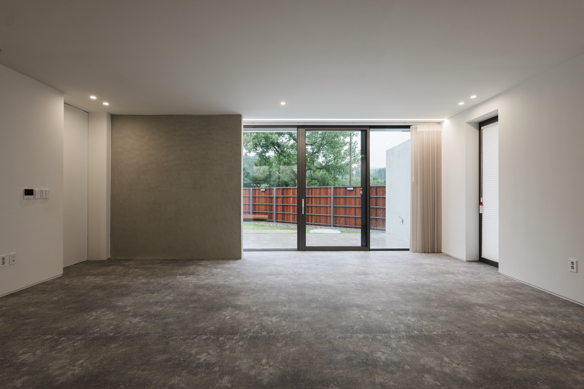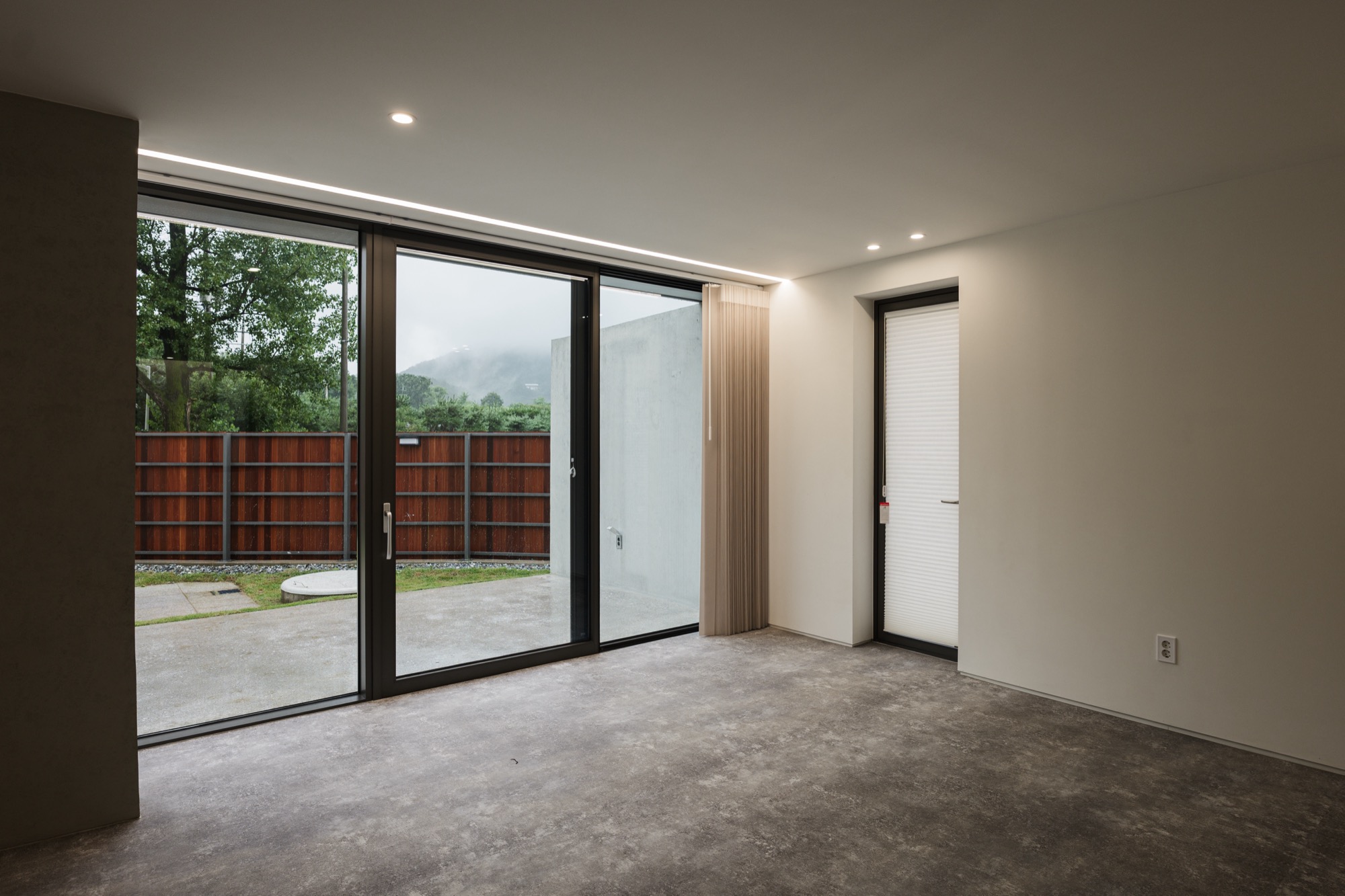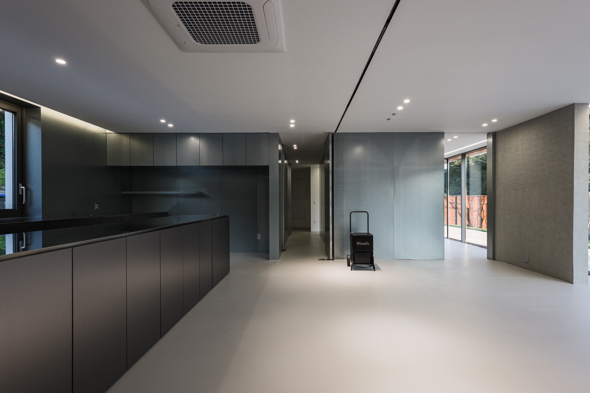 콘크리트 담장으로 둘러싸인 중정을 지나 외부계단을 통해 2층으로 올라가면 주변 자연이 파노라마로 한눈에 들어오는 외부 테라스가 나온다. 테라스를 거쳐 실내로 들어가면 실내공간은 식사준비를 위한 주방과 성견을 위한 네 개의 공간으로 구분된다. 골강판으로 둘러싸인 2층은 반려견을 돌봐주는 사람의 눈높이로 가로로 긴 창을 통해 채광과 조망을 확보했고, 반려견 눈높이에는 창을 두지 않아 편안하게 휴식할 수 있는 공간이 되도록 했다.