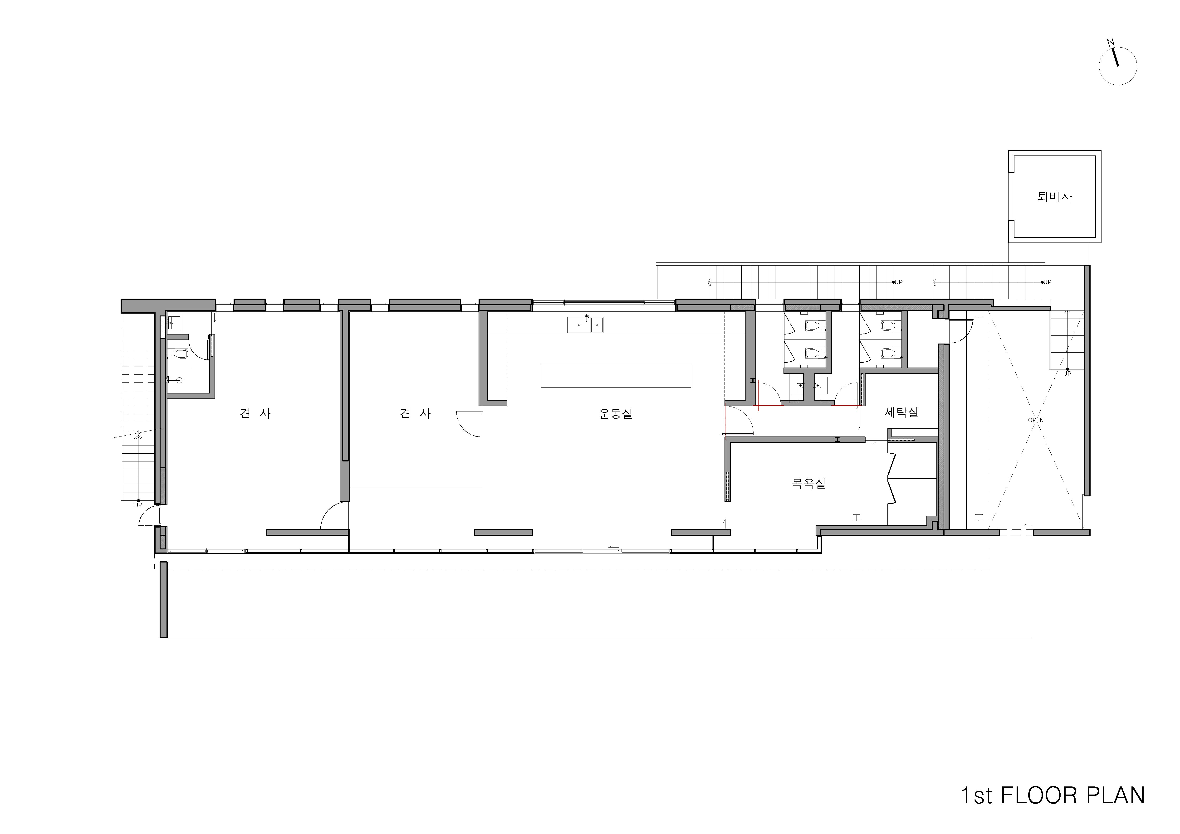 증축을 의뢰받고 찾아간 기존 건물은 다섯 개의 공간으로 구분되어 외부로만 이동할 수 있는 불편한 구조였다. 게다가 부실한 시공으로 2층 지붕 방수가 제대로 되지 않아, 비가 안 오는 날에도 1층 실내로 고인 물이 떨어지는 상황이었다. 건축주는 사용하기 불편하지 않고, 단열, 방수가 잘된 기본에 충실한 공간이었다. 운영 중인 공간이었기에 부족한 부분을 최대한 빨리 보완해 다시 사용하길 바랐기에, 증축 부분을 철골조로 시공하여 공사기간이 짧아질 수 있도록 제안했다. 두 개의 층으로 구분된 공간은 외부 활동이 많은 반려견을 위해 층별로 진입하도록 구성했고, 부족한 공간 일부를 증축하여 보완하기로 했다.