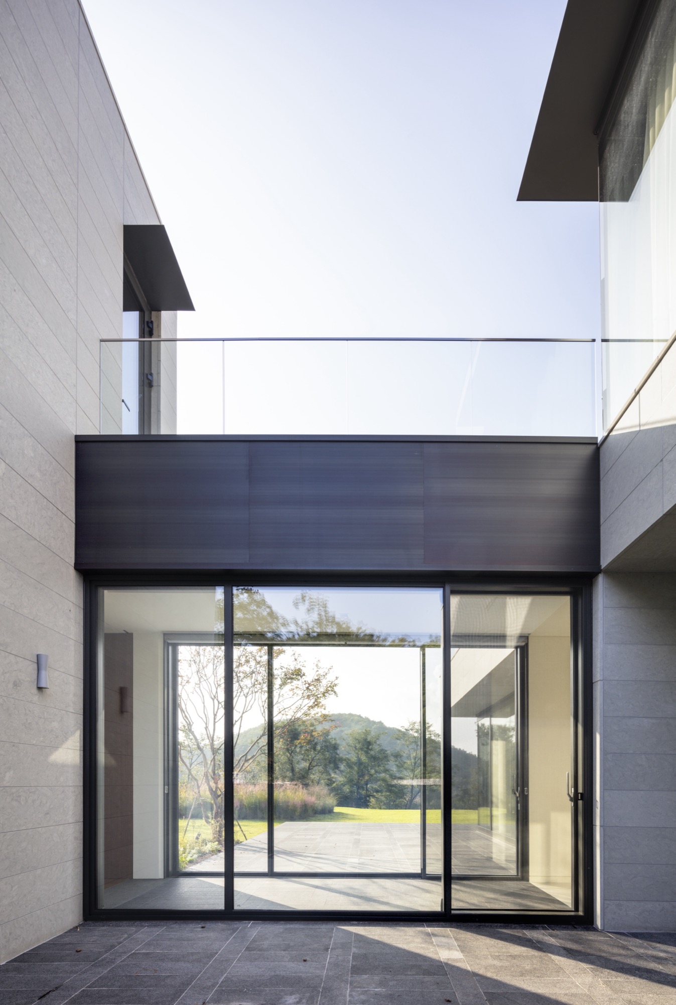 서쪽 산의 능선이 제공하는 풍광은 훌륭했지만, 점점 뜨거워지는 여름과 아침의 기분 좋은 햇살은 무시할 수 없는 요소였다. 다행히 넉넉한 대지 덕에 서측의 풍광을 끌어들일 공간적 여유가 허락되었기에 남향 배치를 기본으로 하여 풍경을 담을 방법을 모색하였다. 도로로부터 긴 대지의 깊이를 이용하여 안쪽에 동서로 긴 매스를 배치했고, 바깥쪽에 짧은 매스를 두어 내외부 공간에 위계를 부여하였다. 두 개의 매스가 연결되며 외부 공간은 여러 모습의 마당으로 나뉘고 내부 공간은 마당을 받아들이며 변주를 보인다. 대문에서 현관에 이르는 진입 마당, 현관과 식당 사이 차 한잔의 여유를 즐길 수 있는 작은 마당, 거실 앞 주변 산세를 조망할 수 있는 시원한 앞마당, 그리고 구릉지와 완만하게 연결된 지하의 선큰 마당은 주택의 표정을 다채롭게 한다.