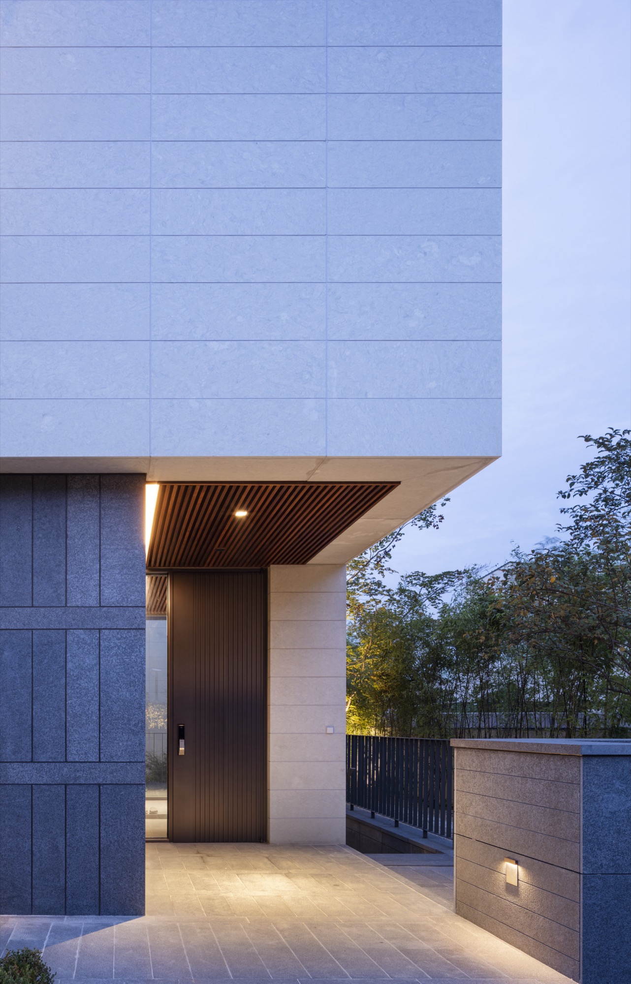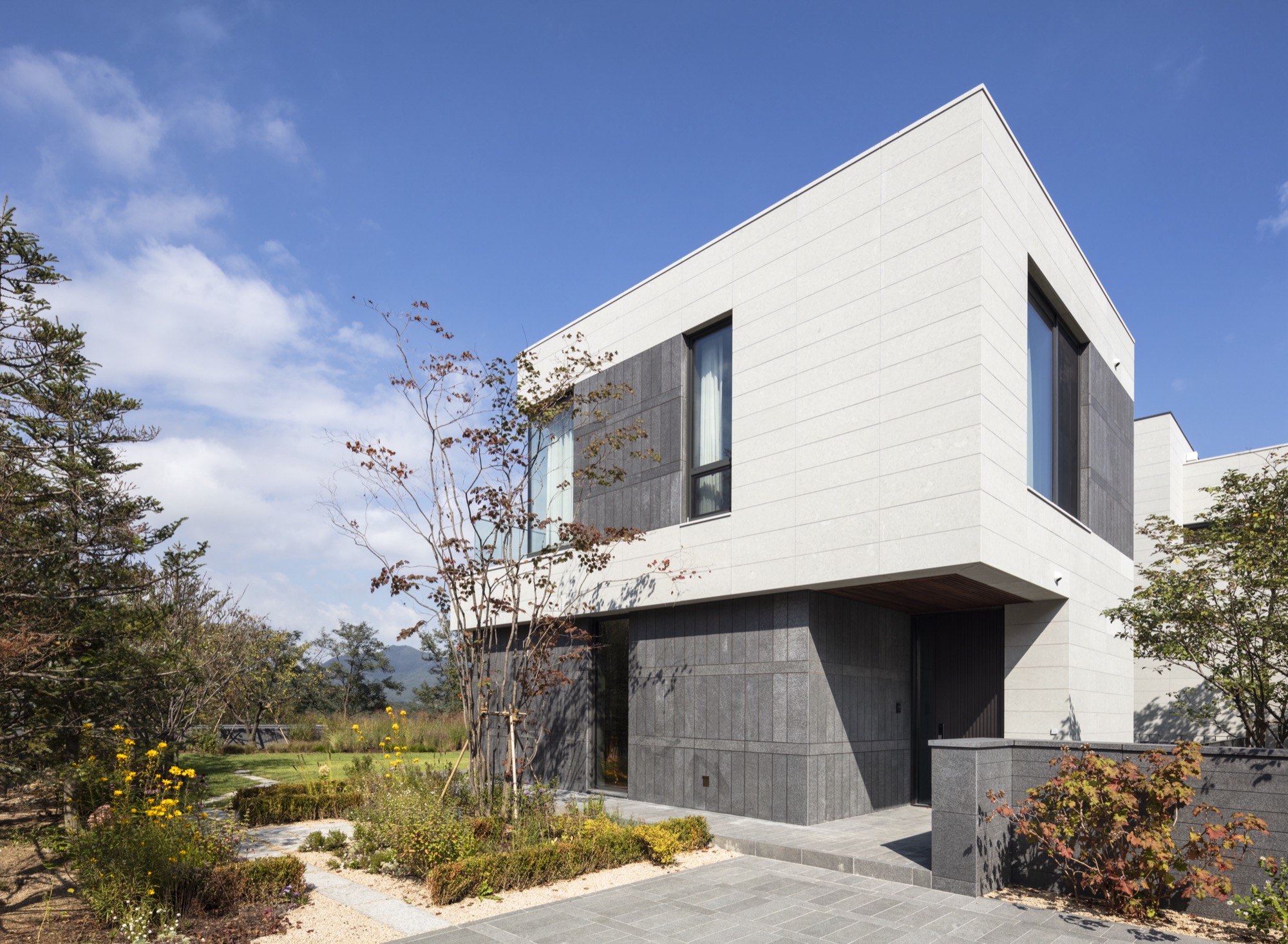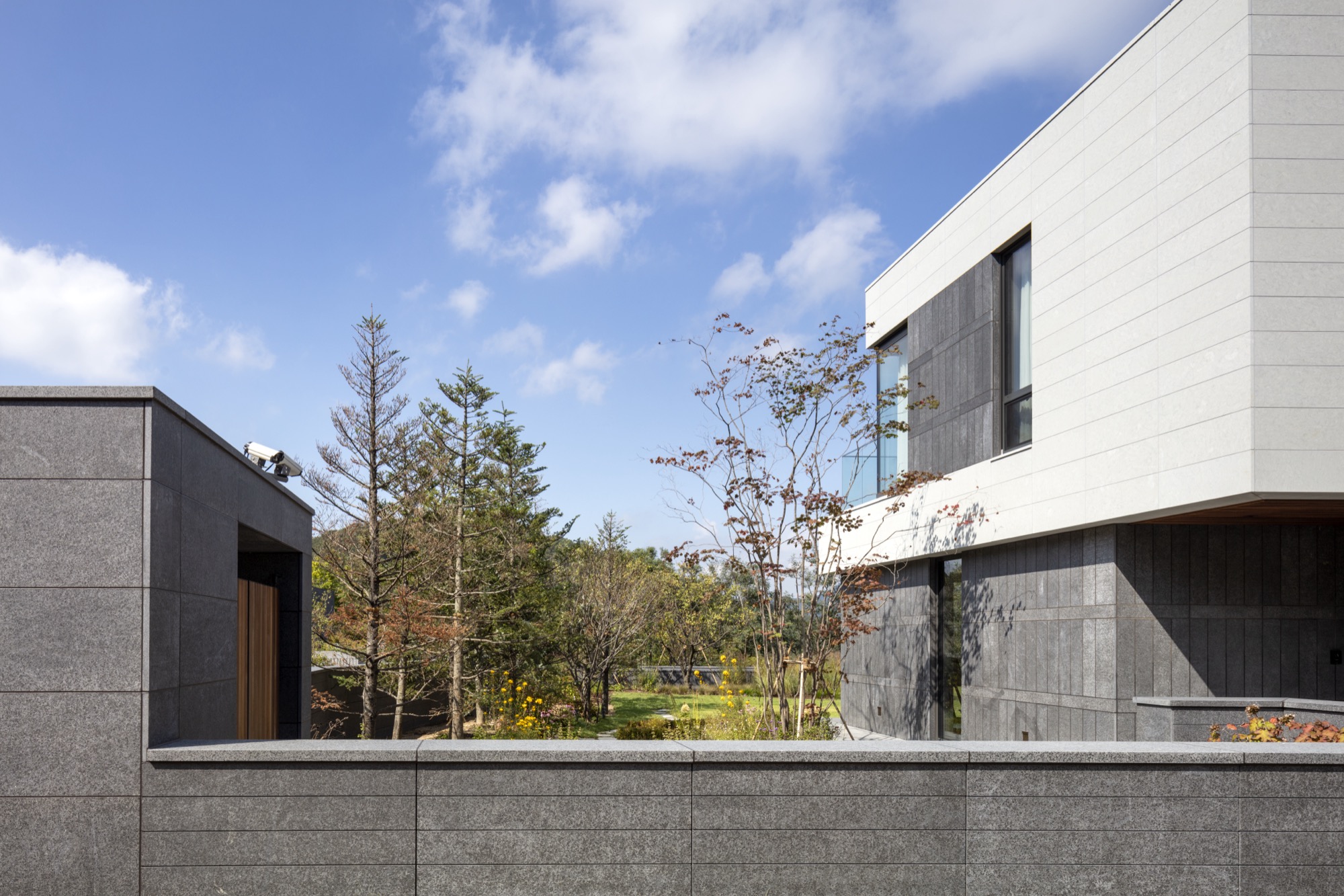현관에 들어서면 작은 마당의 단풍나무를, 중문을 지나며 앞마당의 연못과 살랑이는 실새풀을, 거실로 다가가며 뒷마당의 벚나무를 조우하게 된다. 분리된 영역으로 길어진 동선이지만 여러 풍경을 받아들이며 시간의 흐름과 호흡하는 순간을 마련해준다. 마당을 가로지르는 연결 복도는 내외부의 바닥이 동일하게 마감되어 양측의 슬라이딩 도어를 개방하면 좌우의 마당이 하나로 이어진다. 담백하게 마천석과 라임스톤으로 Tone on Tone된 외관은 식재된 나무들을 돋보이게 하고 햇빛과 그림자, 빗방울의 인상적 모습을 발견하게 한다.