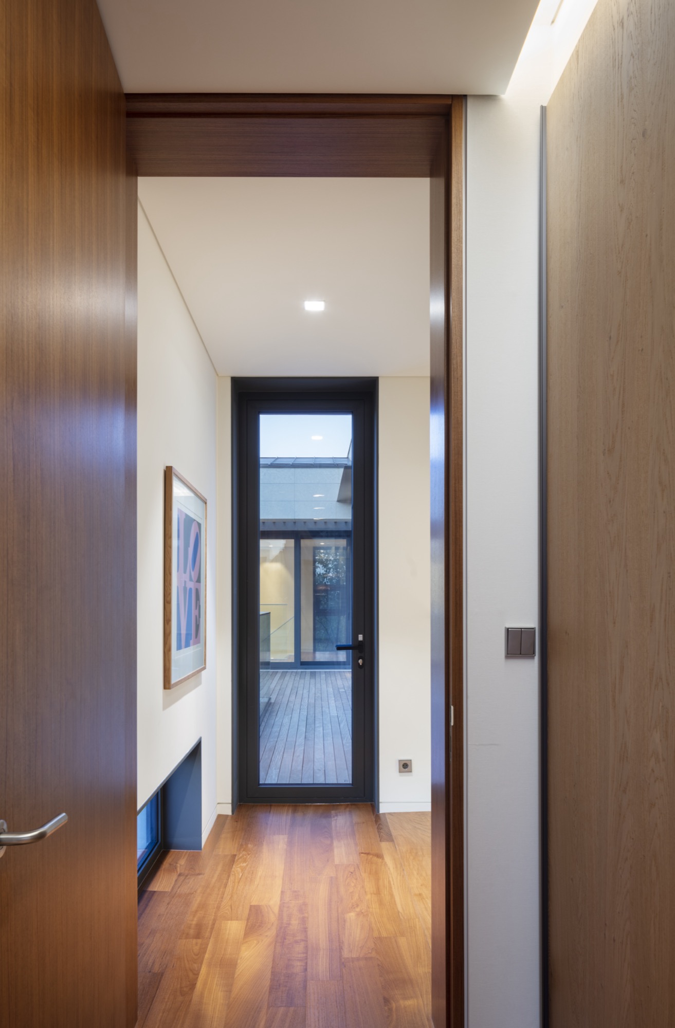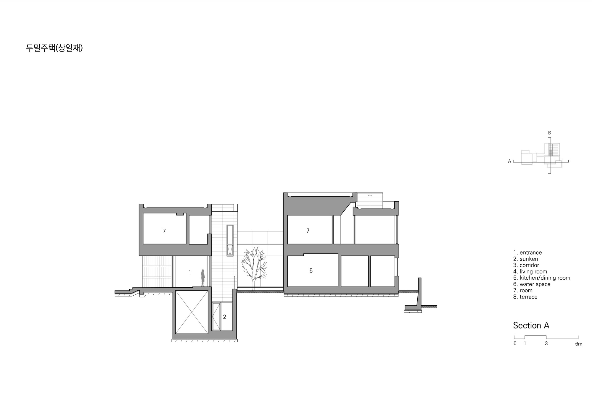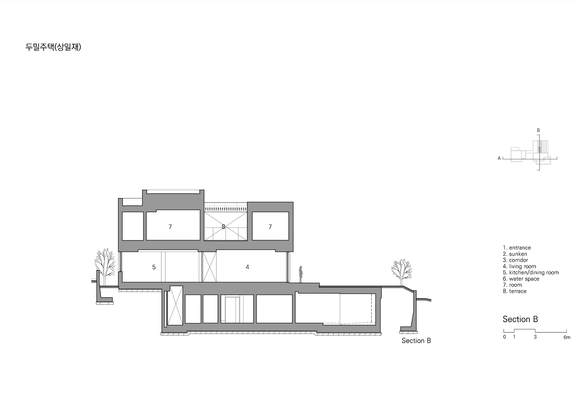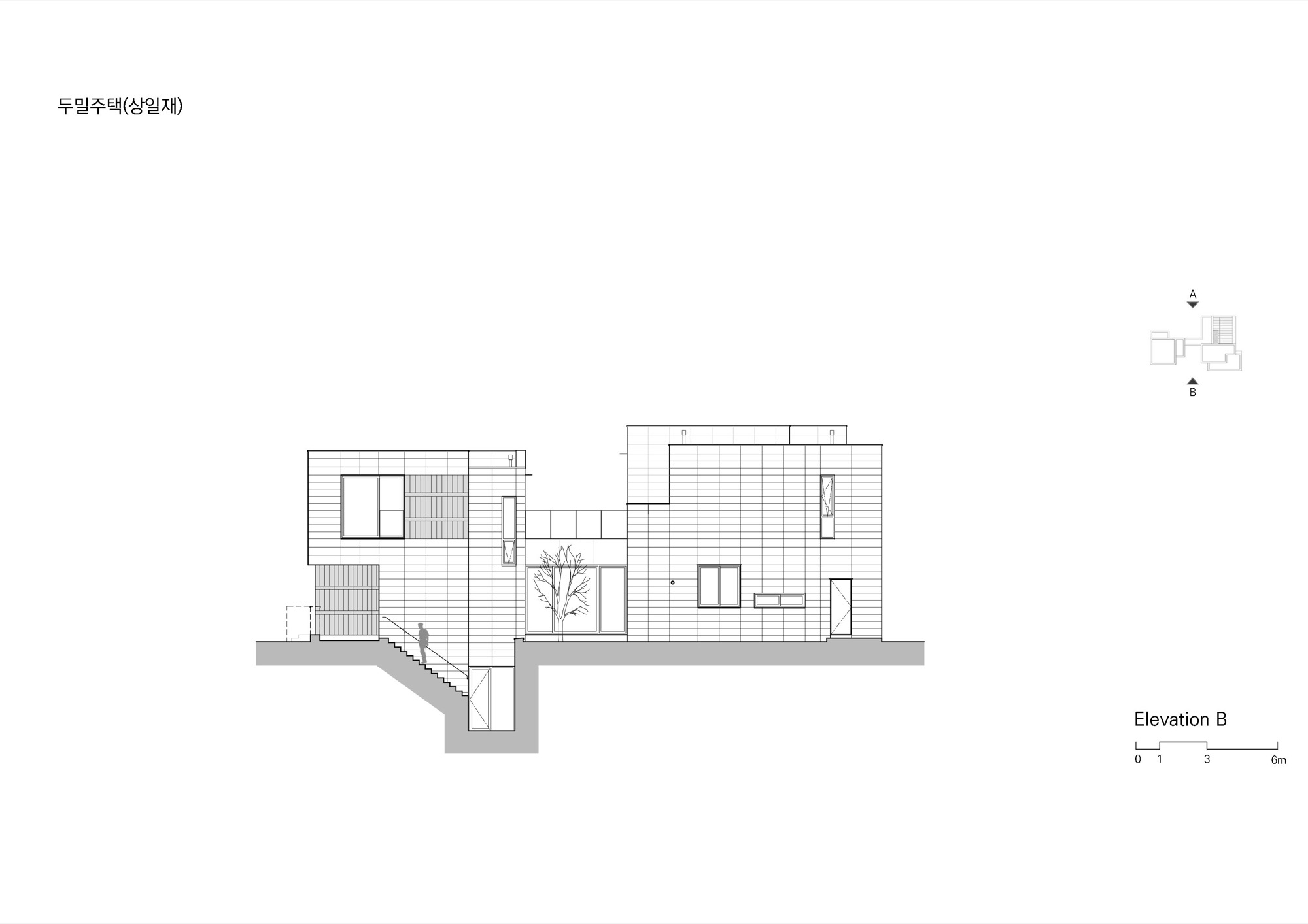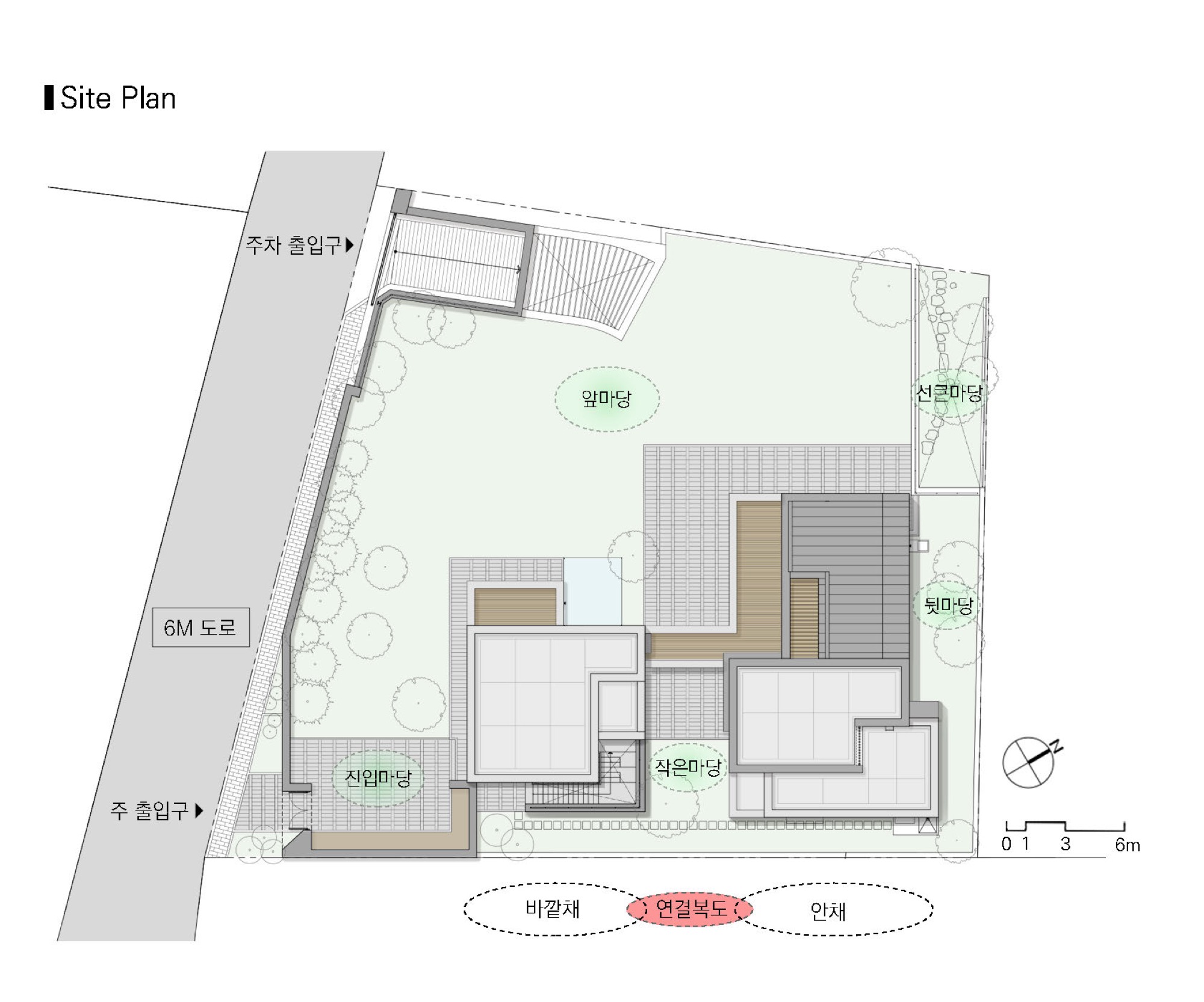 도로측 매스는 주택 접근 시 주 공간을 뒤로 살짝 숨기며 앞에 나와 맞이하는 역할을 한다. 상대적으로 낮은 높이와 작은 규모로 겸손한 첫인상을 주며 주공간의 채광과 조망을 방해하지 않는다. 도로 측 바깥채에 게스트 룸과 아들의 영역이 별도의 현관과 계단을 갖추고 있다. 안채와 연결하는 복도에는 필요에 따라 공간을 분리할 수 있는 문이 설치되어 있고 설비는 별도 제어가 가능하도록 고려되어있다. 지하주차장을 통해 주로 출입하는 건축주는 아들 부재 시 안채만 이용하며 관리의 효율성을 높일 수 있다. 또한, 향후에는 독립된 영역을 형성하여 두 세대가 적당한 거리를 유지할 수 있다.