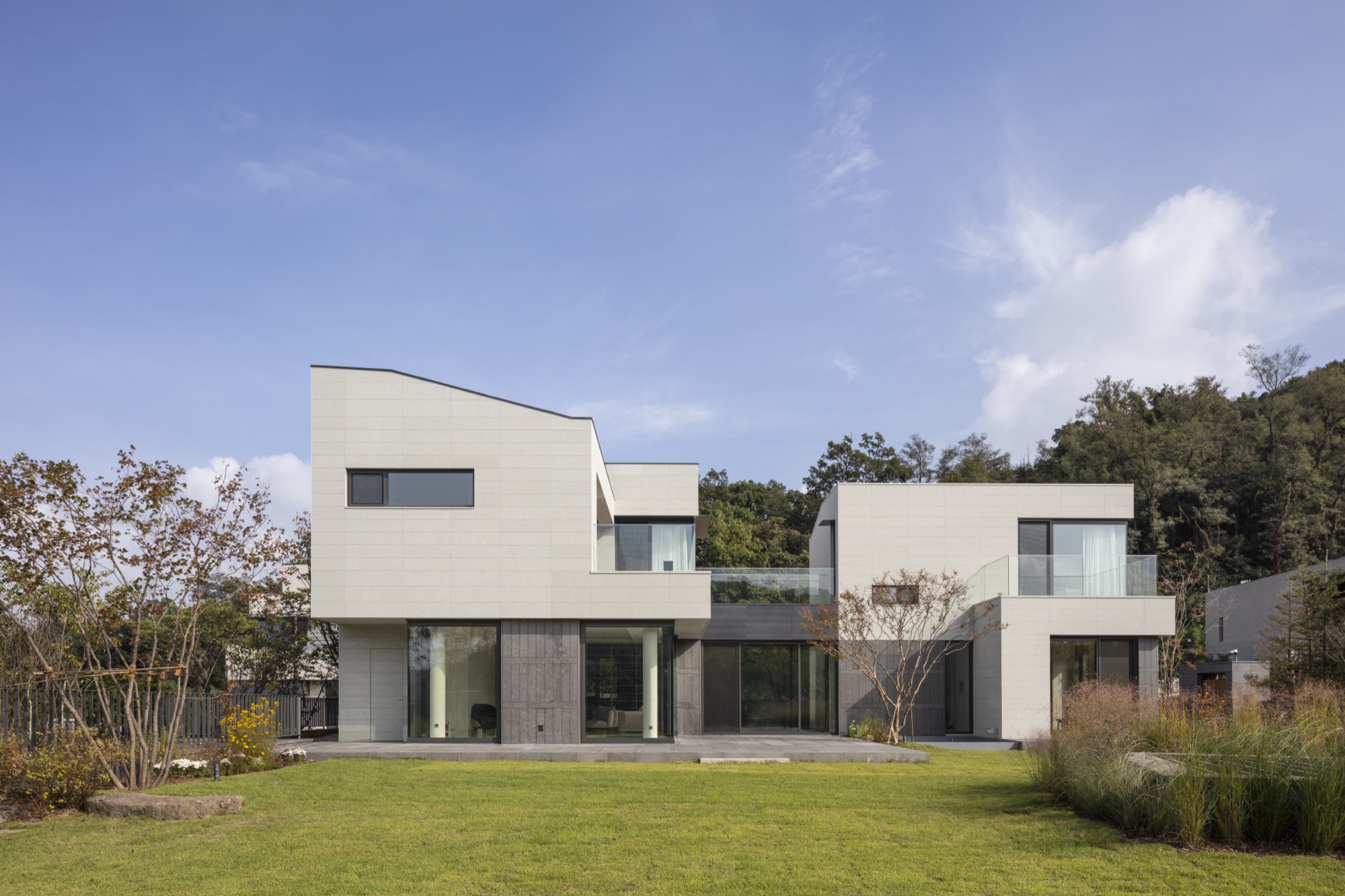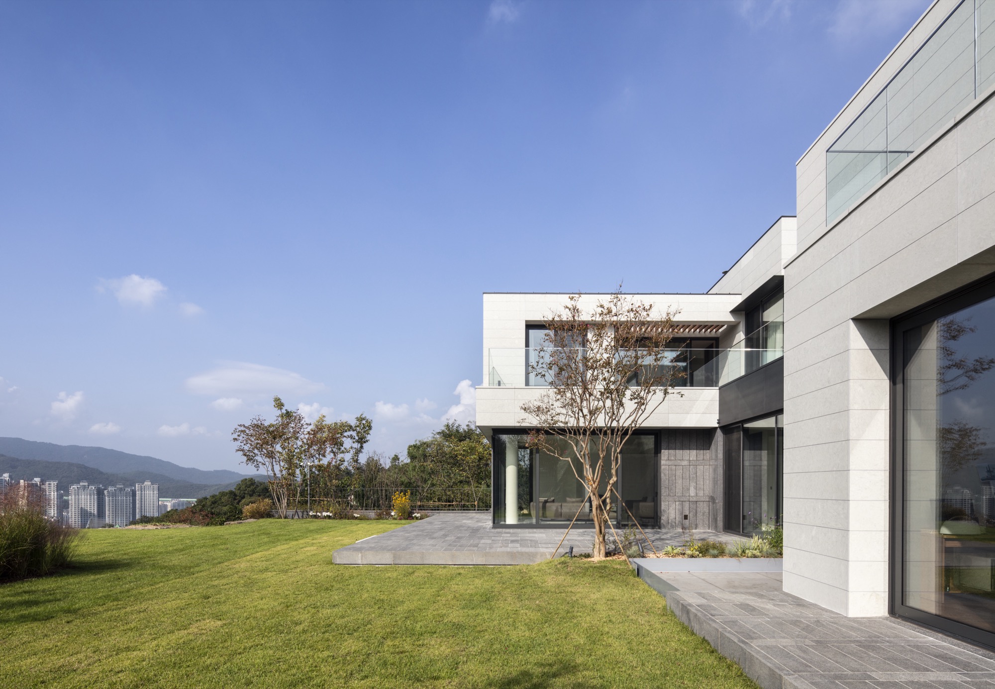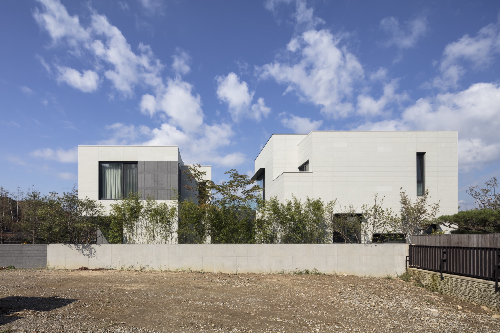 대상지가 위치한 주택 단지는 설계 단계에서 단지와 조화를 이루고 주변 대지를 배려하도록 협의 과정을 거친다. 계획안은 협의 과정에서 두 개의 분리된 매스 사이로 시원하게 드러나는 산자락과 하늘을 인접지들과 공유할 수 있다는 이유로 바람직하다는 평가를 받았다. 두 개의 매스로 나뉘면서 주택은 두께가 얇아지며 내부공간이 파노라마처럼 펼쳐지고, 외부 공간이 내부 깊숙이 관입하며 주택뿐 아니라 단지 전체에 여백을 남긴다.