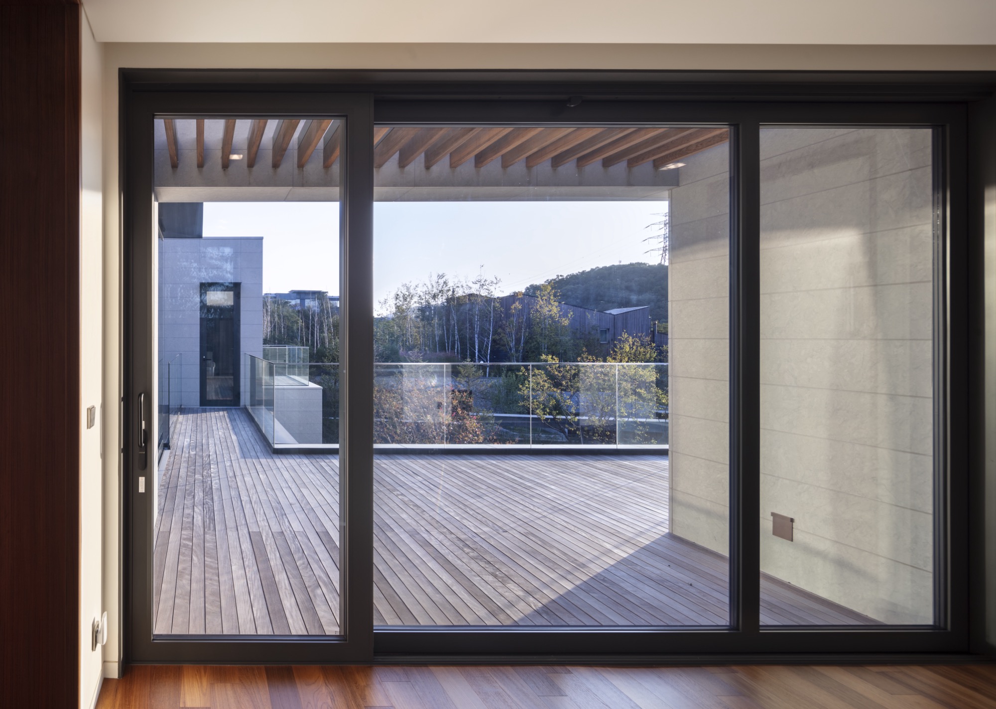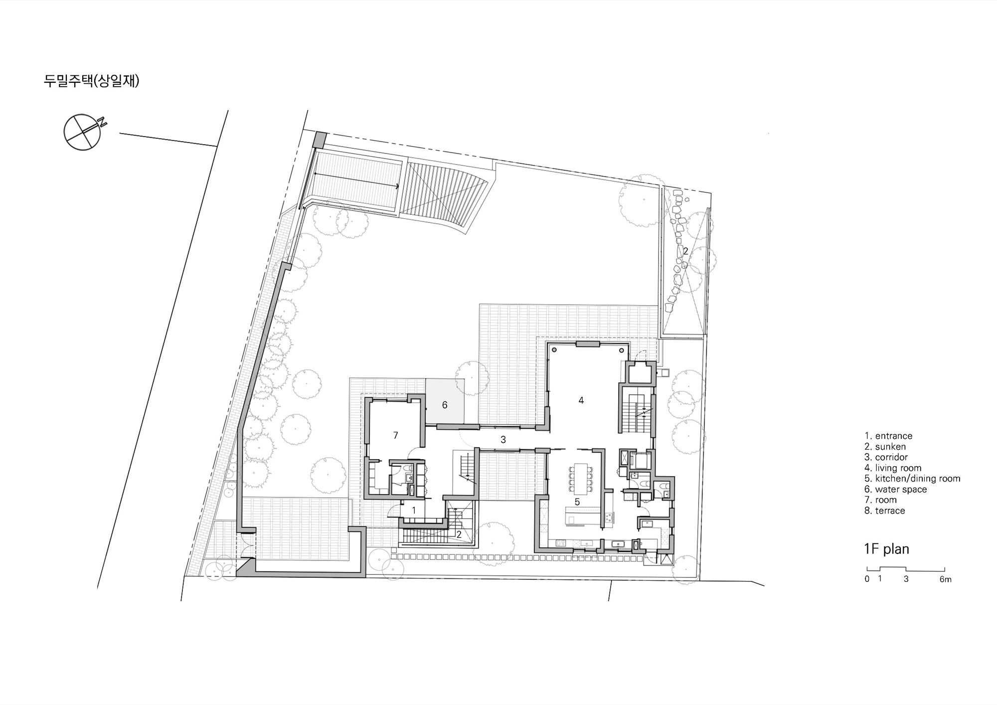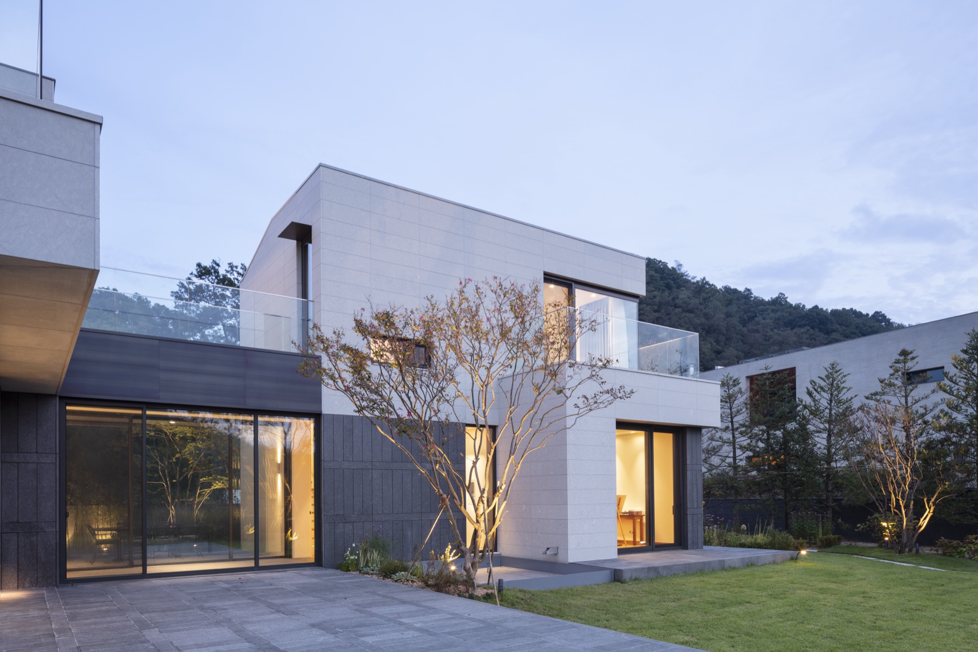 대상지가 위치한 주택 단지는 설계 단계에서 단지와 조화를 이루고 주변 대지를 배려하도록 협의 과정을 거친다. 계획안은 협의 과정에서 두 개의 분리된 매스 사이로 시원하게 드러나는 산자락과 하늘을 인접지들과 공유할 수 있다는 이유로 바람직하다는 평가를 받았다. 두 개의 매스로 나뉘면서 주택은 두께가 얇아지며 내부공간이 파노라마처럼 펼쳐지고, 외부 공간이 내부 깊숙이 관입하며 주택뿐 아니라 단지 전체에 여백을 남긴다.