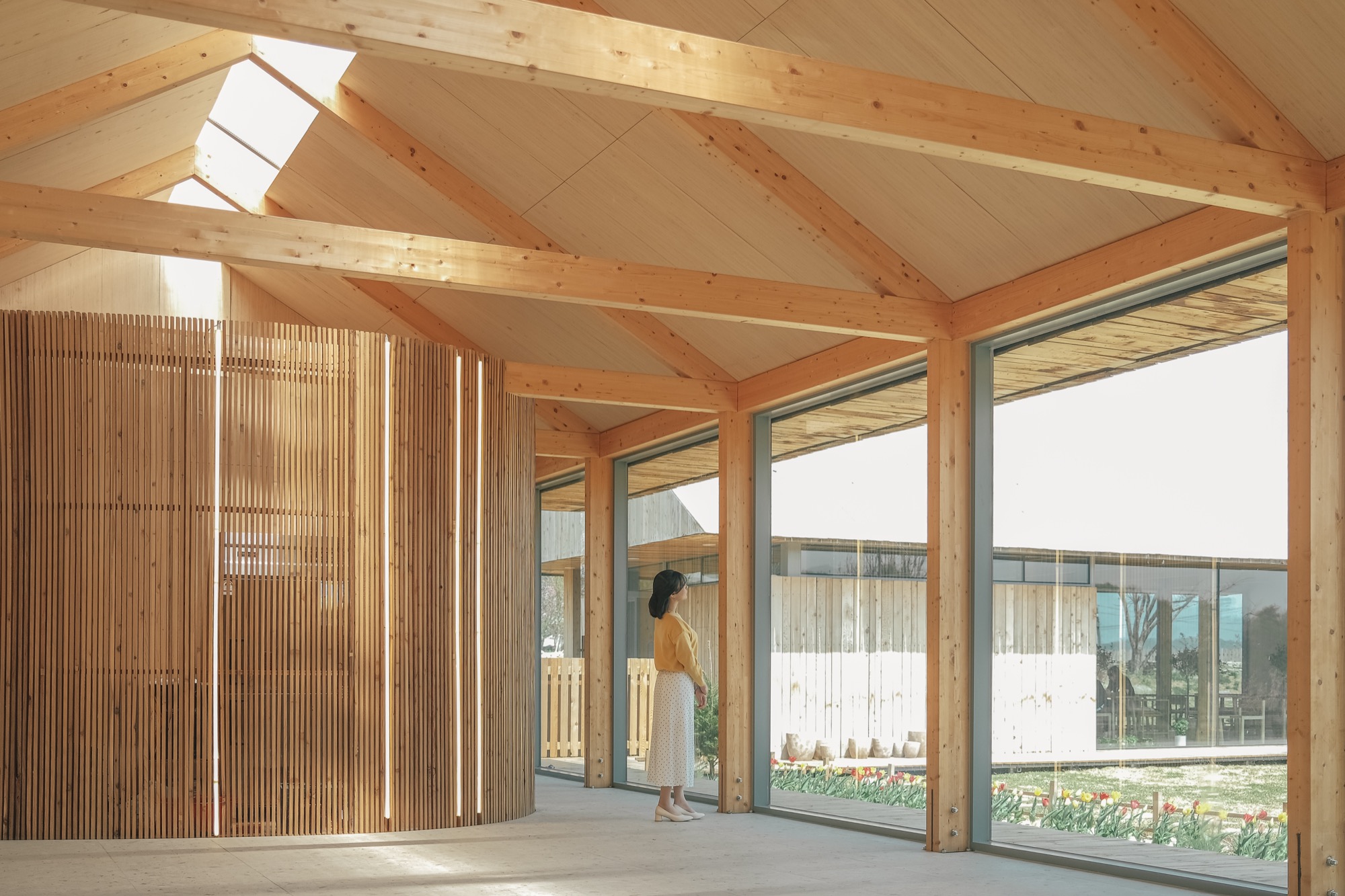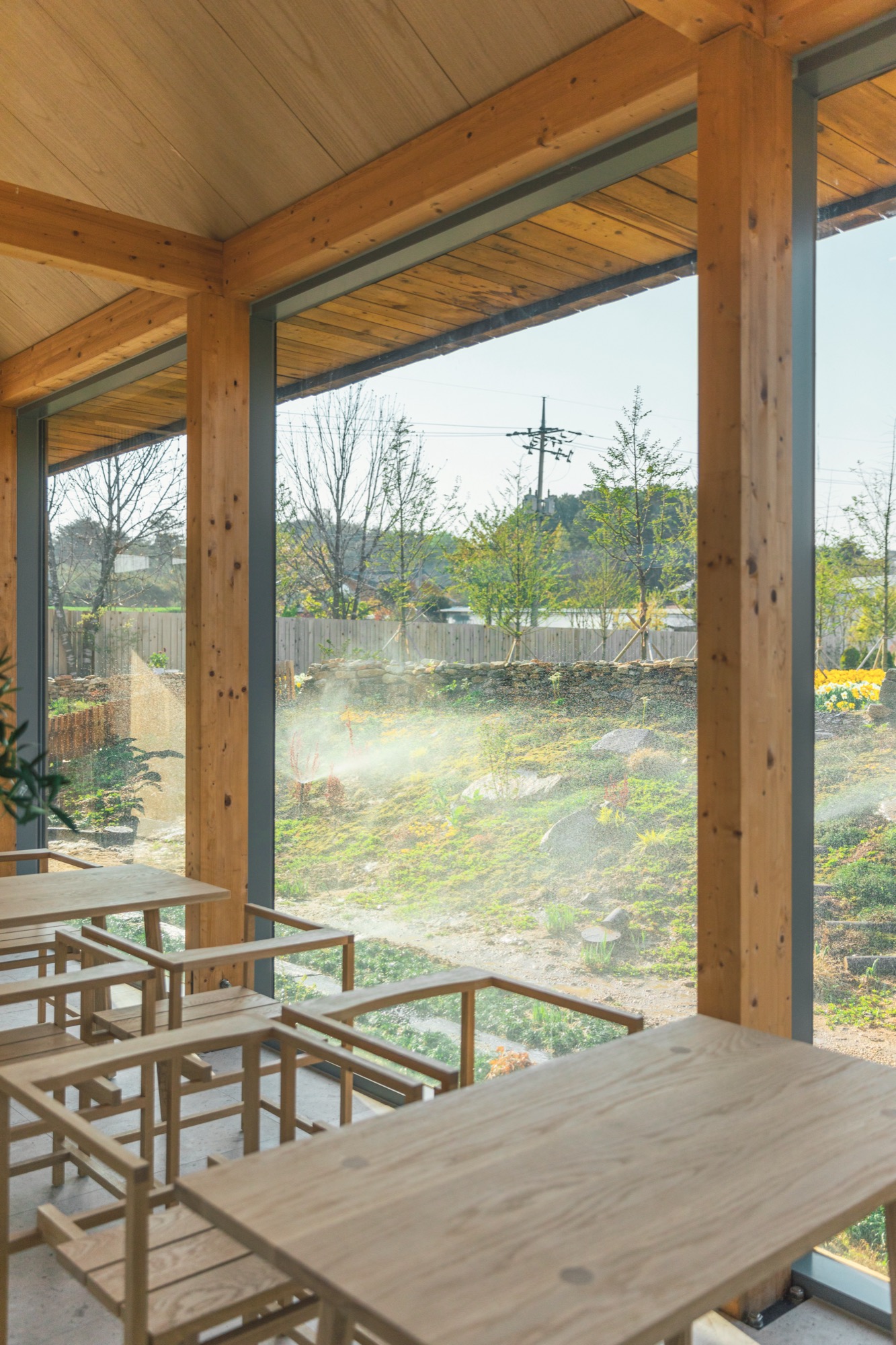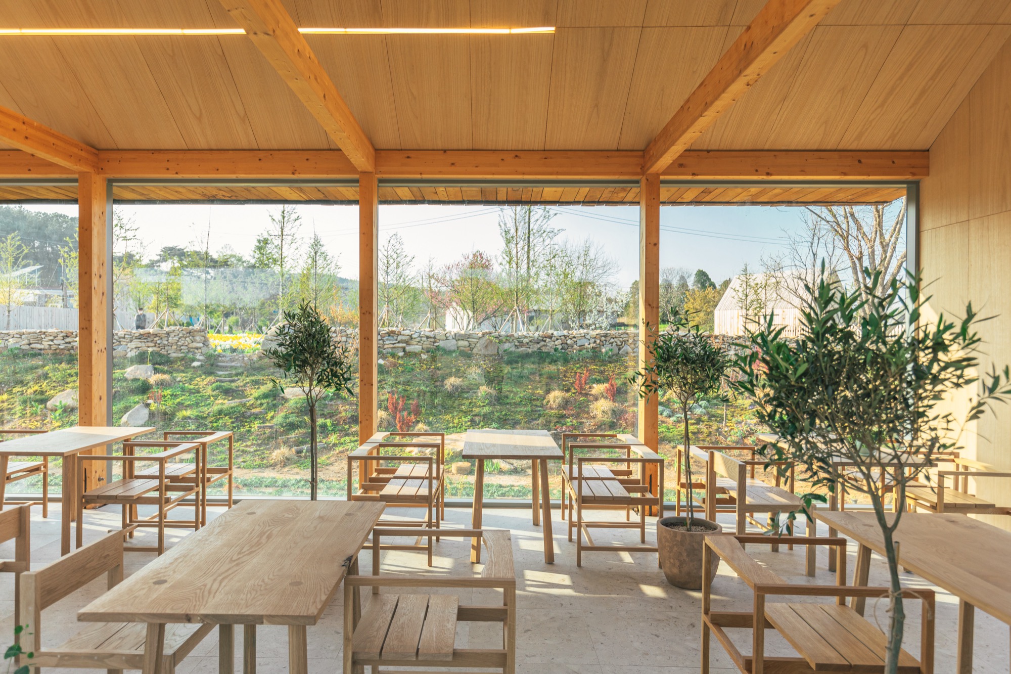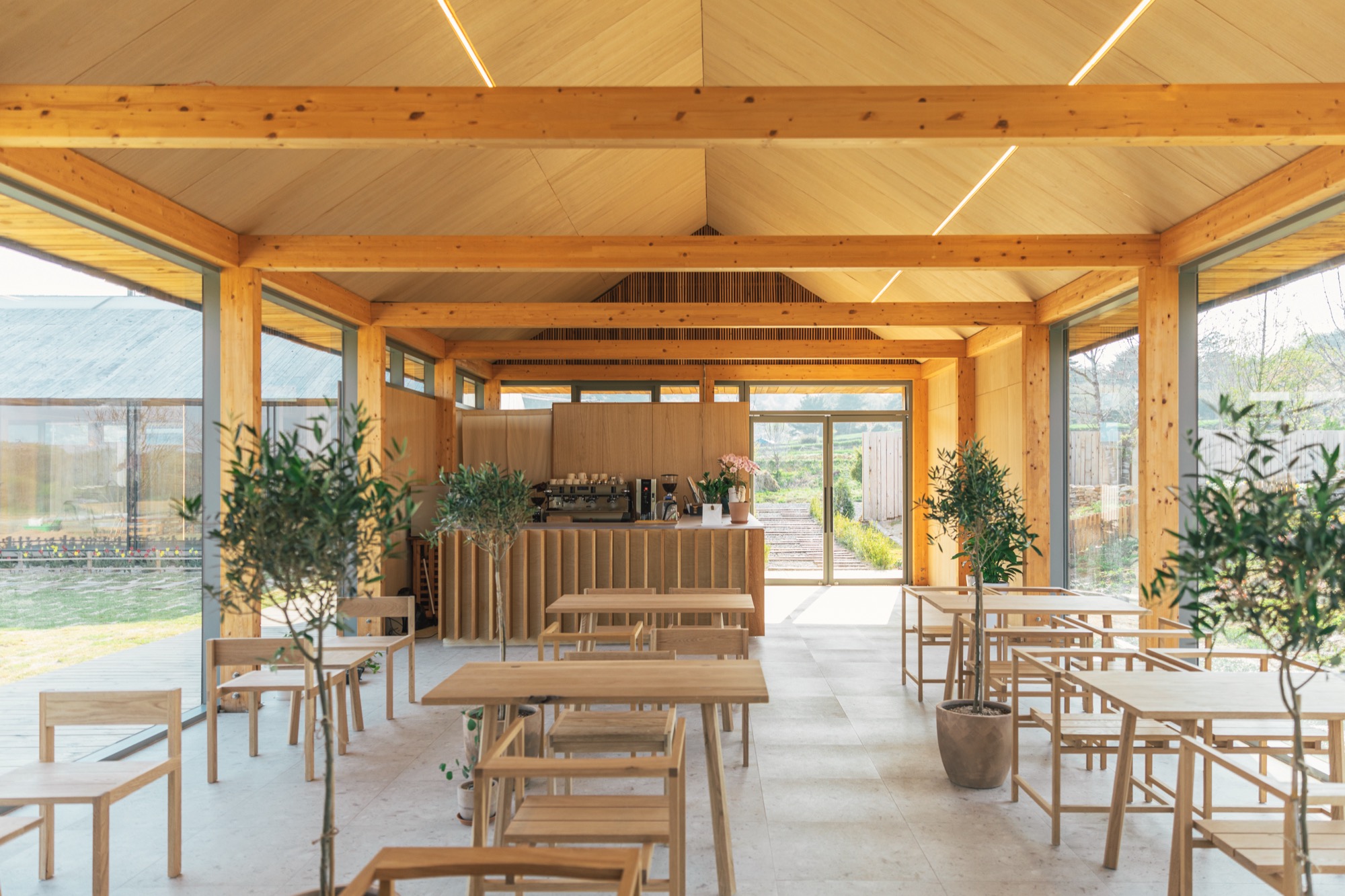 ‘나무나무 카페’는 세련된 헛간의 느낌을 살리기 위해 글루램 중목 구조를 도입했다. 글루램 중목은 목재를 집성 접착하여 강도와 안정성을 높인 엔지니어링 목재로, 변형이 적고 안정성이 뛰어나다. 이 구조는 내부에서도 아름다운 정원을 바라볼 수 있는 큰 창을 만들어주고, 공간의 미적 감각을 높여준다. 노출된 글루램 중목 구조와 큰 창으로 들어오는 햇살, 그리고 목재 인테리어는 농부의 따뜻함을 공간에 전달한다. 이 공간의 따뜻함은 이용자들의 감성을 자극하고, 좋은 추억을 만들어낸다.