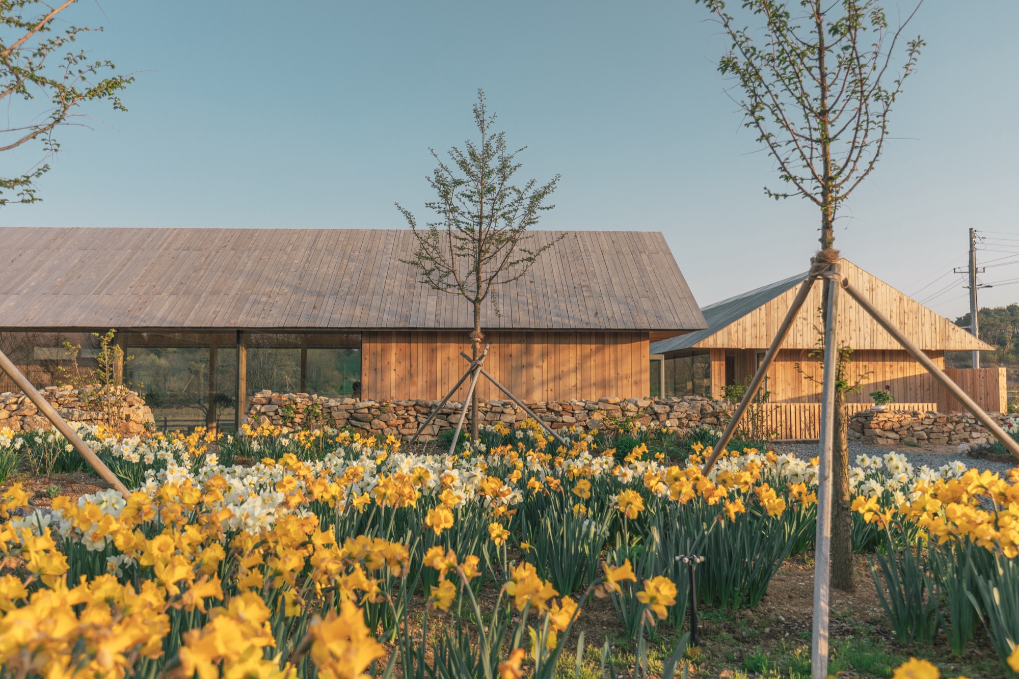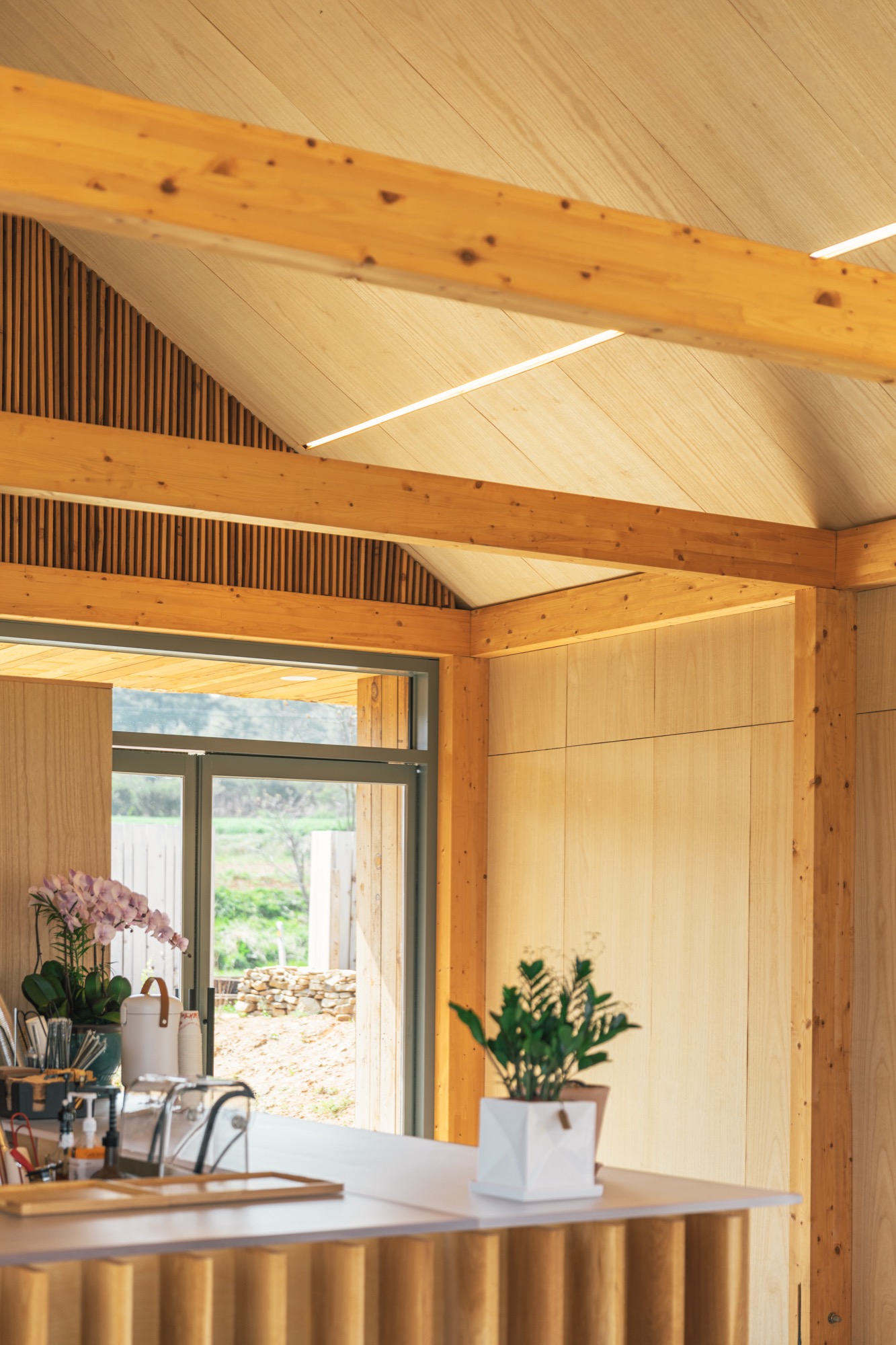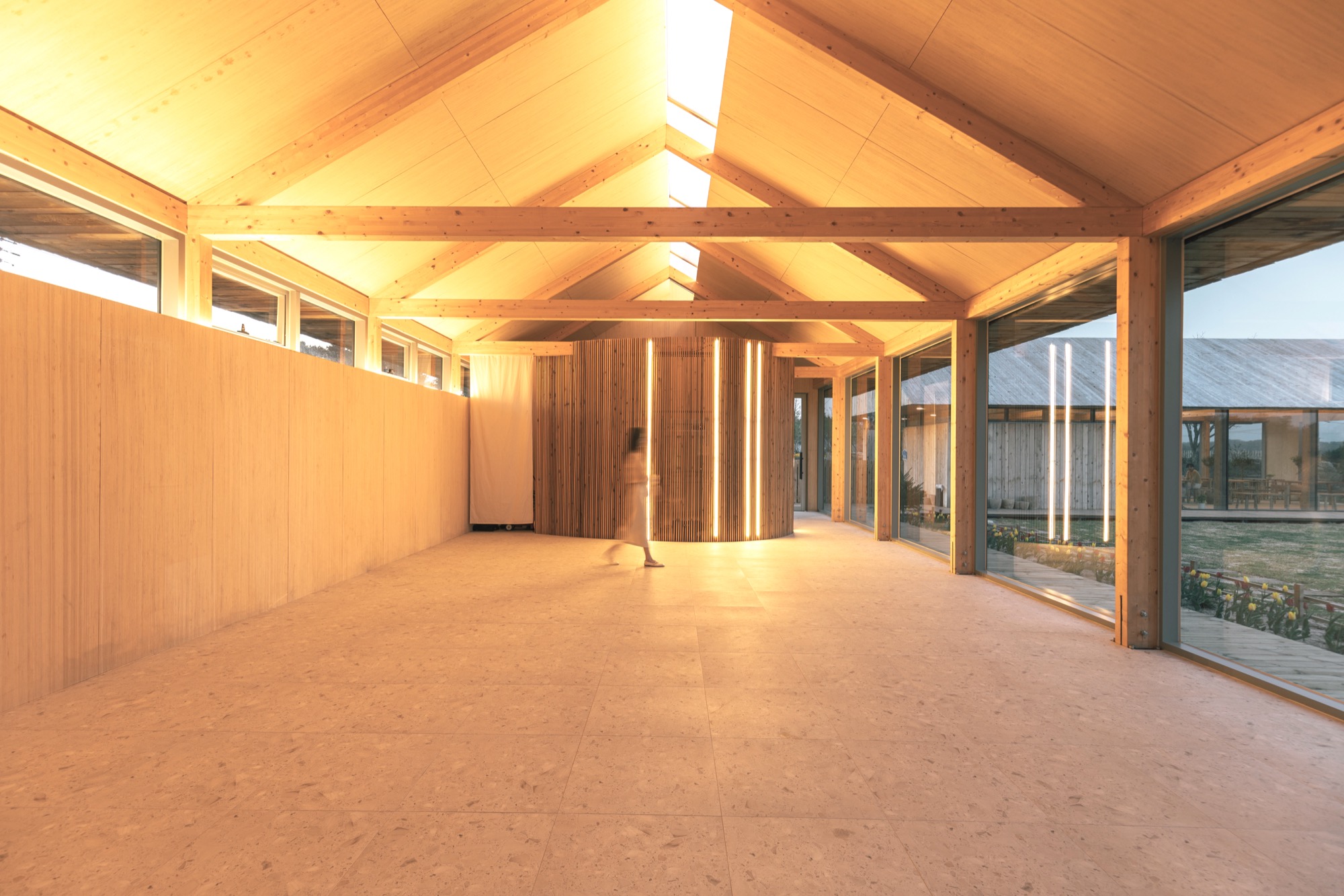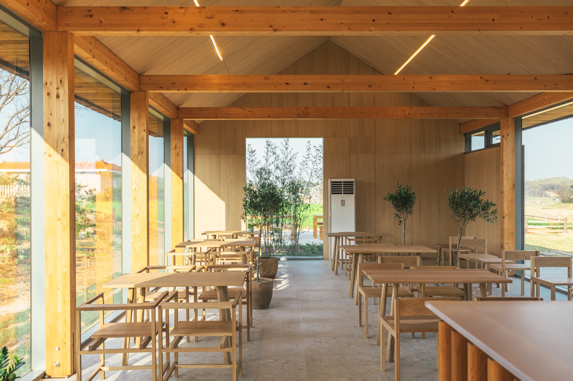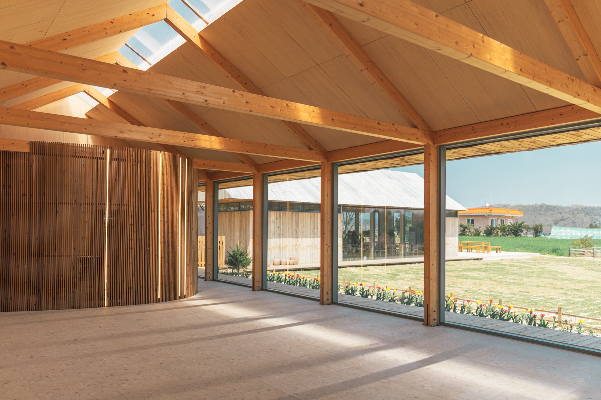 ‘나무나무 카페’는 세련된 헛간의 느낌을 살리기 위해 글루램 중목 구조를 도입했다. 글루램 중목은 목재를 집성 접착하여 강도와 안정성을 높인 엔지니어링 목재로, 변형이 적고 안정성이 뛰어나다. 이 구조는 내부에서도 아름다운 정원을 바라볼 수 있는 큰 창을 만들어주고, 공간의 미적 감각을 높여준다. 노출된 글루램 중목 구조와 큰 창으로 들어오는 햇살, 그리고 목재 인테리어는 농부의 따뜻함을 공간에 전달한다. 이 공간의 따뜻함은 이용자들의 감성을 자극하고, 좋은 추억을 만들어낸다.