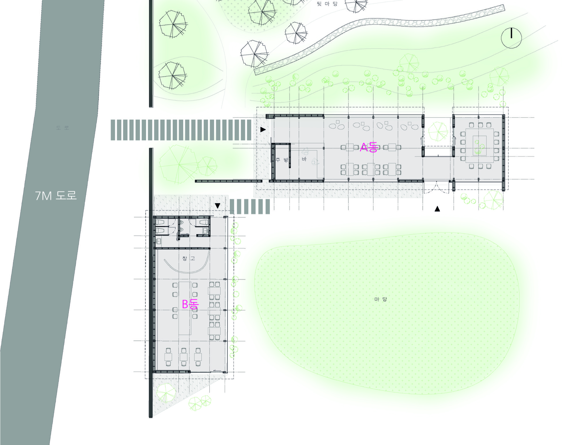 백설농부 건축물은 A동과 B동으로 구성된다. A동은 마당과 도로 사이에 자리해 도로에서 마당을 볼 수 없도록 하며, 방문자들에게 호기심을 자아내 안으로 유인하는 효과를 만든다. 새롭게 조성된 앞마당은 이 역할을 강조한다. B동은 지형의 높이차를 활용해 대지의 경사지 아랫부분에 배치되었다. 3m의 높이차를 가진 대지는 산기슭 이끼 정원을 연상케 하는 아름다운 경관을 조성한다. B동에서 조망할 수 있는 음지 이끼 정원은 카페 이용자들에게 특별한 경험을 제공한다. 지형을 활용한 조경은 카페의 독특한 포인트로 기억될 것이다.
