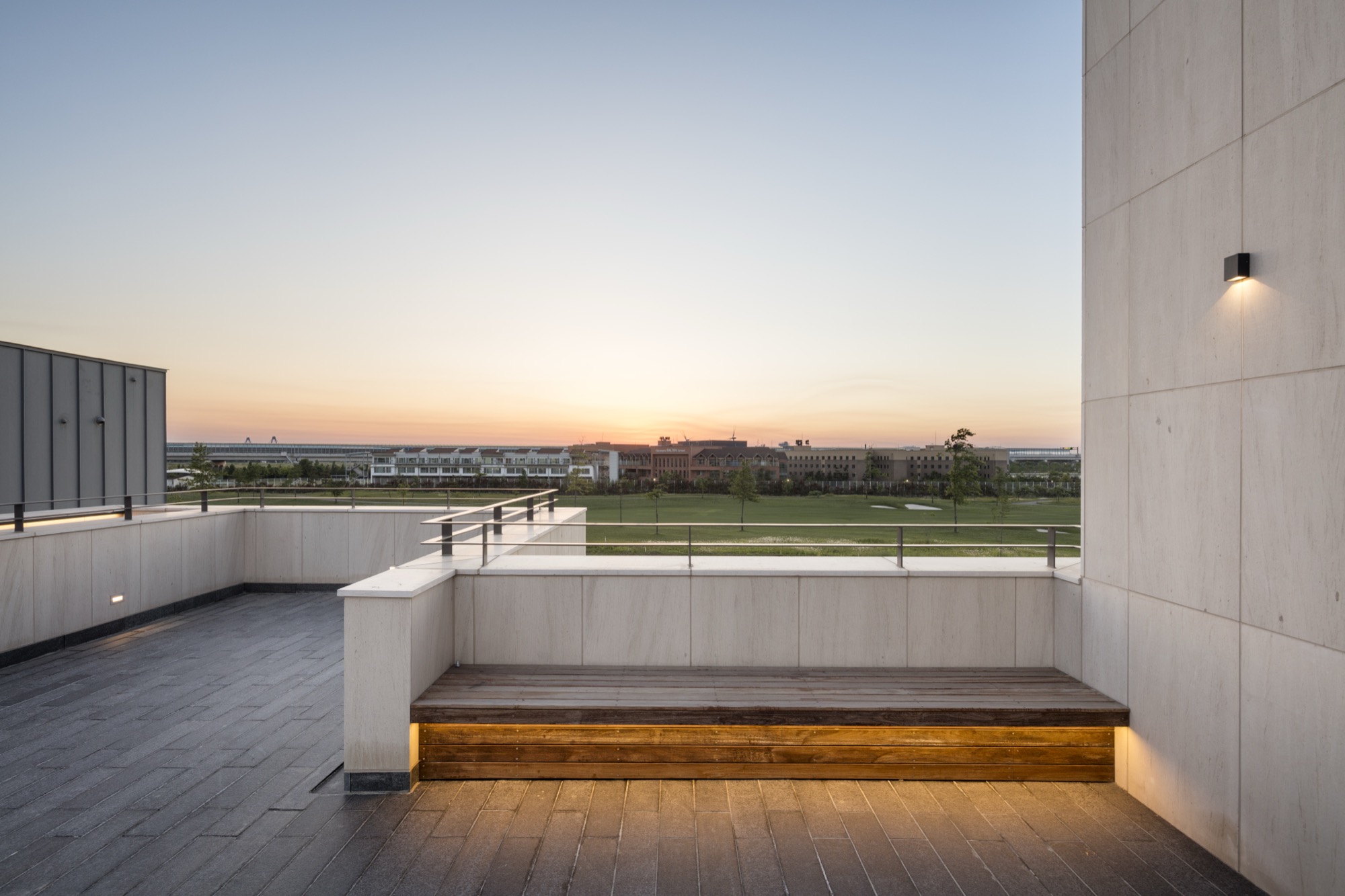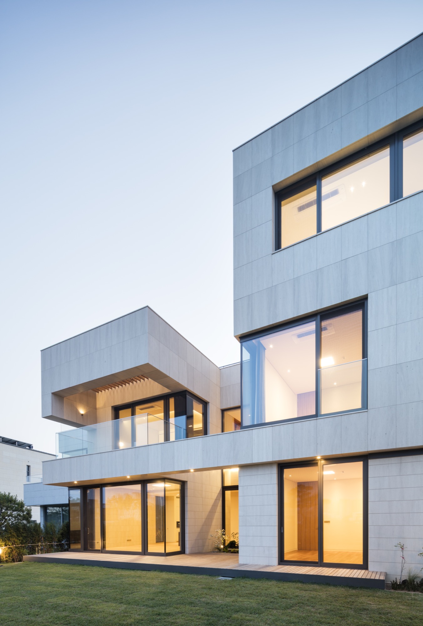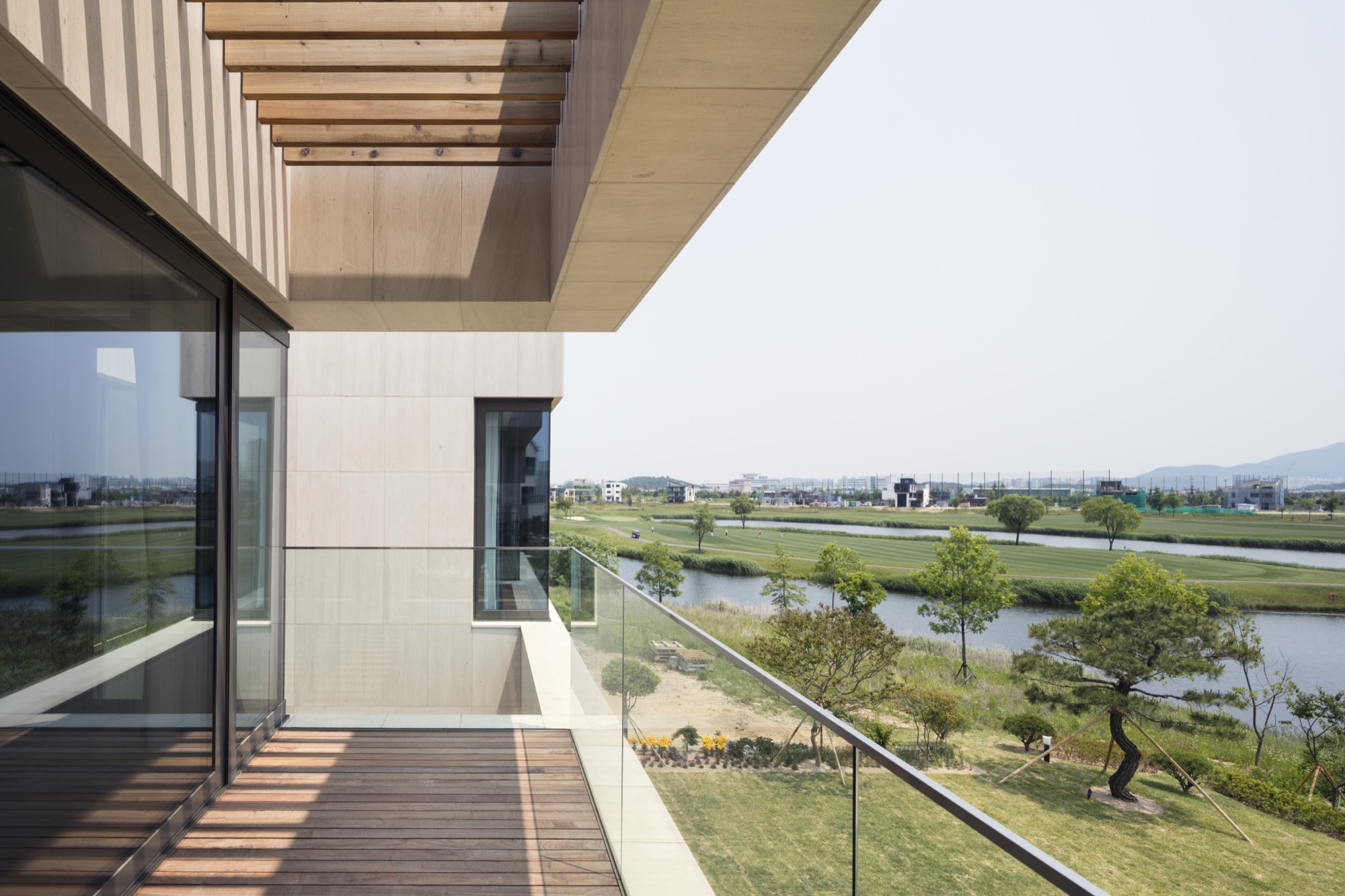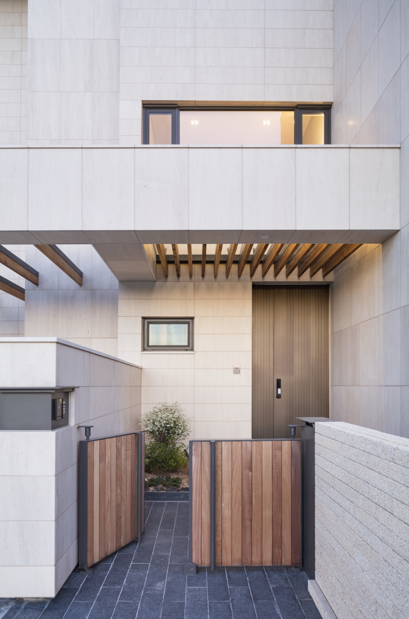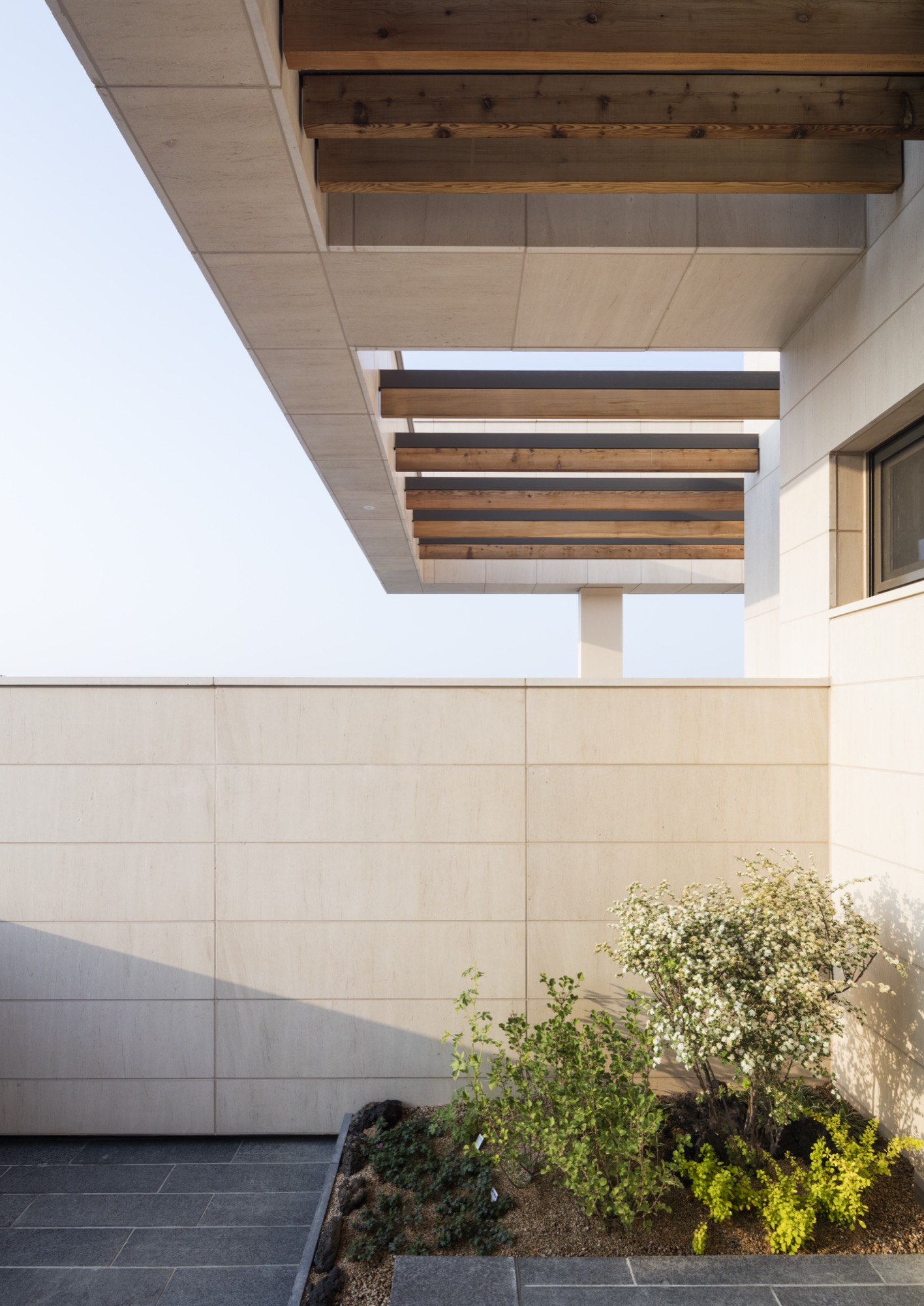 한 가지 재료만으로 외관을 구성하고 있지만, 중첩된 공간의 깊이와 수평적 안정감, 목재 루버와 조화를 이루는 따뜻한 색감은 시간의 축적이 부족한 단지에 정서적 안정을 부여한다.