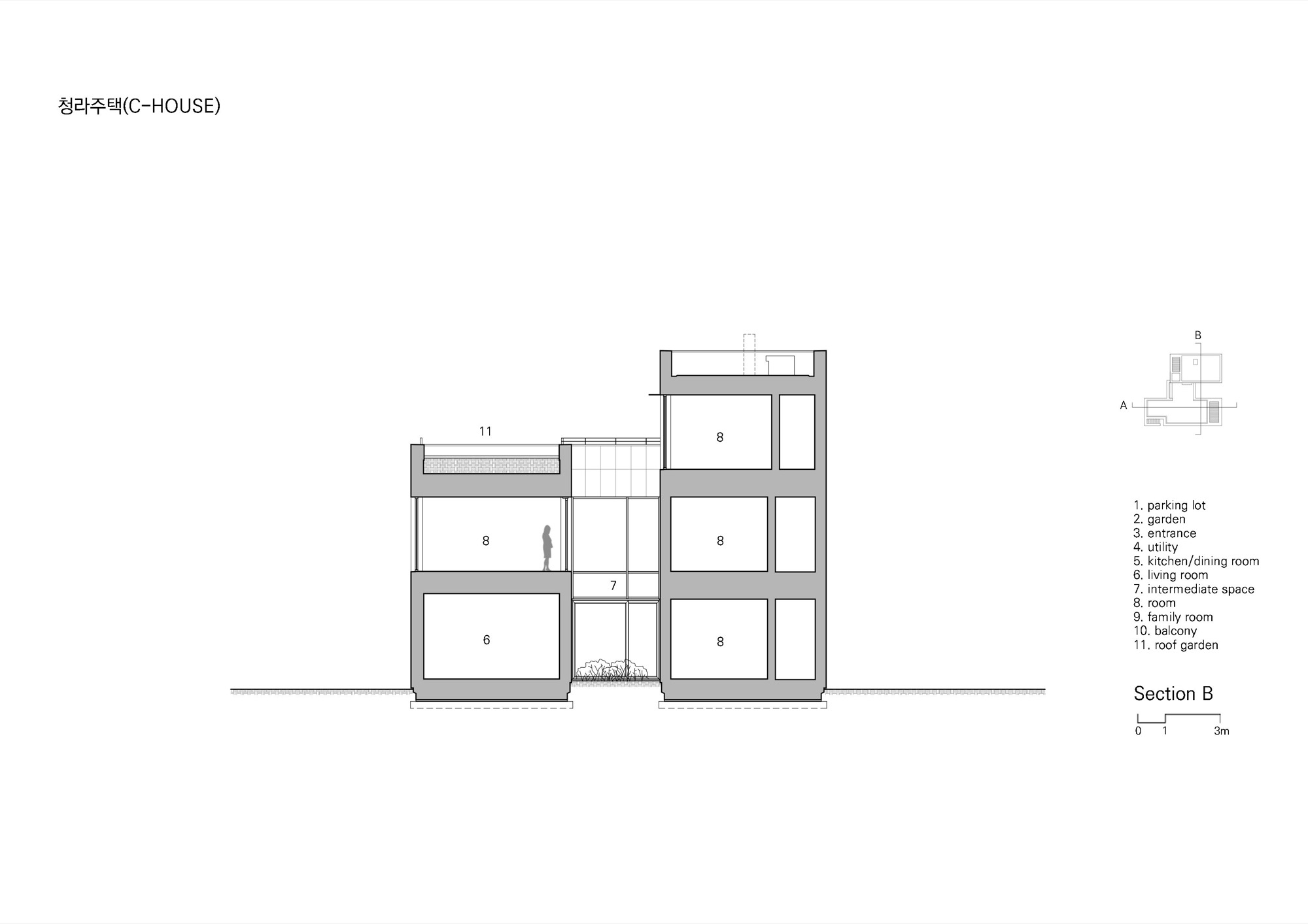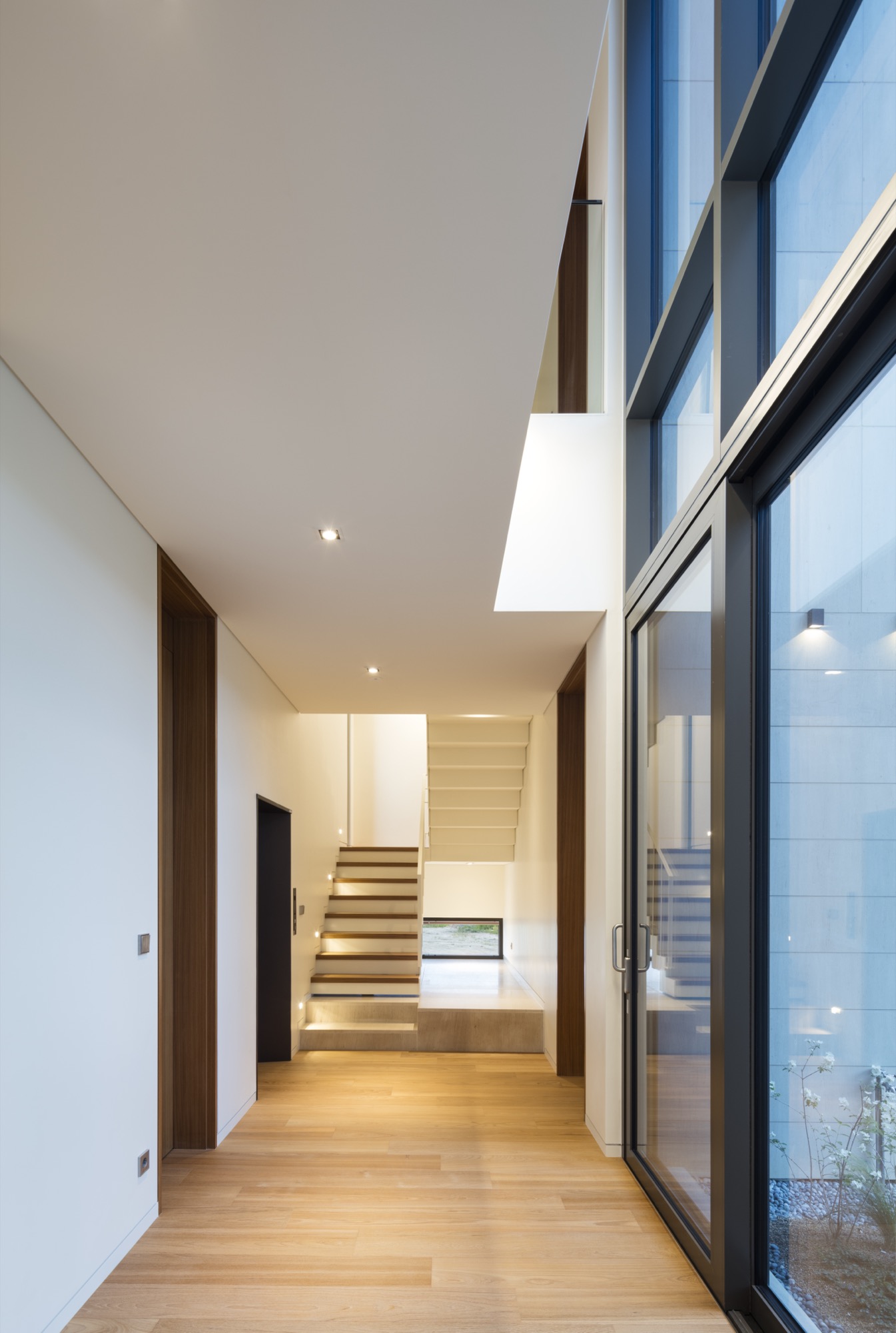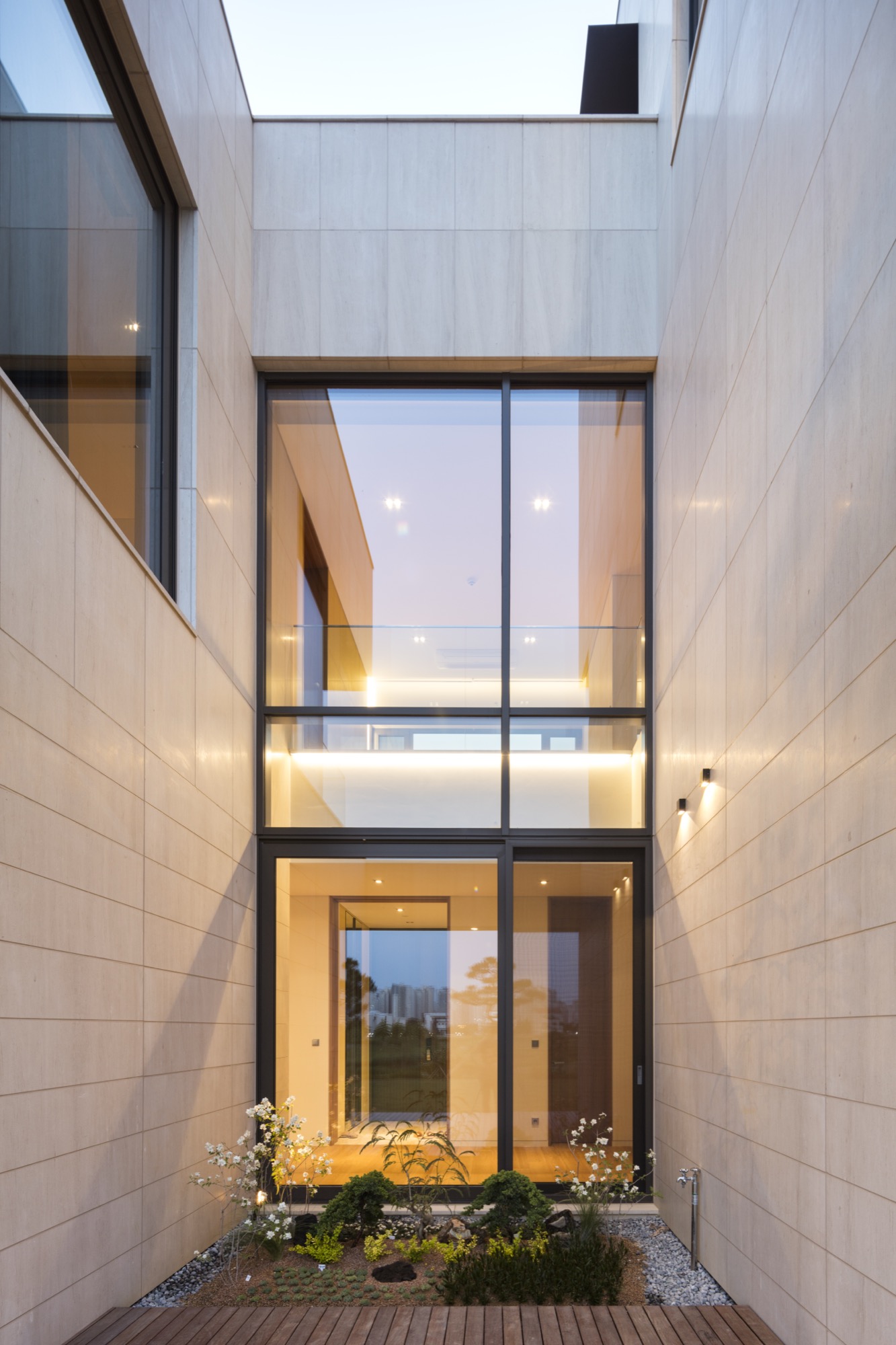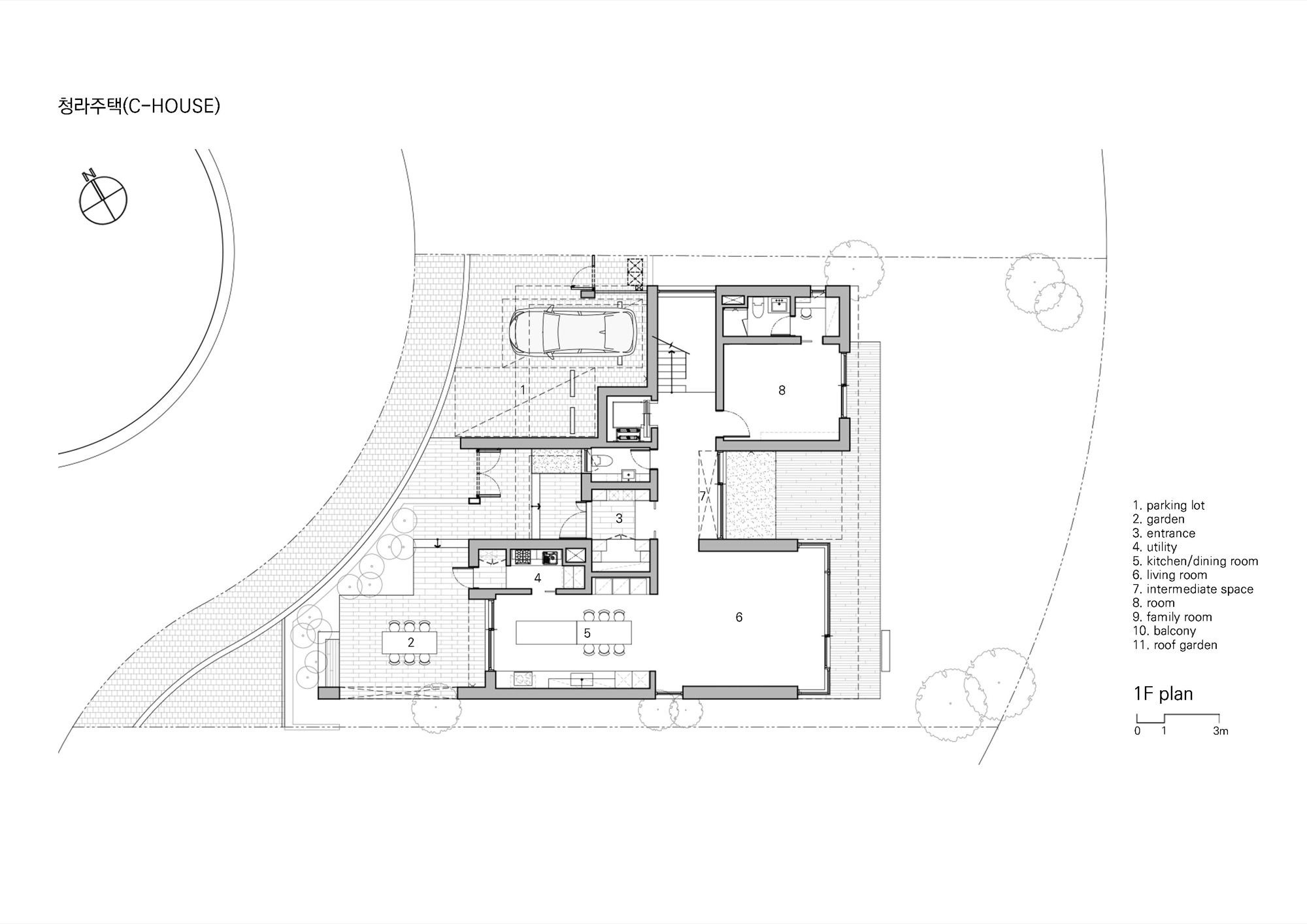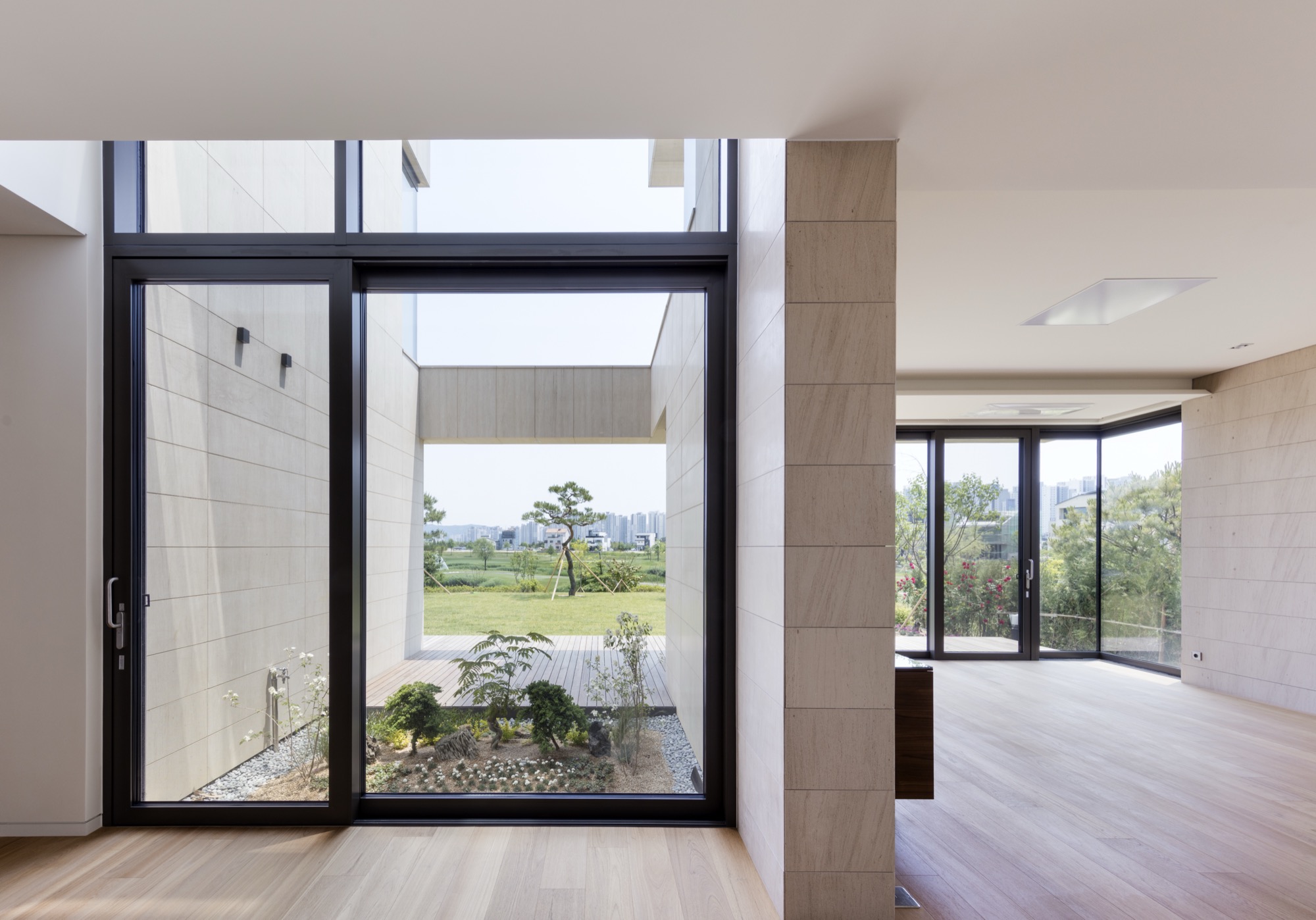 평면을 보면 가운데 매개 공간을 중심으로 공간들이 단순하게 연결된 것을 볼 수 있다. 매개 공간은 보이드와 계단을 통해 상하부를 연결하고, 외부 공간을 주택 내부 깊숙이 끌어들이며 시각적, 공간적 여유를 제공한다. 또한, 현관을 들어서며 처음 마주하는 공간으로 하늘과 맞닿은 너른 초록의 풍경은 일상의 긴장을 풀어준다. 위로 열린 매개 공간의 개방감은 거실로 이어지며, 일렬로 배치된 식당, 주방과 앞뒤로 연결된 마당이 연출하는 중첩된 깊이감으로 전환된다.