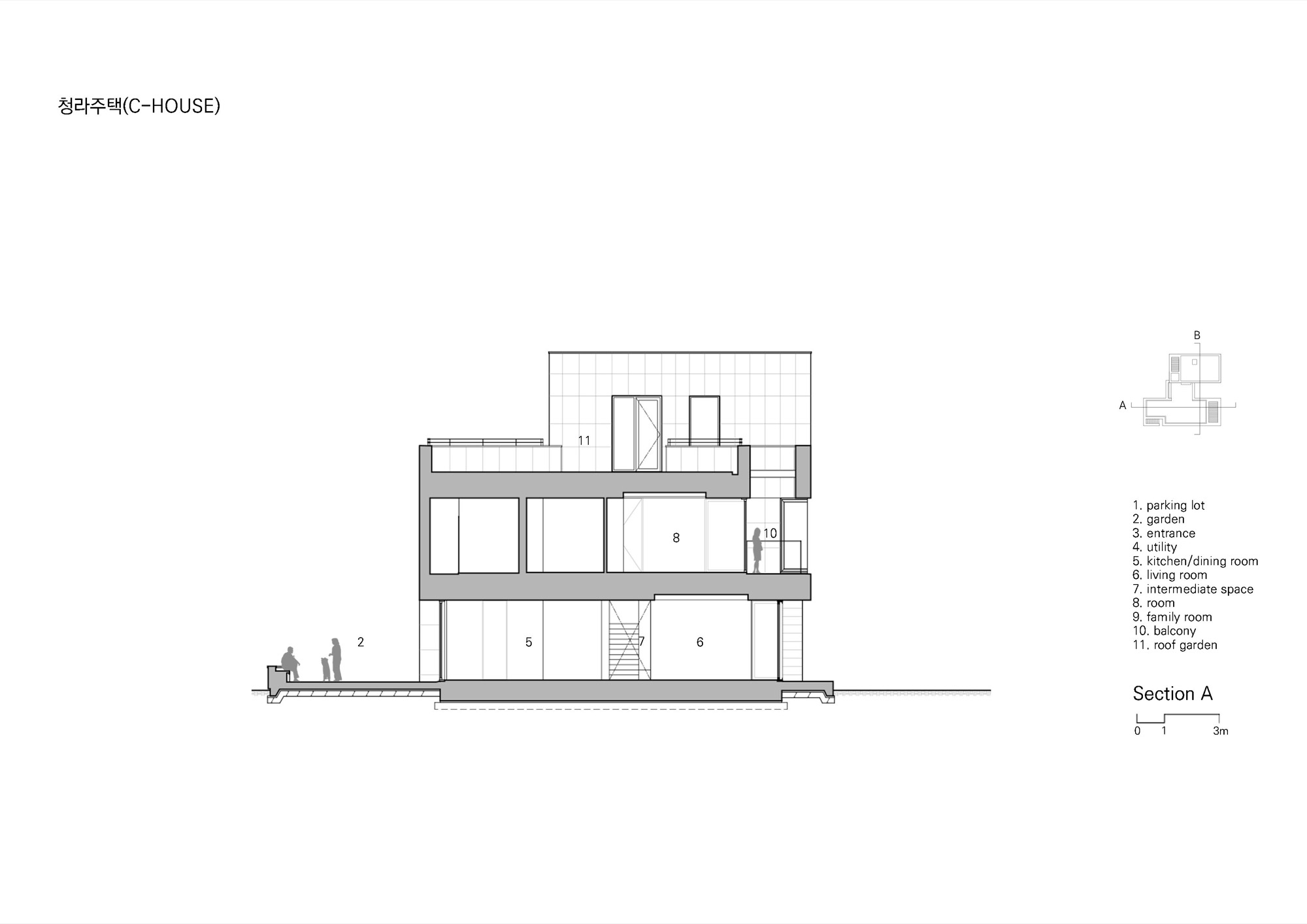 전면 폭이 좁은 대지의 양쪽 면은 옆 주택과 간섭이 생길 수 있기에, 전면으로 주요 실들을 배치하고, 앞마당을 최대한 확보할 수 있게 배치했다. 좁은 전면 폭으로 건축주가 원하는 프로그램을 앞쪽에 모두 배치할 수 없었기에, 도로 측으로 길게 뻗은 곳에 후정을 두고, 연결할 수 있는 프로그램들을 길게 배치하여 대지 모양을 극복했다.