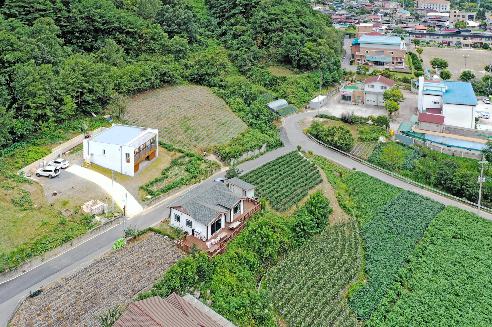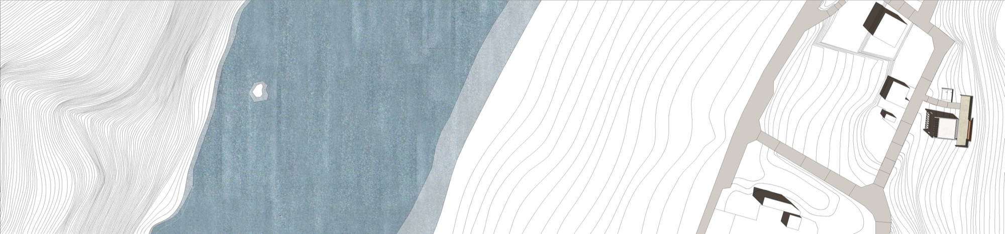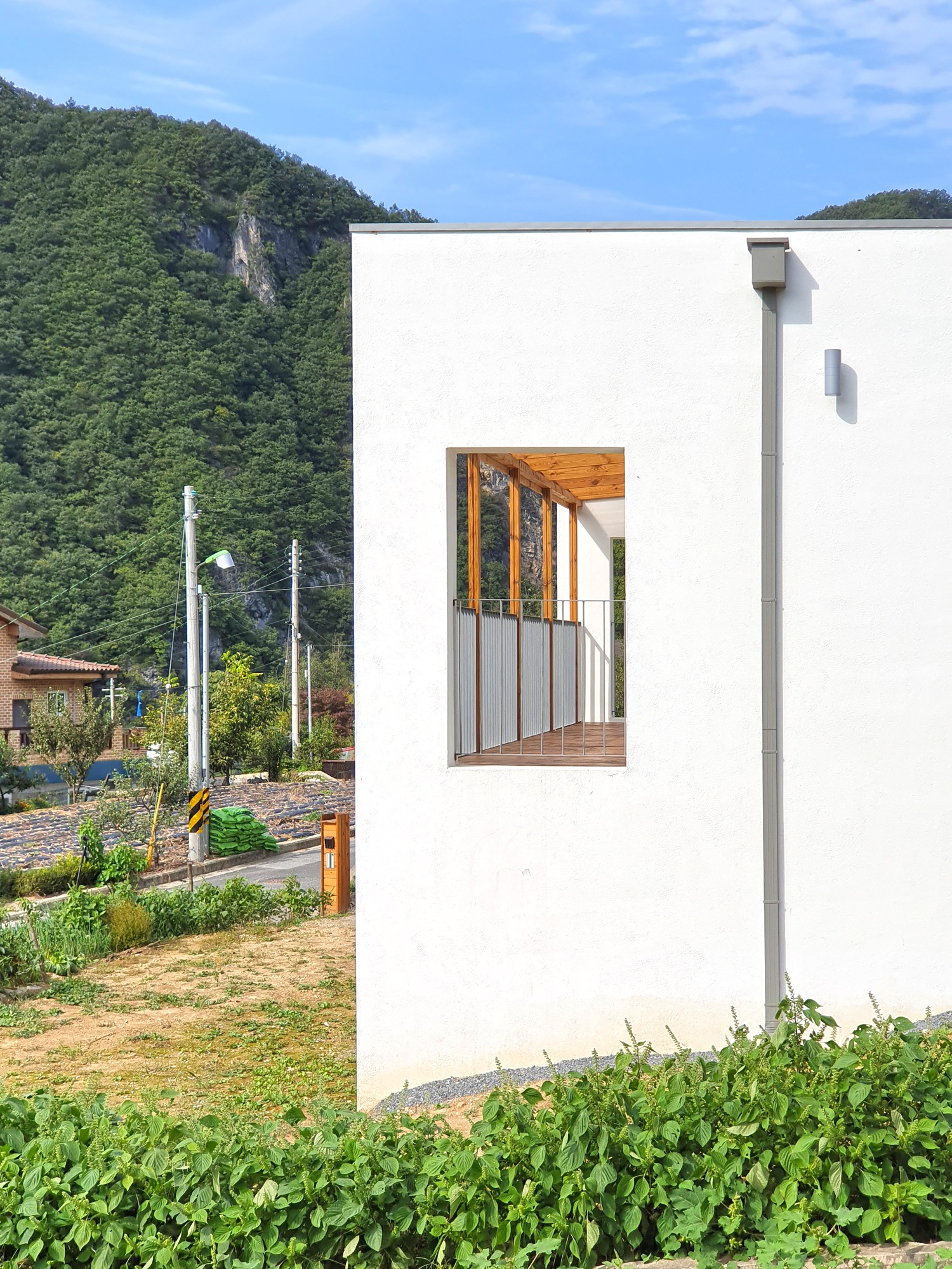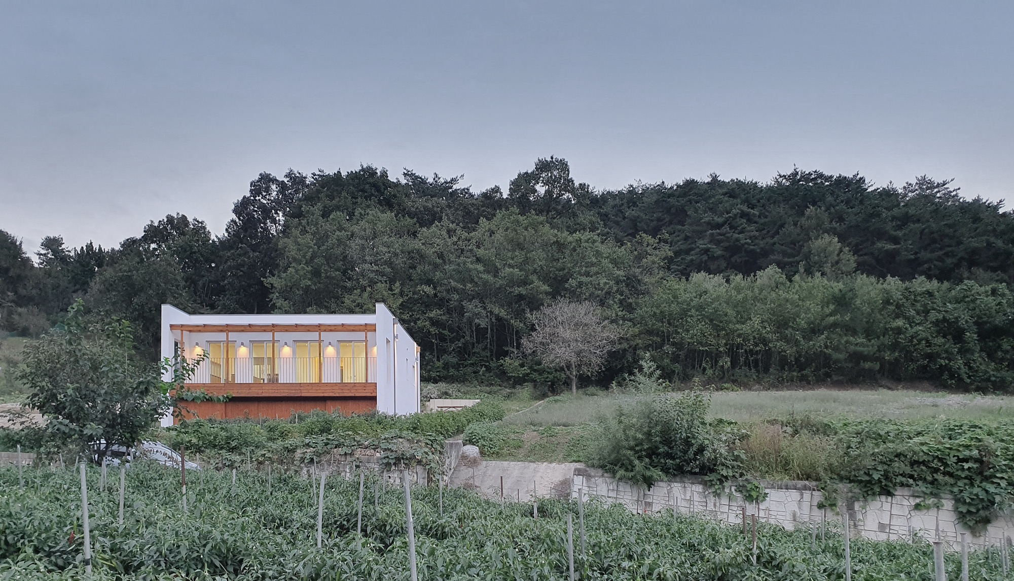 '전망이 좋은 경사지에서 집, 마당, 농지 그리고 창고로 사용하기 좋은 배치 형태는 무엇일까?' 이 물음에 대한 여러 대안을 찾아보는 작업이 선행되어야 했다. 최종적으로 선택한 배치는 집을 사이에 두고 계획장소를 상부와 하부로 구분하는 것이었다. 최대한 전망을 확보할 수 있도록 대지의 가장 높은 곳에 마당을 배치하고, 진입로와 가까운 낮은 곳에는 농지를 배치했다. 마당 절토를 최소화하며 등고선을 따라 세워진 'ㄷ'자형 옹벽으로 구체화되면서 경사지 아래 남한강과 삼태산을 향해 열린 장소가 된다. 집과 옹벽이 마주보고 있는데, 이 배치는 전망을 향해 열린 마당의 외향적 성격을 유지하는 동시에, 집에 필요한 내향적 성격을 확보할 수 있게 한다. 경사지를 평지로 바꾸기 위해 만들어진 옹벽은 단순히 토압을 견디는 것이 아니라, 집과 함께 전체 배치 형태를 설명하기 위해 빼놓을 수 없는 한 부분이 된다.