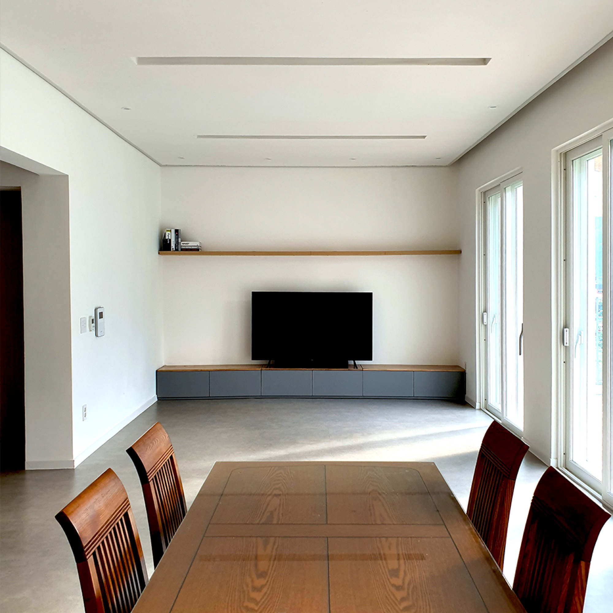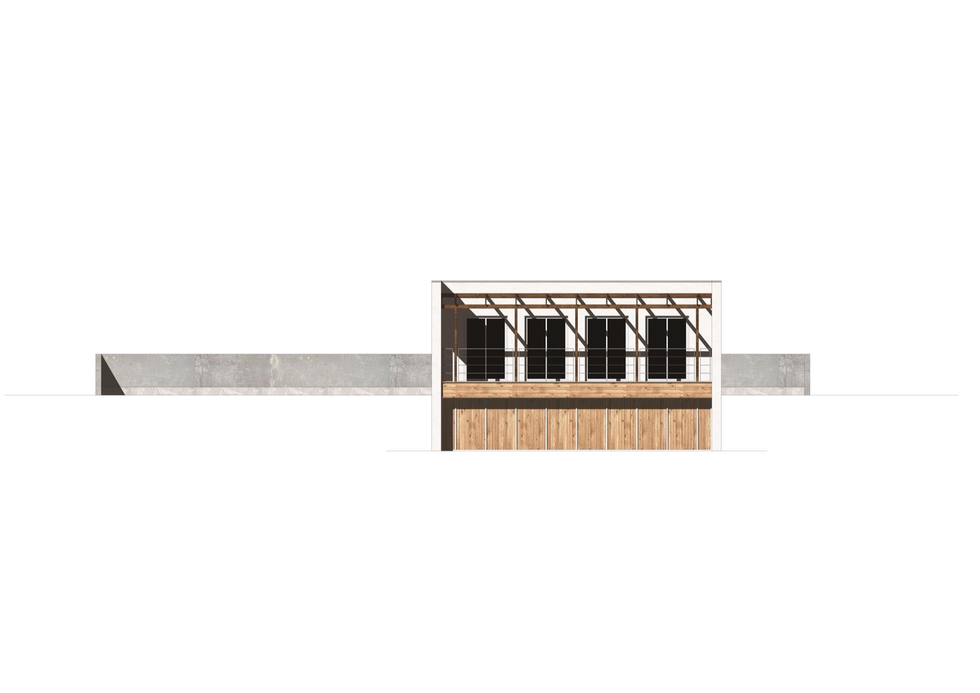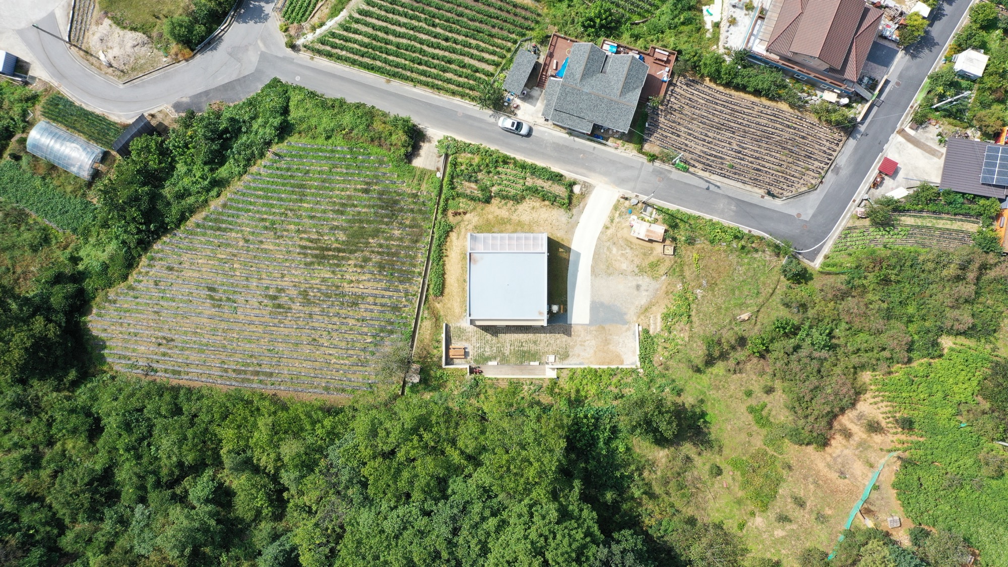 '전망이 좋은 경사지에서 집, 마당, 농지 그리고 창고로 사용하기 좋은 배치 형태는 무엇일까?' 이 물음에 대한 여러 대안을 찾아보는 작업이 선행되어야 했다. 최종적으로 선택한 배치는 집을 사이에 두고 계획장소를 상부와 하부로 구분하는 것이었다. 최대한 전망을 확보할 수 있도록 대지의 가장 높은 곳에 마당을 배치하고, 진입로와 가까운 낮은 곳에는 농지를 배치했다. 마당 절토를 최소화하며 등고선을 따라 세워진 'ㄷ'자형 옹벽으로 구체화되면서 경사지 아래 남한강과 삼태산을 향해 열린 장소가 된다. 집과 옹벽이 마주보고 있는데, 이 배치는 전망을 향해 열린 마당의 외향적 성격을 유지하는 동시에, 집에 필요한 내향적 성격을 확보할 수 있게 한다. 경사지를 평지로 바꾸기 위해 만들어진 옹벽은 단순히 토압을 견디는 것이 아니라, 집과 함께 전체 배치 형태를 설명하기 위해 빼놓을 수 없는 한 부분이 된다.