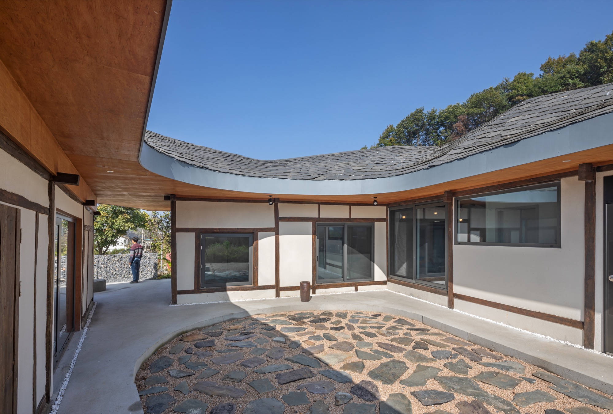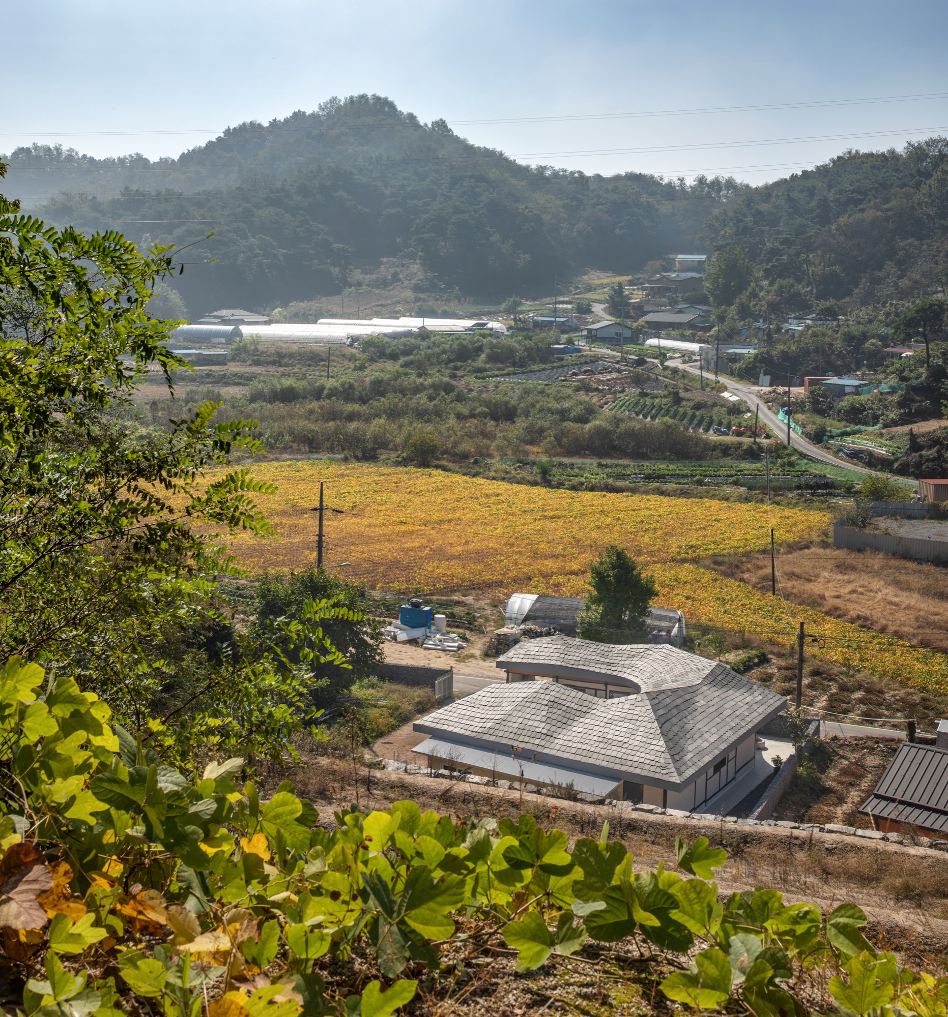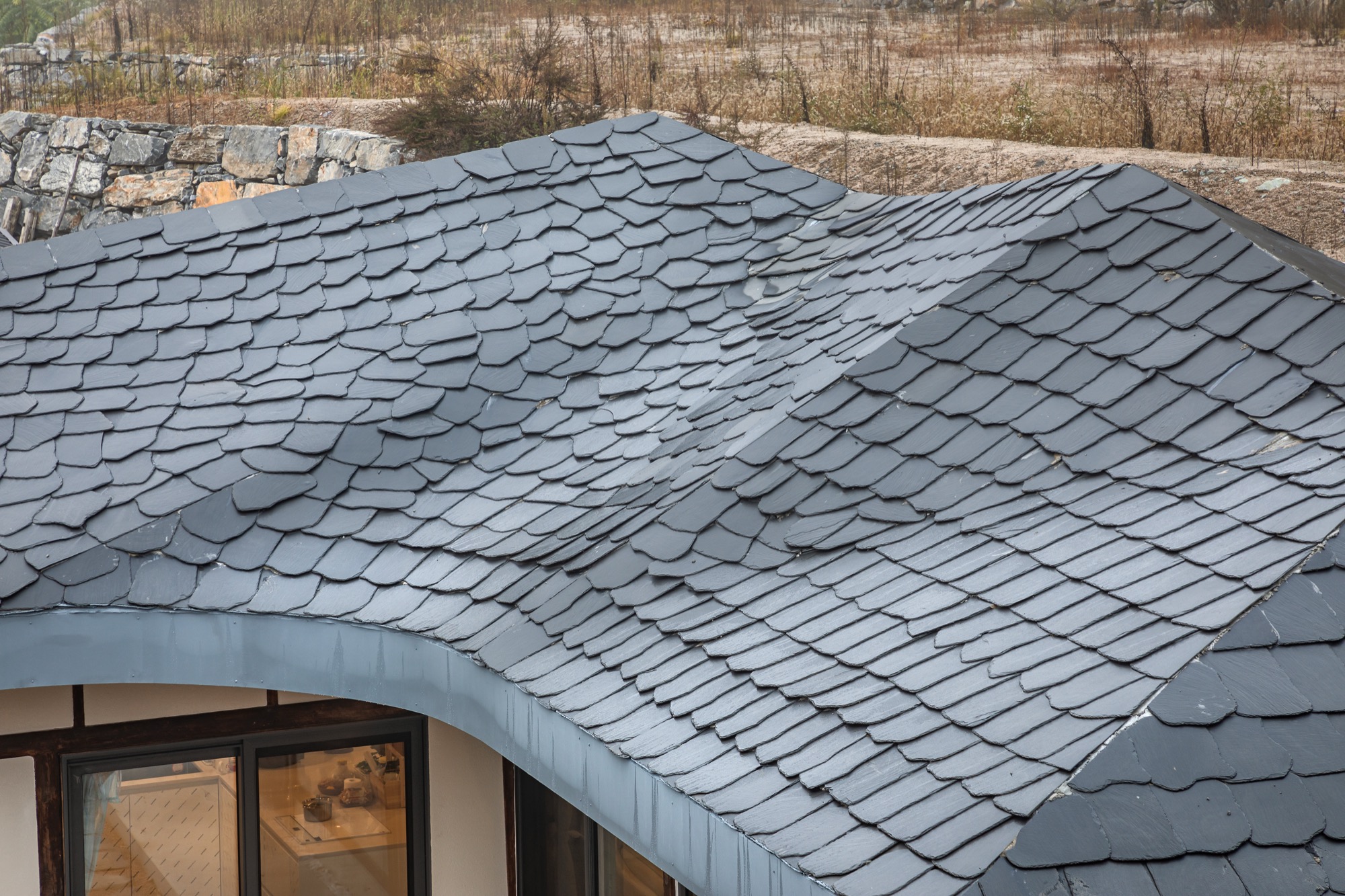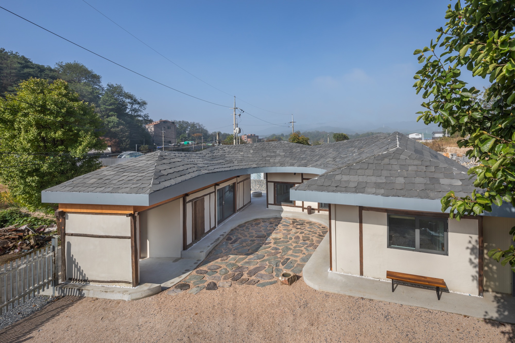 넘실대는 형상의 지붕은 금속 틀을 기존 목구조를 피해서 설치하는 방식으로 제작했다. 지붕의 외부 마감재로는 천연 슬레이트를 시공해 치밀한 설계 계획 의도를 넘어 패턴을 결정해나가며 만들었다. 이렇게 어긋나게 자리한 두 채를 지붕이 하나로 이어준다. 뒷산의 능선을 닮아 여러 경사를 가진 지붕은 묵직하게 집 위에 눌러앉은 모양새다.