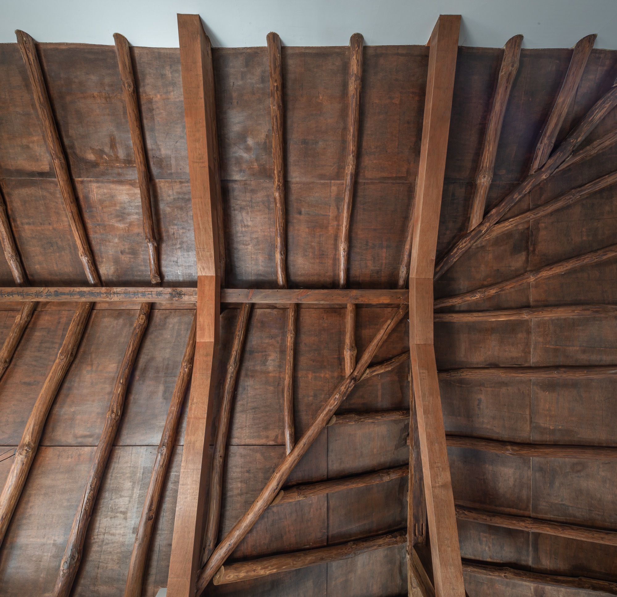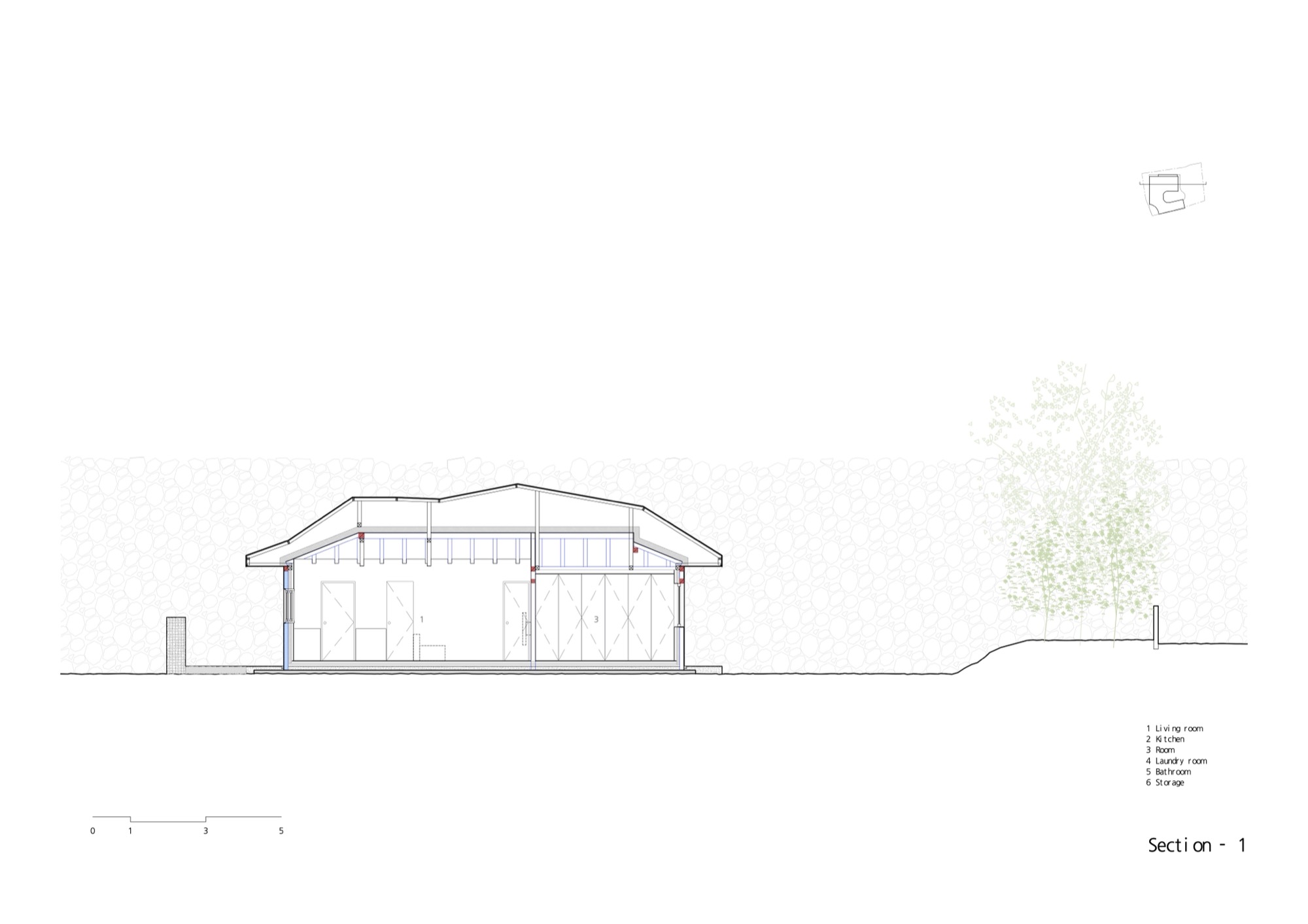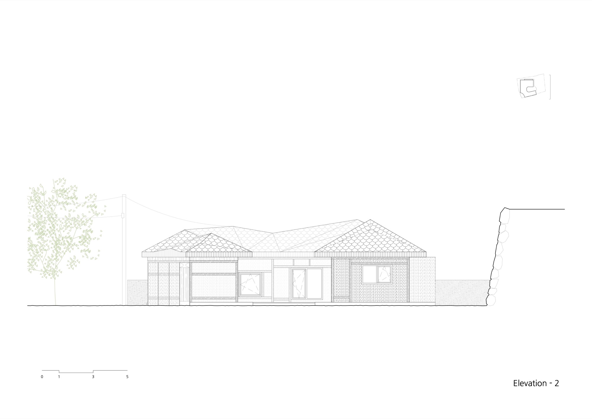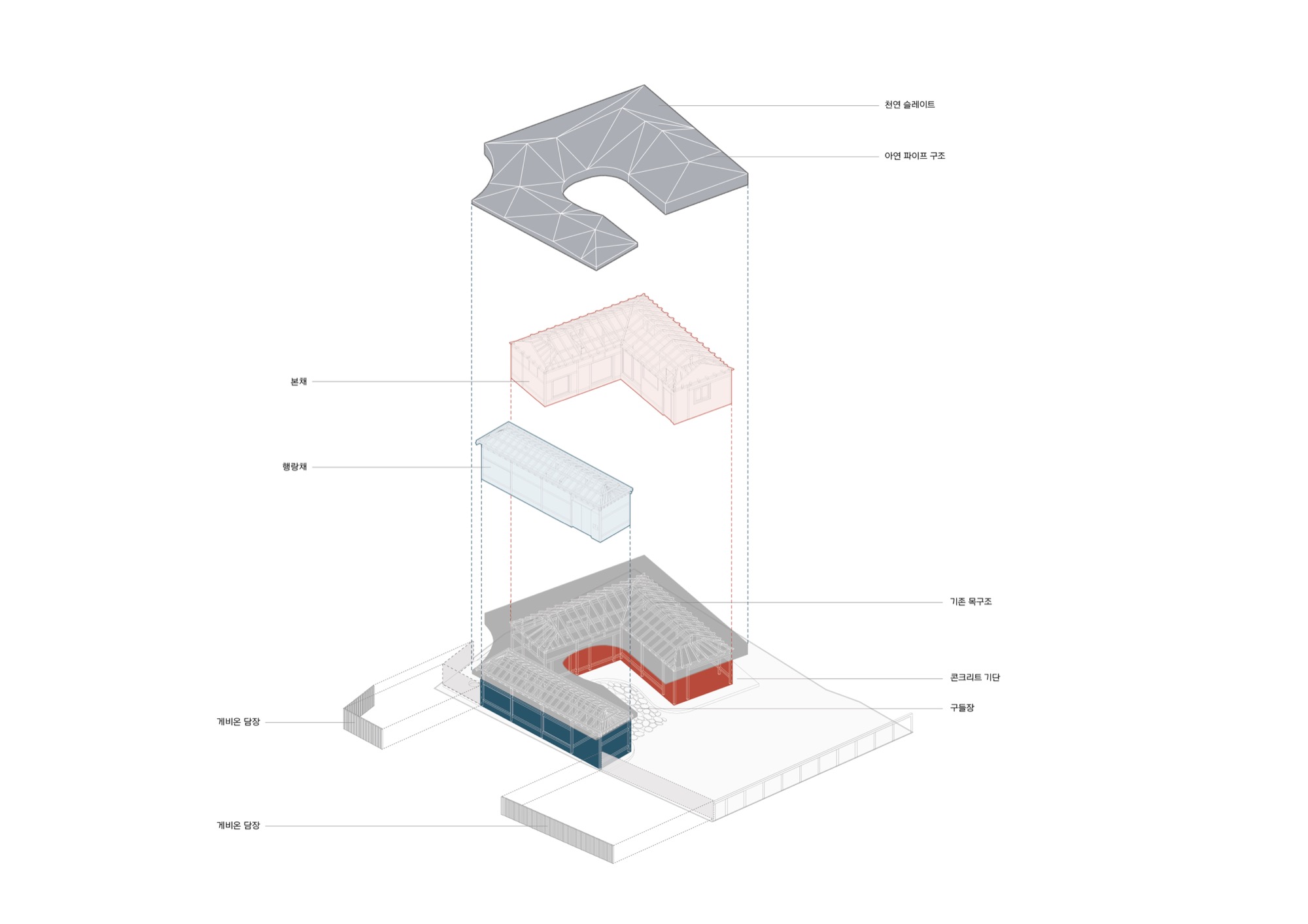 넘실대는 형상의 지붕은 금속 틀을 기존 목구조를 피해서 설치하는 방식으로 제작했다. 지붕의 외부 마감재로는 천연 슬레이트를 시공해 치밀한 설계 계획 의도를 넘어 패턴을 결정해나가며 만들었다. 이렇게 어긋나게 자리한 두 채를 지붕이 하나로 이어준다. 뒷산의 능선을 닮아 여러 경사를 가진 지붕은 묵직하게 집 위에 눌러앉은 모양새다.