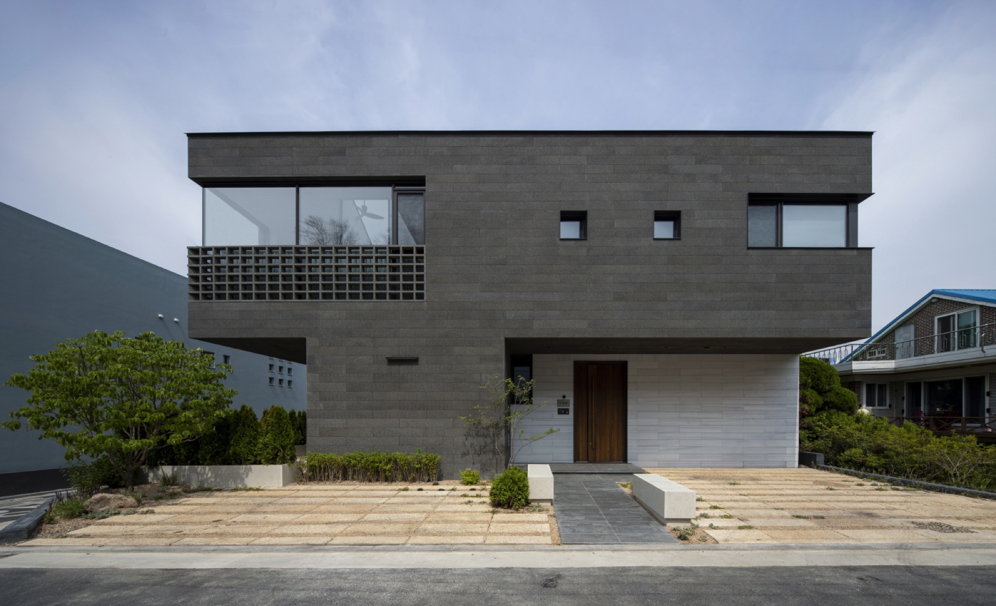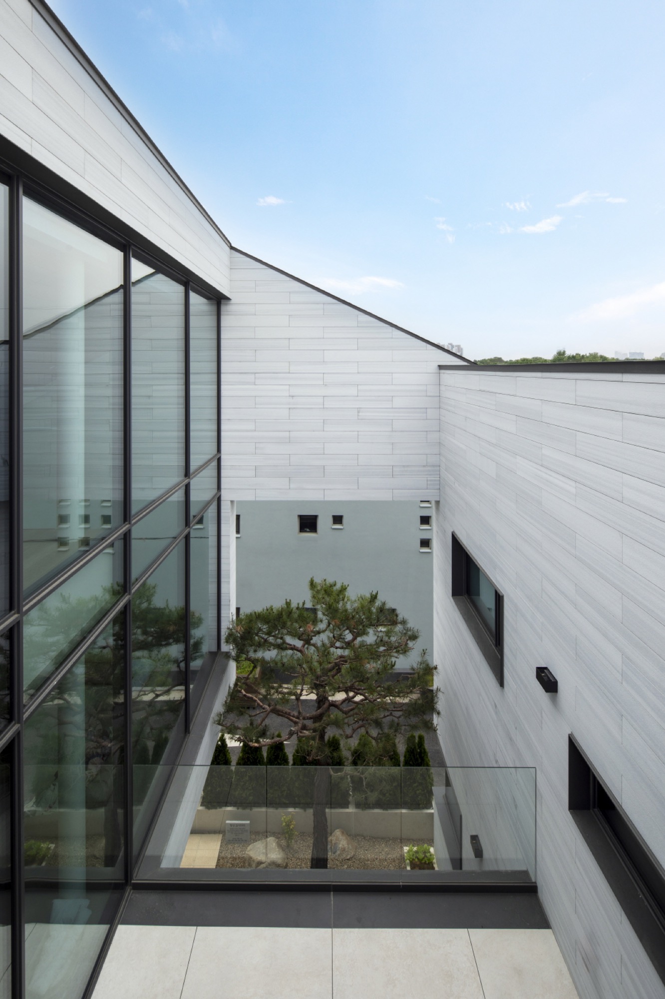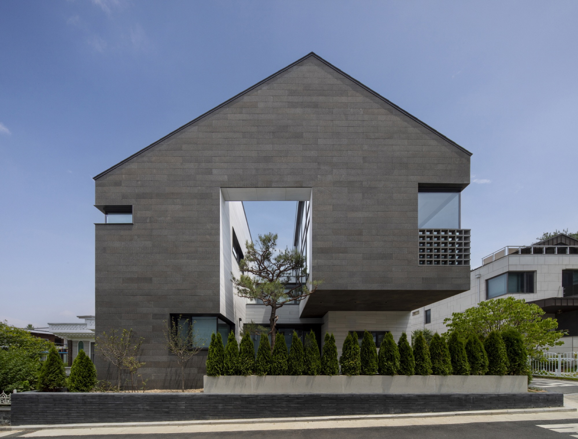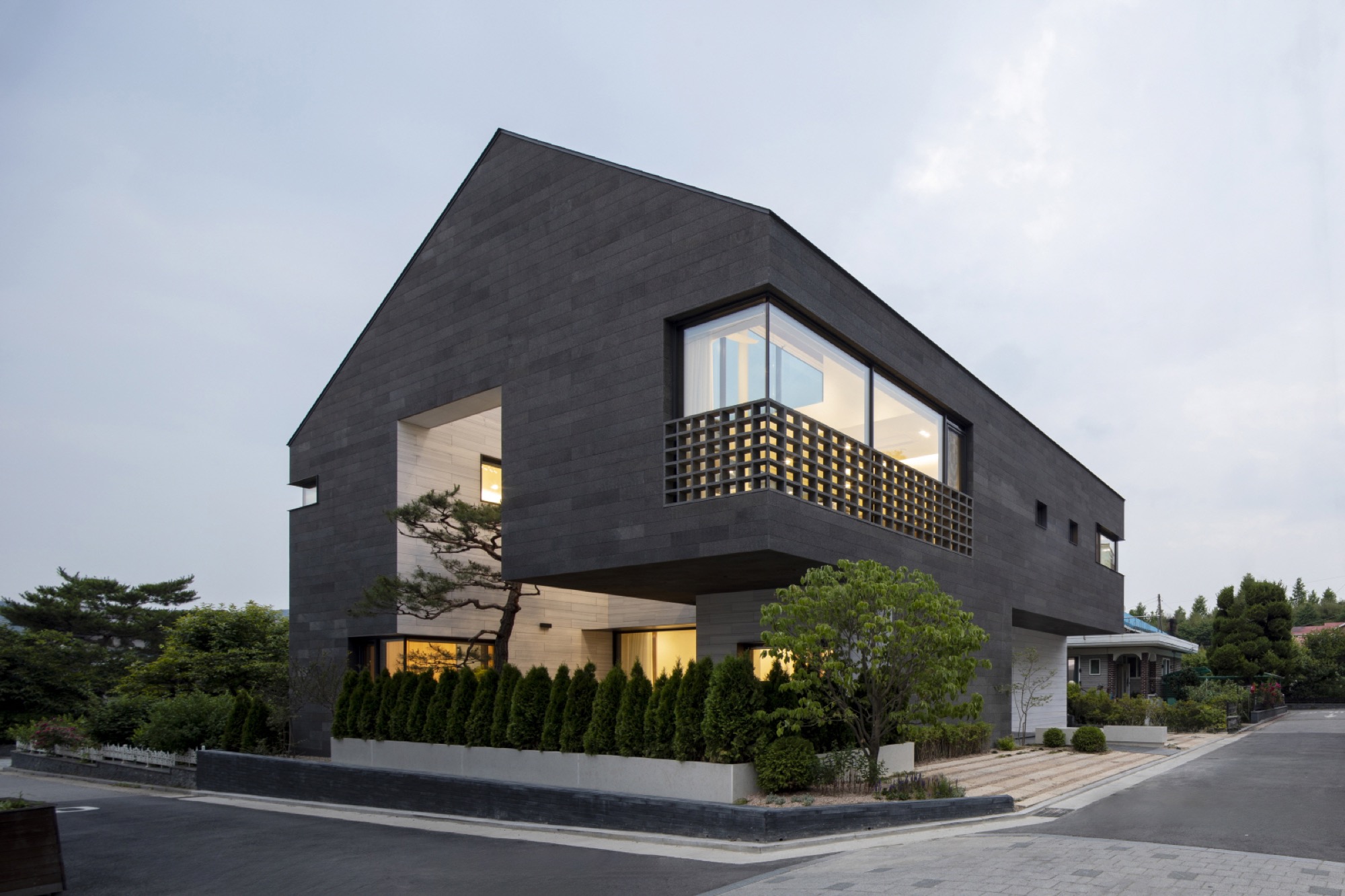 주변 풍경을 담아내야 하는 집은 대지를 채우는 삶의 기하학으로 출발했다. 동쪽 도로변 3m 건축선을 제외하고 남겨진 대지에 채워진 기하학은 건폐율을 조율하면서 비건폐지를 품는 형상이 되었다. 이 형태는 다방향의 풍경을 담는 방식으로 다층적 시선이 공존하며, 특유의 깊이감이 기하학적 조형 언어로 표현된다.