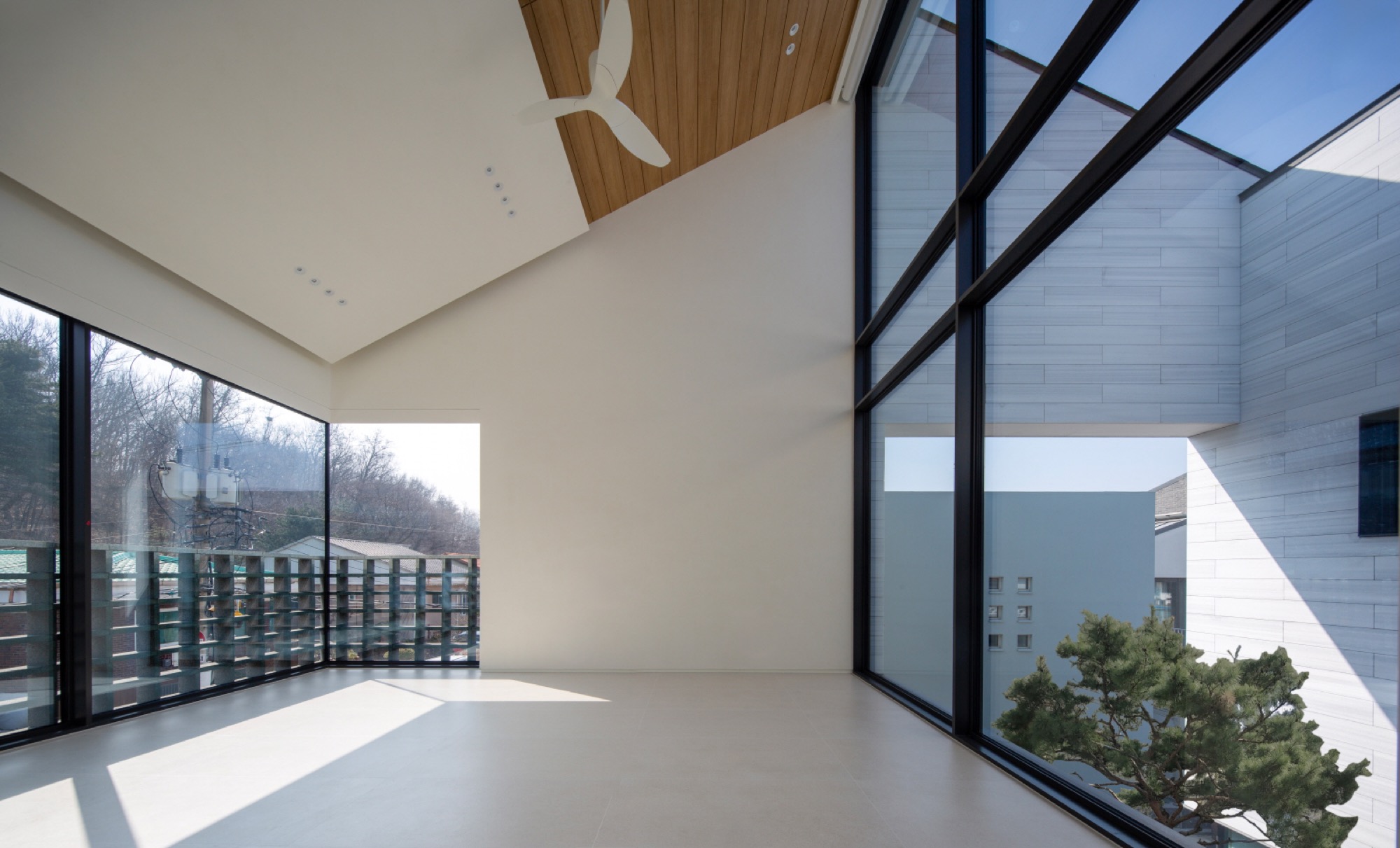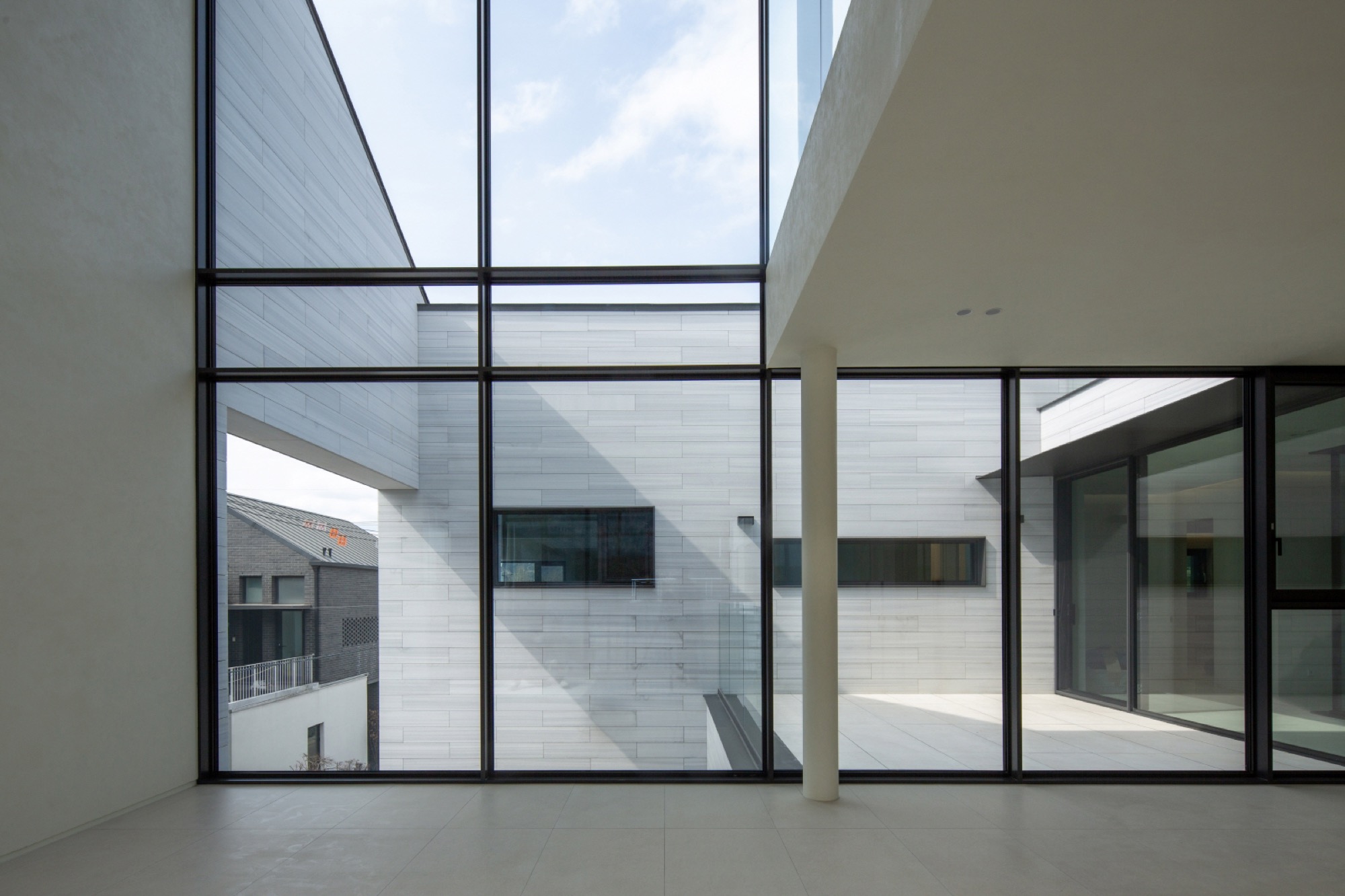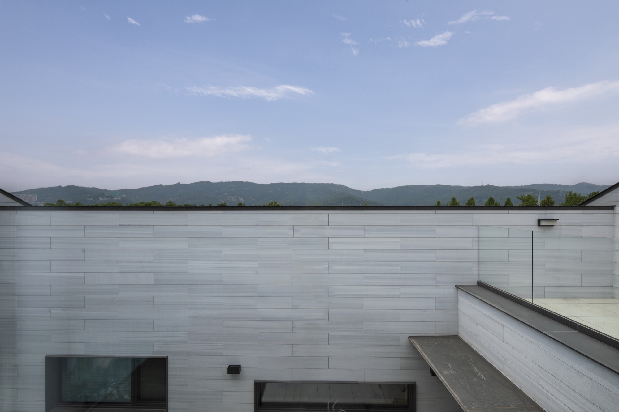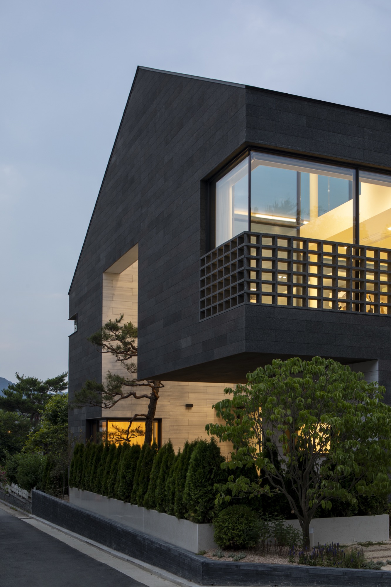 주변 풍경을 담아내야 하는 집은 대지를 채우는 삶의 기하학으로 출발했다. 동쪽 도로변 3m 건축선을 제외하고 남겨진 대지에 채워진 기하학은 건폐율을 조율하면서 비건폐지를 품는 형상이 되었다. 이 형태는 다방향의 풍경을 담는 방식으로 다층적 시선이 공존하며, 특유의 깊이감이 기하학적 조형 언어로 표현된다.