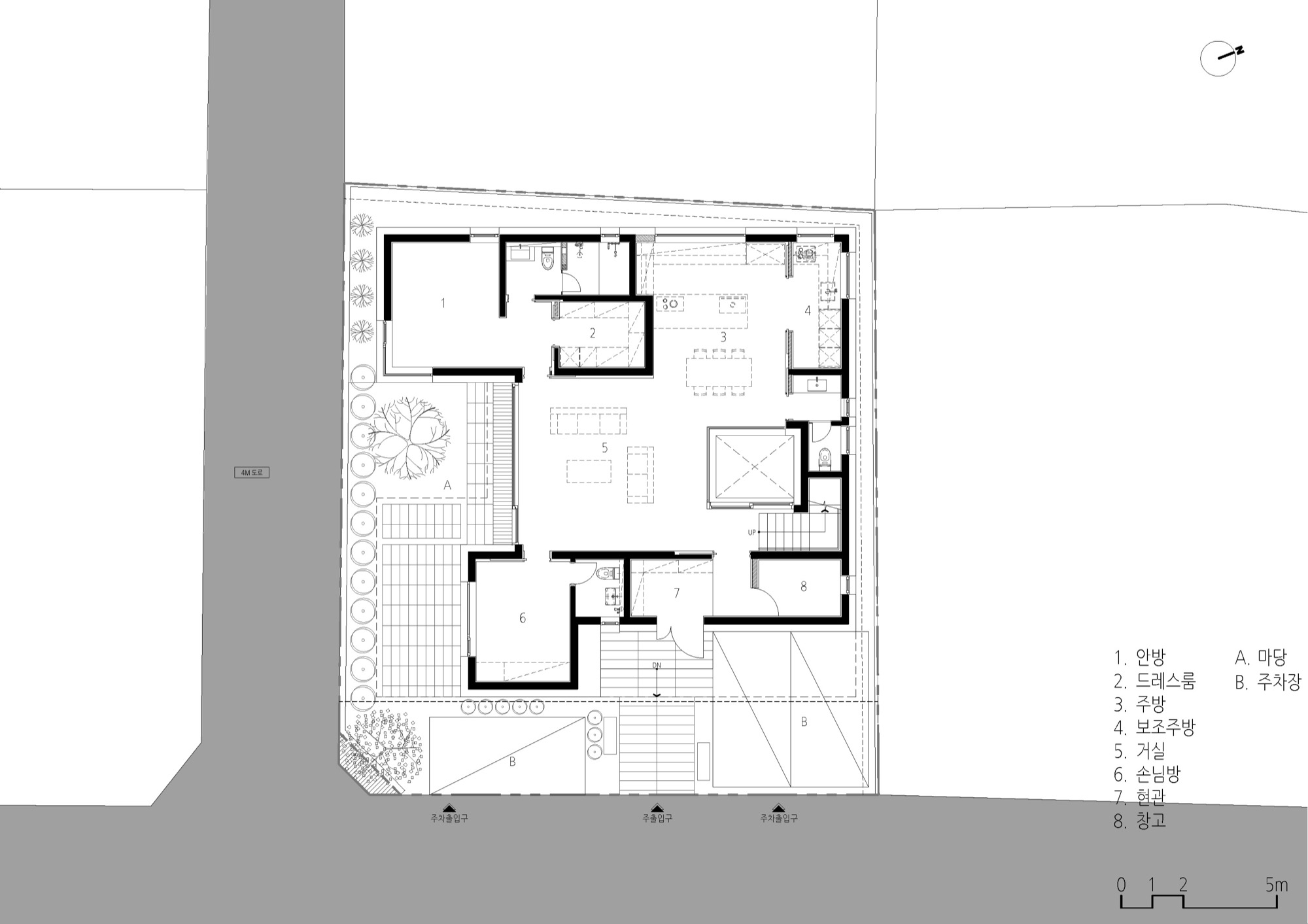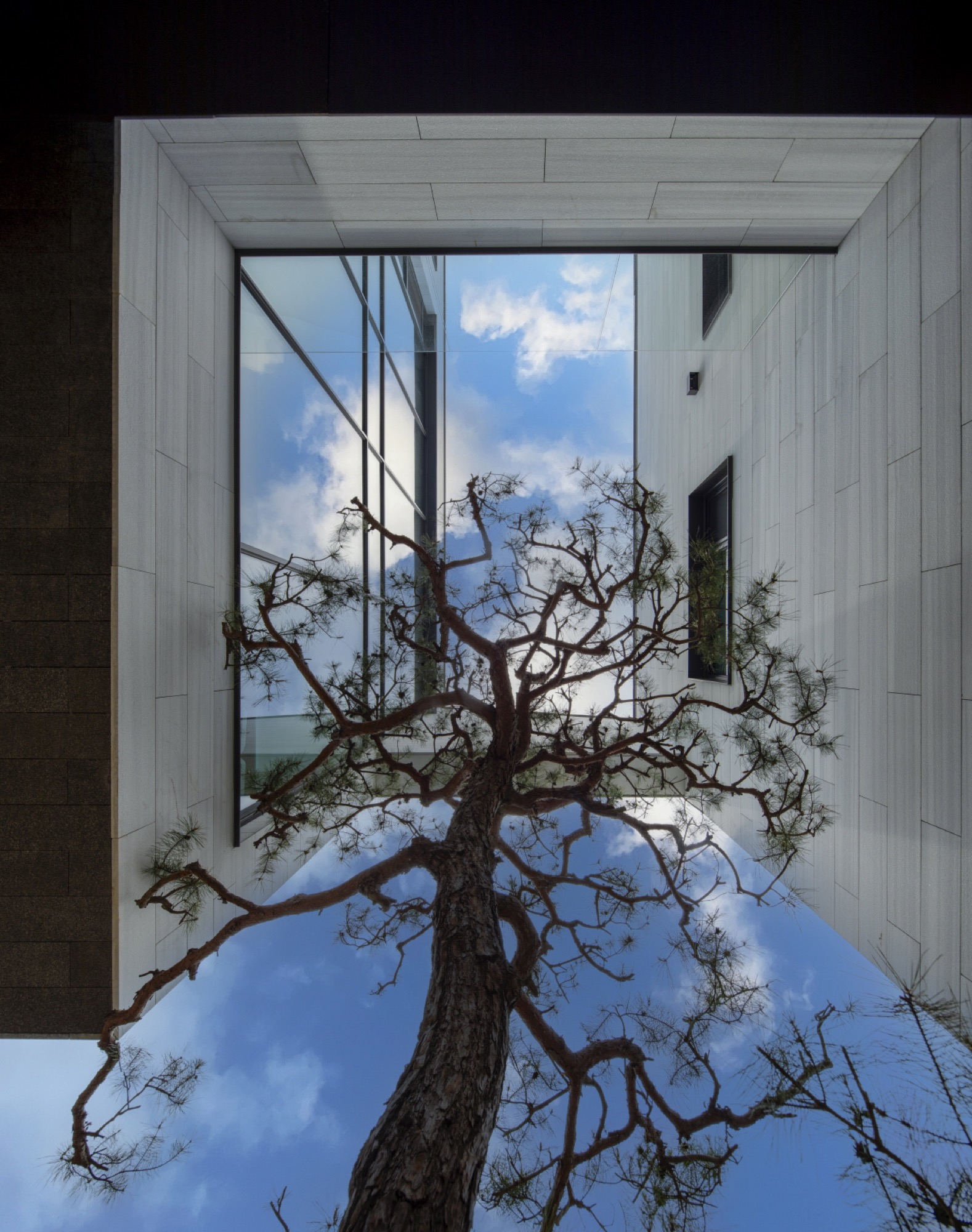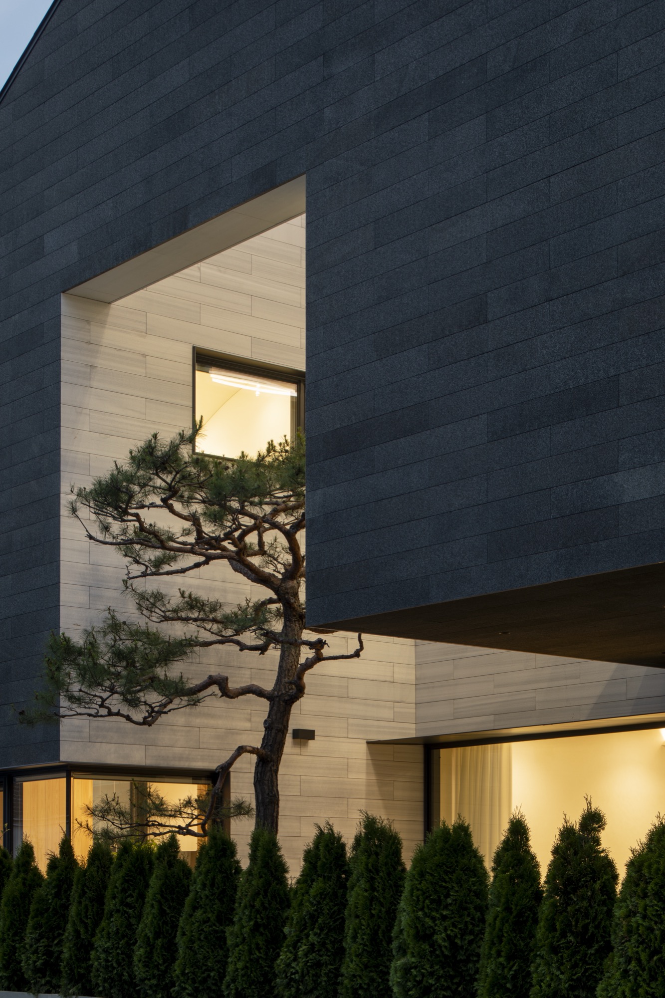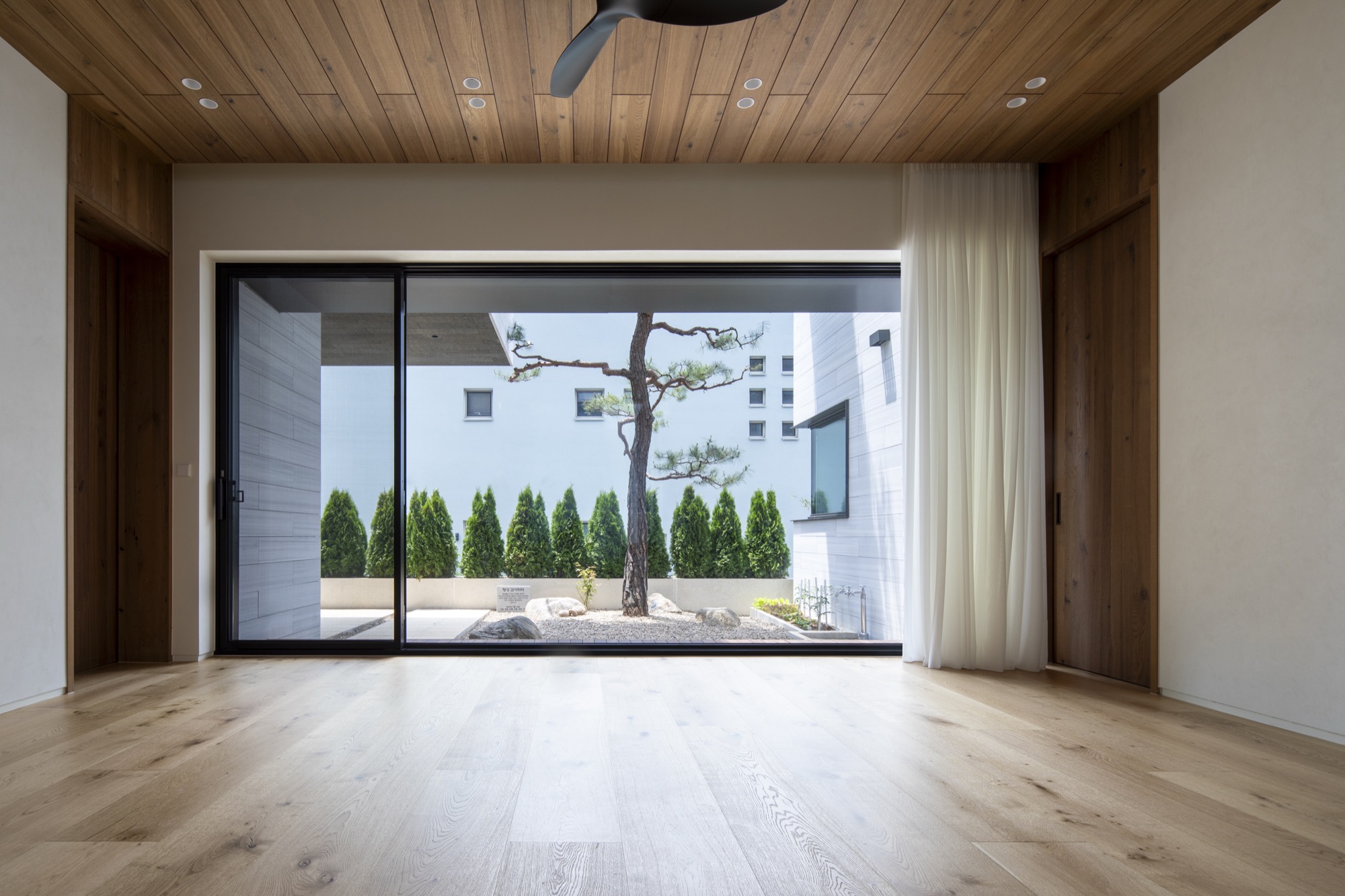 주변 풍경을 담아내야 하는 집은 대지를 채우는 삶의 기하학으로 출발했다. 동쪽 도로변 3m 건축선을 제외하고 남겨진 대지에 채워진 기하학은 건폐율을 조율하면서 비건폐지를 품는 형상이 되었다. 이 형태는 다방향의 풍경을 담는 방식으로 다층적 시선이 공존하며, 특유의 깊이감이 기하학적 조형 언어로 표현된다.