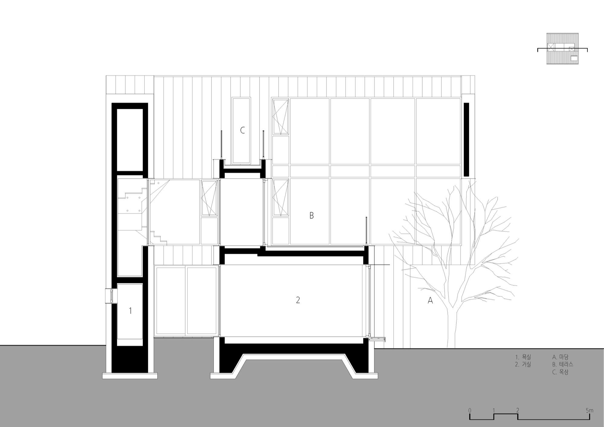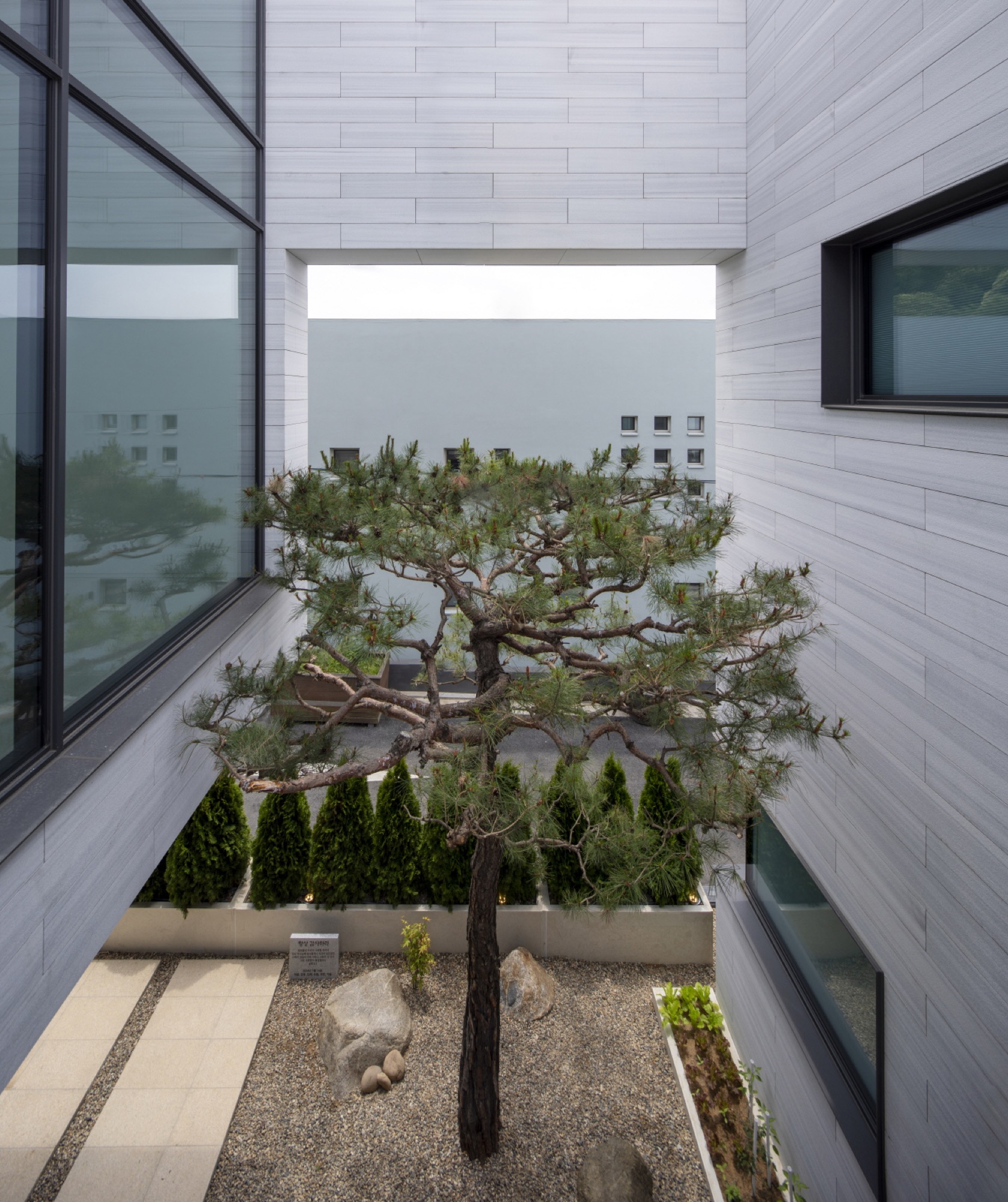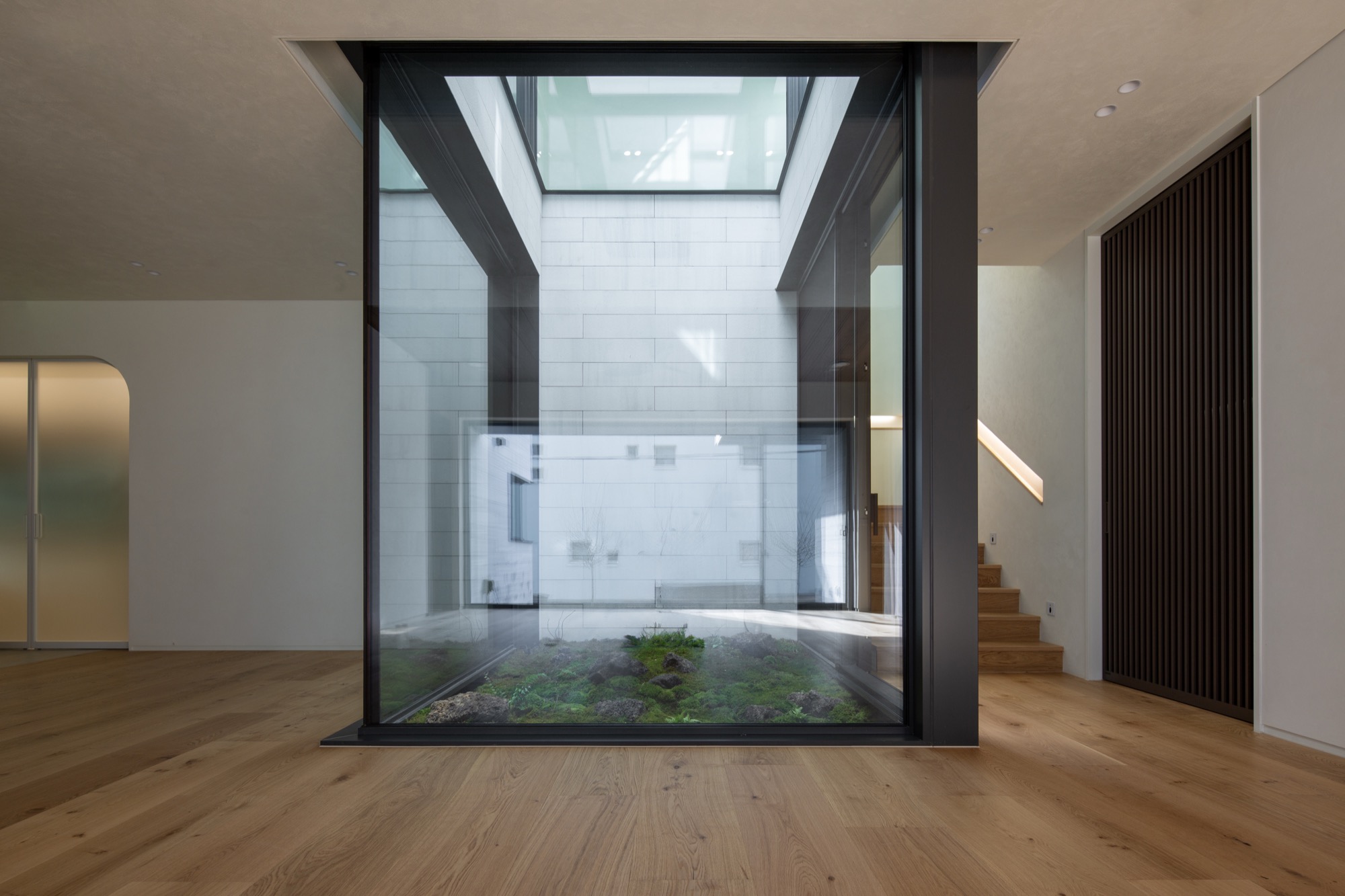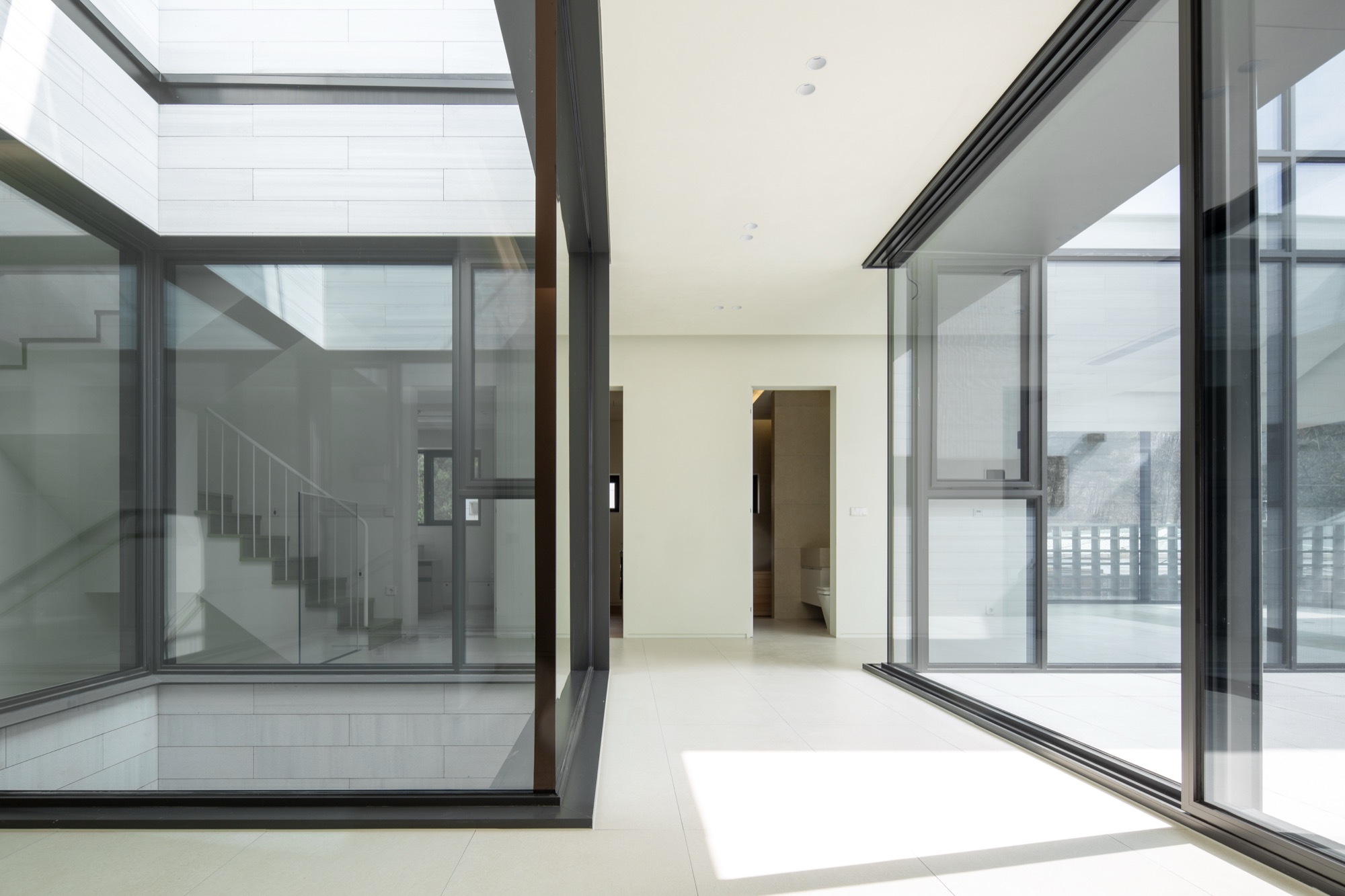 여기에 입체적으로 내부화된 마당인 비건폐지와 테라스는 기하학 속에 만들어진다. 비건폐지는 개방적인 앞쪽 안마당과 폐쇄적인 뒤쪽 광장으로 나뉘고, 테라스는 2층과 다락으로 층층이 만들어 기하학 중심과 같은 축 선상에 배치된다. 높이와 깊이가 서로 다른 마당의 배치는 일상과 이어지면서 주변 풍경으로 확장되는 프레임으로 작동한다. 층마다 다른 거리감의 풍경은 여러 시점의 풍경으로 일상 속에 펼쳐진다.