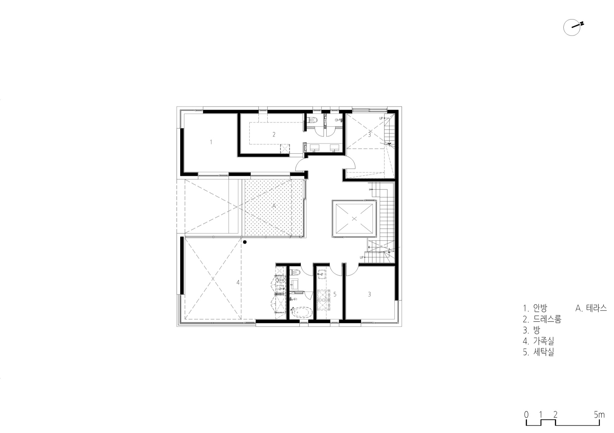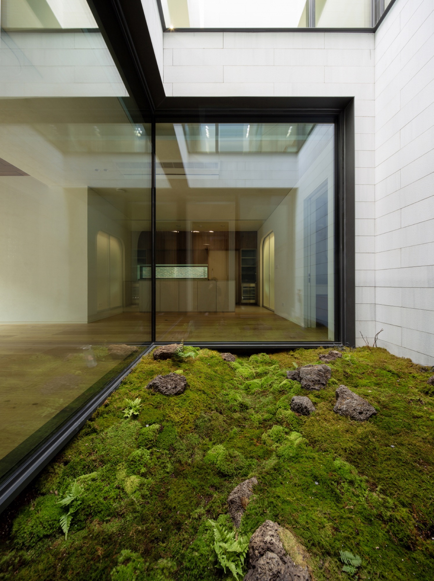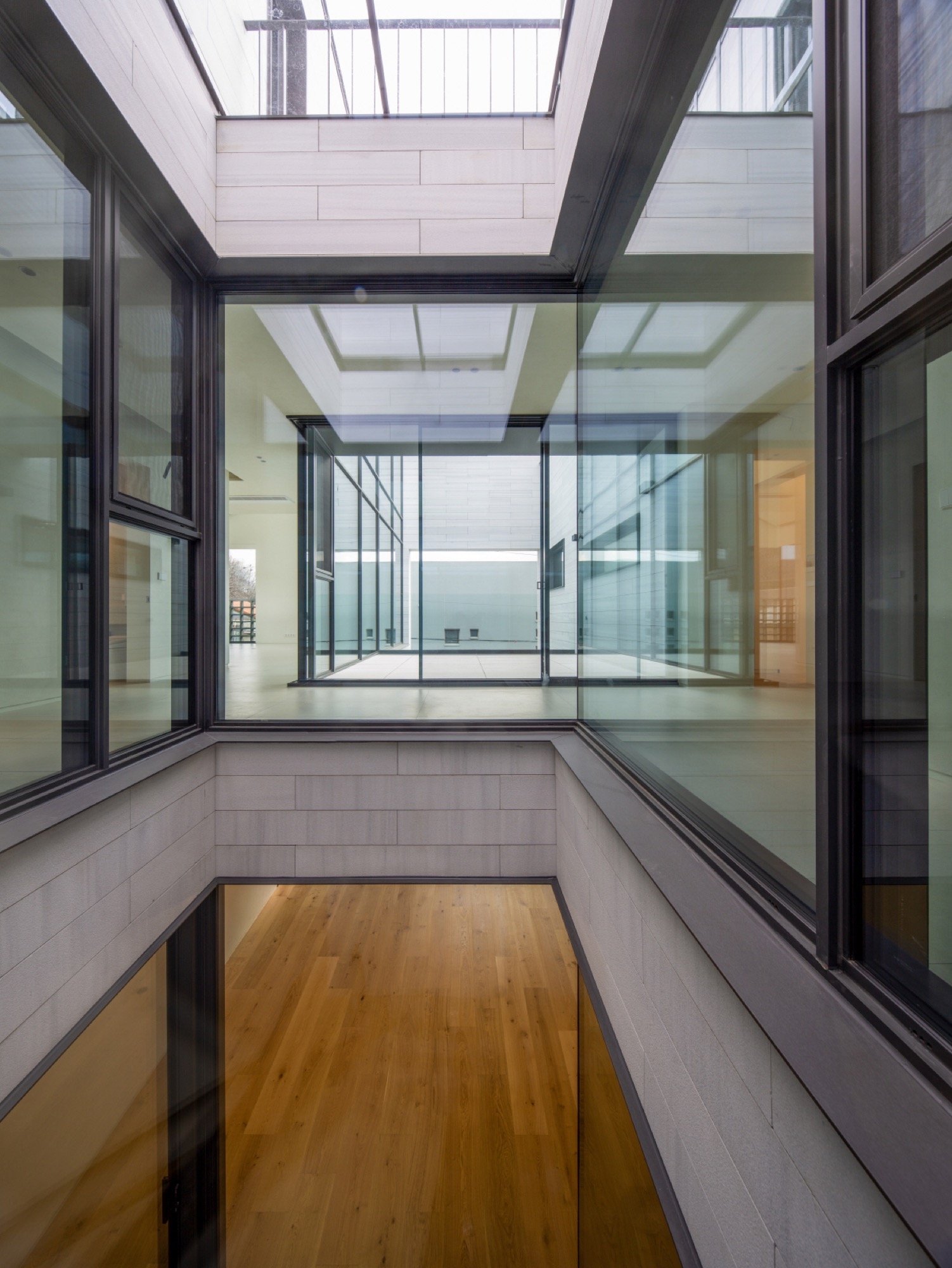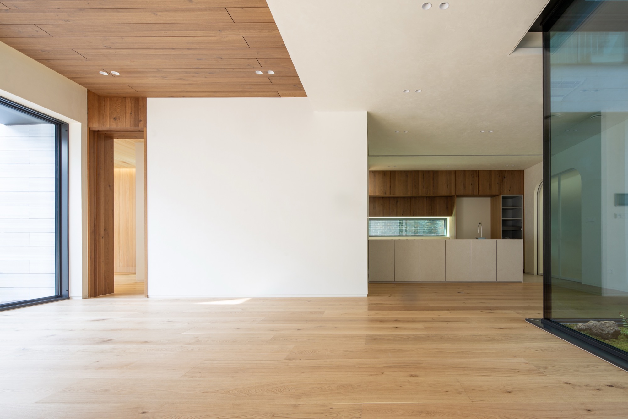여기에 입체적으로 내부화된 마당인 비건폐지와 테라스는 기하학 속에 만들어진다. 비건폐지는 개방적인 앞쪽 안마당과 폐쇄적인 뒤쪽 광장으로 나뉘고, 테라스는 2층과 다락으로 층층이 만들어 기하학 중심과 같은 축 선상에 배치된다. 높이와 깊이가 서로 다른 마당의 배치는 일상과 이어지면서 주변 풍경으로 확장되는 프레임으로 작동한다. 층마다 다른 거리감의 풍경은 여러 시점의 풍경으로 일상 속에 펼쳐진다.