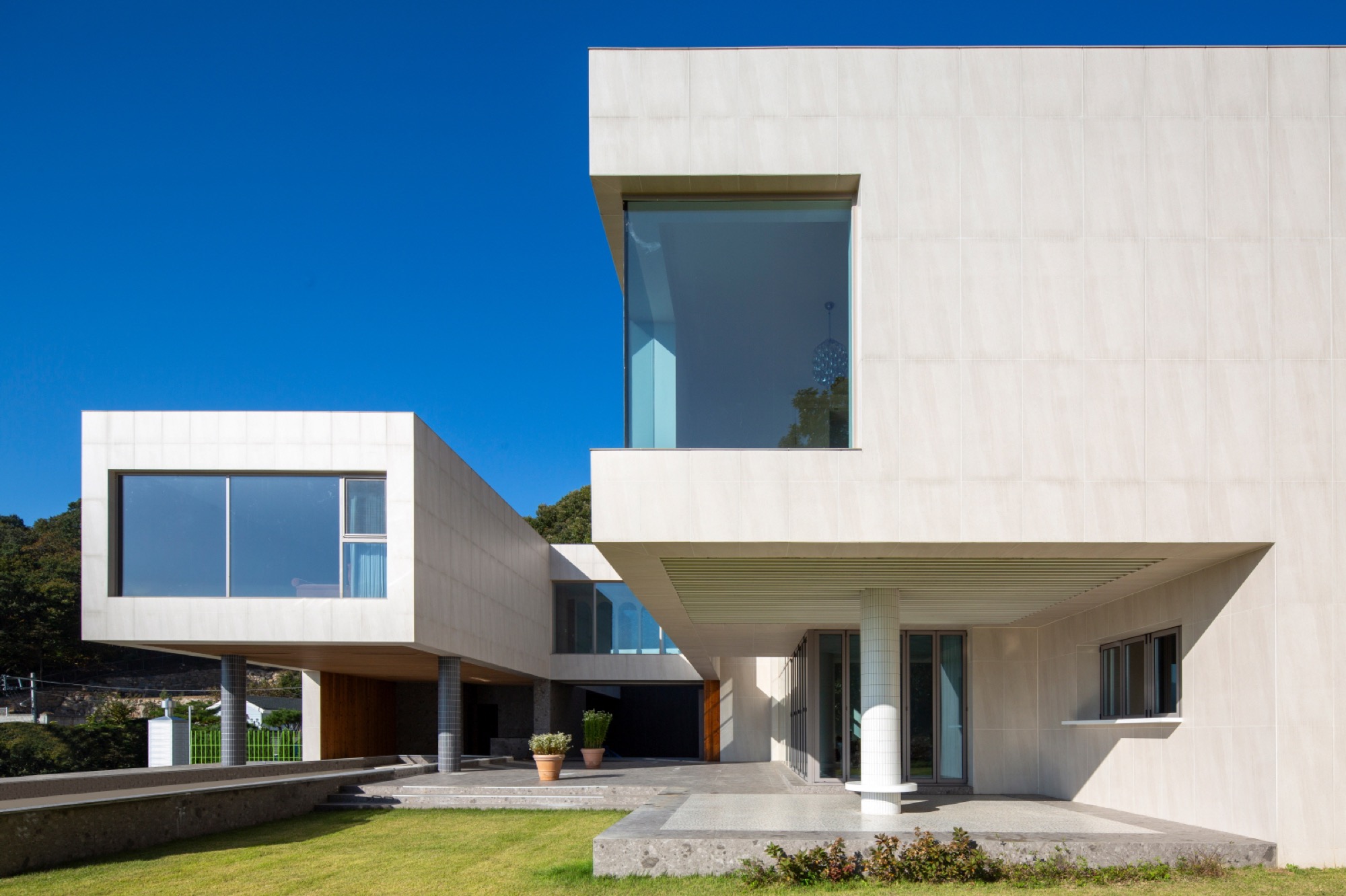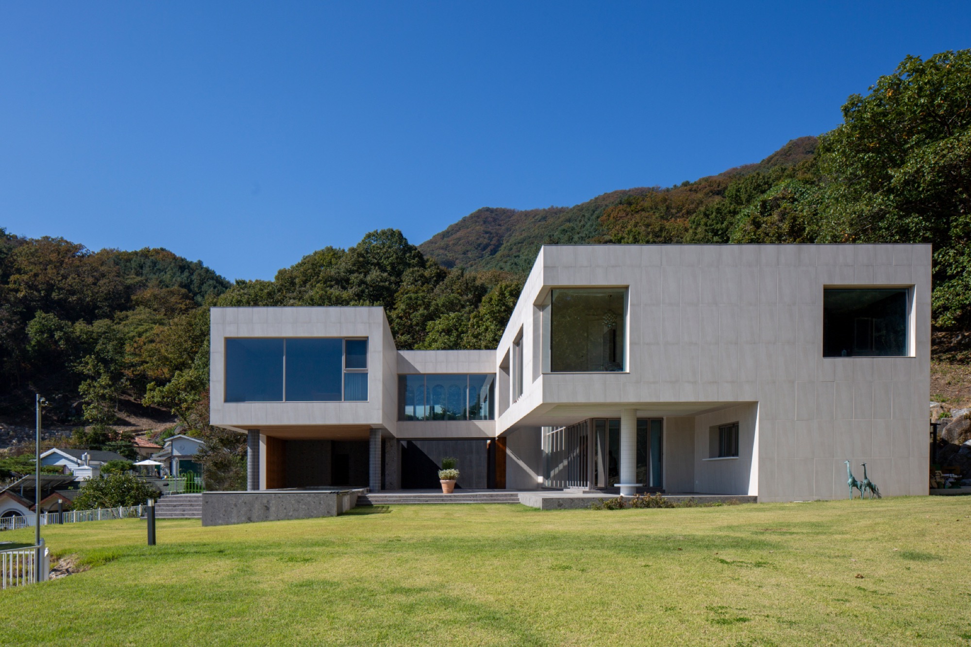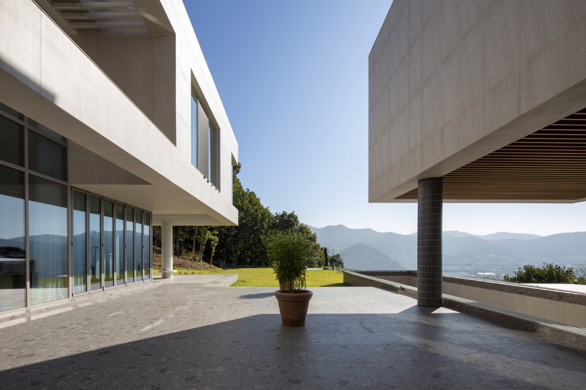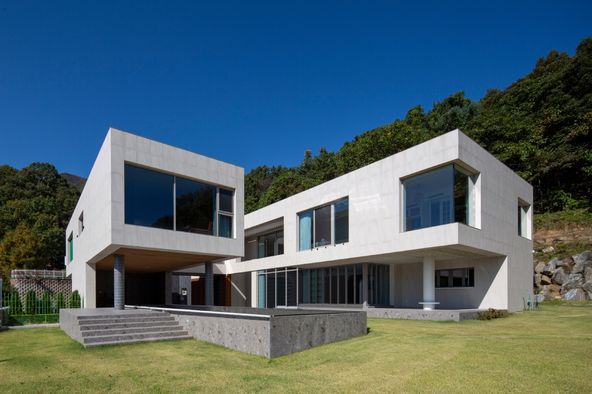 경사진 대지의 흐름은 그대로 건물의 배치로 이어진다. 두 개의 매스는 가운데 사이 마당을 두고, 서쪽 도로에 주 출입구를 형성한다. 1층은 사이 마당을 가운데 두고, 북쪽 매스는 복층의 거실과 식당, 주방으로 계획했고, 남쪽 매스는 필로티로 계획하여 야외 수영장을 배치했다. 2층은 두 매스를 잇는 'ㄷ'자 배치를 하여 북쪽에는 부부의 침실을, 남쪽에는 손님과 자녀 방들을 두었다. 이처럼 지형의 흐름에 순응하는 기하학의 배치는 삶과 풍경의 연결체로 다앙한 풍경 체험의 건축적 장치가 된다.