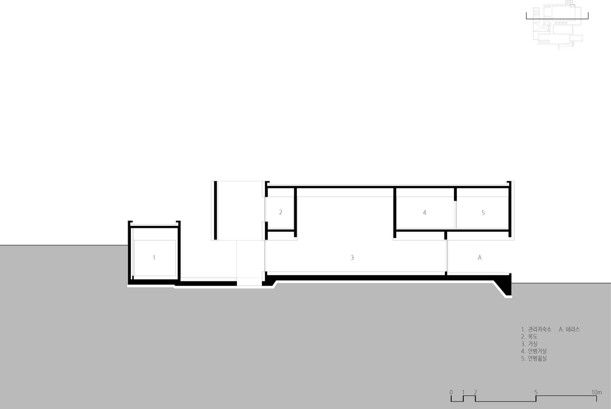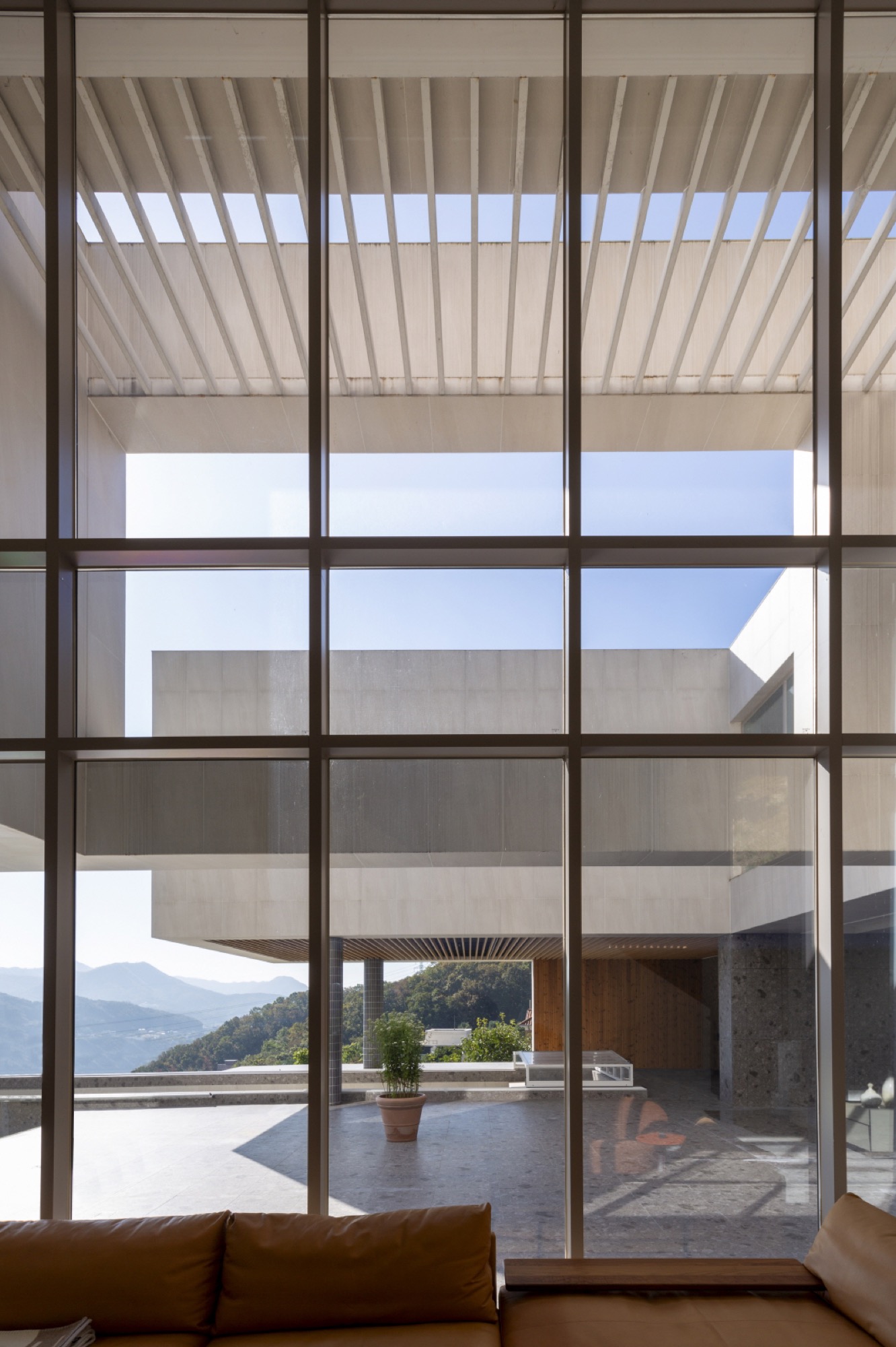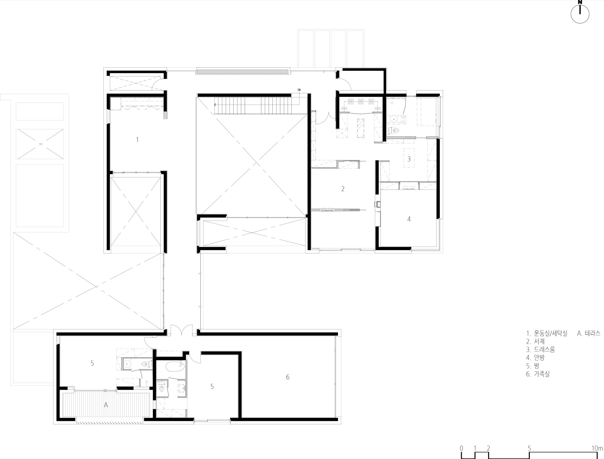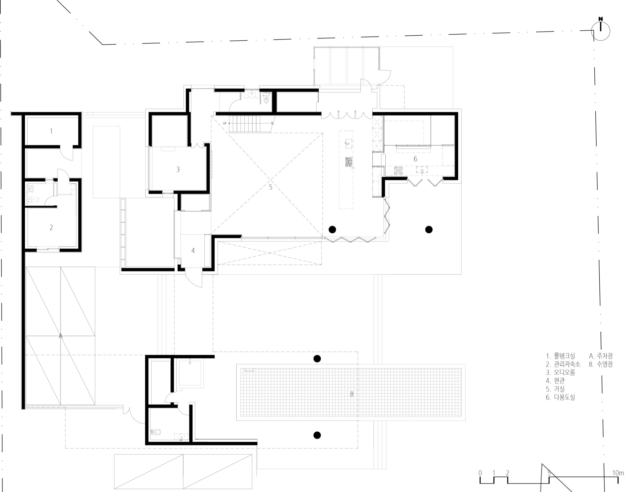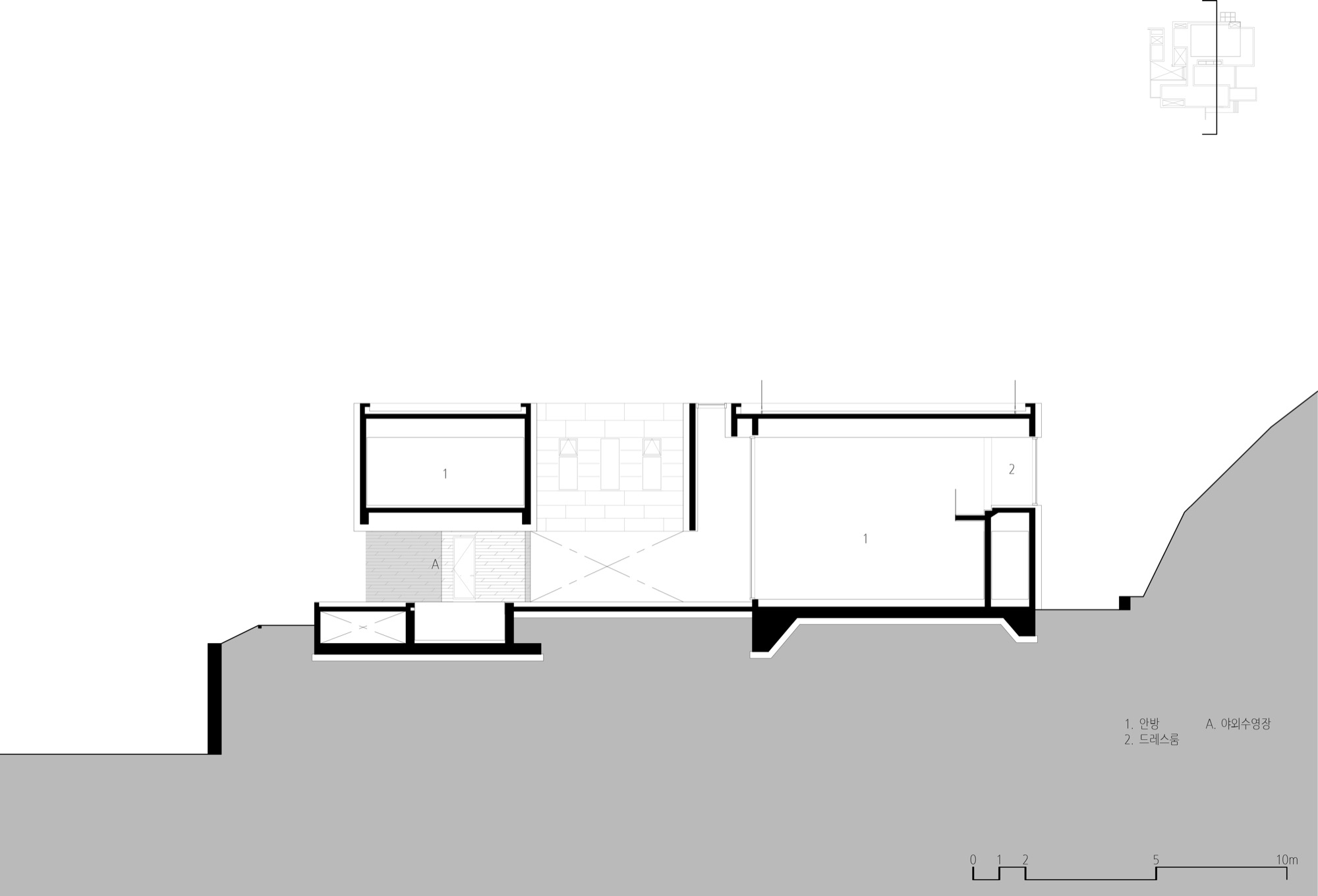 경사진 대지의 흐름은 그대로 건물의 배치로 이어진다. 두 개의 매스는 가운데 사이 마당을 두고, 서쪽 도로에 주 출입구를 형성한다. 1층은 사이 마당을 가운데 두고, 북쪽 매스는 복층의 거실과 식당, 주방으로 계획했고, 남쪽 매스는 필로티로 계획하여 야외 수영장을 배치했다. 2층은 두 매스를 잇는 'ㄷ'자 배치를 하여 북쪽에는 부부의 침실을, 남쪽에는 손님과 자녀 방들을 두었다. 이처럼 지형의 흐름에 순응하는 기하학의 배치는 삶과 풍경의 연결체로 다앙한 풍경 체험의 건축적 장치가 된다.