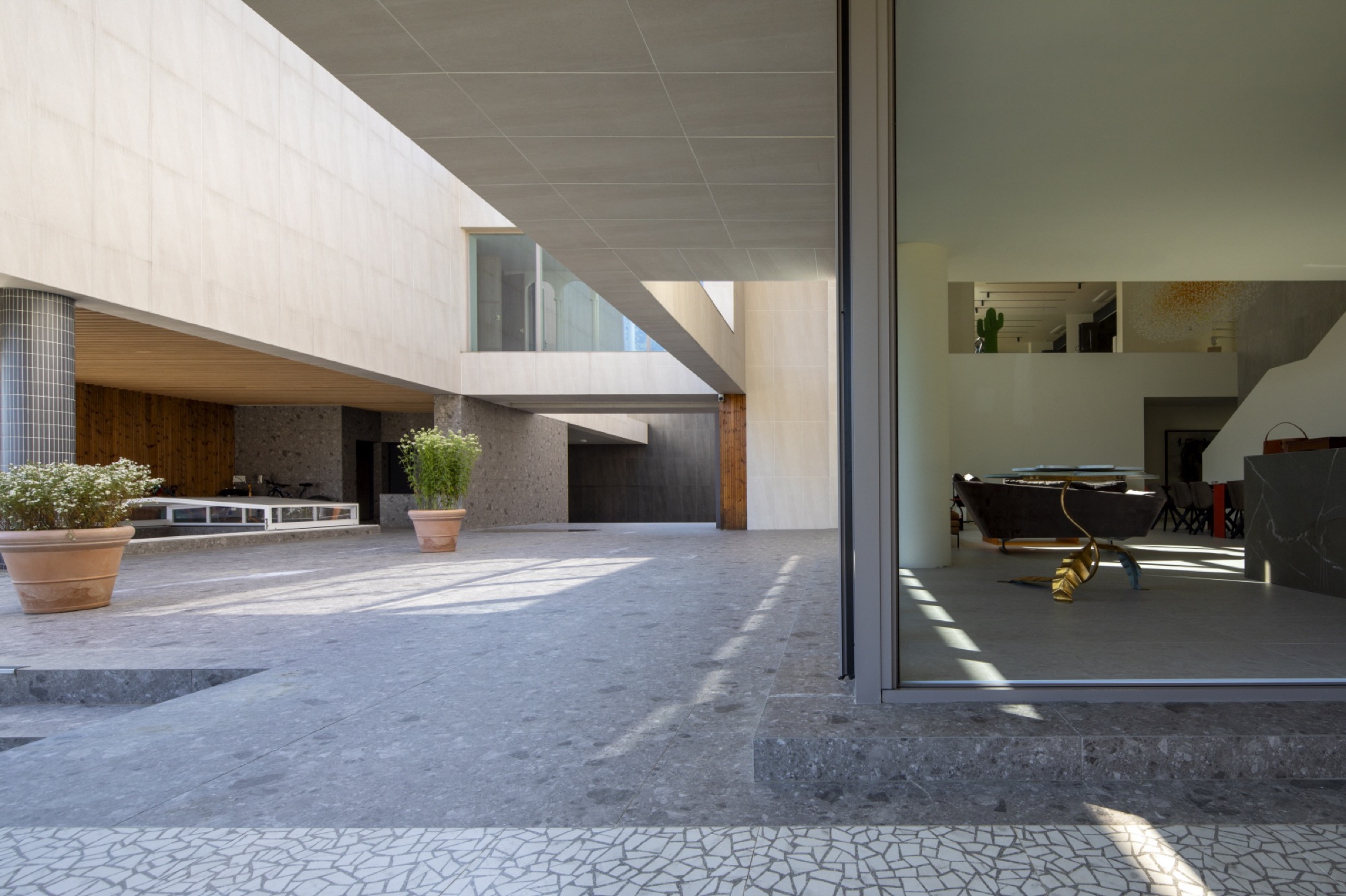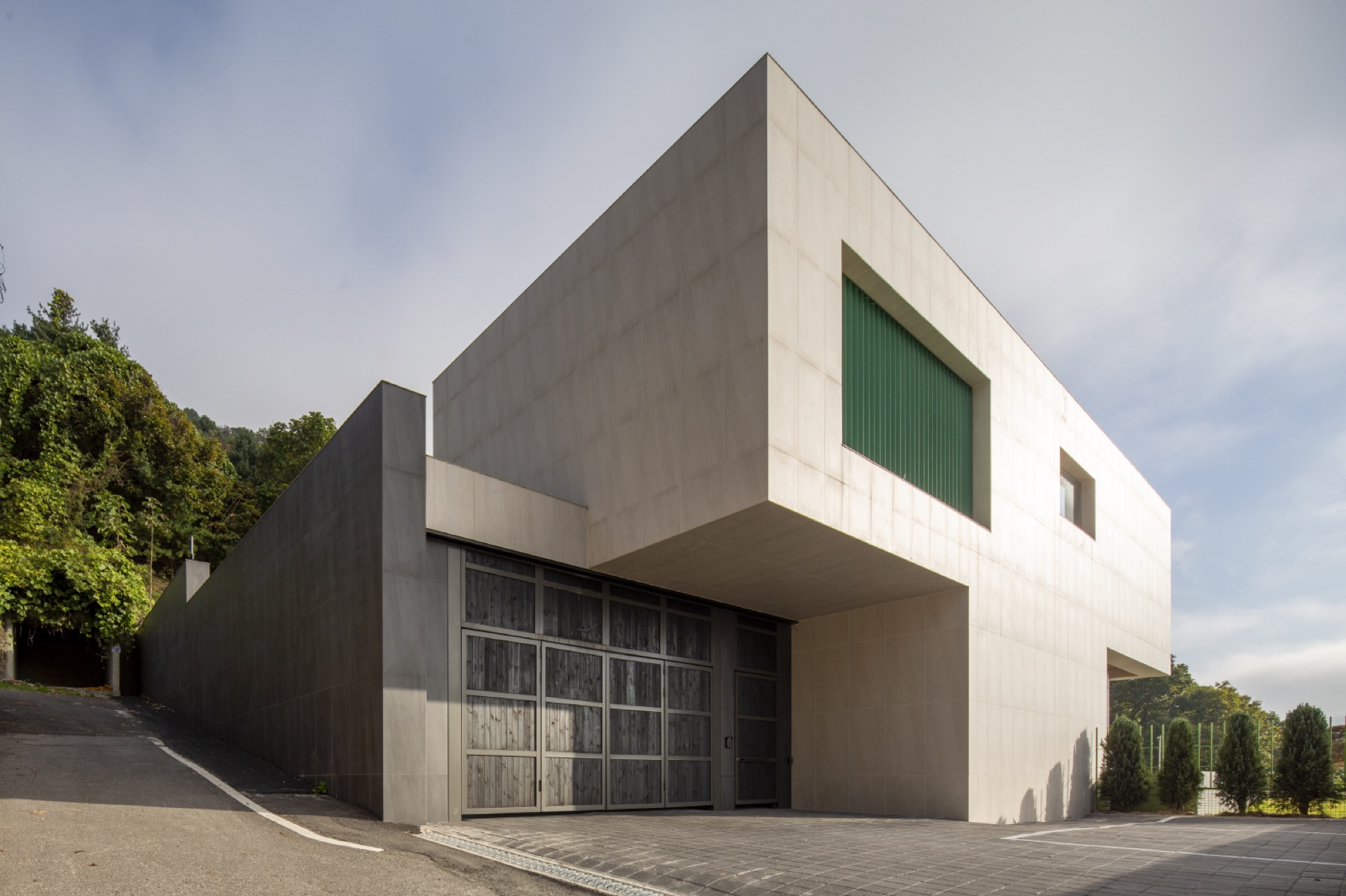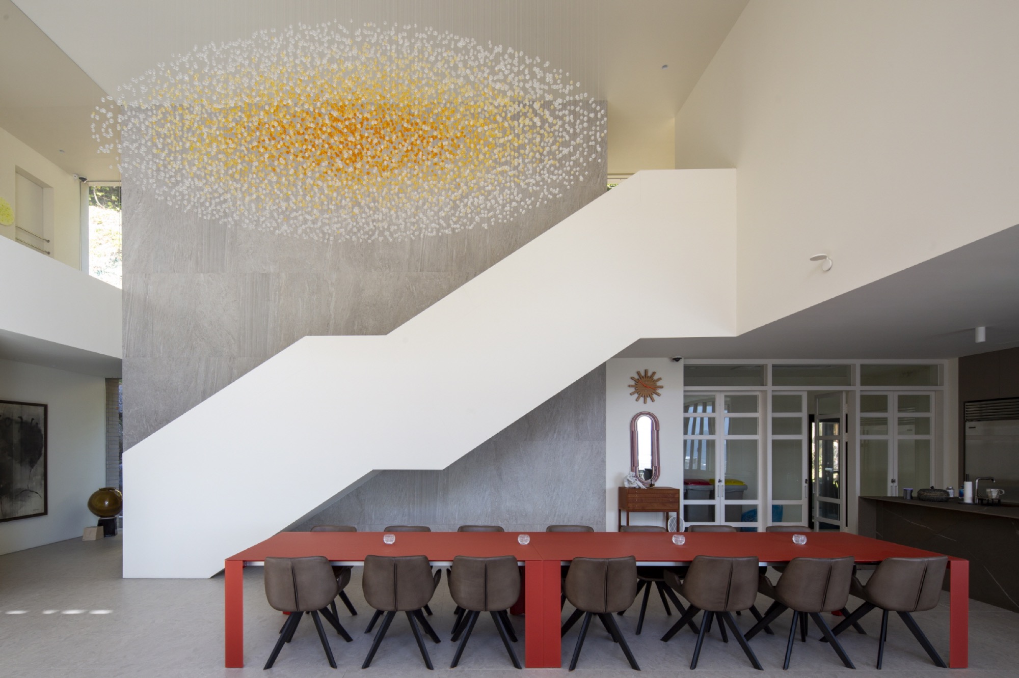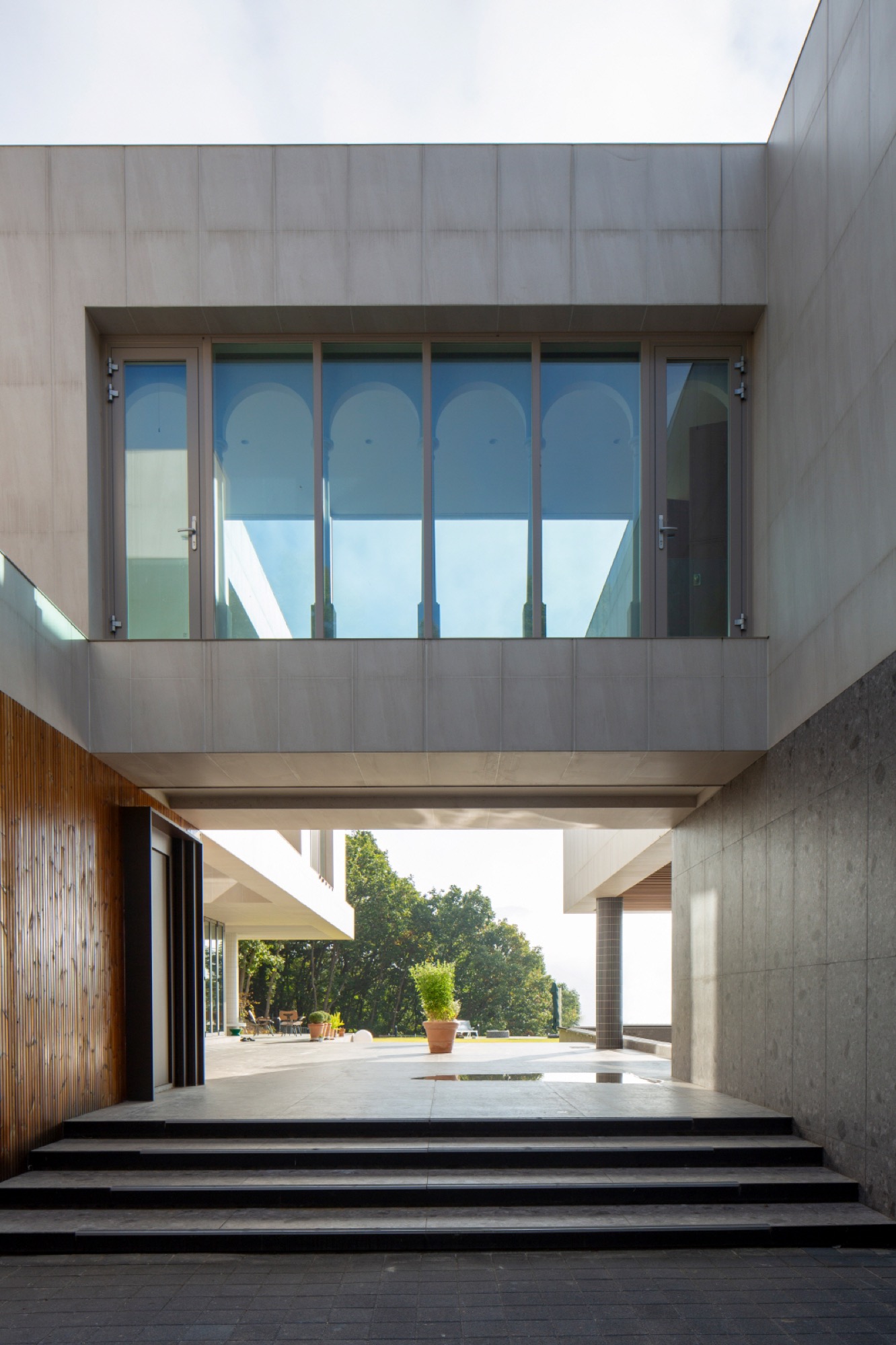 경사진 대지의 흐름은 그대로 건물의 배치로 이어진다. 두 개의 매스는 가운데 사이 마당을 두고, 서쪽 도로에 주 출입구를 형성한다. 1층은 사이 마당을 가운데 두고, 북쪽 매스는 복층의 거실과 식당, 주방으로 계획했고, 남쪽 매스는 필로티로 계획하여 야외 수영장을 배치했다. 2층은 두 매스를 잇는 'ㄷ'자 배치를 하여 북쪽에는 부부의 침실을, 남쪽에는 손님과 자녀 방들을 두었다. 이처럼 지형의 흐름에 순응하는 기하학의 배치는 삶과 풍경의 연결체로 다앙한 풍경 체험의 건축적 장치가 된다.