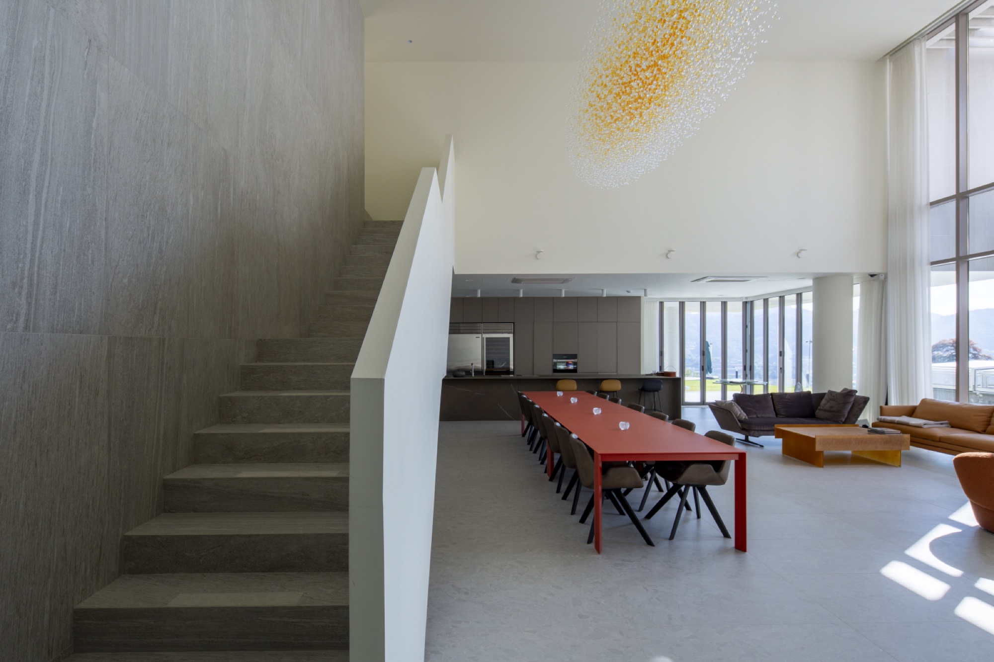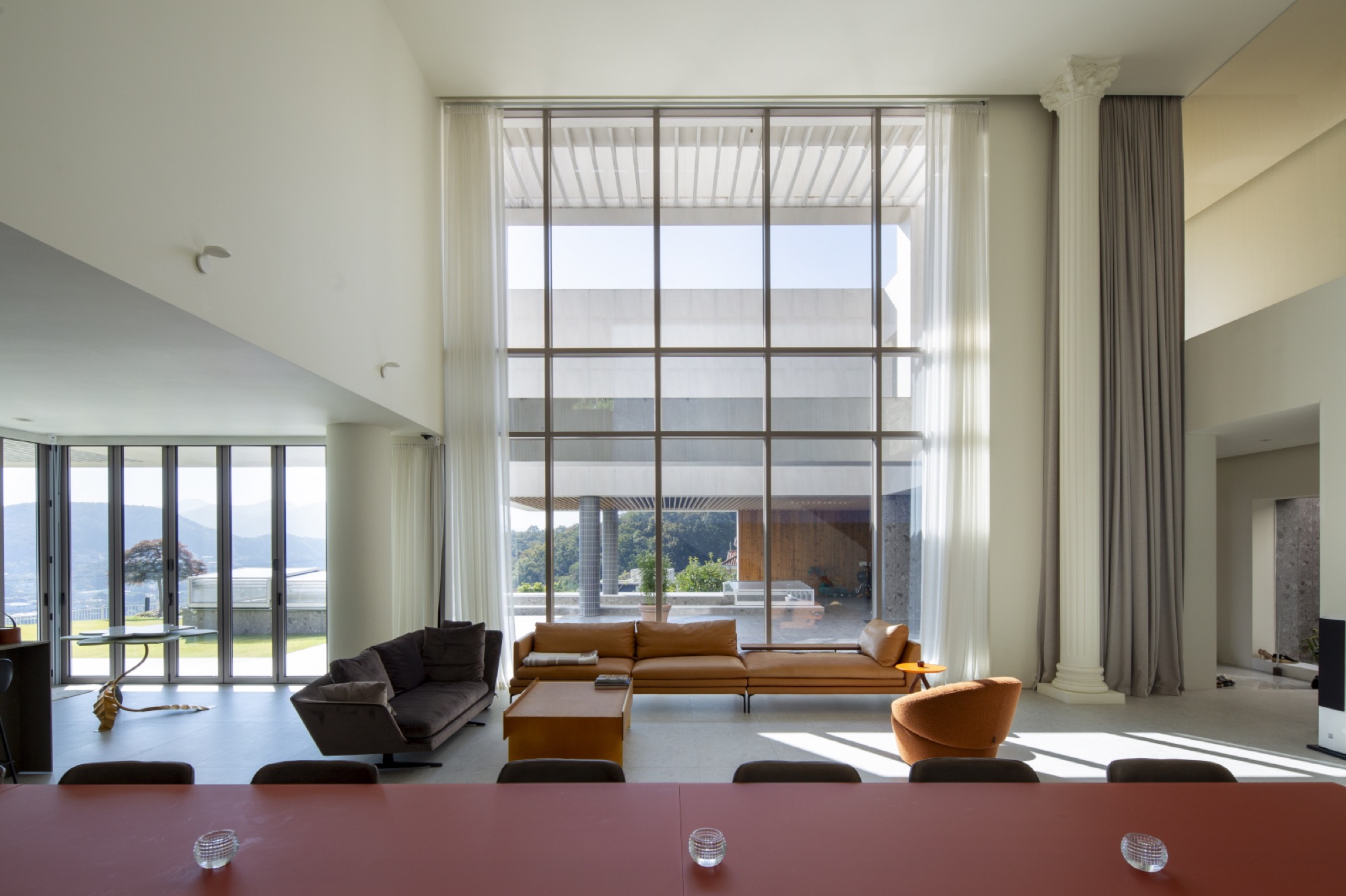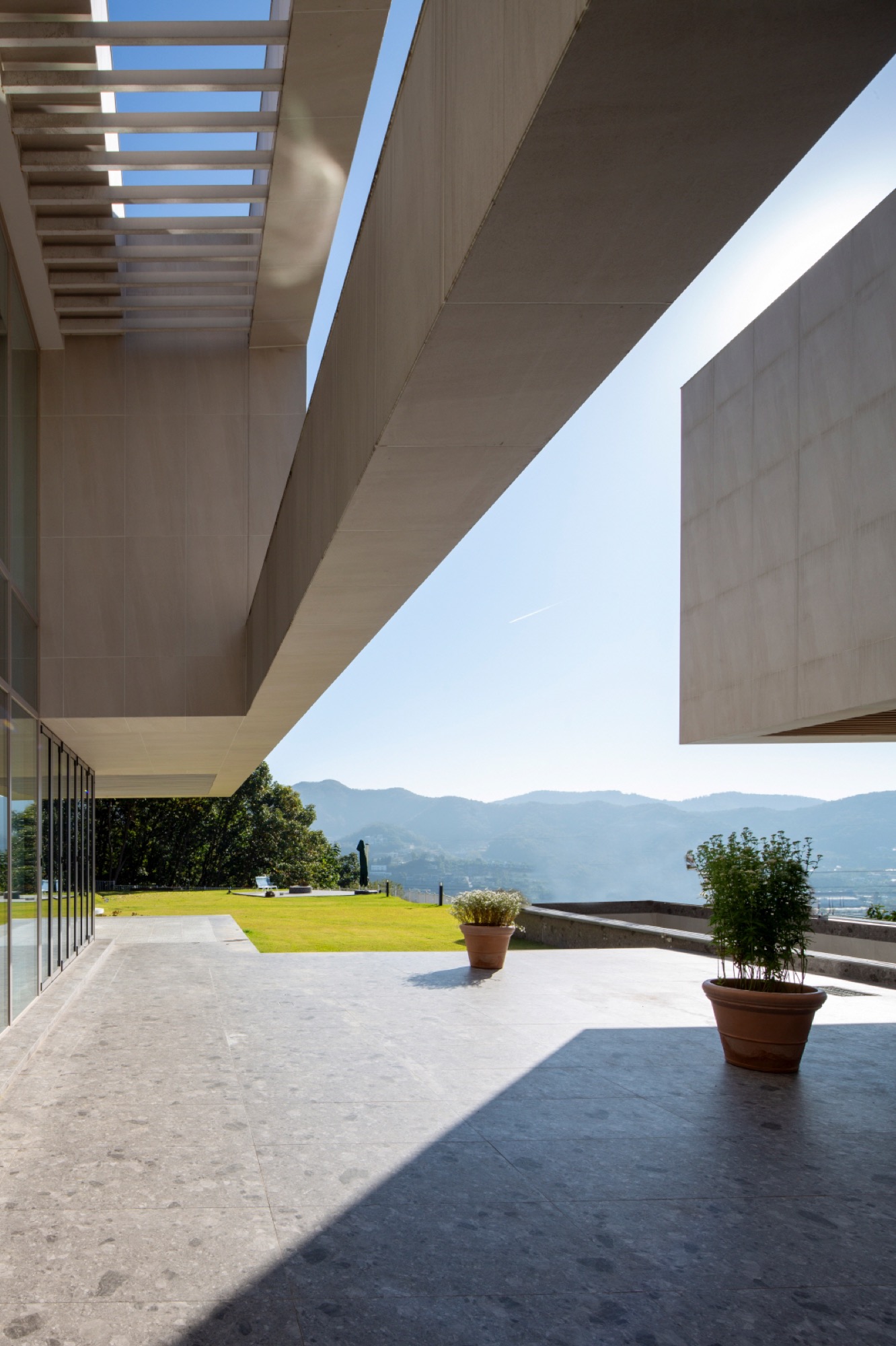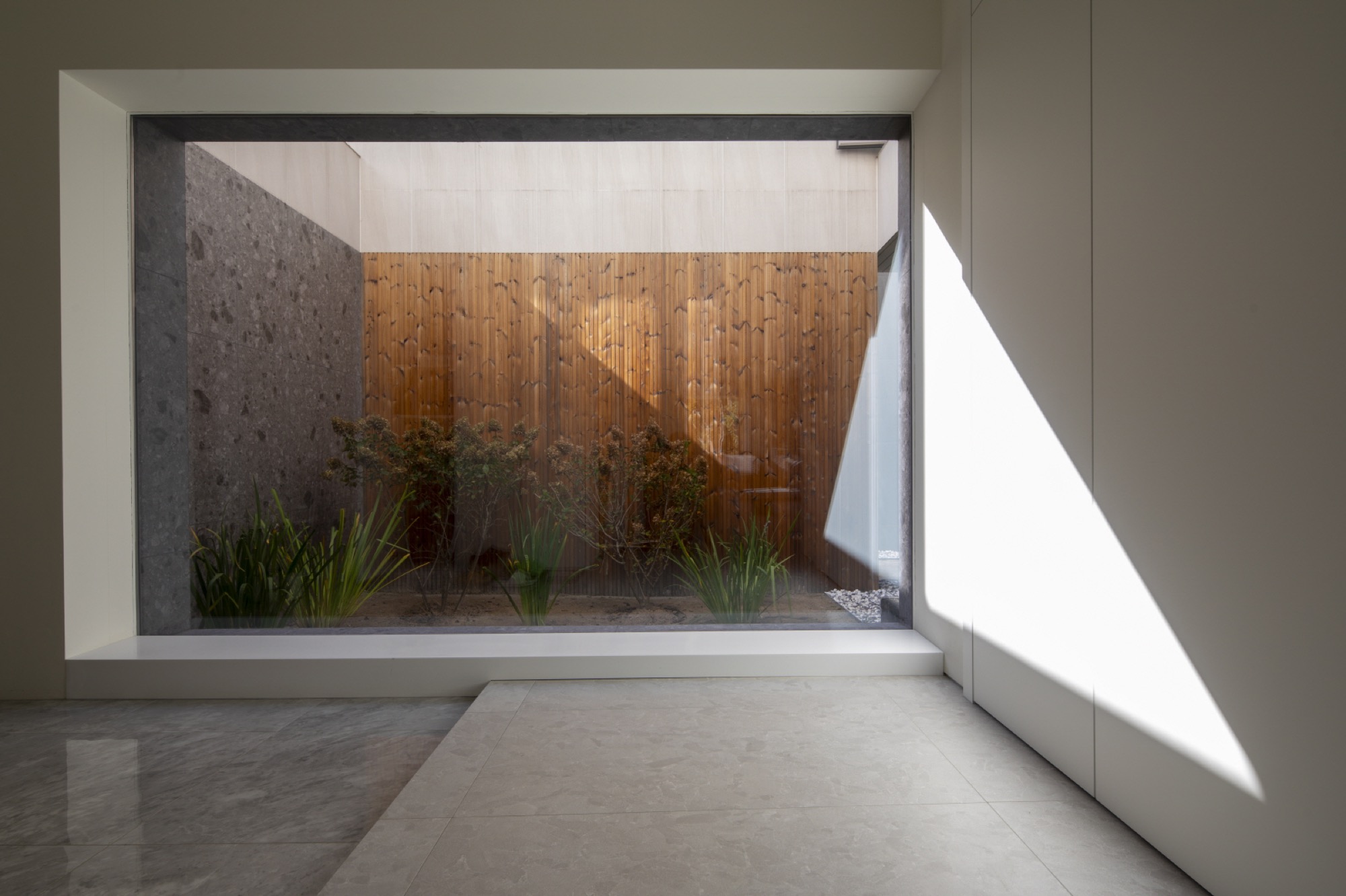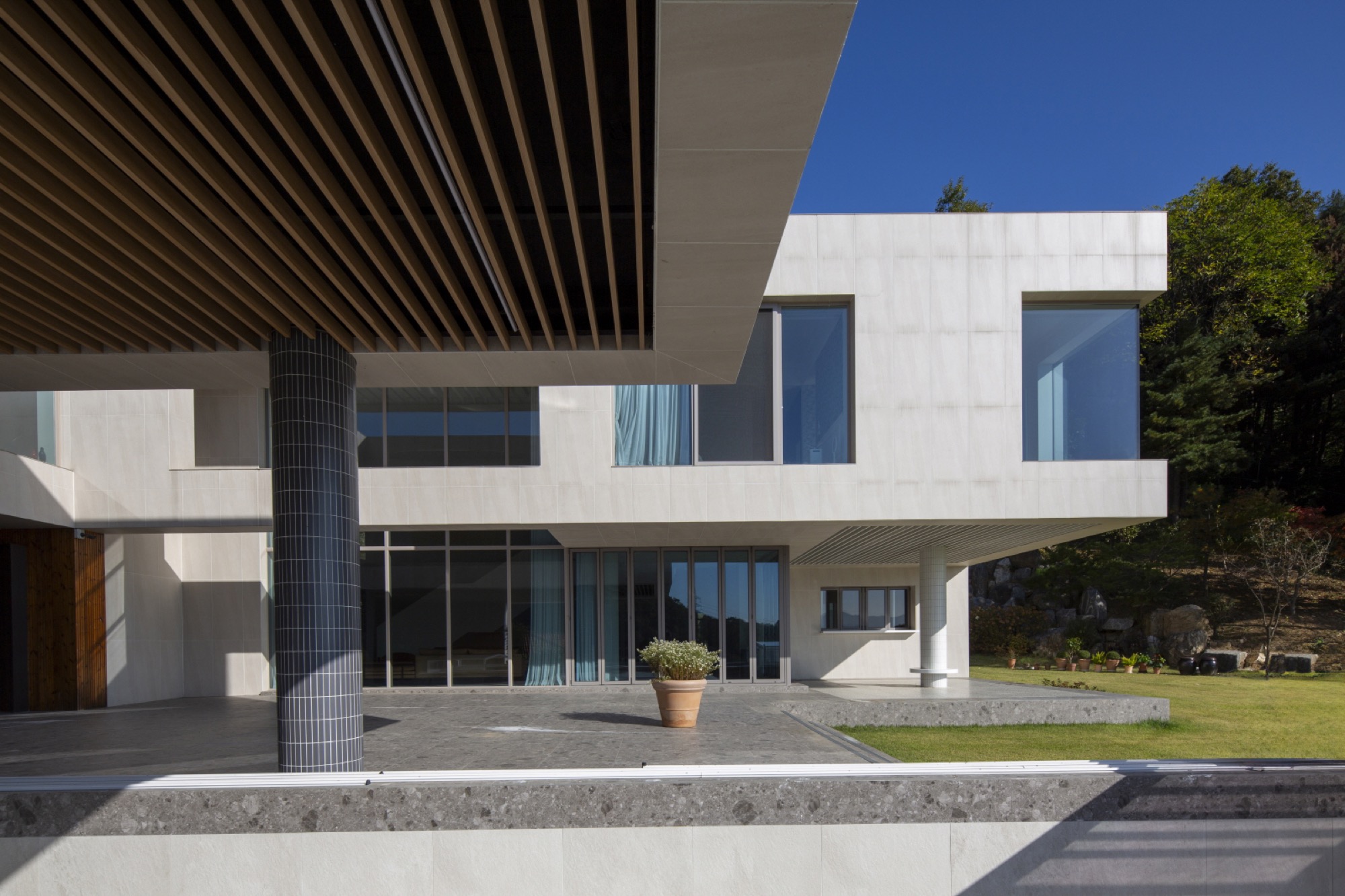 풍경은 주차를 하고, 두 매스 사이 마당을 진입하면서 누리게 된다. 필로티로 된 매스 하부로 야외 수영장과 함께 펼쳐지는 풍경은 진입과 함께 시작된다. 기하학적 매스선과 자연선의 관계적 풍경은 서로의 존재를 드러내고 상호보완적인 긴장감을 준다. 1층 현관과 오디오룸, 2층 운동실에는 가까운 풍경 프레임이 각 방의 용도와 함께 작동한다. 1층 거실과 응접실에서는 제일 중요한 장면이 연출된다. 2개 층 높이의 공간에 펼쳐치는 풍경은 깊은 처마와 사이 마당, 그리고 필로티된 야외수영장 너머 북한강의 모습이 압축되어 한 눈에 들어온다. 폴딩도어의 개방성은 풍경과 일체화되는 경험으로, 시각적 장면 뿐 아니라, 바람과 소리, 빛과 그림자, 무거움과 가벼움, 안정감과 불안감 등의 볼 수 없는 자연적 감성까지 넓어진 개념으로 인식된다. 이처럼 삶의 움직임 속 다양한 거리감의 풍경은 시각적 상품화로 소비되는 것을 넘어, 삶의 자리를 차지하면서 우리가 인식하는 범위를 넓히고 깊어지게 할 것이다.◼︎