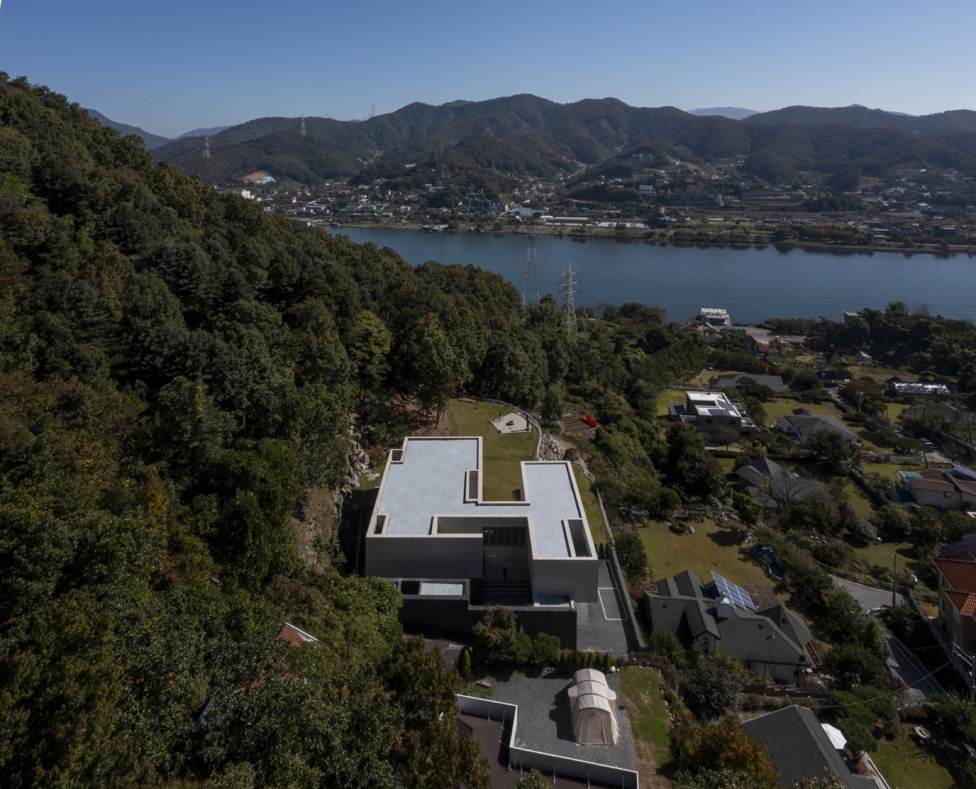 병원 경영을 하는 부부는 일주일 중 4일은 도심에, 3일은 전원에서 생활하는 4도 3촌의 삶을 살고 있었다. 기존에 살던 집을 철거하고 새로 집을 짓고자 했다. 대지는 산자락 중턱에 자리 잡아 북한강이 펼져지는 곳으로 집안 곳곳에서 이 풍경을 누리고 싶어했다. 사업으로 많은 사람이 자주 방문하는 집이기에 손님들과 어울려 자연을 누리는 집을 원했다. 또한, 야외 수영을 즐겨 하기에 꽤 큰 수영장도 계획하길 바랐다.