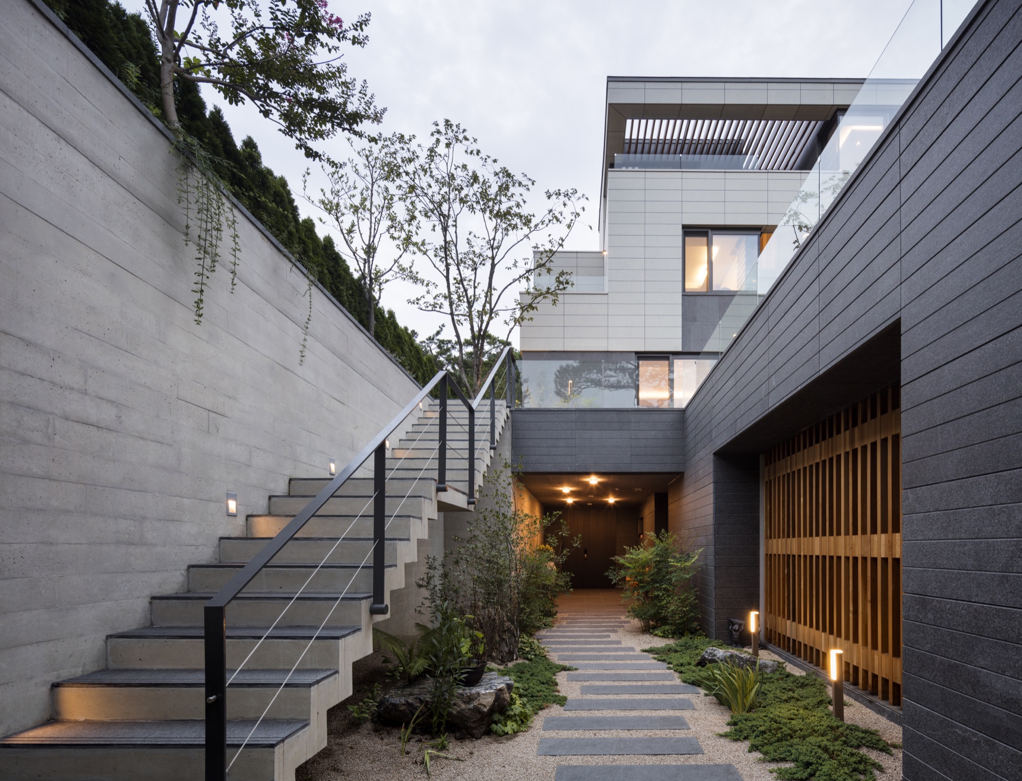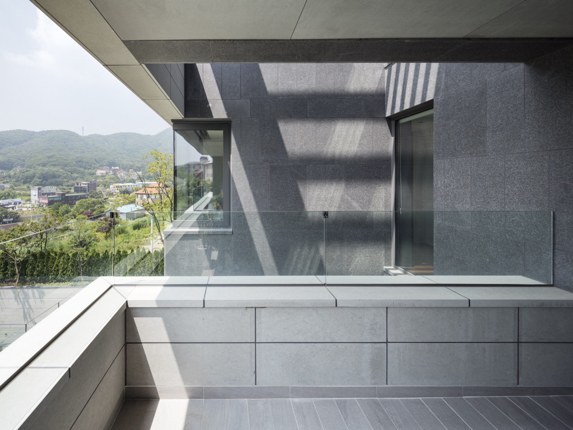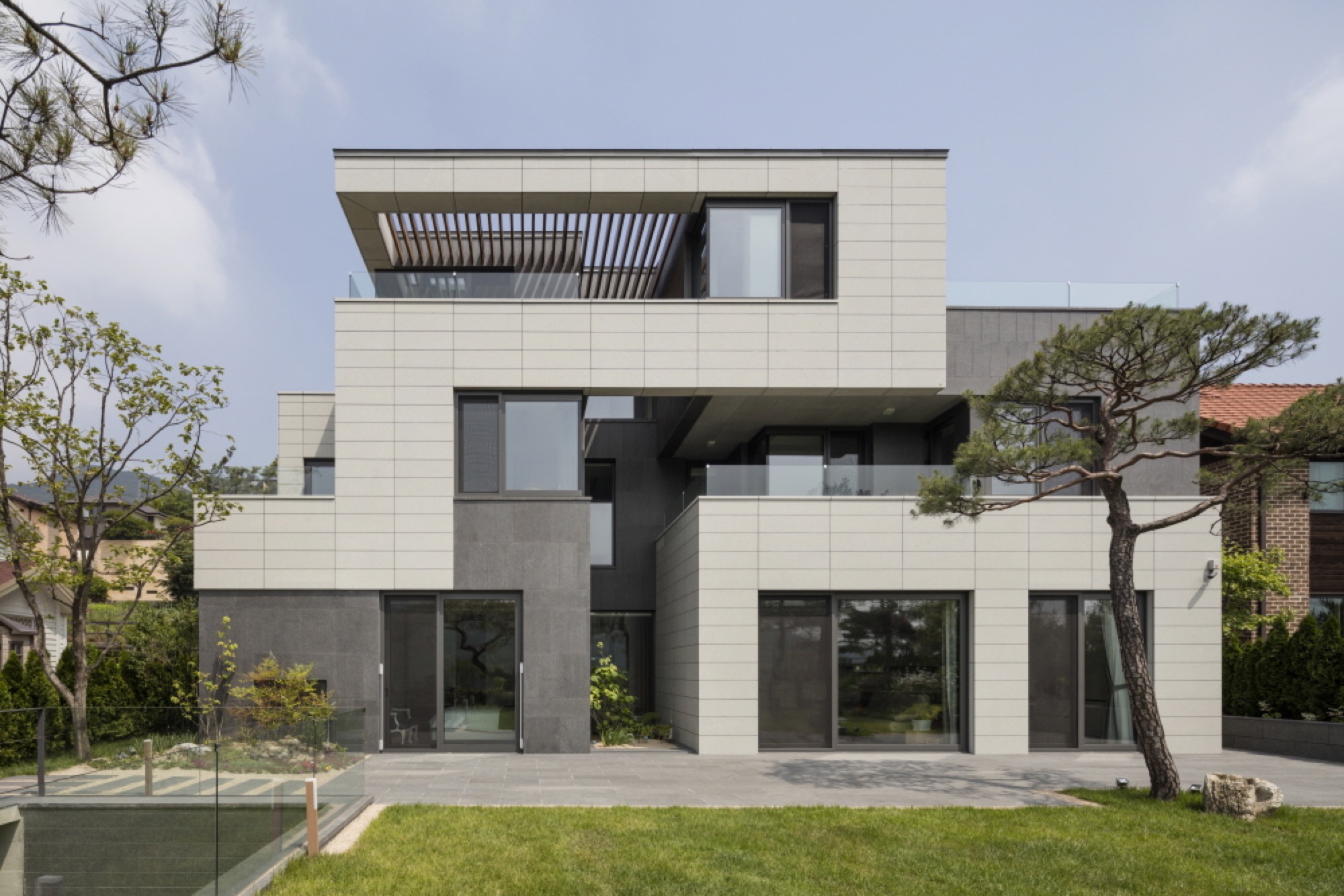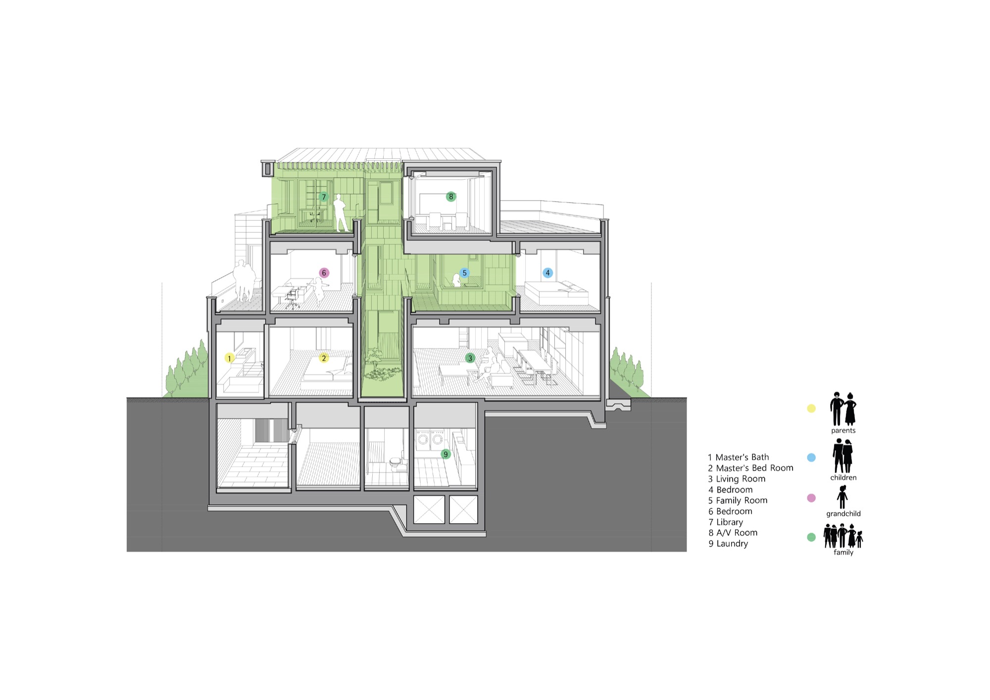주택은 용인 수지의 서쪽에 있는 광교산 근처에 자리했다. 대지는 앞 도로보다 4m 높게 조성되어 남쪽으로 나지막한 산이 펼쳐지고 자연과 소통하는 운치 있는 곳이다. 건폐율 20% 이하라는 자연녹지지역의 법적 한계로 한 층에 쳘지기보다 단면으로 세대가 공유할 수 있는 안을 제시하여 기존 단독주택에서 사용하지 않는 3층으로 계획했다. 1층은 부모를 위한 주거 공간과 가족들이 모일 수 있는 공간을 배치했고, 2층은 출가한 자녀와 유학 간 자녀가 머무를 수 있는 공간을 계획하여 독립 주거가 가능하다. 3층은 라이프스타일에 따라 공유할 수 있는 서재나 AV룸 등의 공간을 계획하여 다양한 삶의 가치를 느끼게 한다. 1층과 3층 사이에 자리한 2층 자녀 공간은 계단을 오르락내리락 하면서 부모와 자녀가 한 번 더 보고 말하며 연결고리를 만든다.