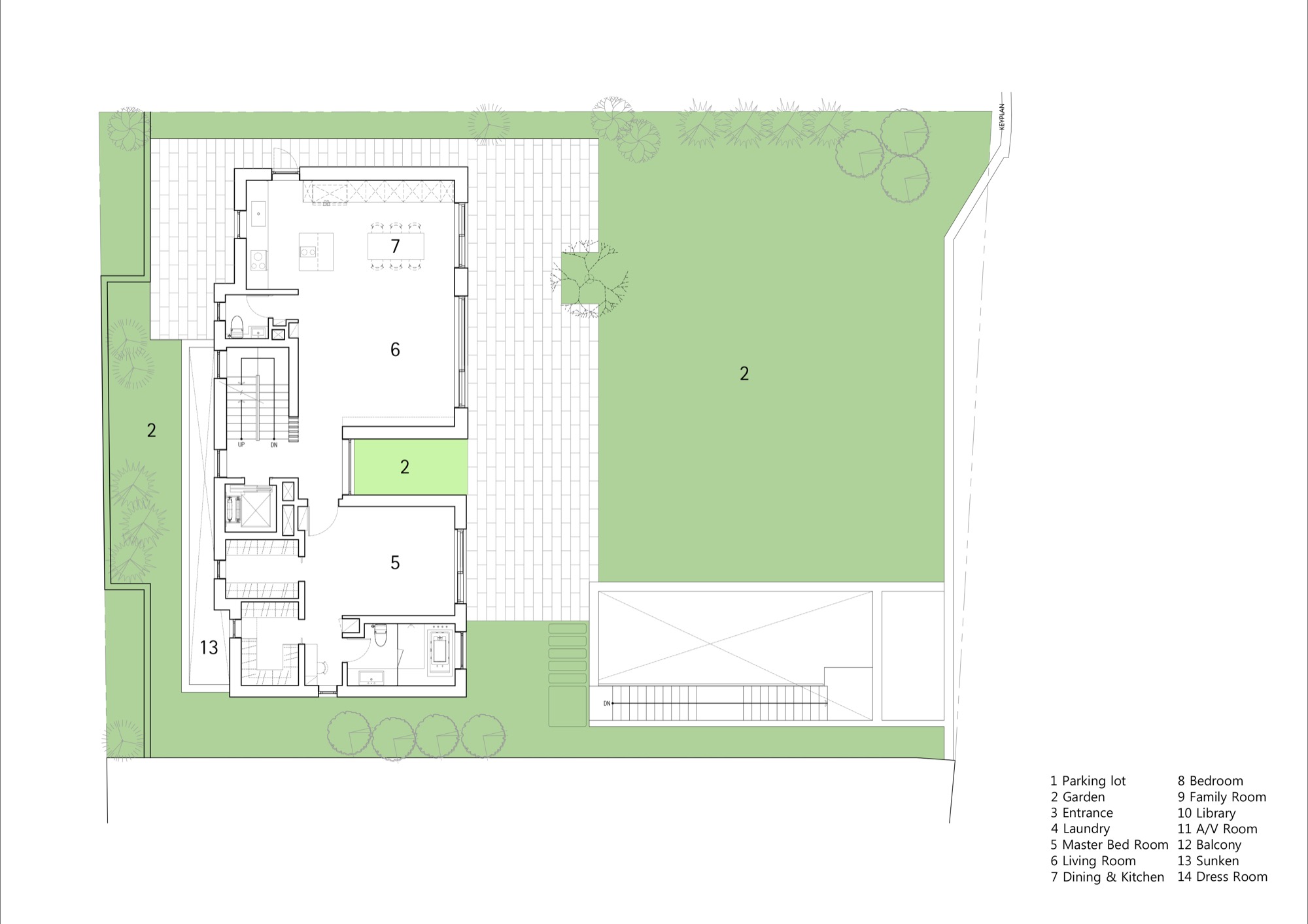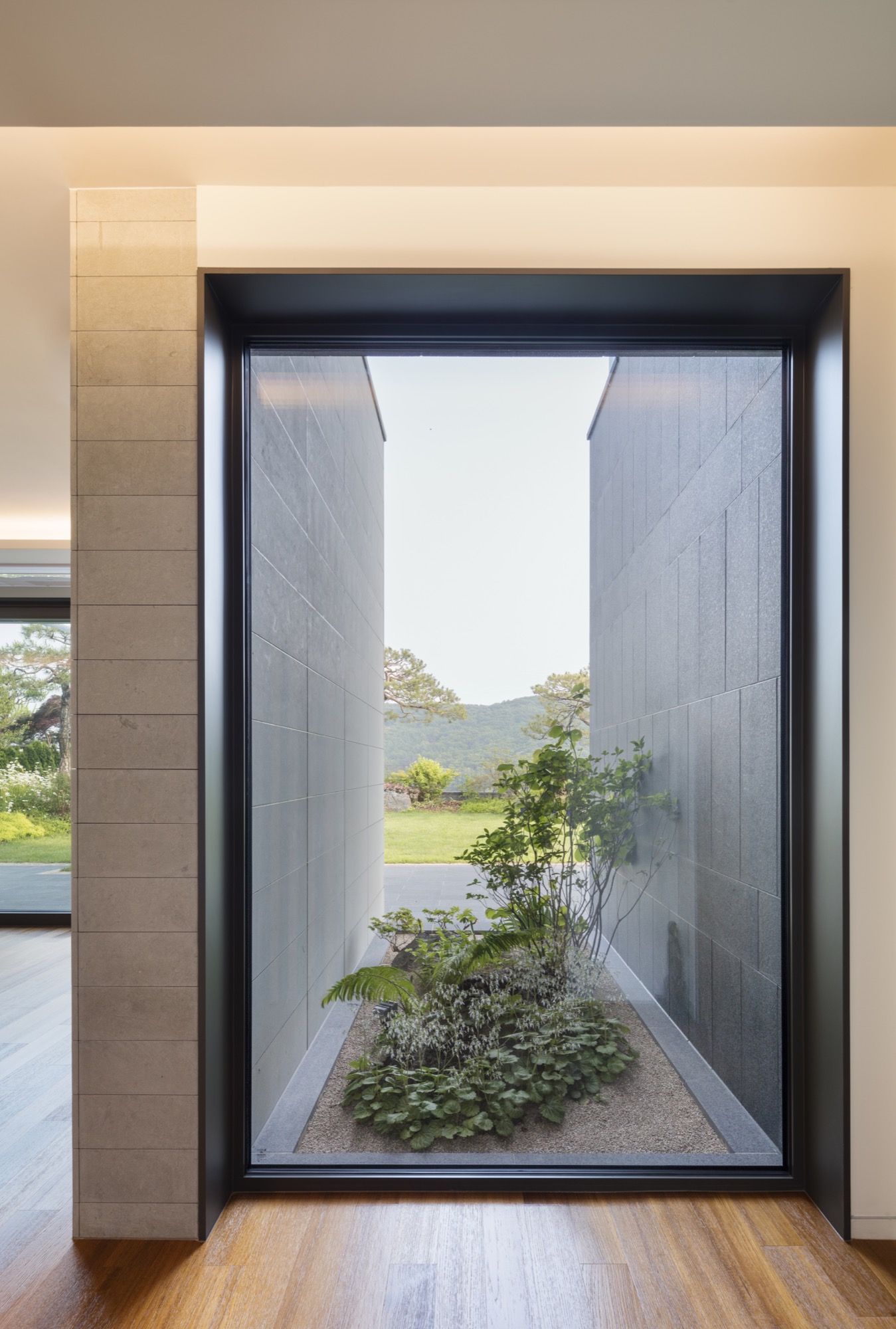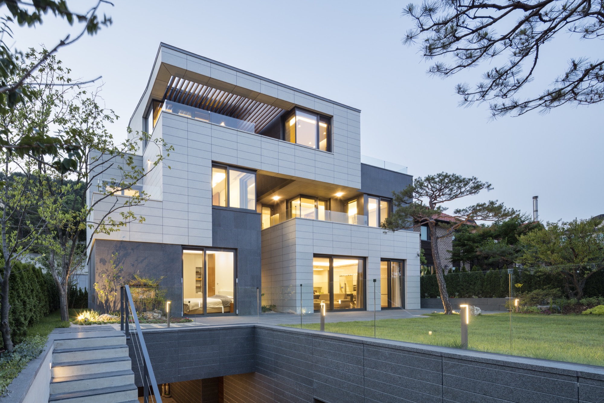 주택은 용인 수지의 서쪽에 있는 광교산 근처에 자리했다. 대지는 앞 도로보다 4m 높게 조성되어 남쪽으로 나지막한 산이 펼쳐지고 자연과 소통하는 운치 있는 곳이다. 건폐율 20% 이하라는 자연녹지지역의 법적 한계로 한 층에 쳘지기보다 단면으로 세대가 공유할 수 있는 안을 제시하여 기존 단독주택에서 사용하지 않는 3층으로 계획했다. 1층은 부모를 위한 주거 공간과 가족들이 모일 수 있는 공간을 배치했고, 2층은 출가한 자녀와 유학 간 자녀가 머무를 수 있는 공간을 계획하여 독립 주거가 가능하다. 3층은 라이프스타일에 따라 공유할 수 있는 서재나 AV룸 등의 공간을 계획하여 다양한 삶의 가치를 느끼게 한다. 1층과 3층 사이에 자리한 2층 자녀 공간은 계단을 오르락내리락 하면서 부모와 자녀가 한 번 더 보고 말하며 연결고리를 만든다.