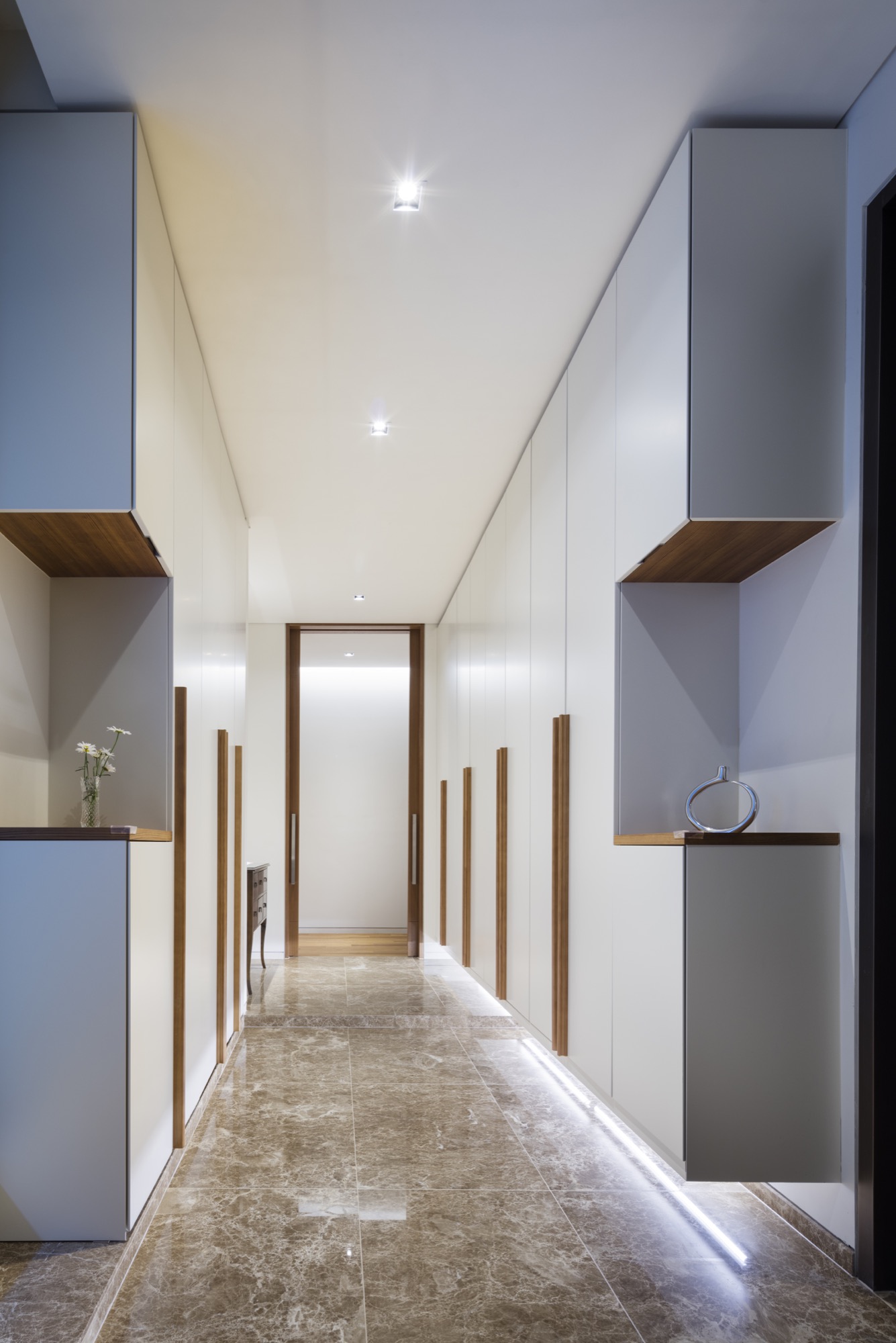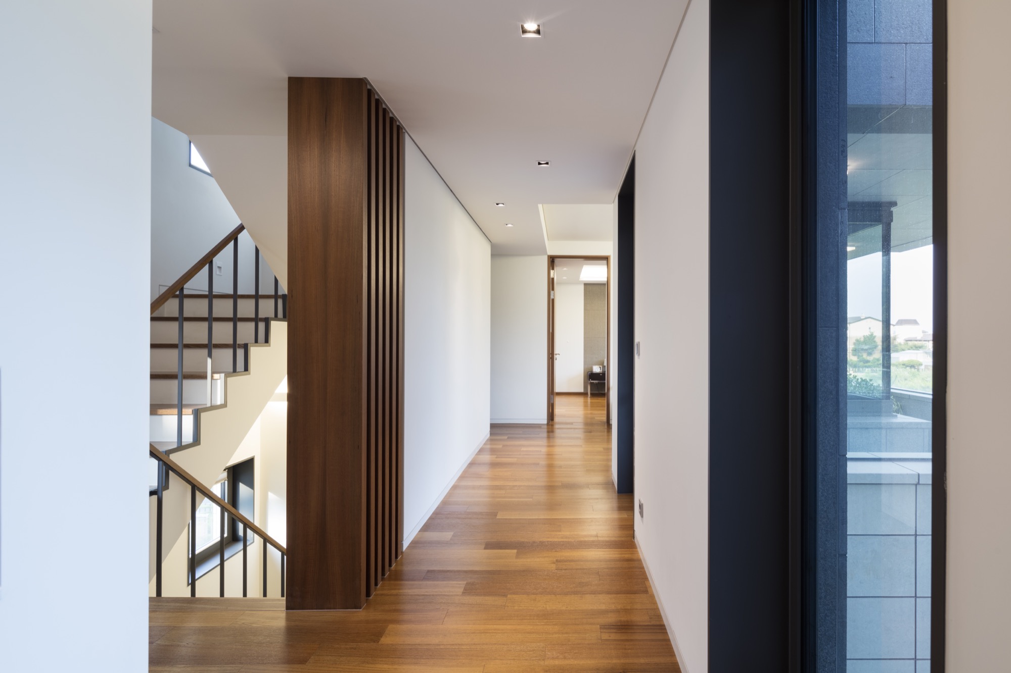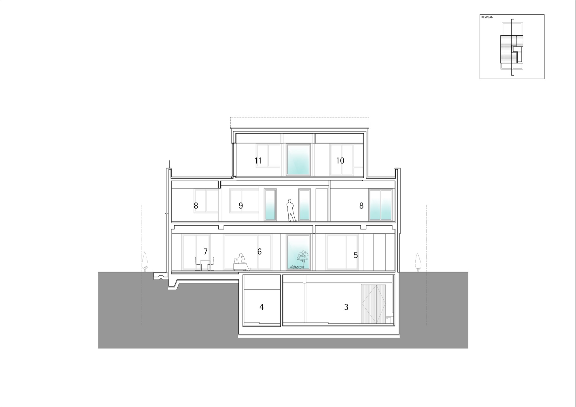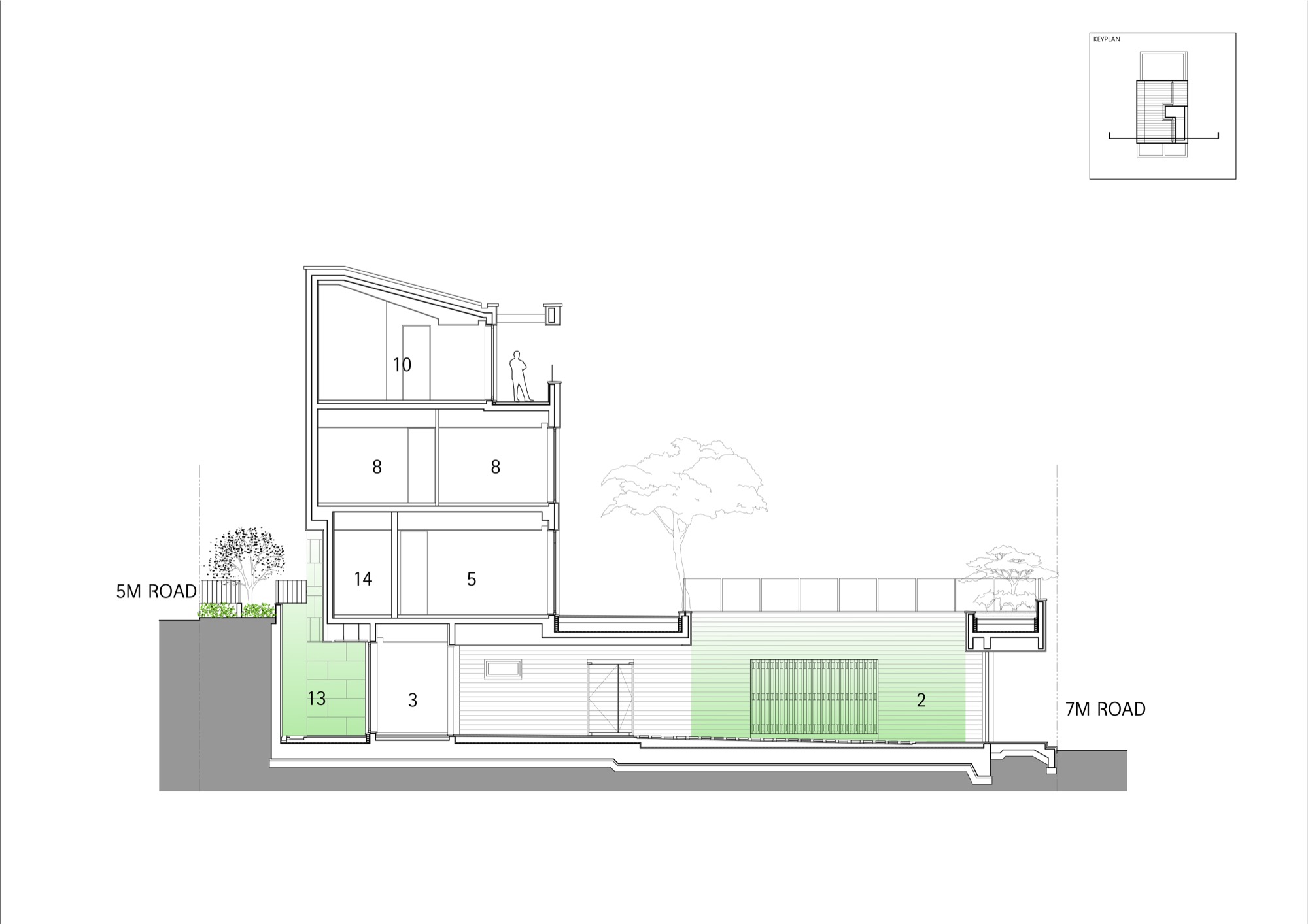 주택은 용인 수지의 서쪽에 있는 광교산 근처에 자리했다. 대지는 앞 도로보다 4m 높게 조성되어 남쪽으로 나지막한 산이 펼쳐지고 자연과 소통하는 운치 있는 곳이다. 건폐율 20% 이하라는 자연녹지지역의 법적 한계로 한 층에 쳘지기보다 단면으로 세대가 공유할 수 있는 안을 제시하여 기존 단독주택에서 사용하지 않는 3층으로 계획했다. 1층은 부모를 위한 주거 공간과 가족들이 모일 수 있는 공간을 배치했고, 2층은 출가한 자녀와 유학 간 자녀가 머무를 수 있는 공간을 계획하여 독립 주거가 가능하다. 3층은 라이프스타일에 따라 공유할 수 있는 서재나 AV룸 등의 공간을 계획하여 다양한 삶의 가치를 느끼게 한다. 1층과 3층 사이에 자리한 2층 자녀 공간은 계단을 오르락내리락 하면서 부모와 자녀가 한 번 더 보고 말하며 연결고리를 만든다.
