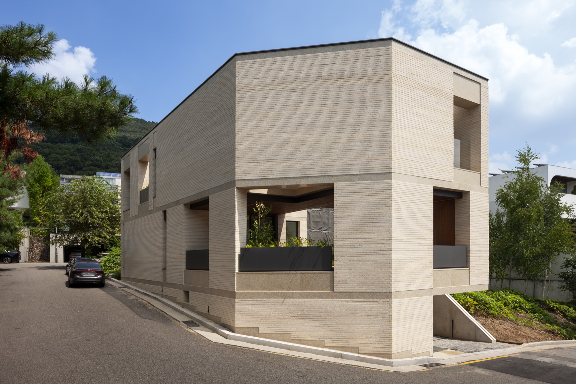 포치에서 시작된 보이드는 건축물 전체를 관통하고 발산하여 도시와 소통한다. 안마당을 품은 중정형 주택의 성격을 가지면서도 내부화된 외부공간으로 건축은 형태를 잃는다. 형태로 구속되지 않는 공간들은 도시와 만난다. 이는 곧 개방감이자 아늑한 마당이고 미시적인 도시의 시퀀스다. 줄눈이라 불리는 입면의 패턴을 없앤 탓에 돌의 질감만 남겨진 외벽과 그 무거움을 한층 누그러뜨리는 보이드가 만나, 주변 주거지의 단절된 풍경 속에서 먼저 말을 건네는 집이 되기를 바란다.◼︎