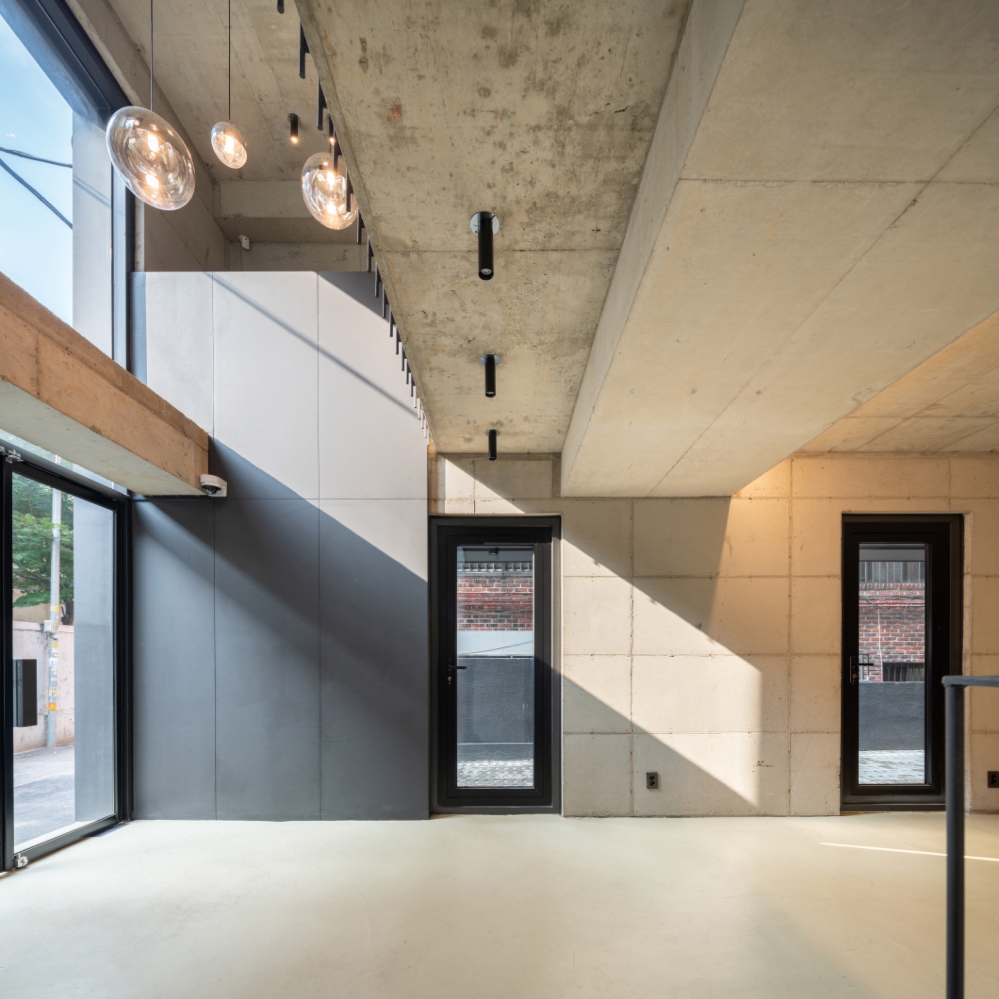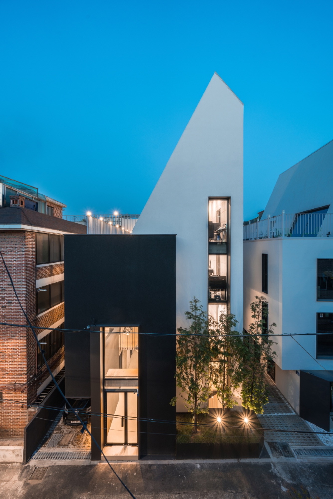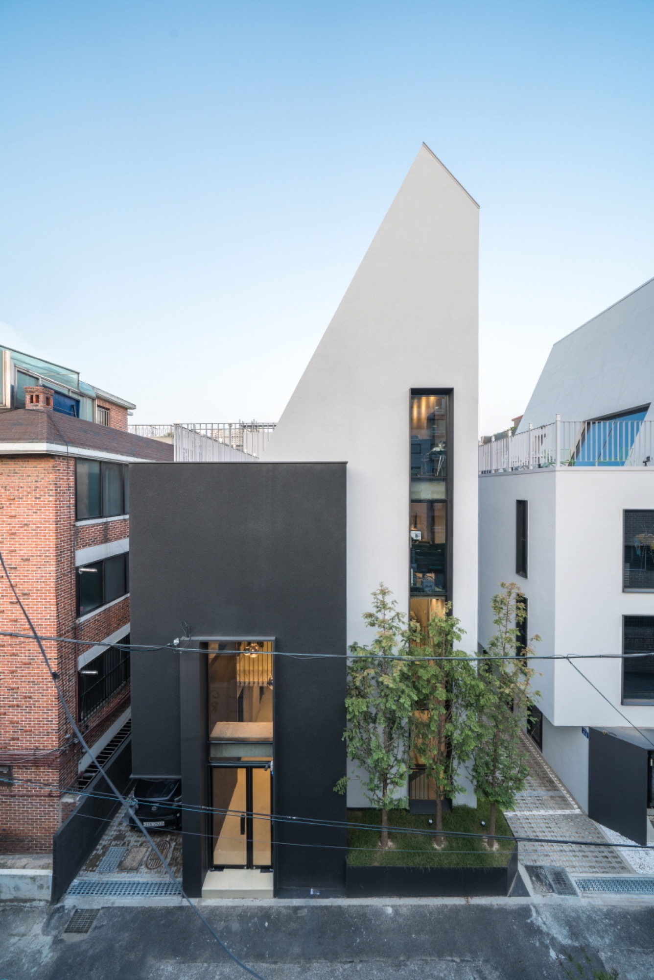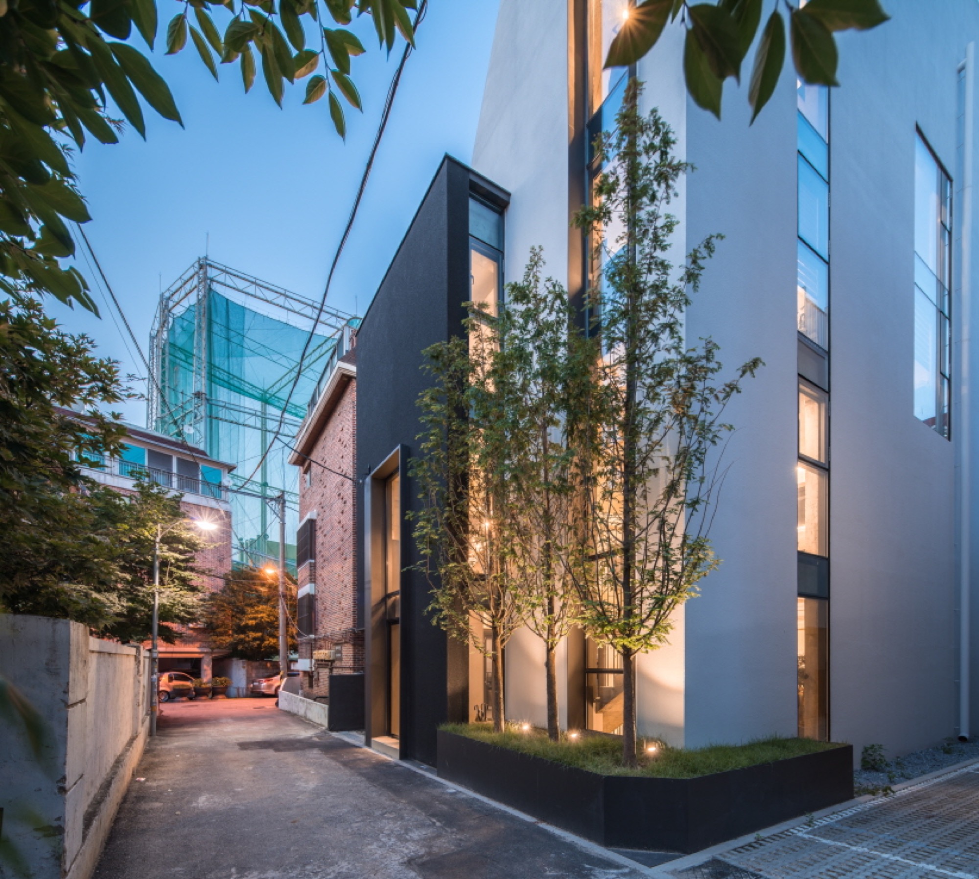 일조 사선의 제약으로 인해 건축물은 사선의 벽이 필연적일 수밖에 없고, 그러한 형태로서의 군집은 주변의 땅에도 동일하게 주어질 컨디션일 것이다. 군집의 힘은 강하지만 다소 획일화된 골목 풍경을 유발할 수밖에 없다는 한계는 나무와 풀과 같은 자연 요소를 적극적으로 드러내는 것으로서 자연스럽게 건축물 안에서도 삭막한 옆 건축물의 벽면이 아닌 푸르른 나뭇잎이 함께 하게 했다.