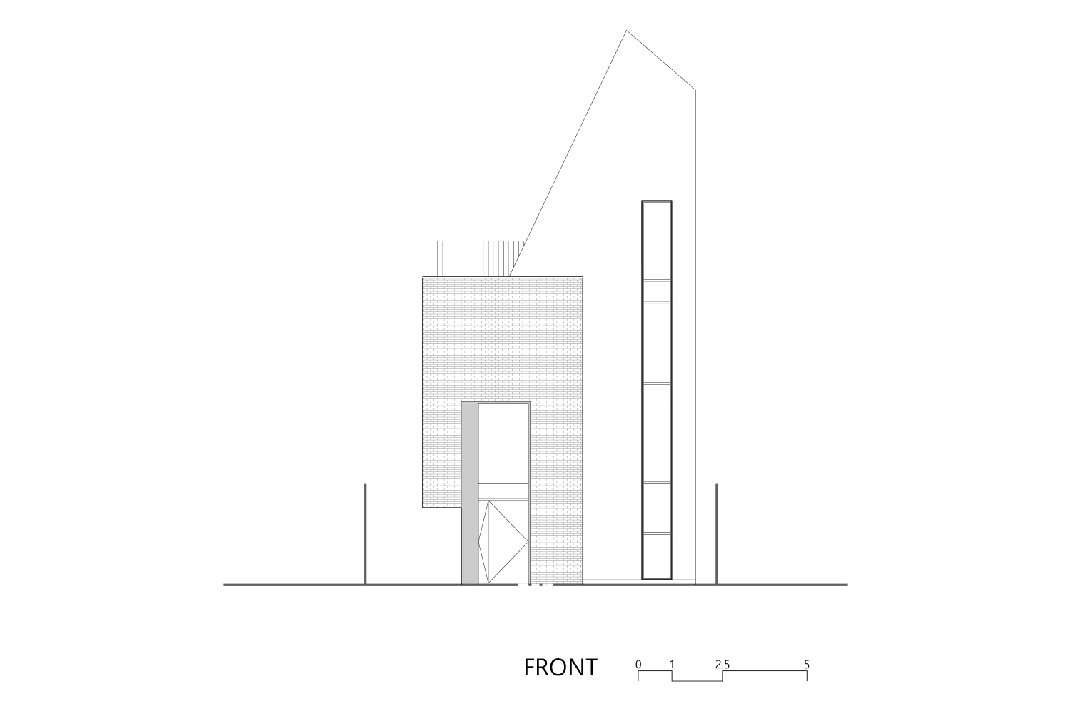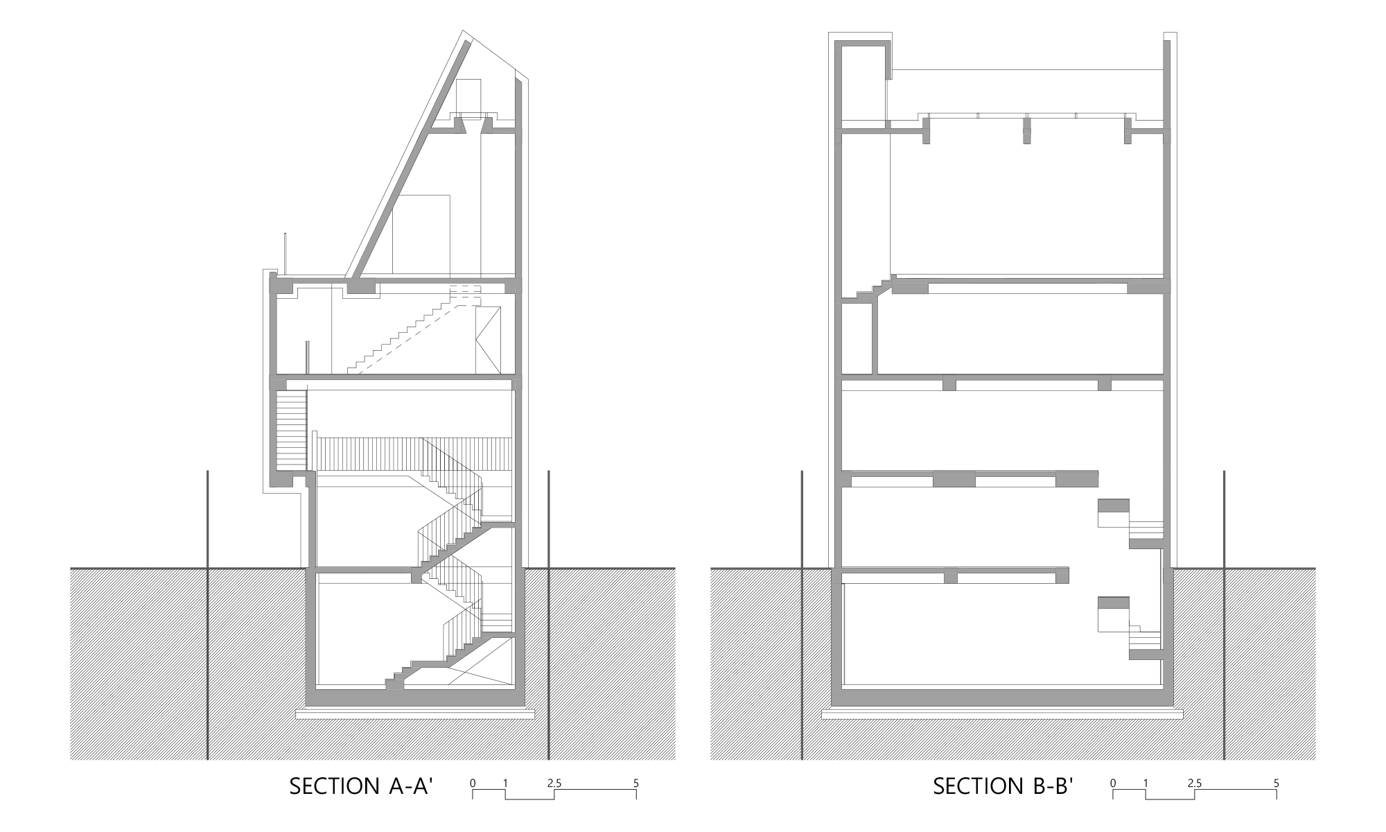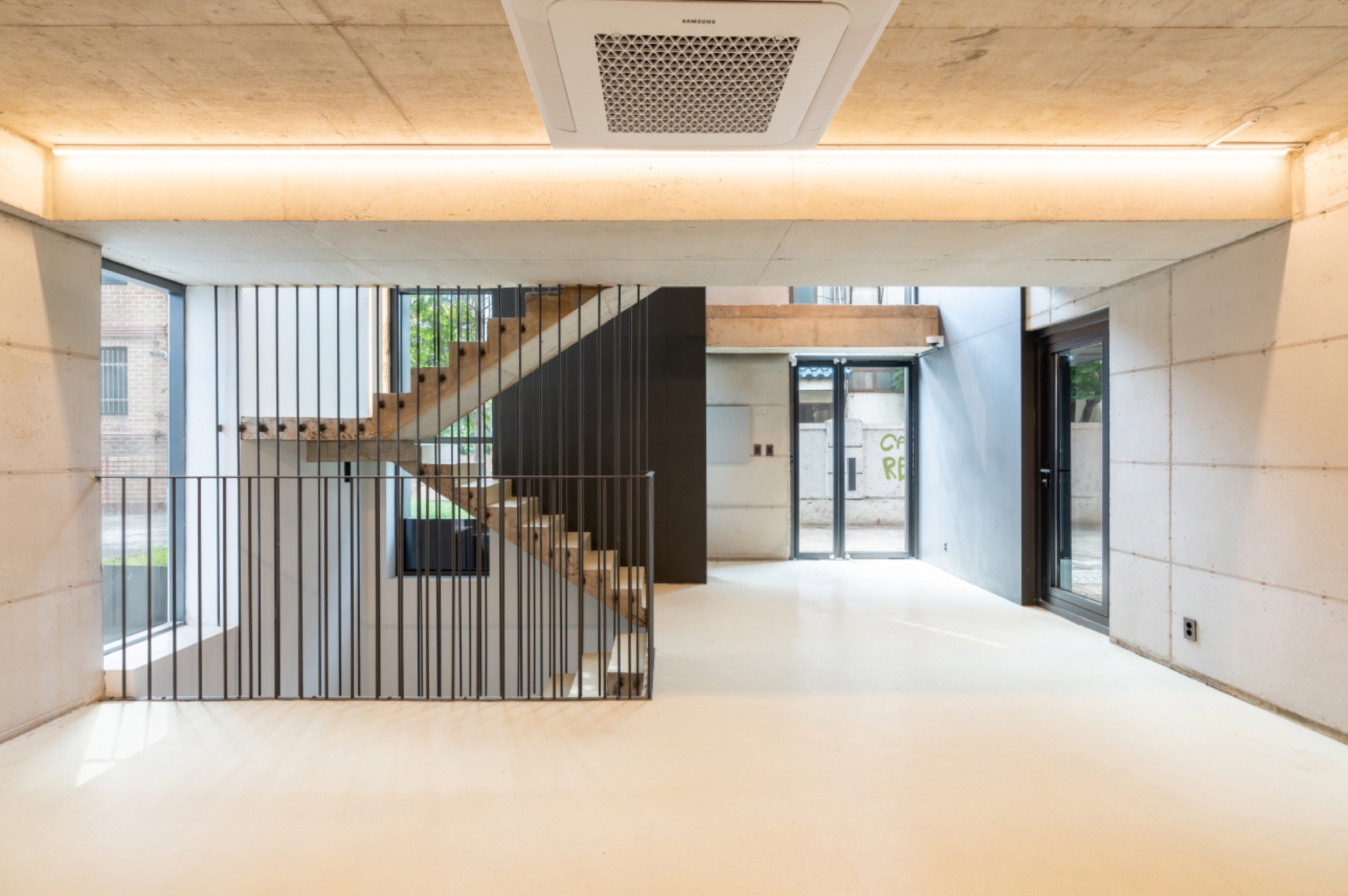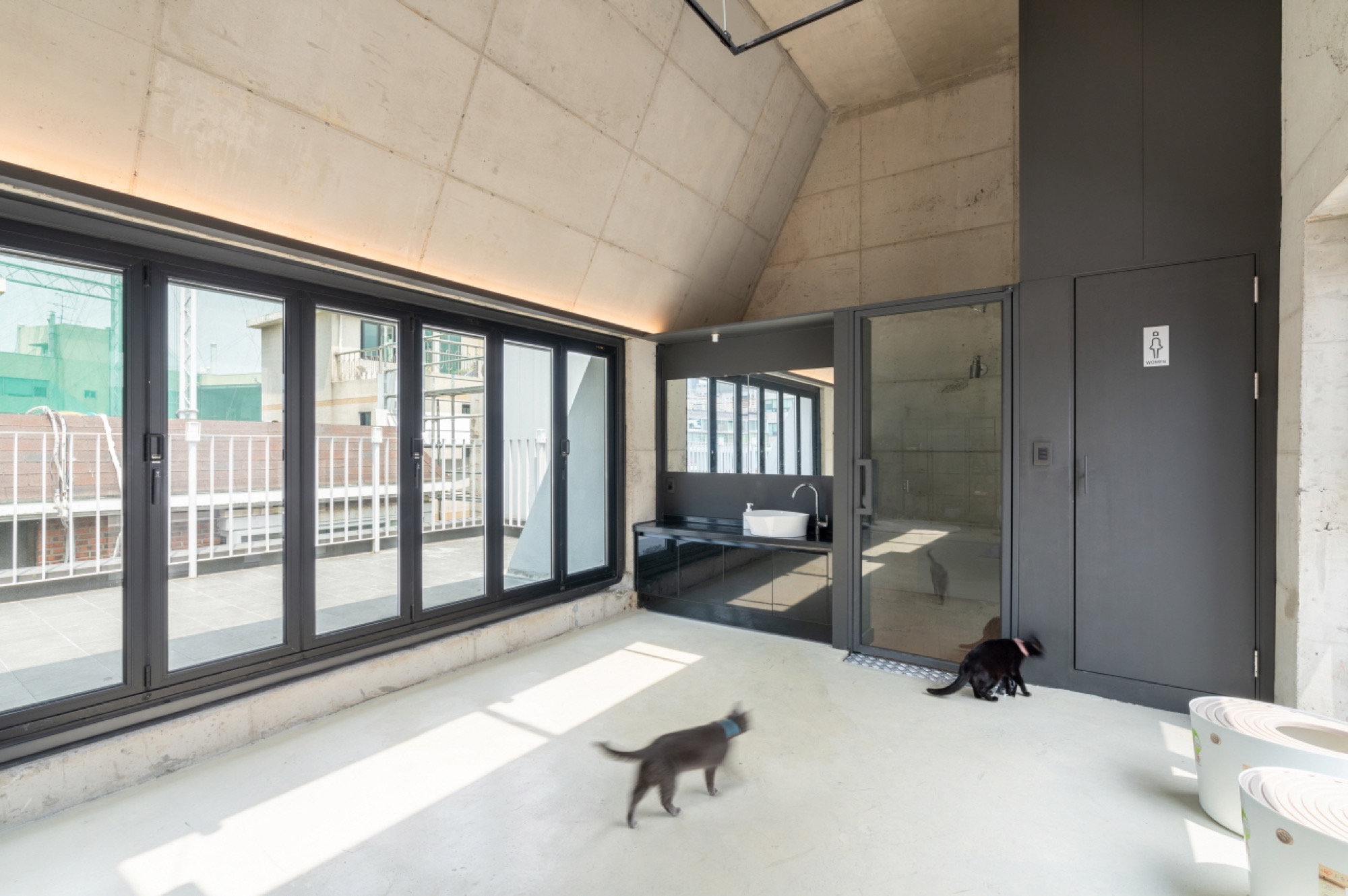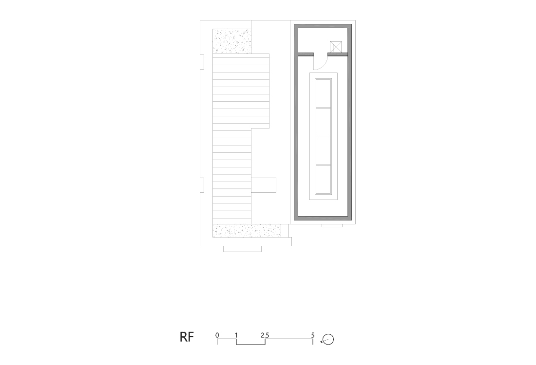 일조 사선의 제약으로 인해 건축물은 사선의 벽이 필연적일 수밖에 없고, 그러한 형태로서의 군집은 주변의 땅에도 동일하게 주어질 컨디션일 것이다. 군집의 힘은 강하지만 다소 획일화된 골목 풍경을 유발할 수밖에 없다는 한계는 나무와 풀과 같은 자연 요소를 적극적으로 드러내는 것으로서 자연스럽게 건축물 안에서도 삭막한 옆 건축물의 벽면이 아닌 푸르른 나뭇잎이 함께 하게 했다.