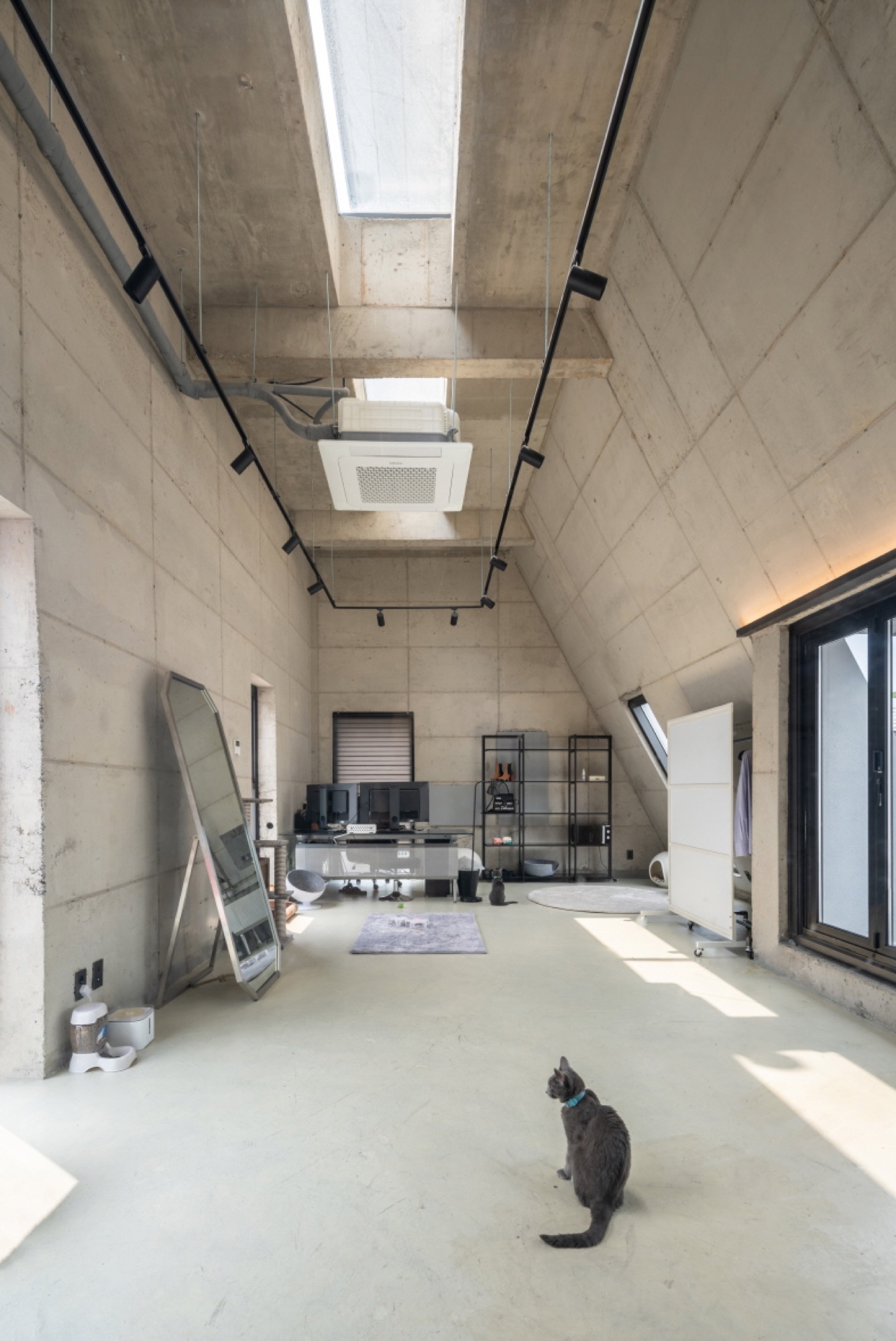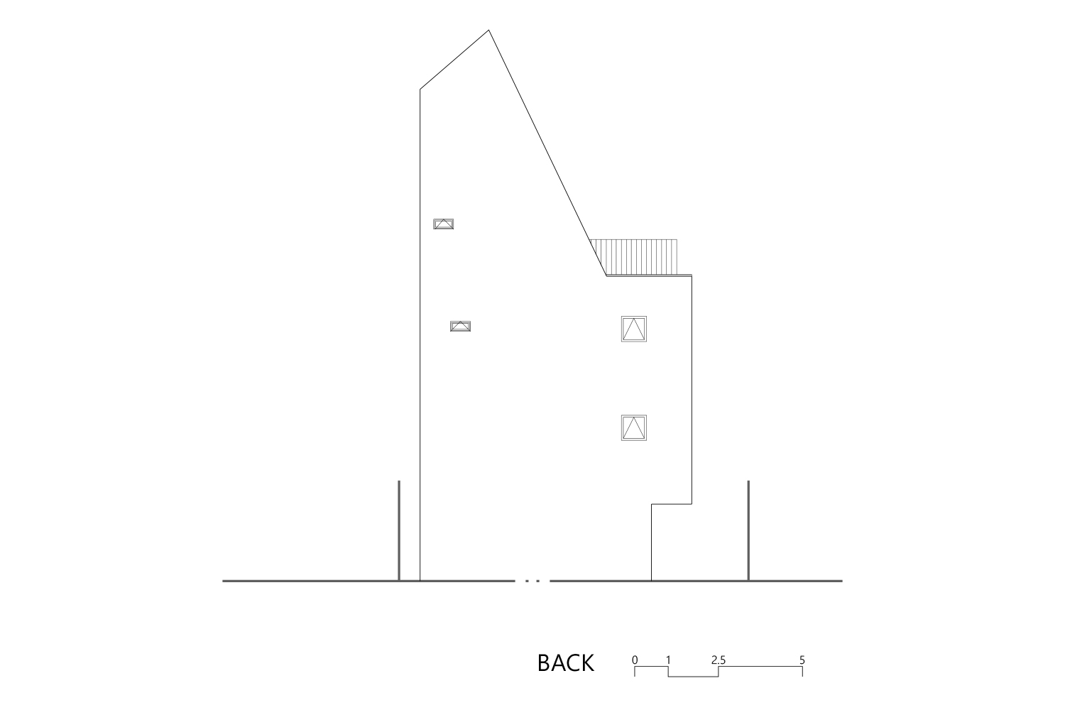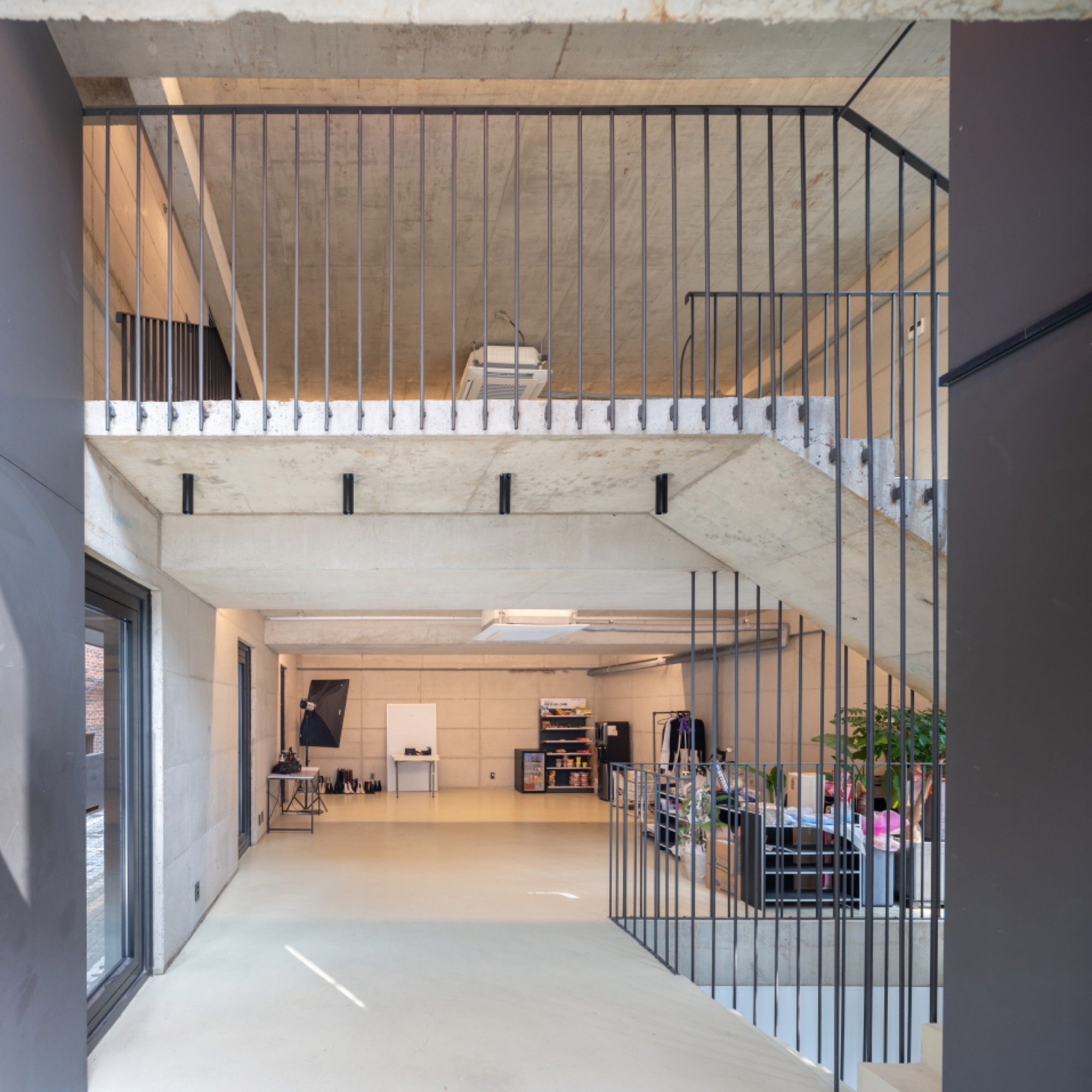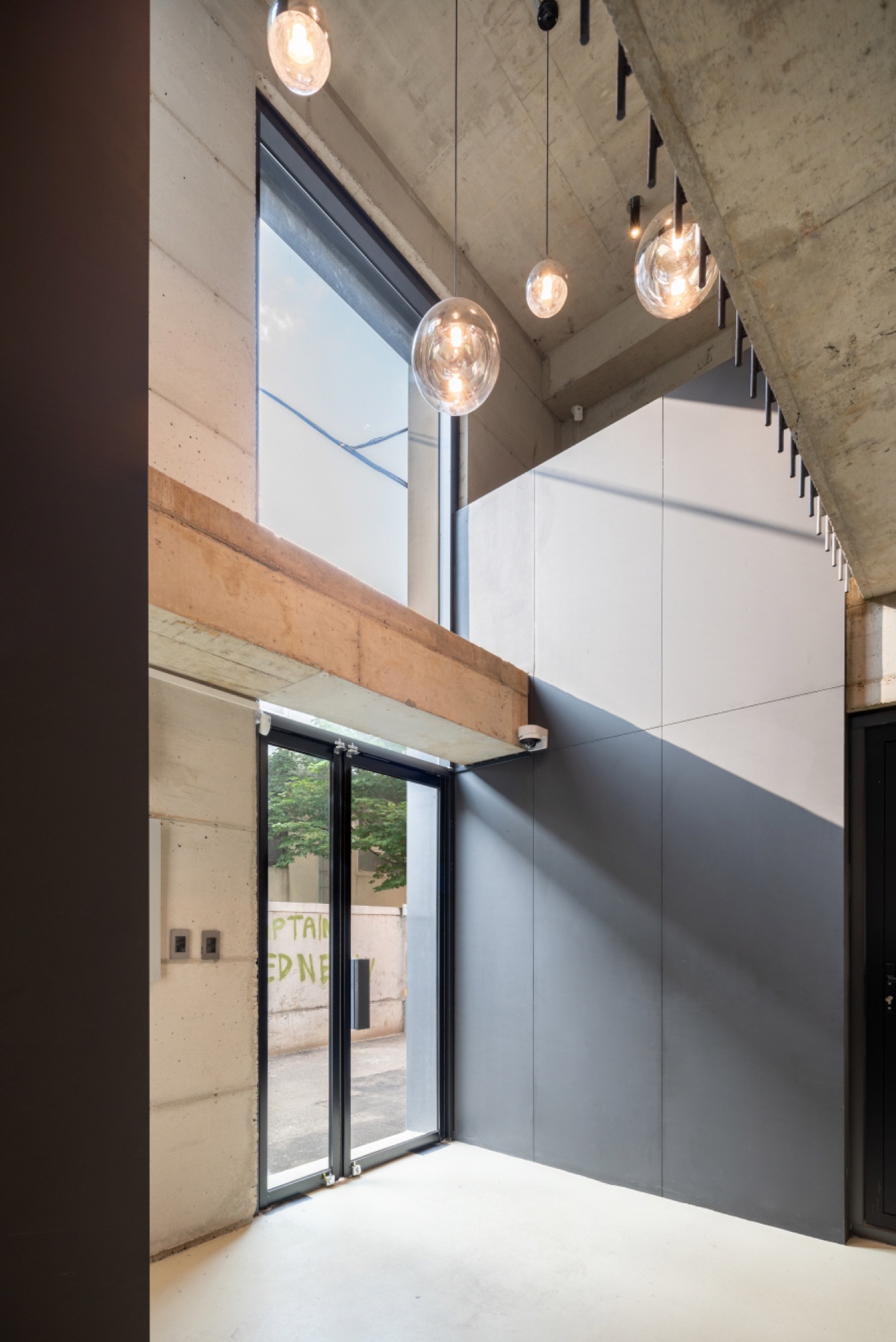 일조 사선의 제약으로 인해 건축물은 사선의 벽이 필연적일 수밖에 없고, 그러한 형태로서의 군집은 주변의 땅에도 동일하게 주어질 컨디션일 것이다. 군집의 힘은 강하지만 다소 획일화된 골목 풍경을 유발할 수밖에 없다는 한계는 나무와 풀과 같은 자연 요소를 적극적으로 드러내는 것으로서 자연스럽게 건축물 안에서도 삭막한 옆 건축물의 벽면이 아닌 푸르른 나뭇잎이 함께 하게 했다.