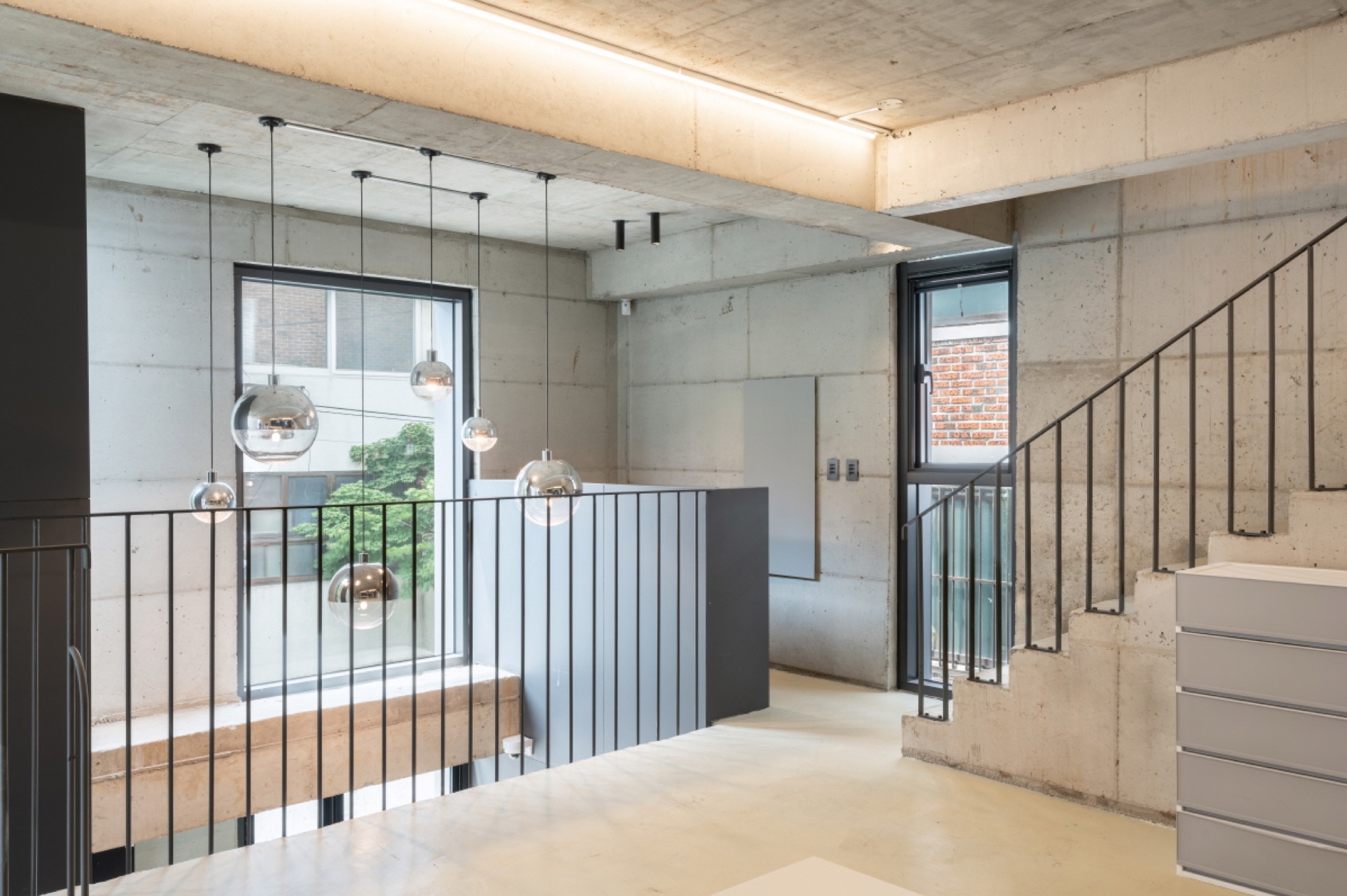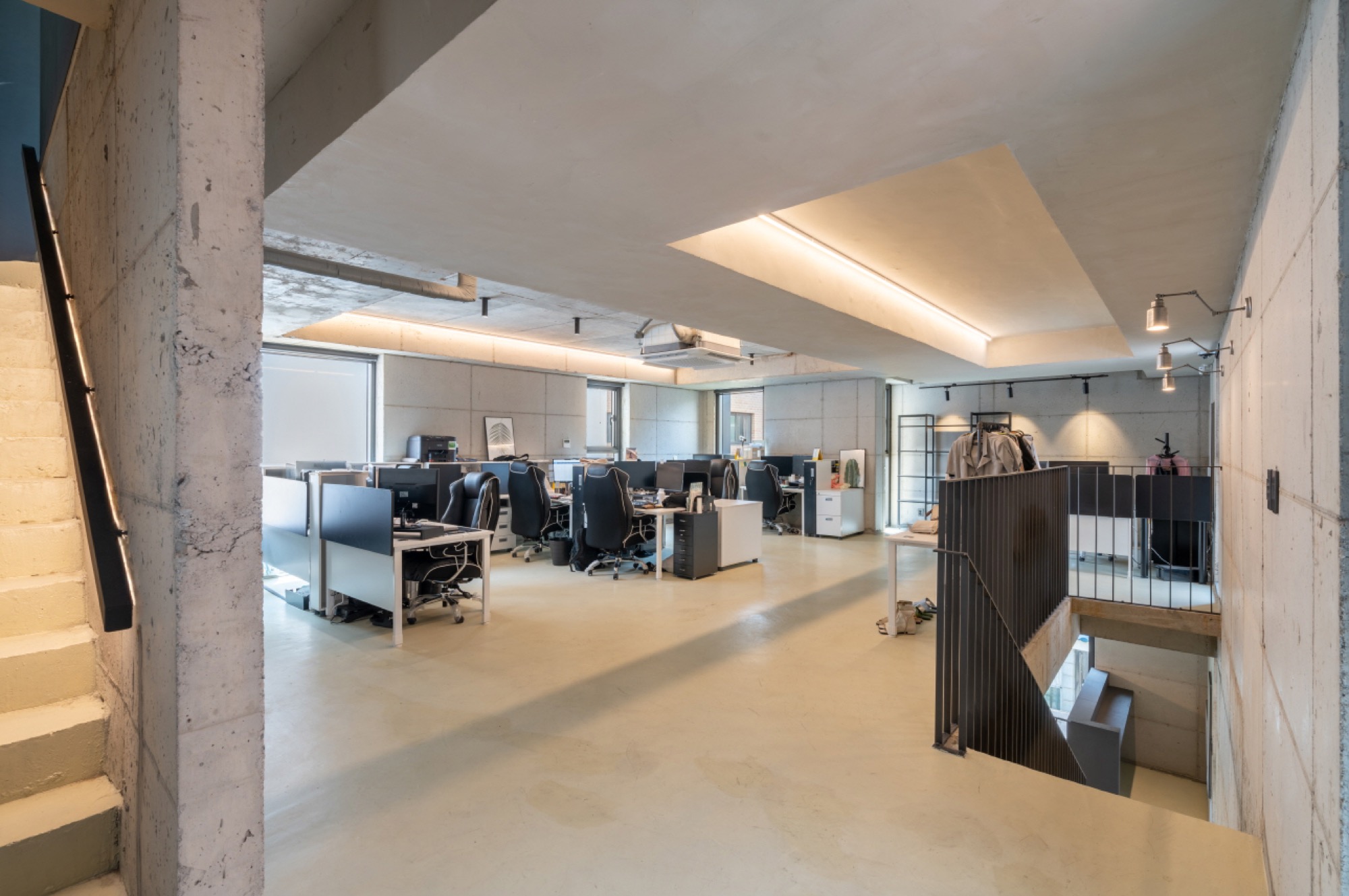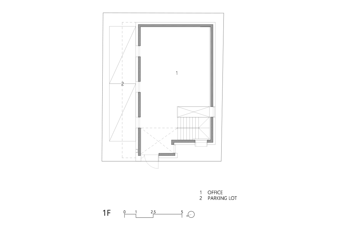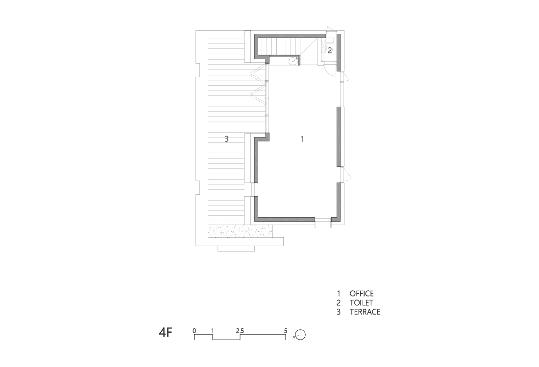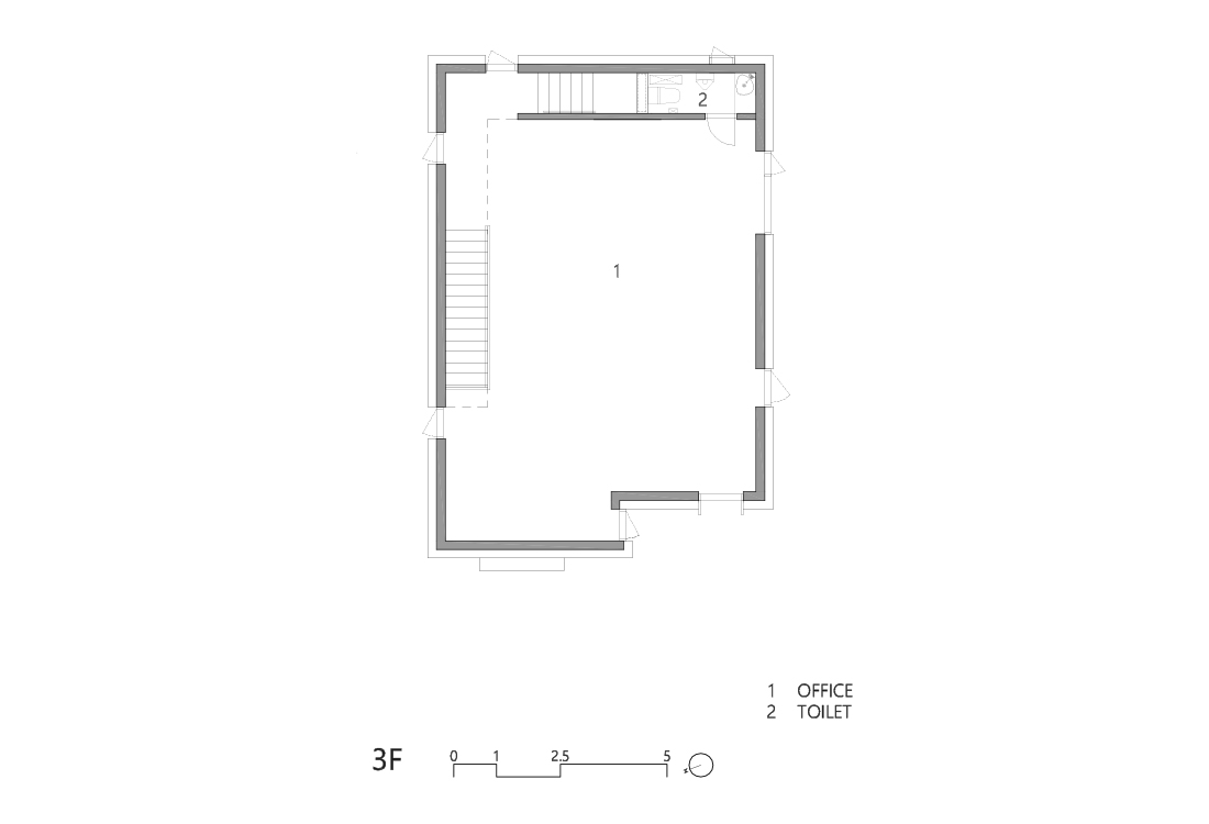 숲속 오솔길을 걷듯 5개 층을 아우르는 동선을 자유롭게 배치했다. 좁은 공간을 극복하기 위한 시선을 획일화되지 않게 하는 방법이었고, 동선의 흐름이 유연하게 되어 창의적이며 효율적인 업무 환경을 마련할 수 있도록 함과 동시에 각 층 소통의 장점을 극대화하고자 하였다.