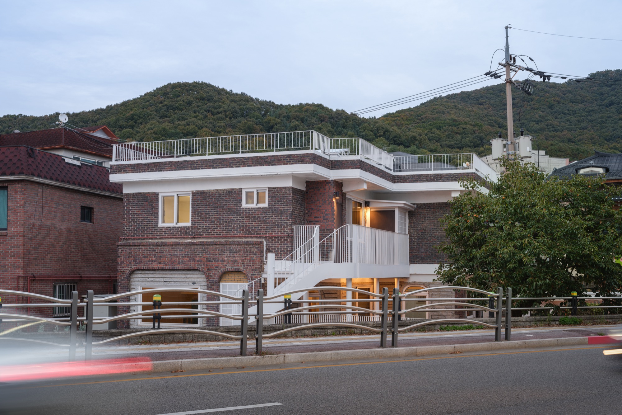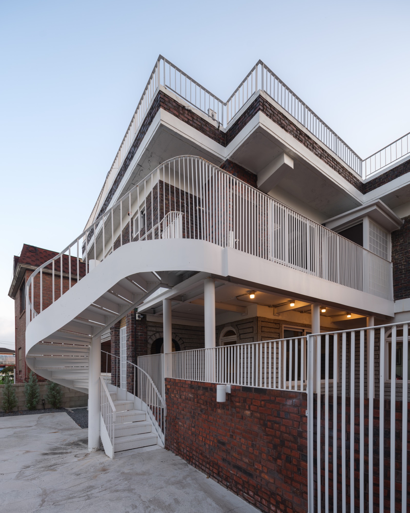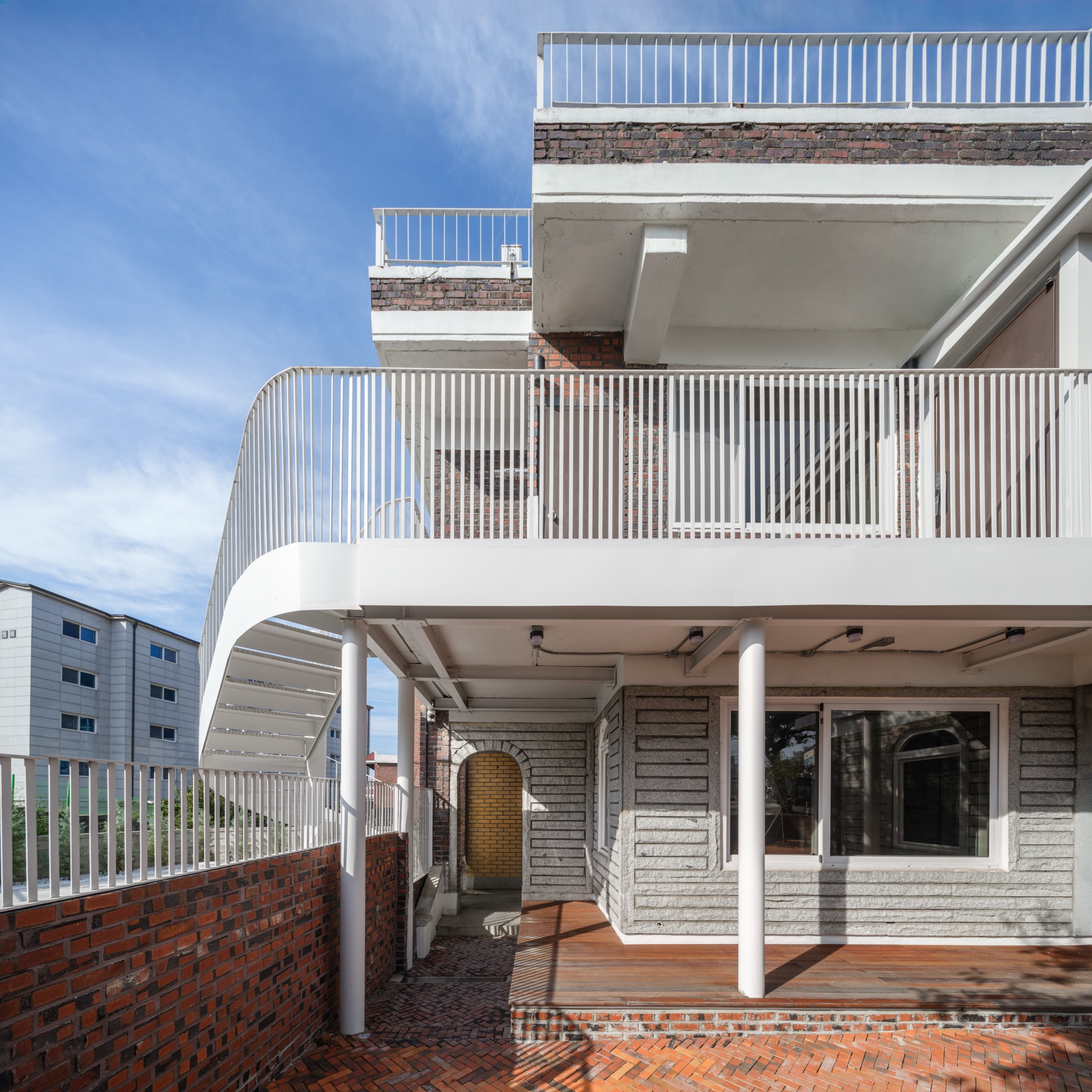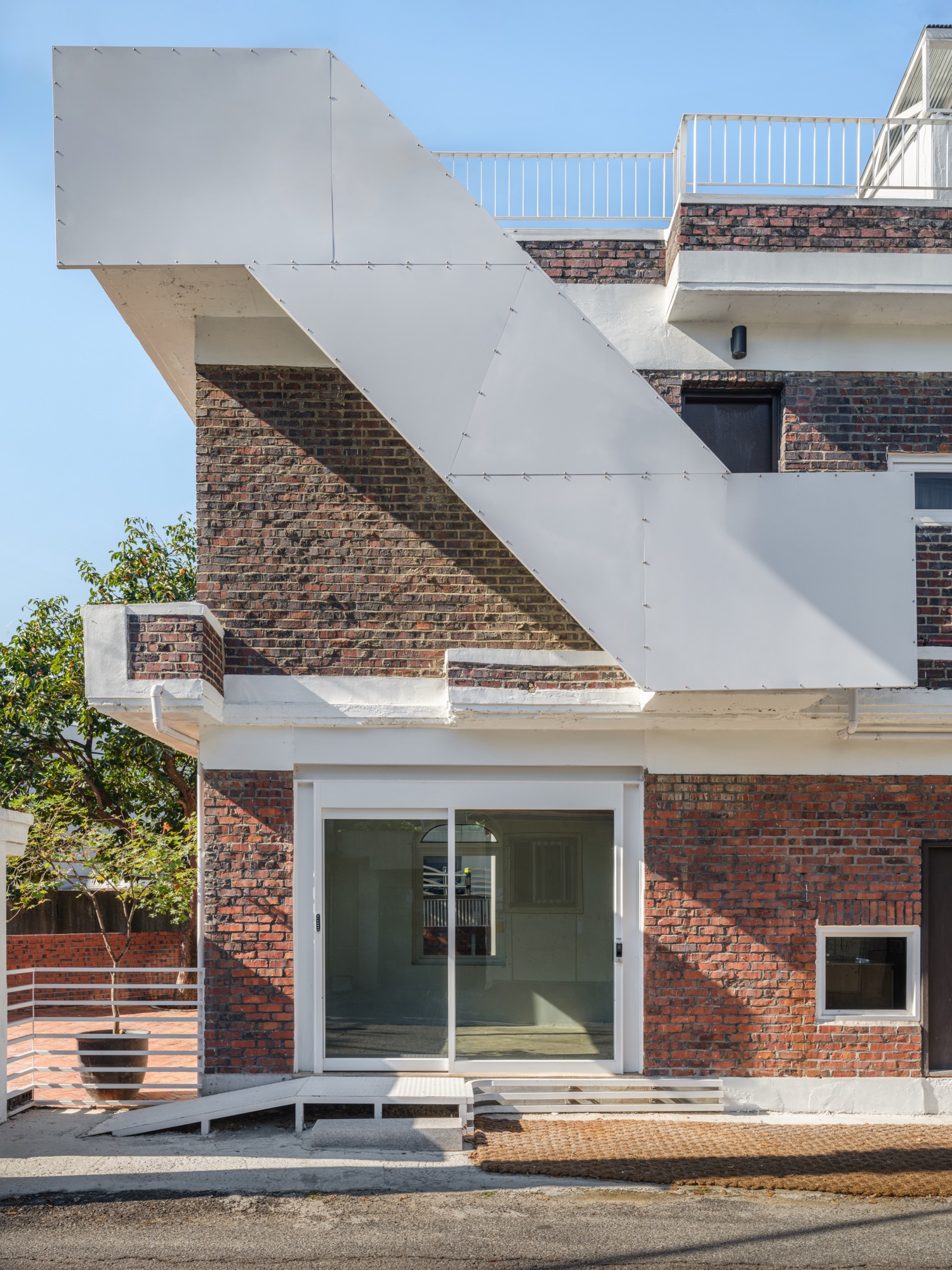기존의 대문에서 바로 이어지던 계단은 철거하고, 낮은 담장으로 구분된 1층과 2층 마당의 경계 가까이 계단을 설치하여 시각적 연속성과 기능적 분리를 동시에 구현했다. 증축된 금속 계단을 지지하는 기둥은 기존 연와조 구조를 보강하는 동시에 계단 아래의 테라스에 자연스러운 그늘을 형성하고 있다.