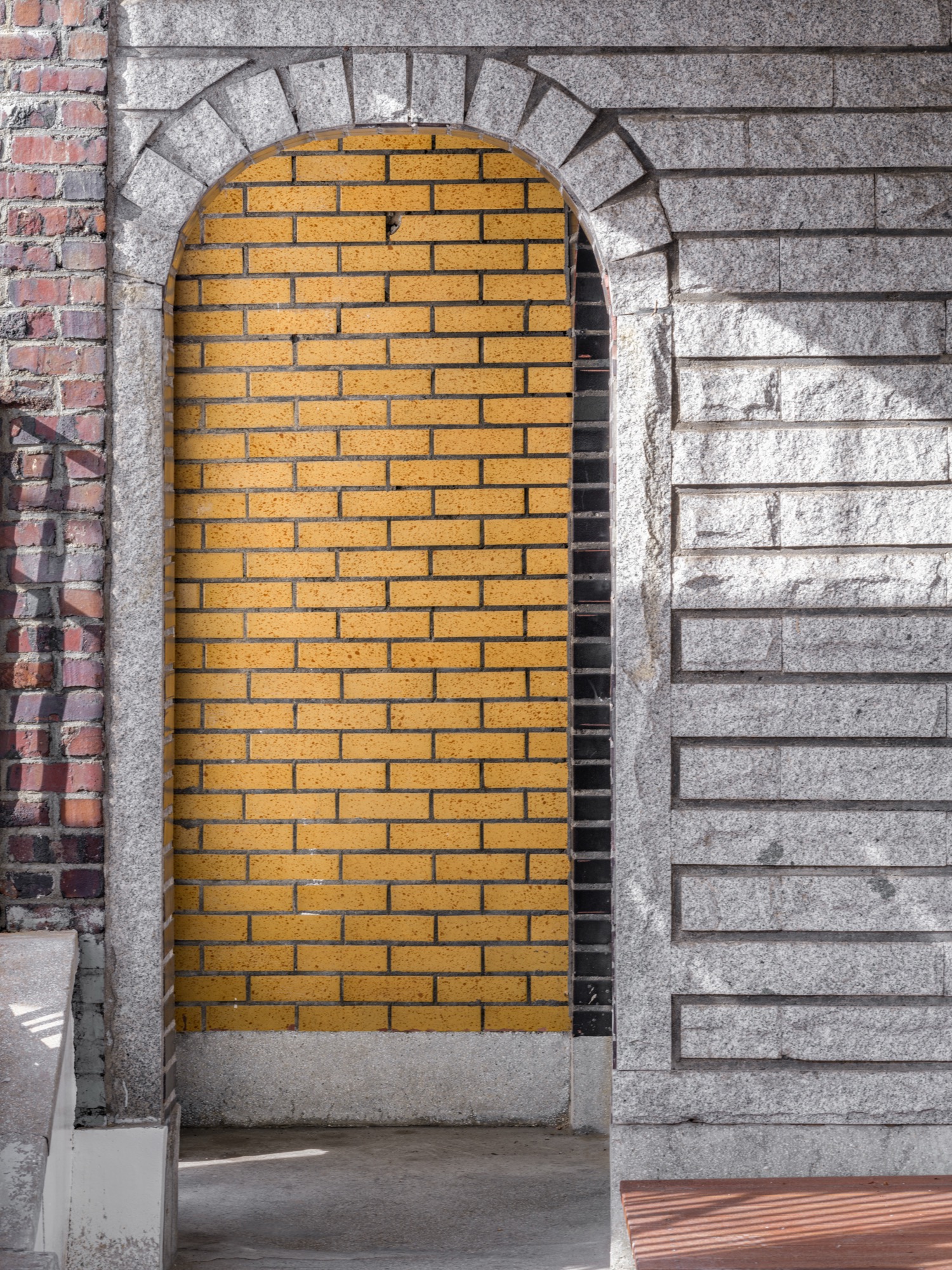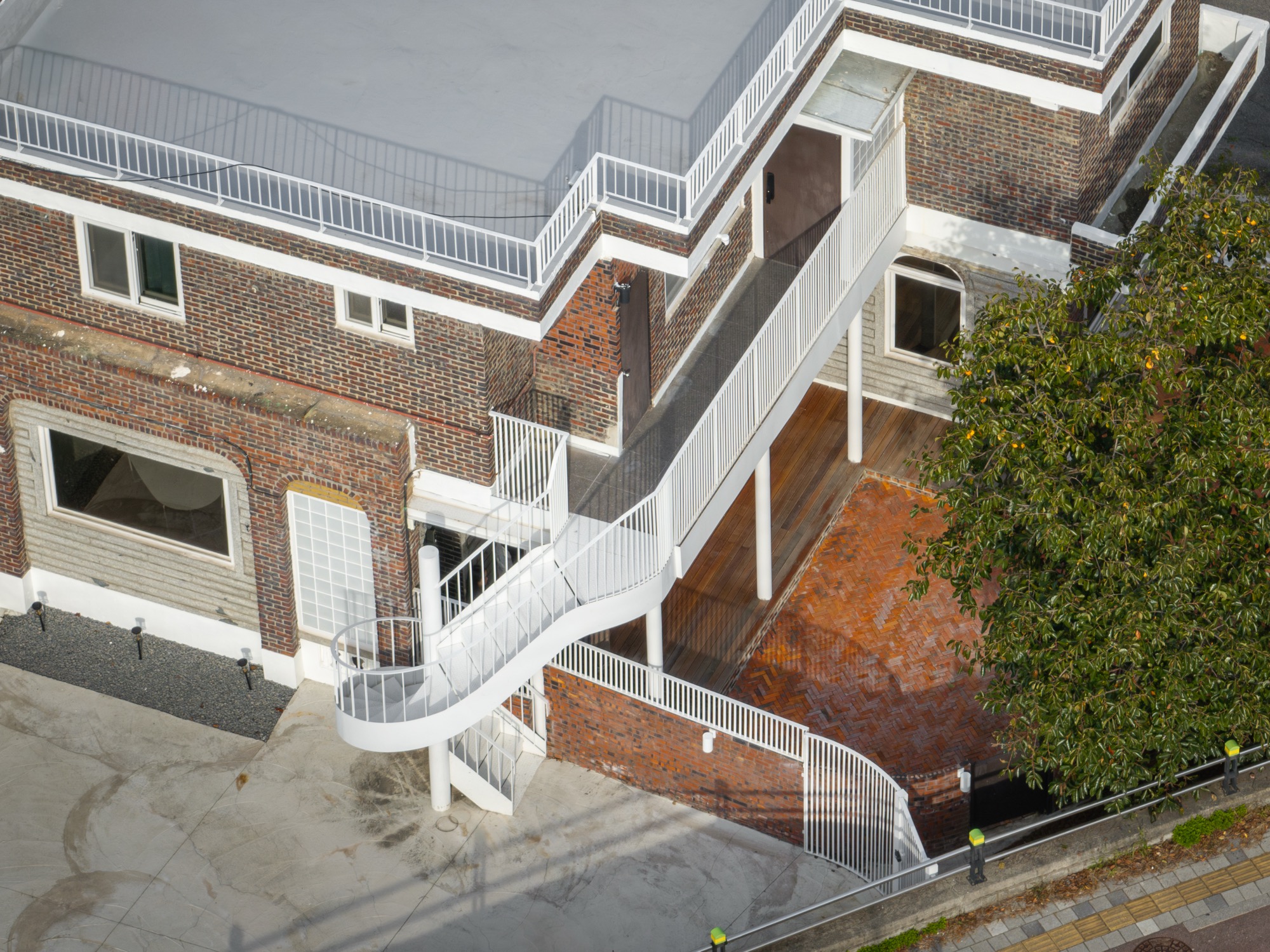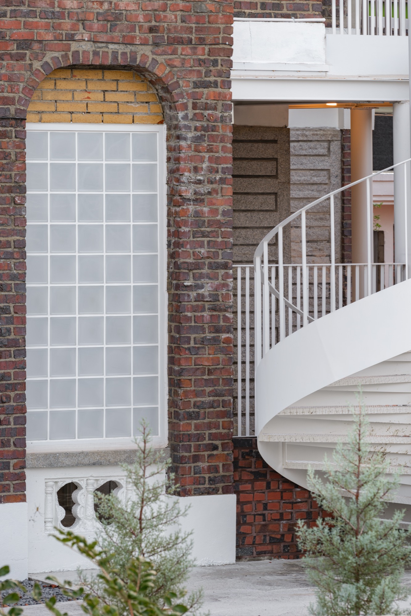 마당의 바닥과 담장에는 기존 건축물에 사용된 벽돌과 유사한 적벽돌을 사용하여 본래의 질감과 미학적 정체성을 유지했다. 새로 추가된 요소들은 절제된 재질감을 적용해, 붉은 벽돌과 석재 장식 그리고 타일이 지닌 시간성과 고유한 매력을 더욱 돋보이게 한다. 이러한 조화는 건축물의 원형적 요소와 현대적 개입이 상호작용하며 공간과 시간의 의미를 확장한다.